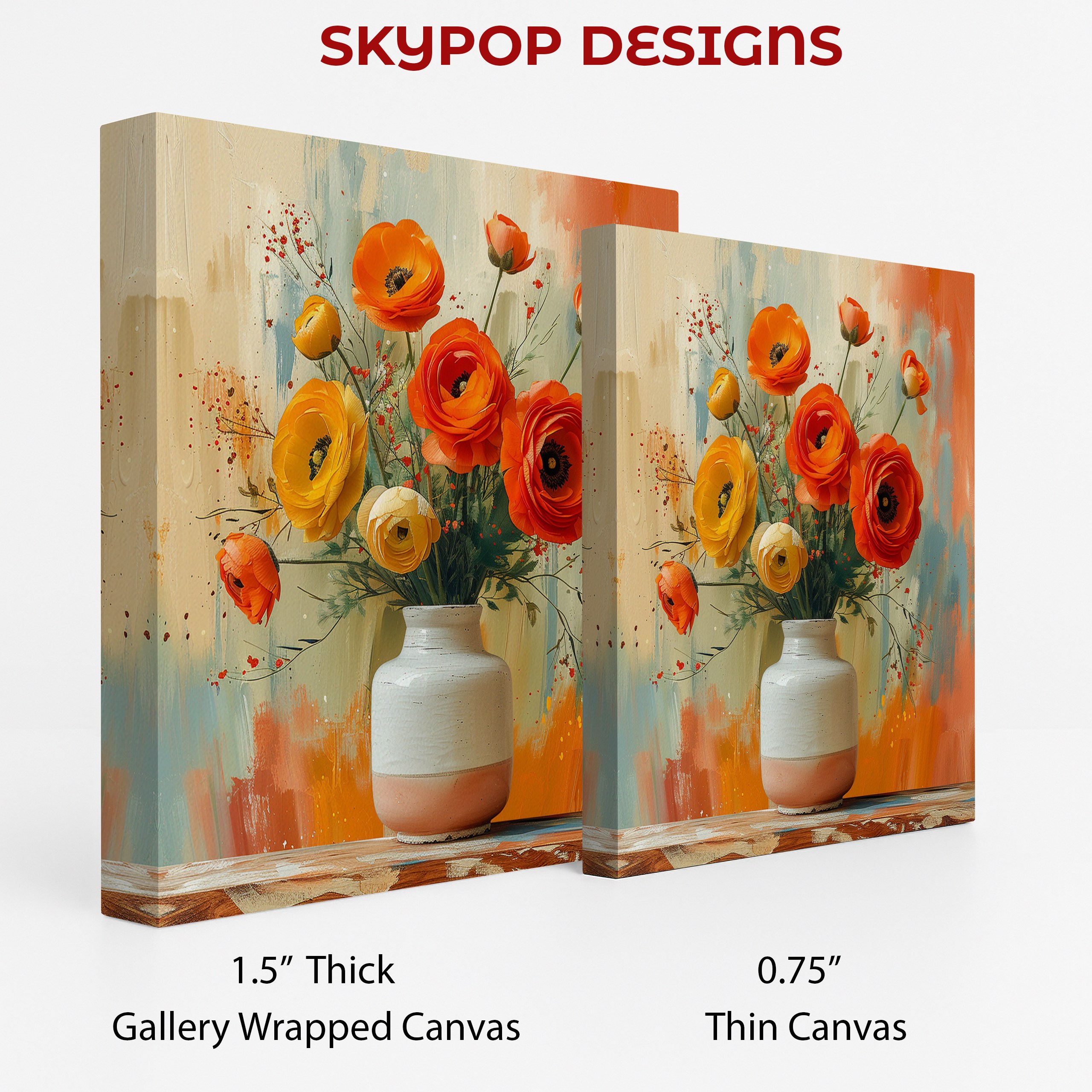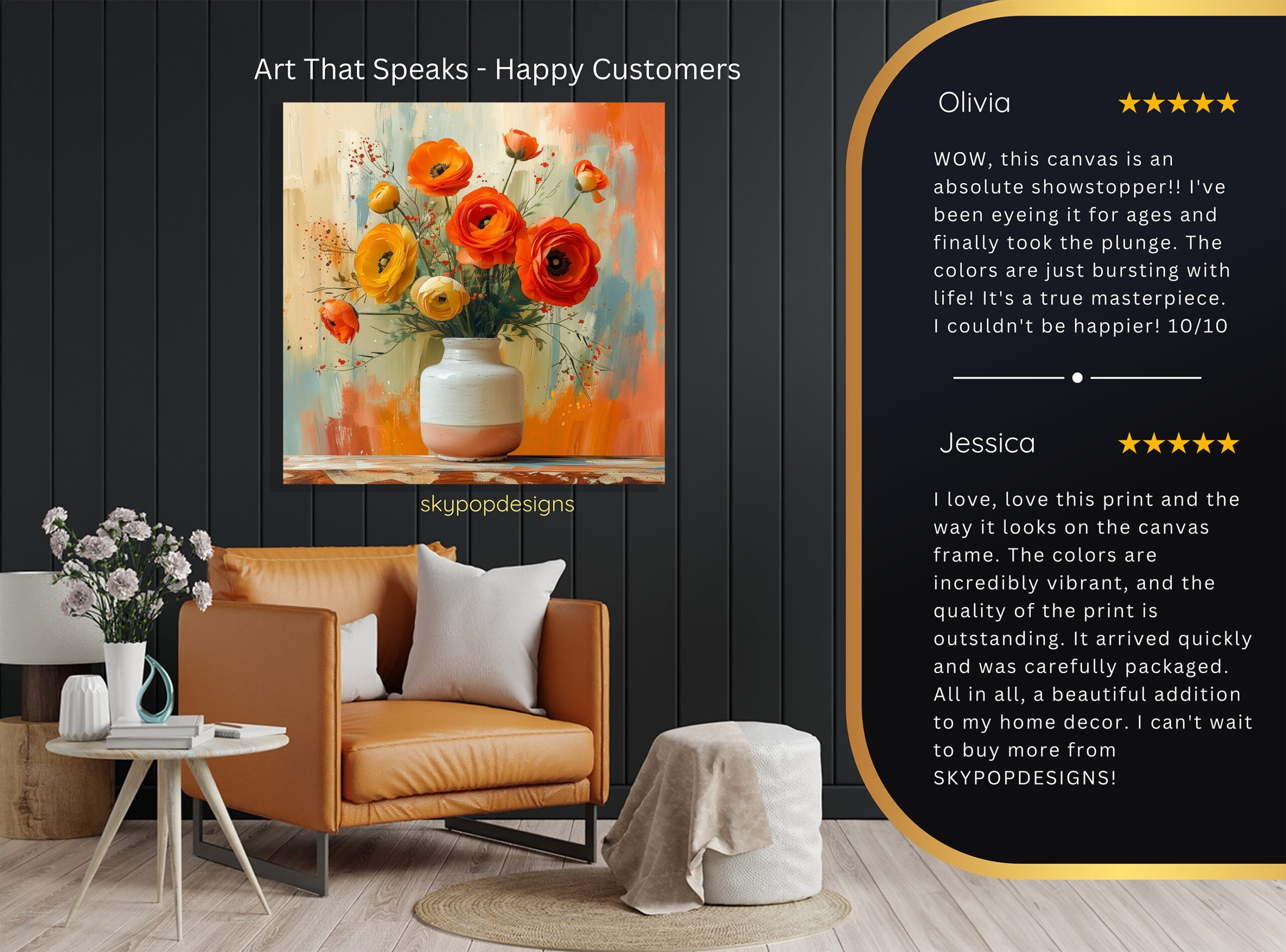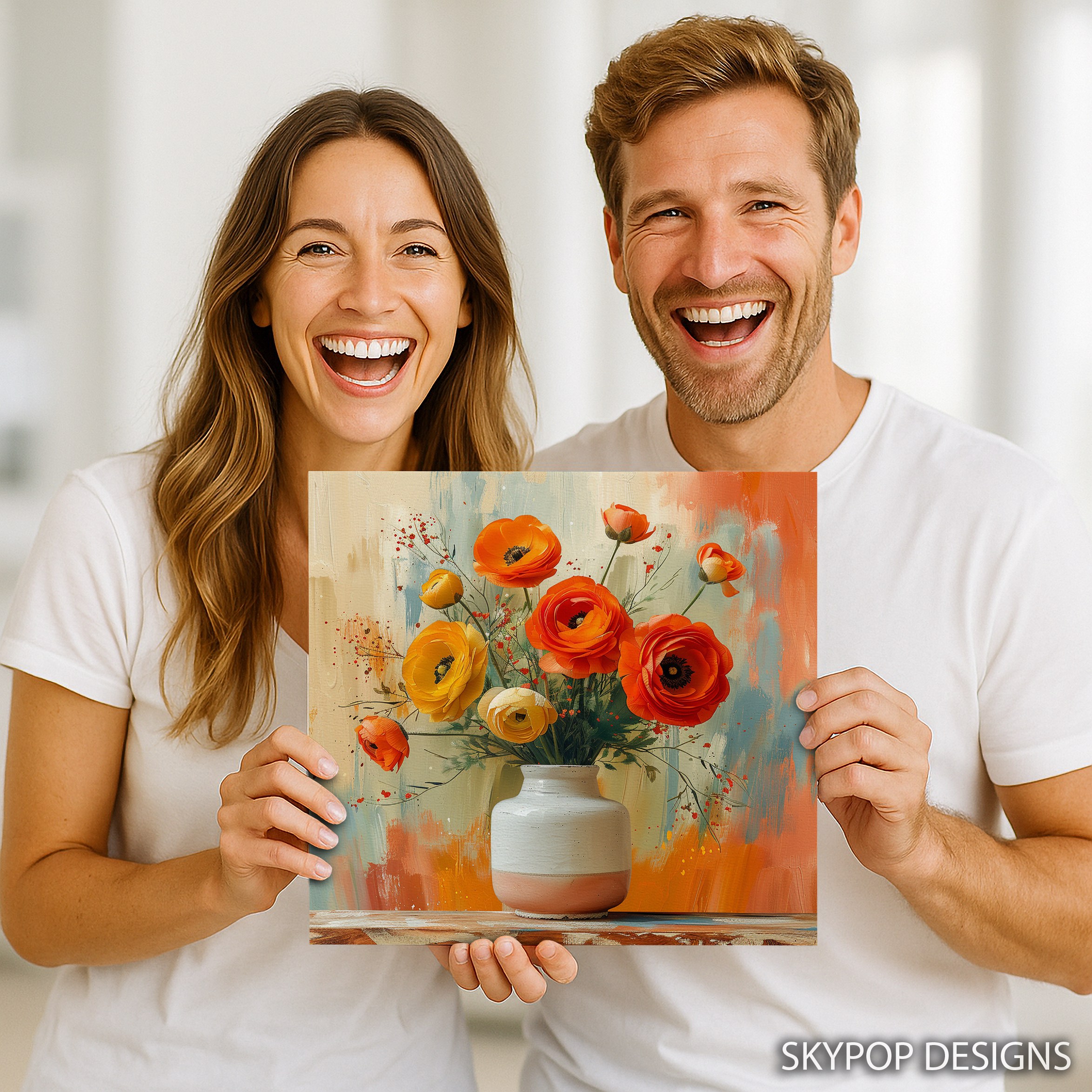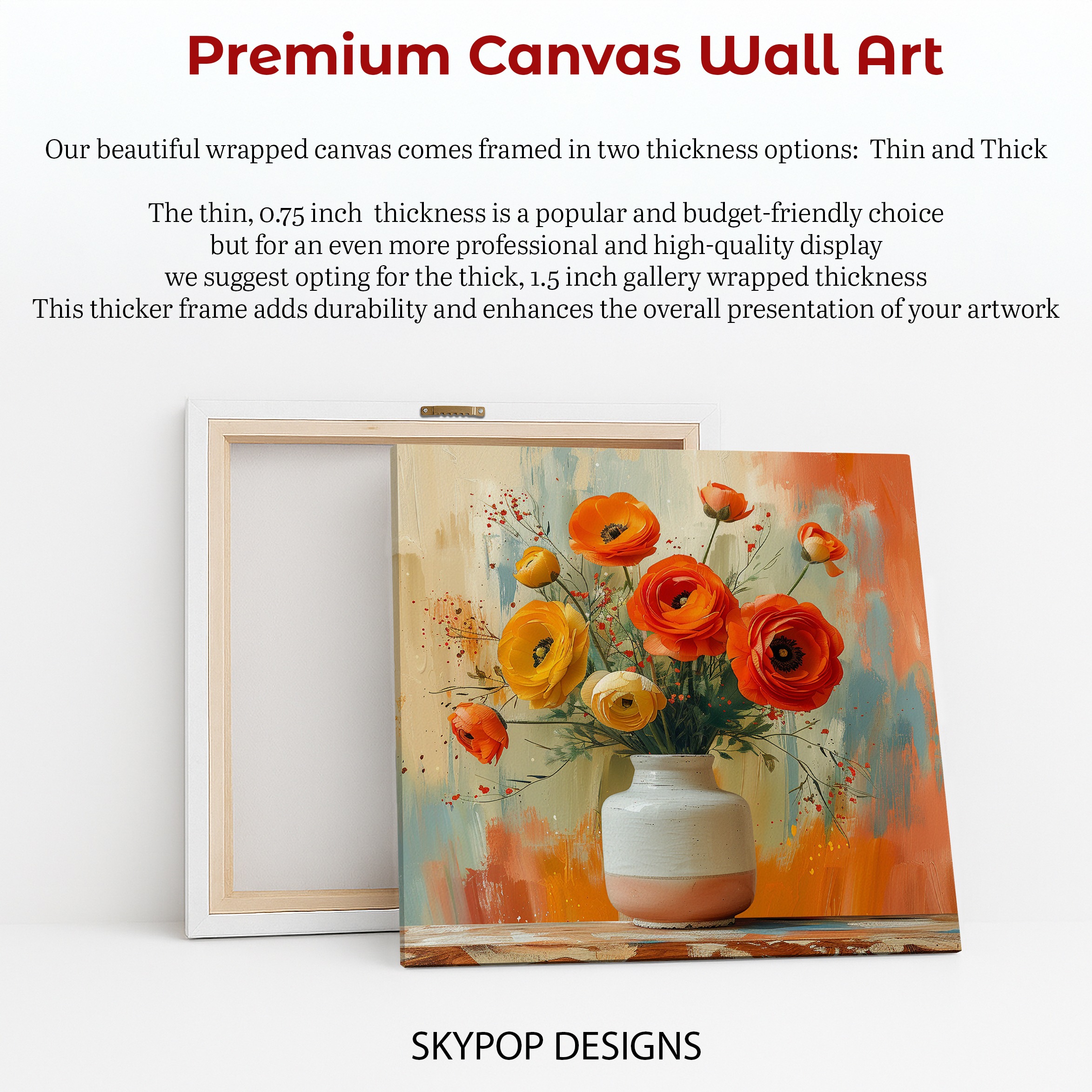 Brighten your home with this stunning Ranunculus canvas wall art, a vibrant depiction of blooming flowers in a contemporary impressionist style. This poster or canvas wall art is perfect for adding a splash of vivid color to your modern living room wall decor or creating a cheerful accent in your bedroom. The striking orange and yellow ranunculus flowers pop against a multicolor abstract background, bringing energy and warmth to any space. Ideal for bohemian settings or minimalist interiors seeking a focal point, this floral artwork transforms entryways and dining rooms into welcoming, artistic zones. The impressionistic brushstrokes create a sense of movement and depth, making this canvas wall art a captivating piece. High-quality printing ensures the rich colors and intricate details of the ranunculus blooms are beautifully rendered, from the textured petals to the delicate stems. This versatile floral art piece also makes a thoughtful housewarming gift or a delightful birthday present, sure to inspire joy and uplift spirits. The dynamic color palette enhances vibrant decor schemes while also complementing more subdued spaces, making it a versatile addition. Elevate your environment with this stunning Ranunculus canvas wall art – a celebration of nature’s beauty that brings enduring charm and artistic flair to your walls. Transform your room with this eye-catching artwork today.
