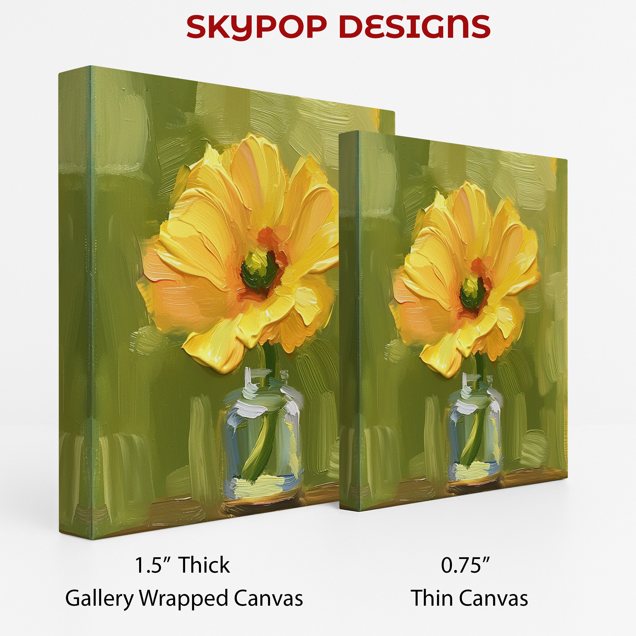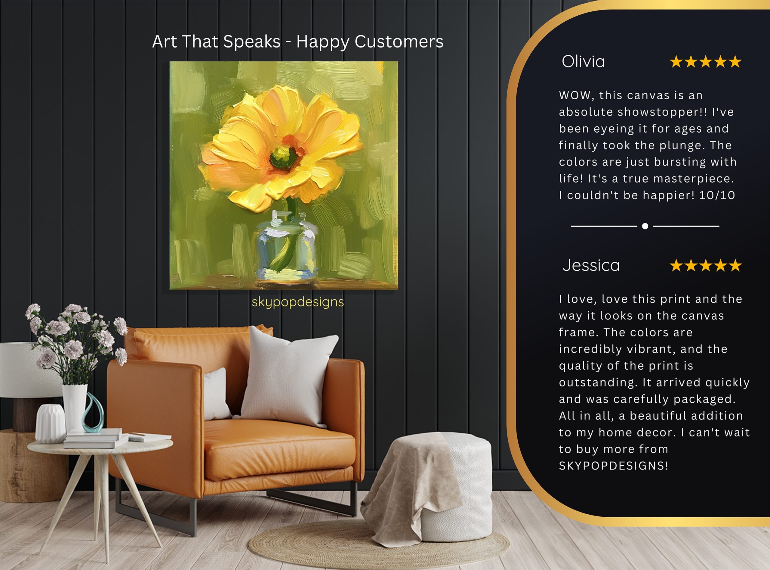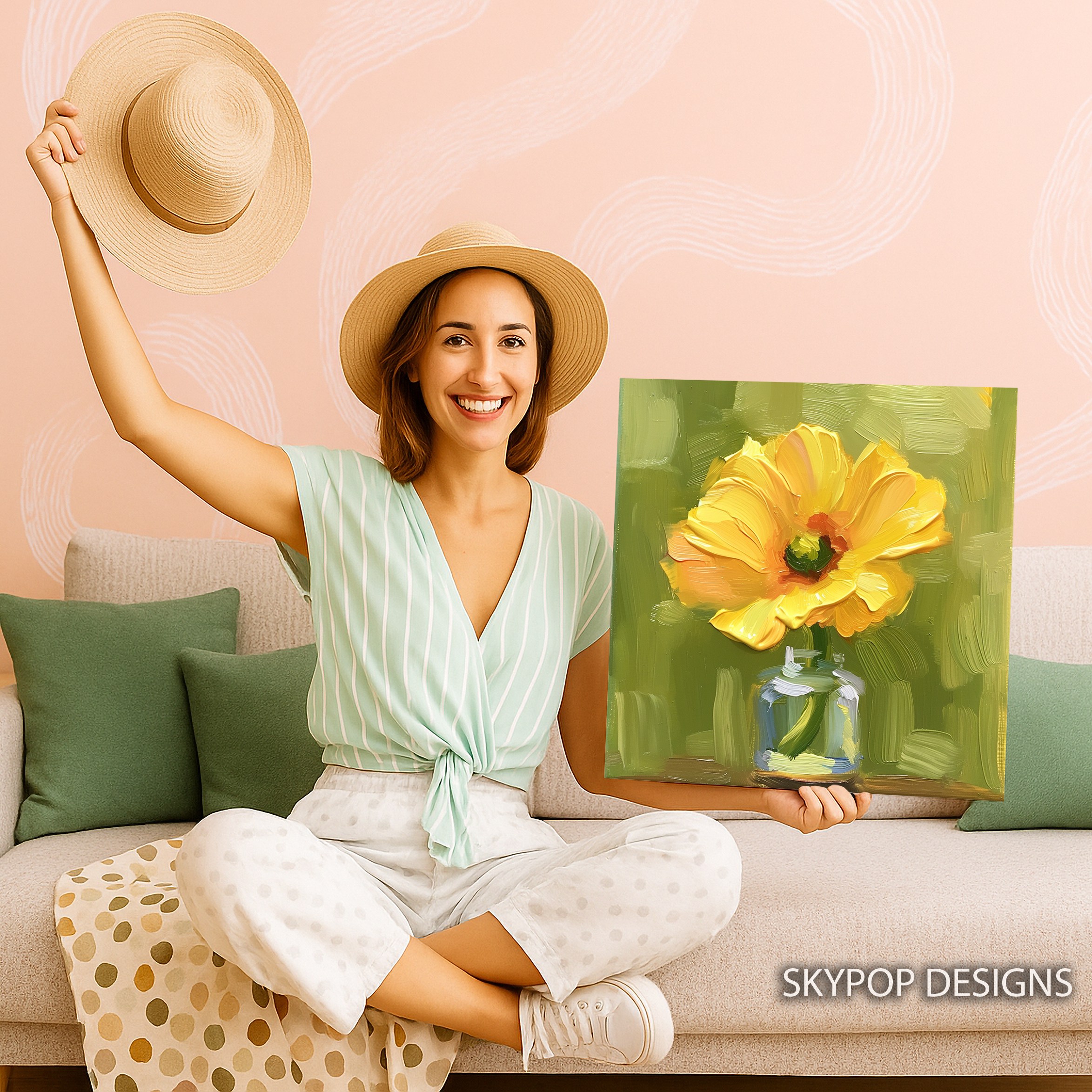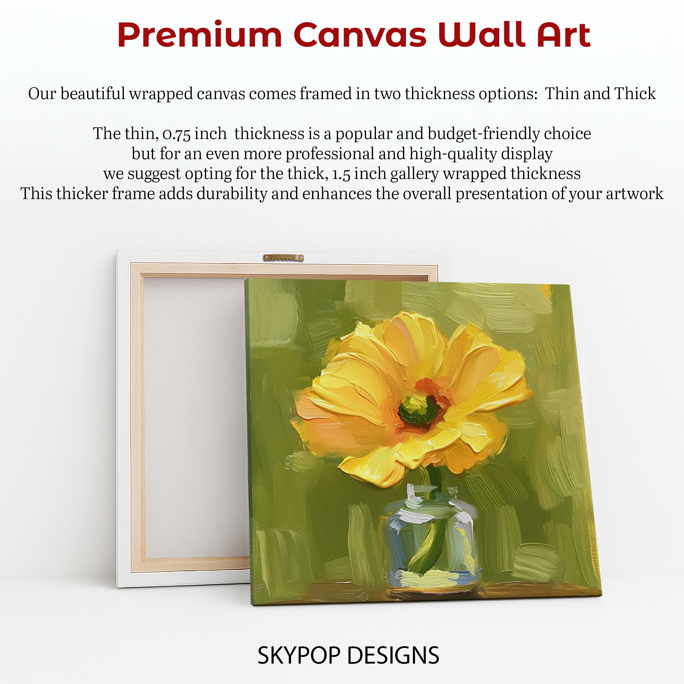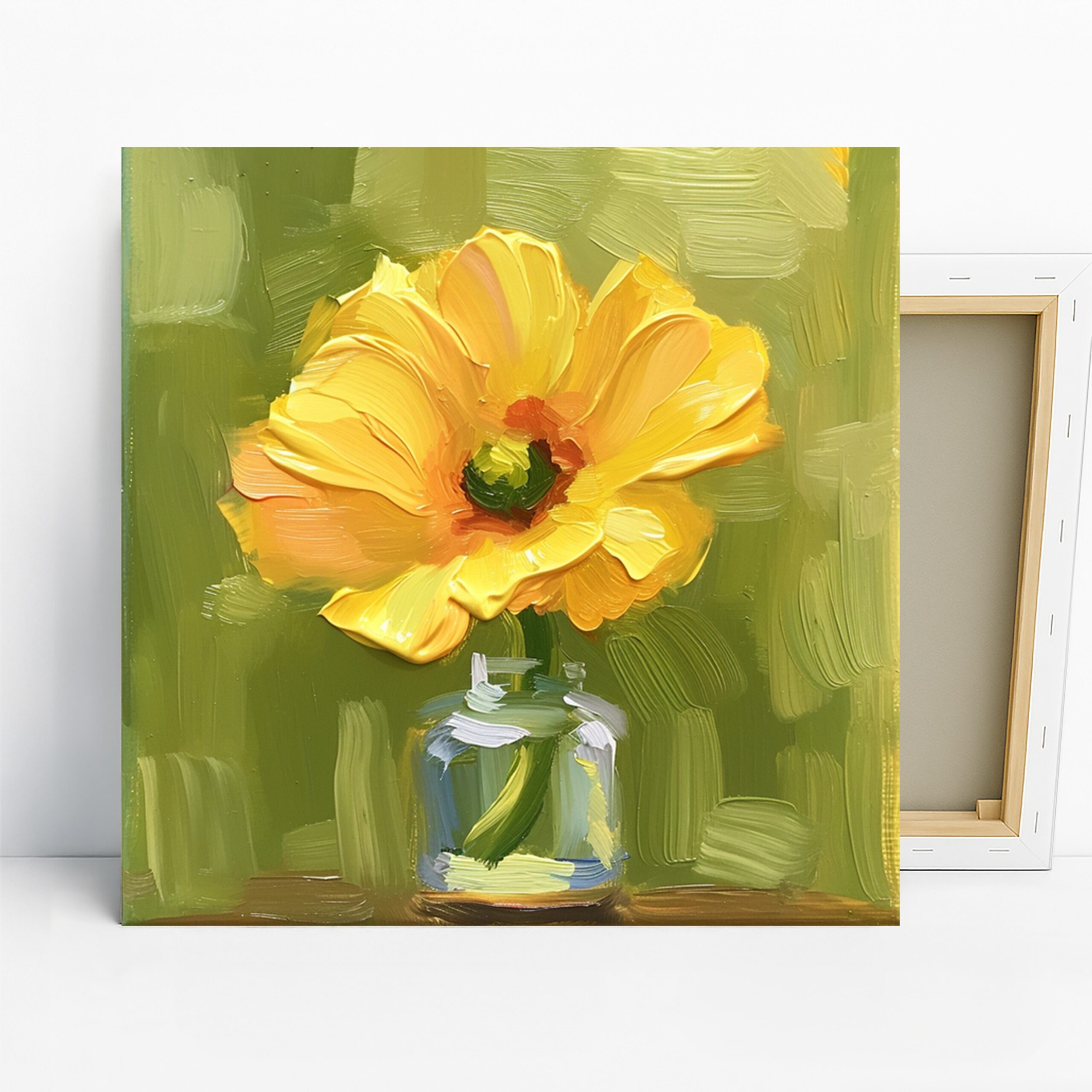 Brighten your home with this stunning yellow Ranunculus canvas wall art, a perfect statement piece for any room. This vibrant poster or canvas wall art features thick, impasto brushstrokes that give the impression of a real flower, bringing a touch of nature indoors. The striking yellow petals of the Ranunculus bloom radiate warmth, complemented by the lush green background and the simple glass vase. This impressionist-style floral art is ideal for modern living rooms, creating a captivating focal point, or as a cheerful addition to bedroom decor. Its contemporary feel also makes it a wonderful fit for bohemian-inspired spaces, adding color and life. The bold yellow hues can uplift your mood and add a sense of joy to your entryway or dining room. This high-quality canvas wall art is perfect for those seeking vibrant wall decor that celebrates the beauty of flowers. Whether you’re looking to refresh your current space or find a thoughtful housewarming or birthday gift, this Ranunculus print offers timeless appeal. The rich texture and bold colors of this poster ensure it stands out, making it a central piece of your art collection. Transform your home with the fresh energy of this beautiful floral artwork, a true celebration of nature’s artistry that inspires and enchants daily. Elevate your interior design with this breathtaking Ranunculus canvas art today.