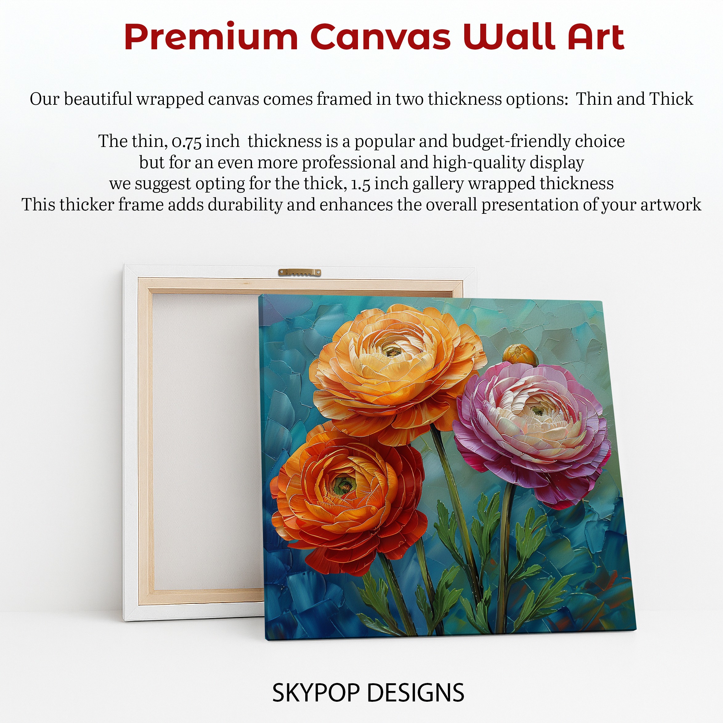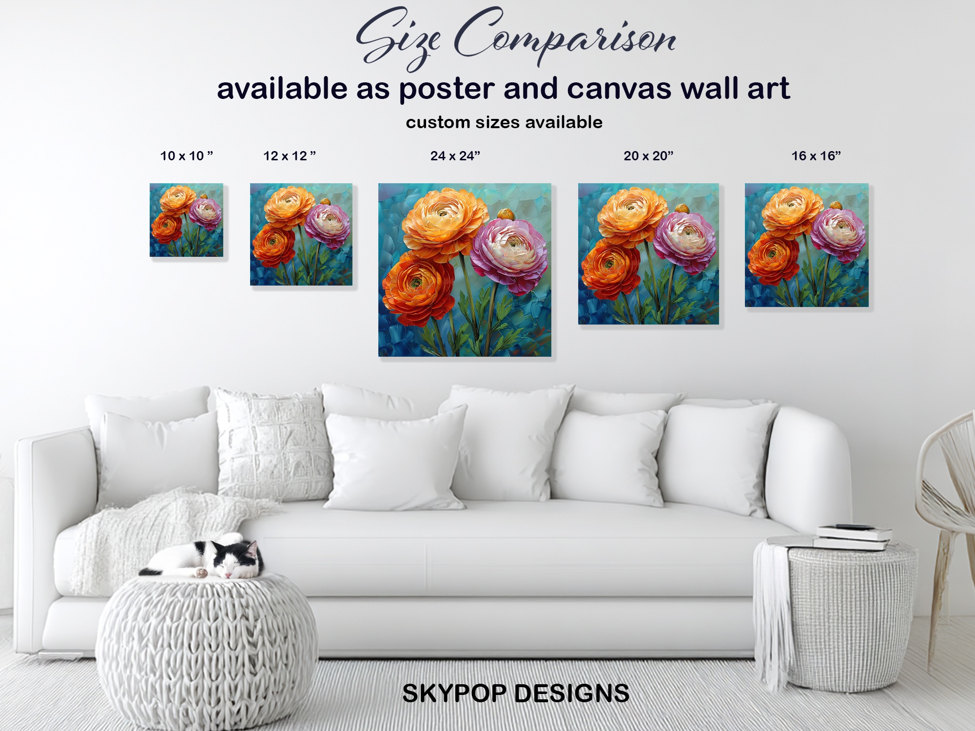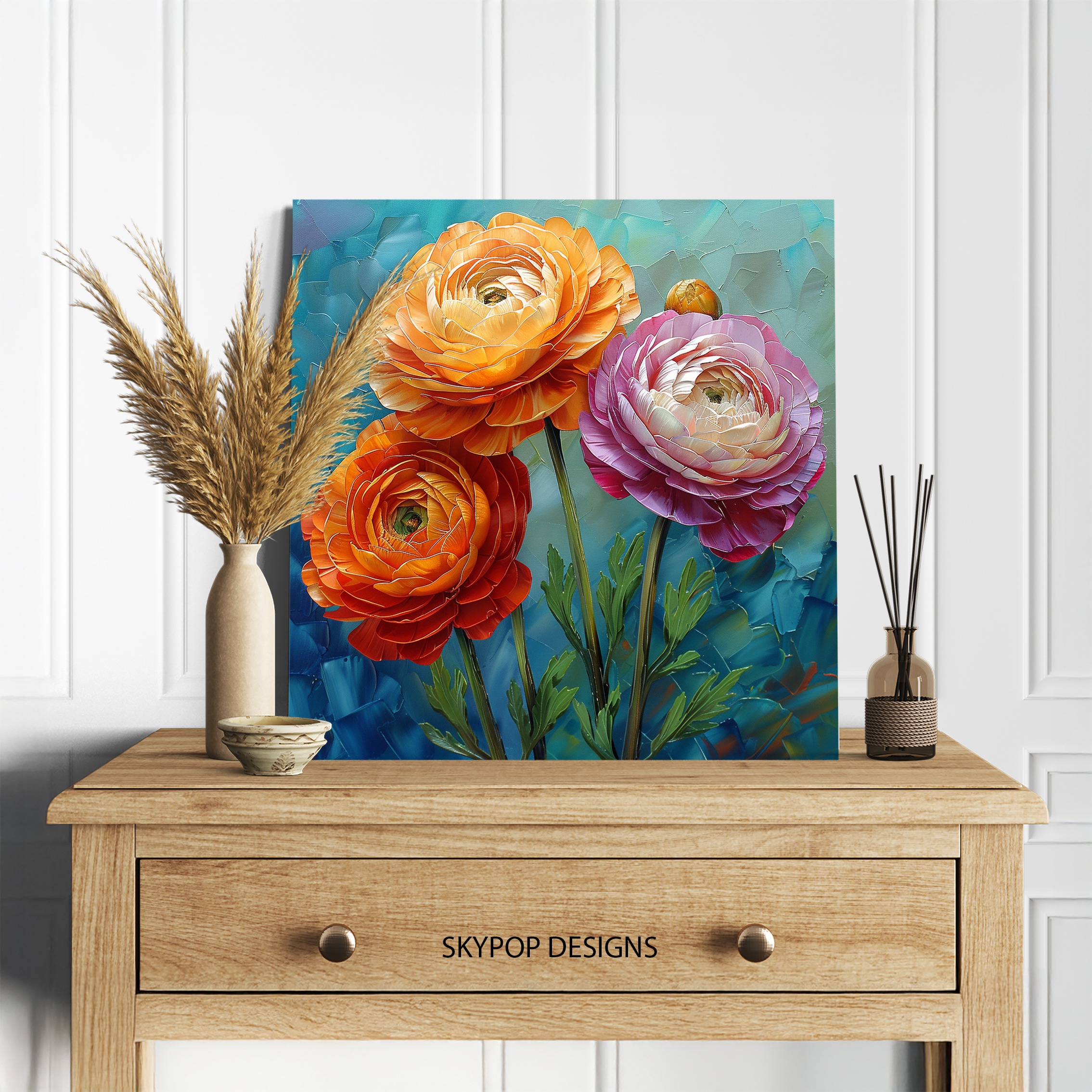 Transform your home with this exquisite Ranunculus canvas wall art, showcasing vibrant floral beauty in a contemporary Impressionist style. This stunning poster or canvas wall art is perfect for adding a pop of color to modern living room decor or creating a serene bedroom sanctuary. The striking orange and pink ranunculus flowers burst with life against a rich blue textured background, inspiring joy and creativity. Ideal for bohemian interiors, this floral artwork also complements contemporary spaces, bringing organic elegance and visual interest. The thick, textured brushstrokes of the Impressionism art style create a captivating depth, making this canvas wall art a true statement piece. Its size versatility ensures it fits beautifully as a focal point in any room, from a grand entryway to a cozy dining area. This high-quality printing captures the intricate layers of the petals and the vibrant hues, offering a breathtakingly realistic yet artistic representation. Perfect as a thoughtful housewarming gift, birthday present, or as a way to refresh your home decor, this floral wall art brings lasting beauty. Elevate your space with this captivating blend of nature’s artistry and contemporary design trends. Add this vibrant Ranunculus canvas art to your collection and let its cheerful colors brighten your walls every day. Celebrate the beauty of flowers with this timeless and inspiring wall art.