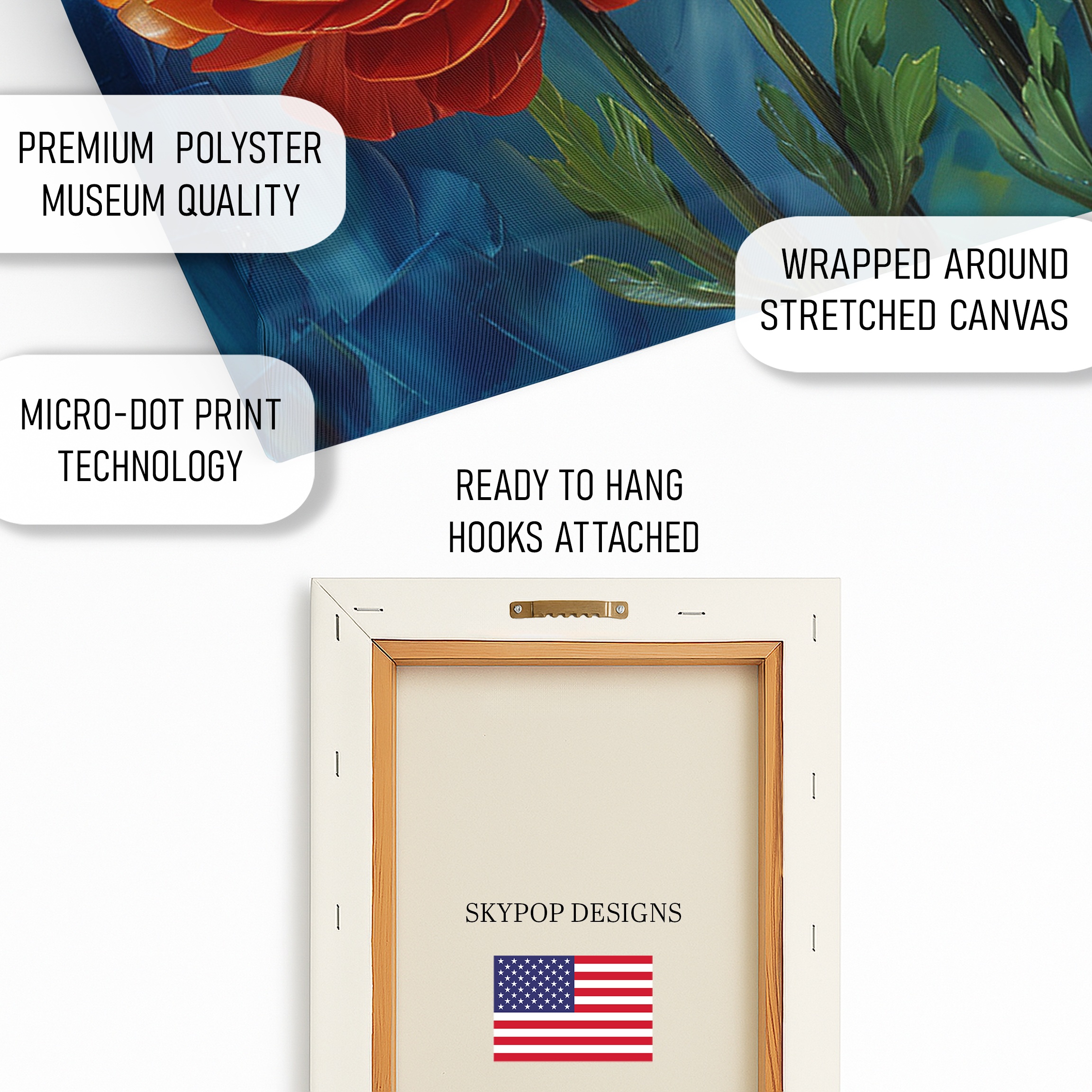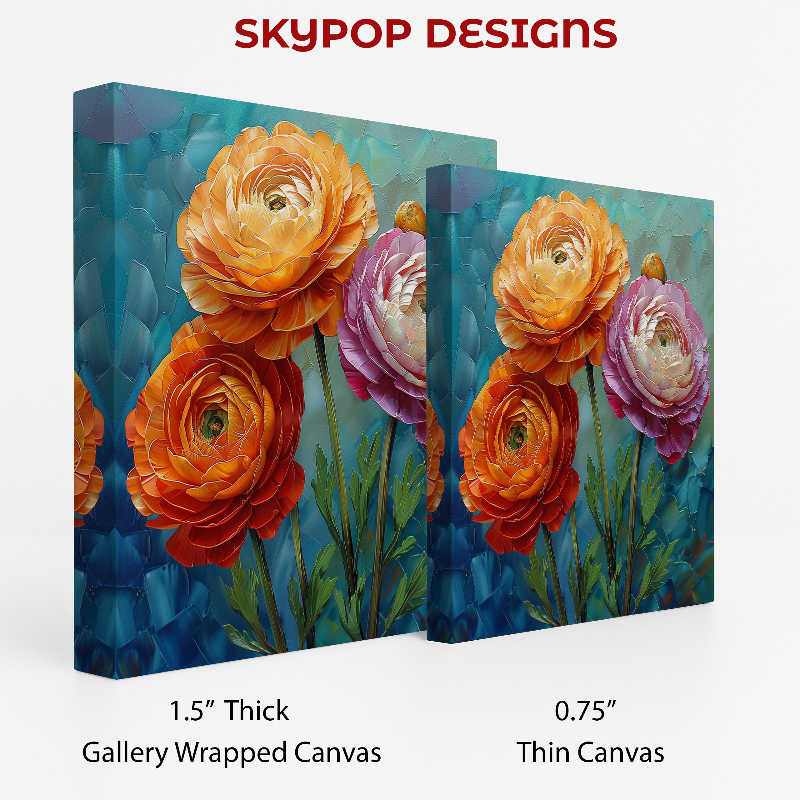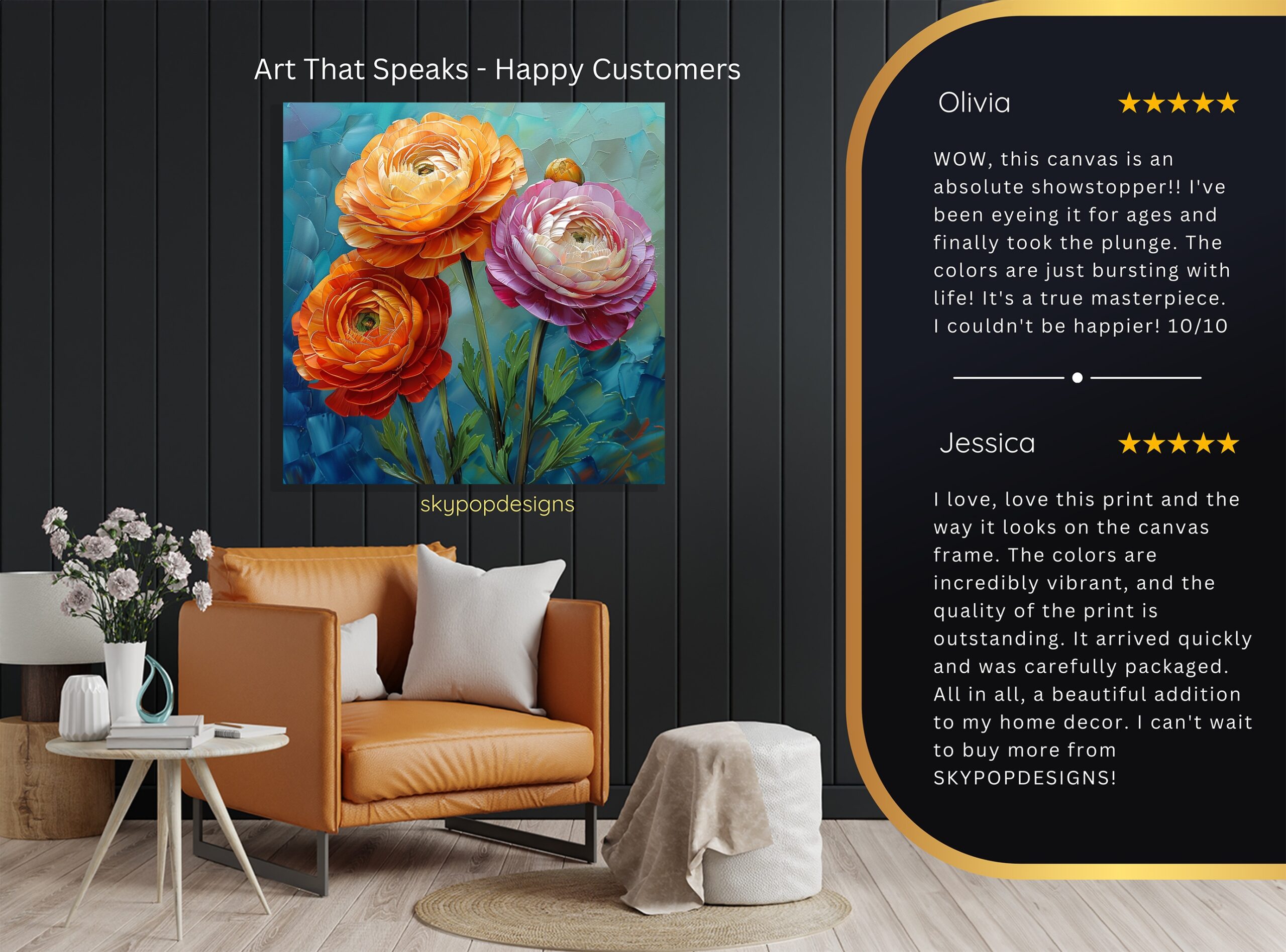 Transform your home with this exquisite Ranunculus canvas wall art, showcasing vibrant floral beauty in a contemporary Impressionist style. This stunning poster or canvas wall art is perfect for adding a pop of color to modern living room decor or creating a serene bedroom sanctuary. The striking orange and pink ranunculus flowers burst with life against a rich blue textured background, inspiring joy and creativity. Ideal for bohemian interiors, this floral artwork also complements contemporary spaces, bringing organic elegance and visual interest. The thick, textured brushstrokes of the Impressionism art style create a captivating depth, making this canvas wall art a true statement piece. Its size versatility ensures it fits beautifully as a focal point in any room, from a grand entryway to a cozy dining area. This high-quality printing captures the intricate layers of the petals and the vibrant hues, offering a breathtakingly realistic yet artistic representation. Perfect as a thoughtful housewarming gift, birthday present, or as a way to refresh your home decor, this floral wall art brings lasting beauty. Elevate your space with this captivating blend of nature’s artistry and contemporary design trends. Add this vibrant Ranunculus canvas art to your collection and let its cheerful colors brighten your walls every day. Celebrate the beauty of flowers with this timeless and inspiring wall art.
