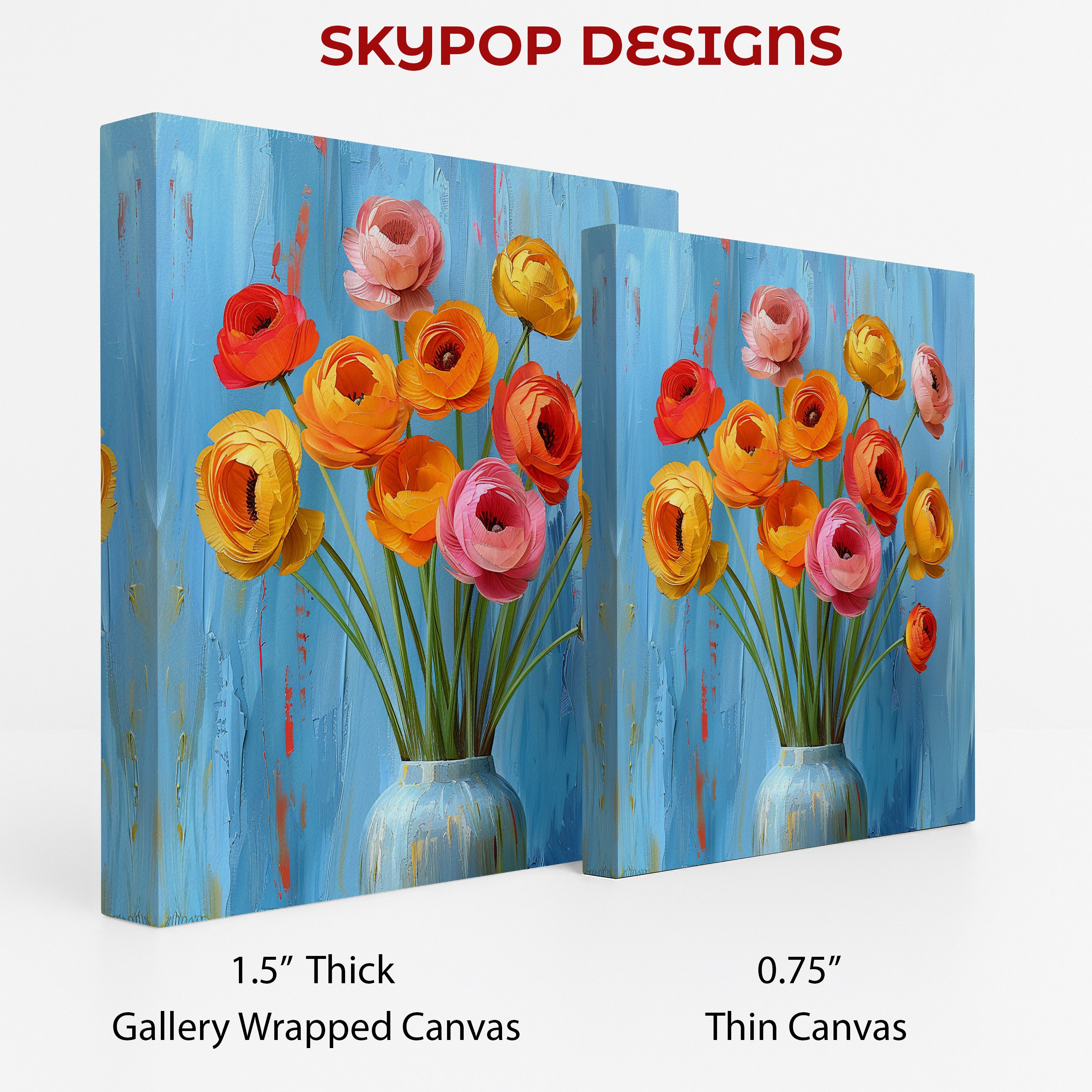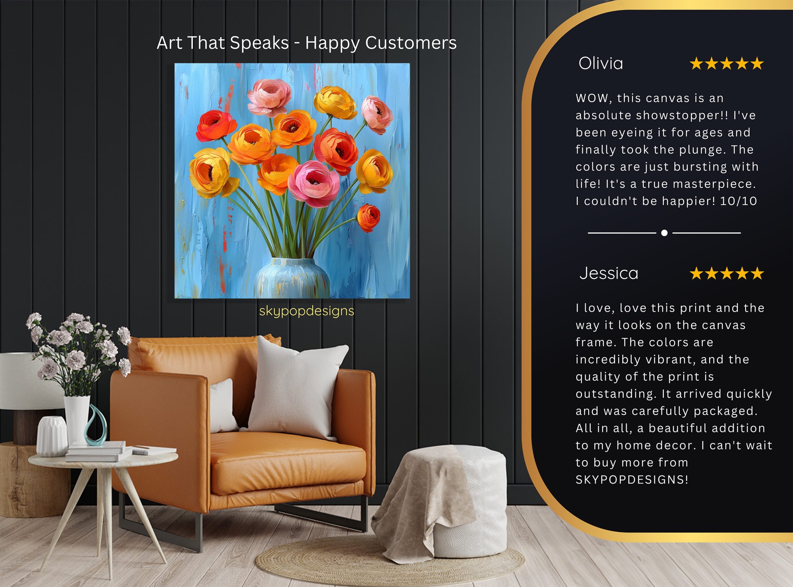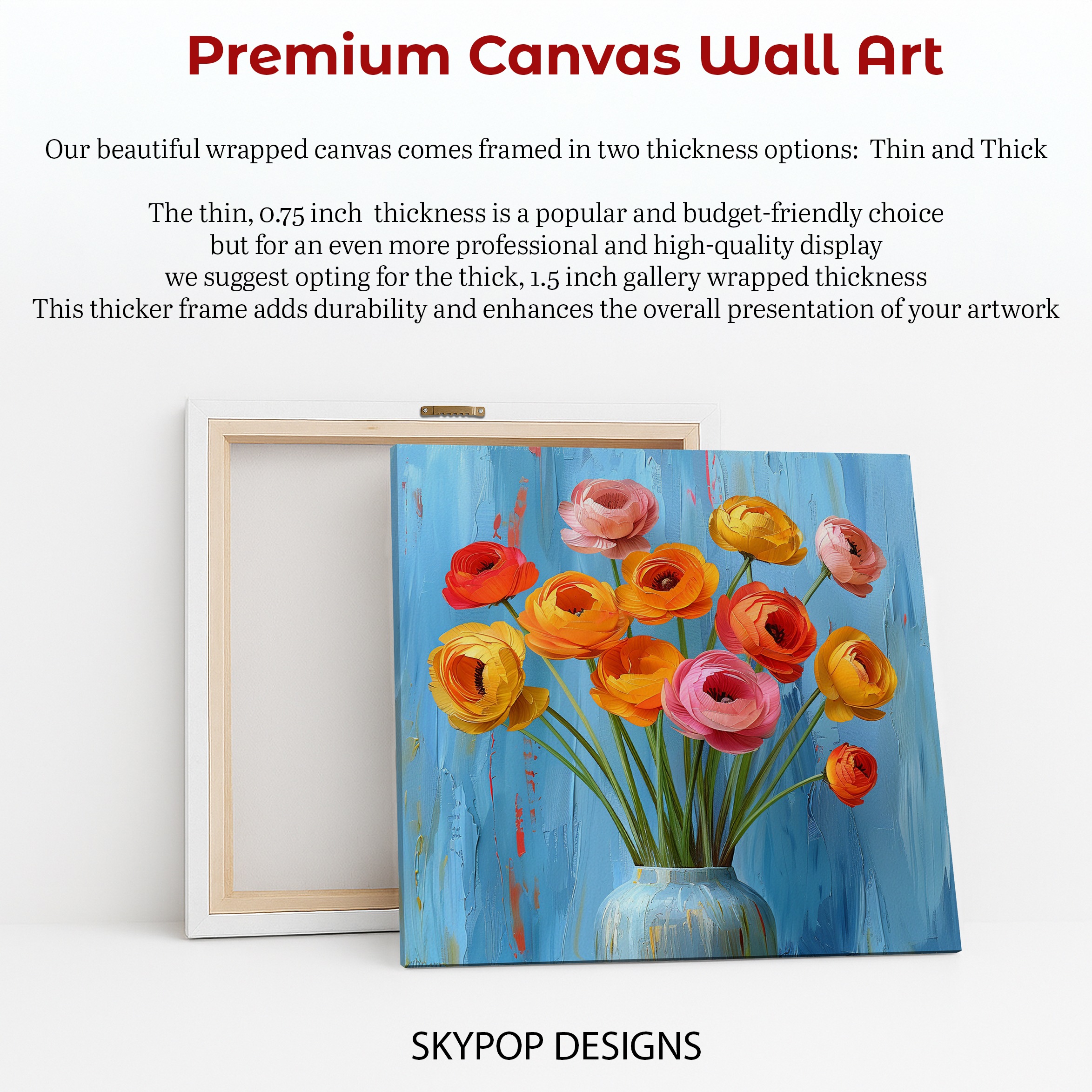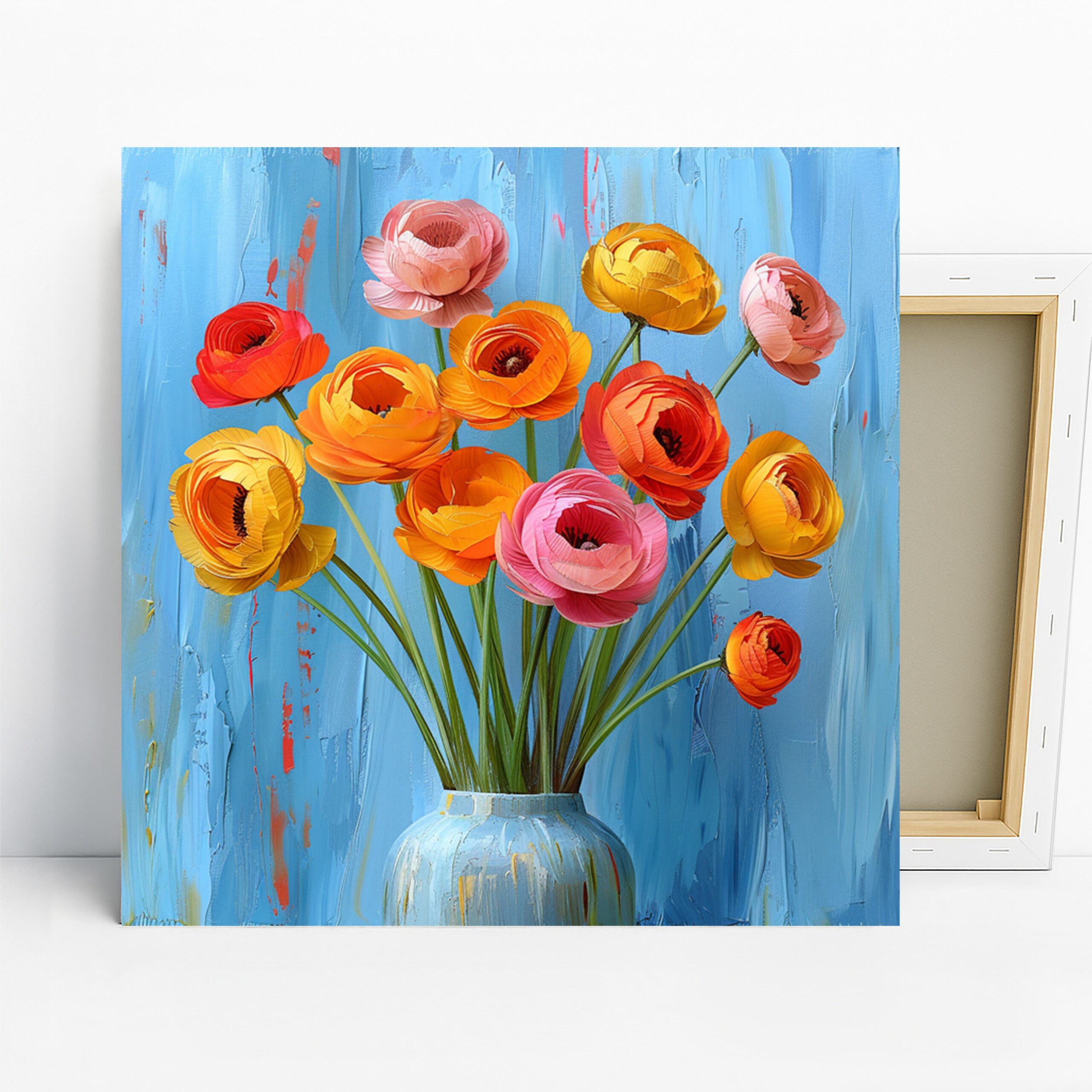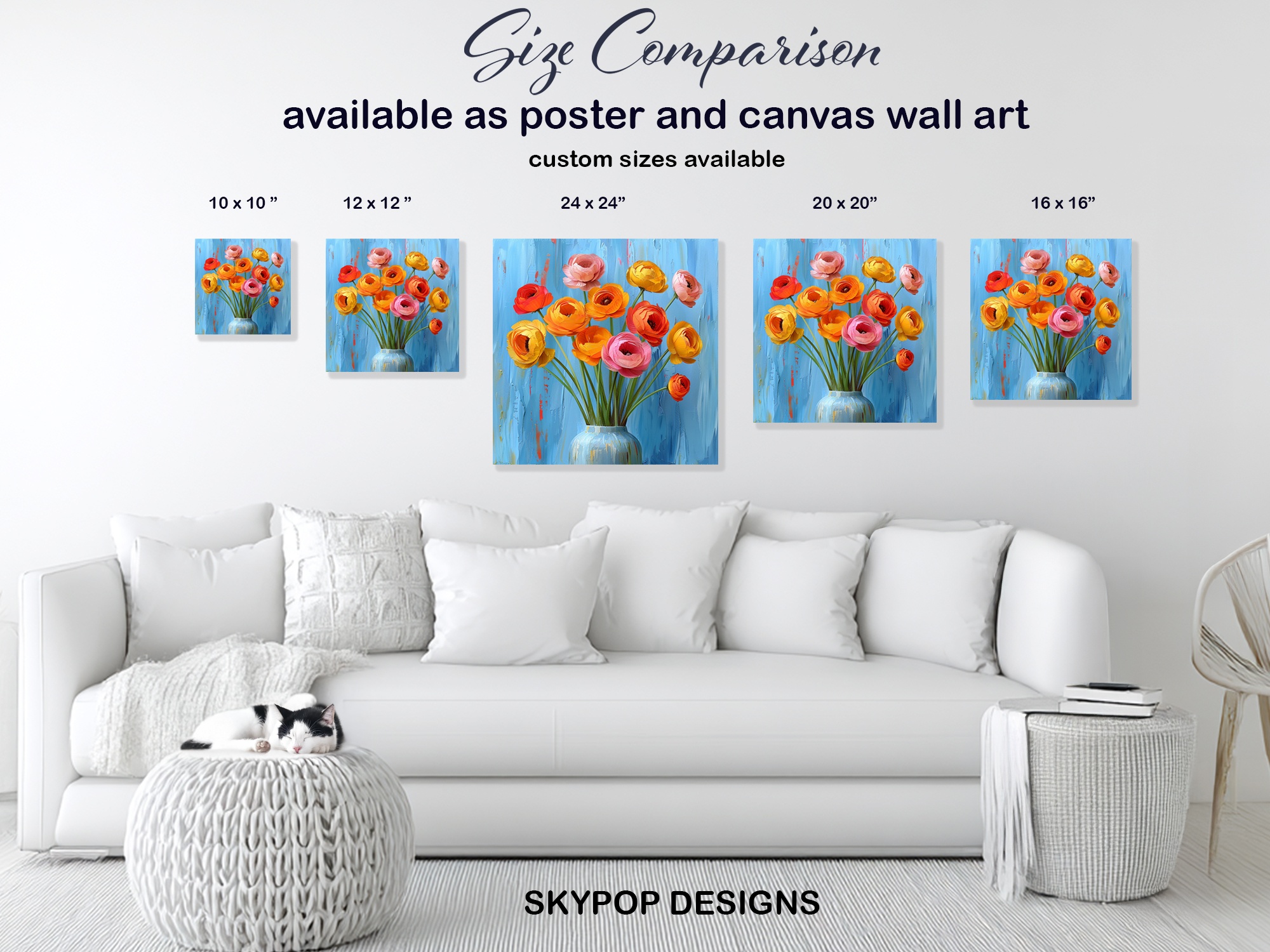 Elevate your home with this vibrant Ranunculus bouquet canvas wall art, a stunning piece that brings the beauty of nature indoors. This poster or canvas wall art features a captivating arrangement of ranunculus flowers in lively shades of orange, pink, and yellow, set against a textured blue background. The impressionistic style and rich colors create a striking visual appeal, perfect for modern living rooms or chic bedrooms. This floral art piece is ideal for bohemian and contemporary decor, adding a pop of color and artistic flair to any space. The lush, layered petals of the ranunculus flowers are rendered with exquisite detail, making this canvas wall art a true masterpiece. Use this eye-catching artwork to transform your dining room or entryway into a welcoming and inspiring area. It’s a perfect gift for housewarmings, birthdays, or any occasion for flower lovers. The combination of warm floral tones and cool blue background creates a dynamic and harmonious balance, adding a refreshing energy to your home decor. High-quality printing ensures the saturation of colors and the unique texture of the brushstrokes are perfectly captured. Whether you’re refreshing your summer decor or seeking year-round floral beauty, this ranunculus poster is an excellent choice. Celebrate the joy of flowers with this contemporary floral wall art that promises to be a conversation starter and a source of daily delight. Make your walls bloom with this exquisite canvas art today.