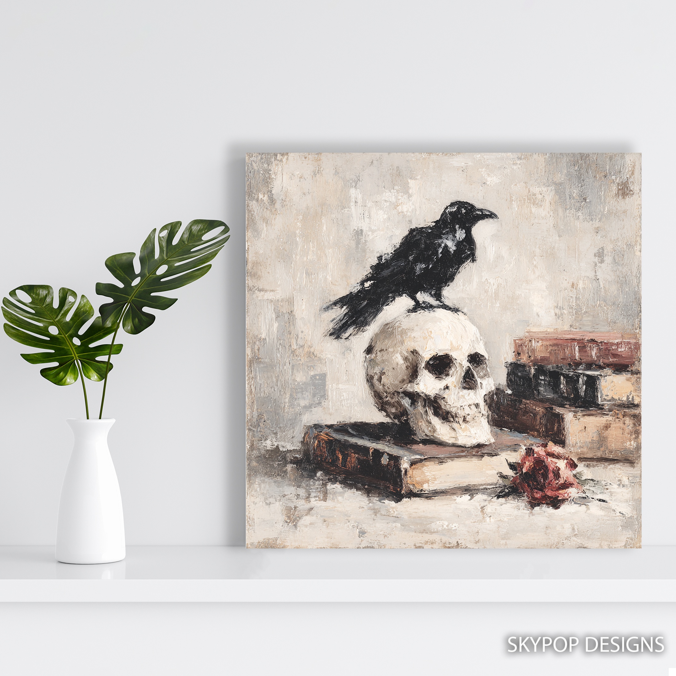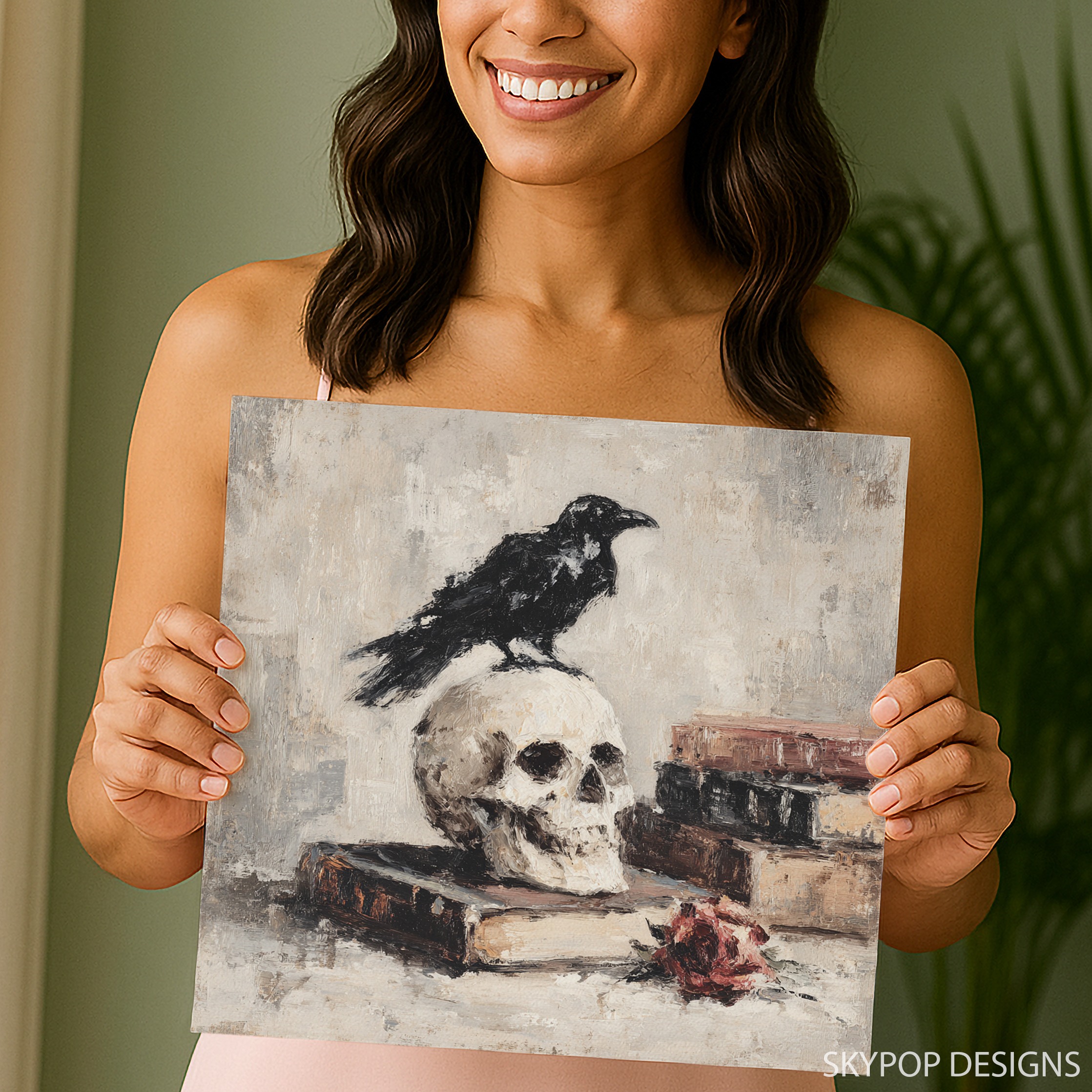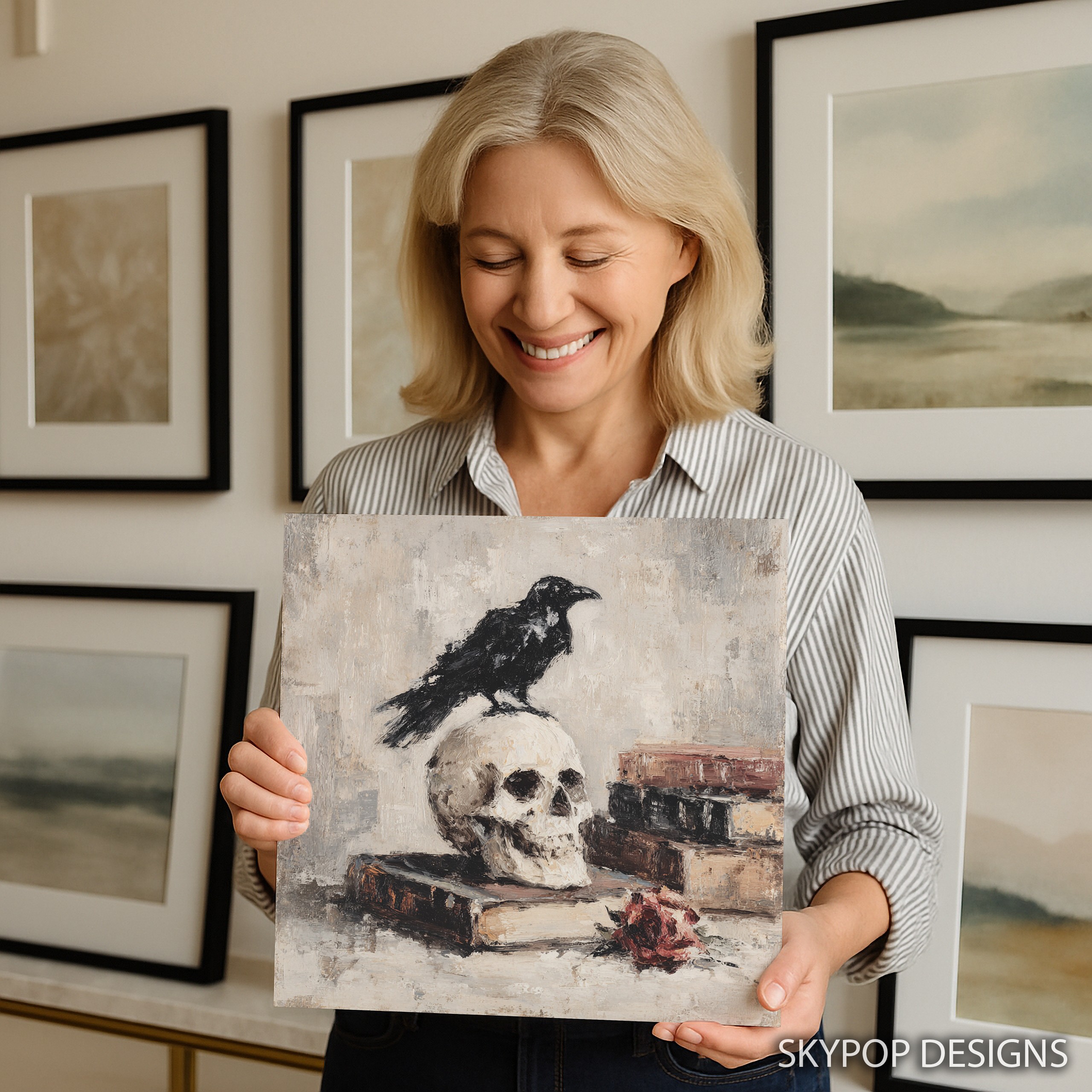 Elevate your space with this hauntingly beautiful raven and skull canvas wall art, perfect for those who appreciate dark elegance and gothic aesthetics. This striking poster captures a somber scene of a black raven perched atop a weathered skull, surrounded by aged books and a withered rose. The muted color palette of blacks, whites, and browns creates a moody atmosphere that instantly transforms any room into a sophisticated sanctuary. Ideal for gothic-inspired home offices or rustic living rooms, this canvas wall art adds depth and intrigue to your walls. The contrasting textures of the raven’s glossy feathers against the skull’s smooth surface showcase exquisite attention to detail. This versatile piece works wonderfully in traditional libraries, adding a touch of mystery and intellect to your decor. The symbolic elements of wisdom, mortality, and nature’s cycle make this artwork a powerful conversation starter. Whether displayed in a cozy reading nook or as a focal point in your bedroom, this canvas brings a sense of timeless drama to your space. The high-quality printing ensures every brushstroke and subtle shadow is captured, making it a stunning addition to any art collection. Perfect as a unique housewarming gift or to refresh your seasonal decor, this raven and skull art piece adapts beautifully to various interior styles. Transform your room with this captivating blend of vintage charm and gothic allure – a must-have for those who appreciate the darker side of art and nature.