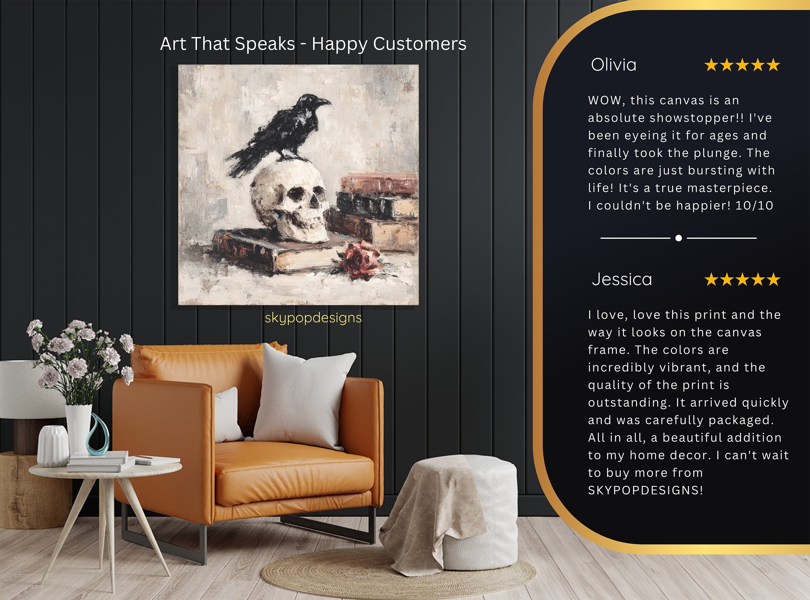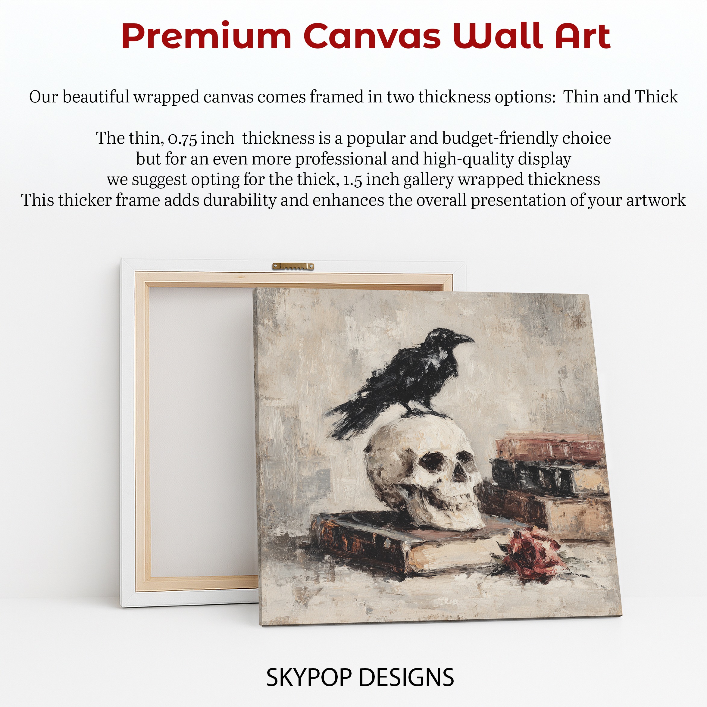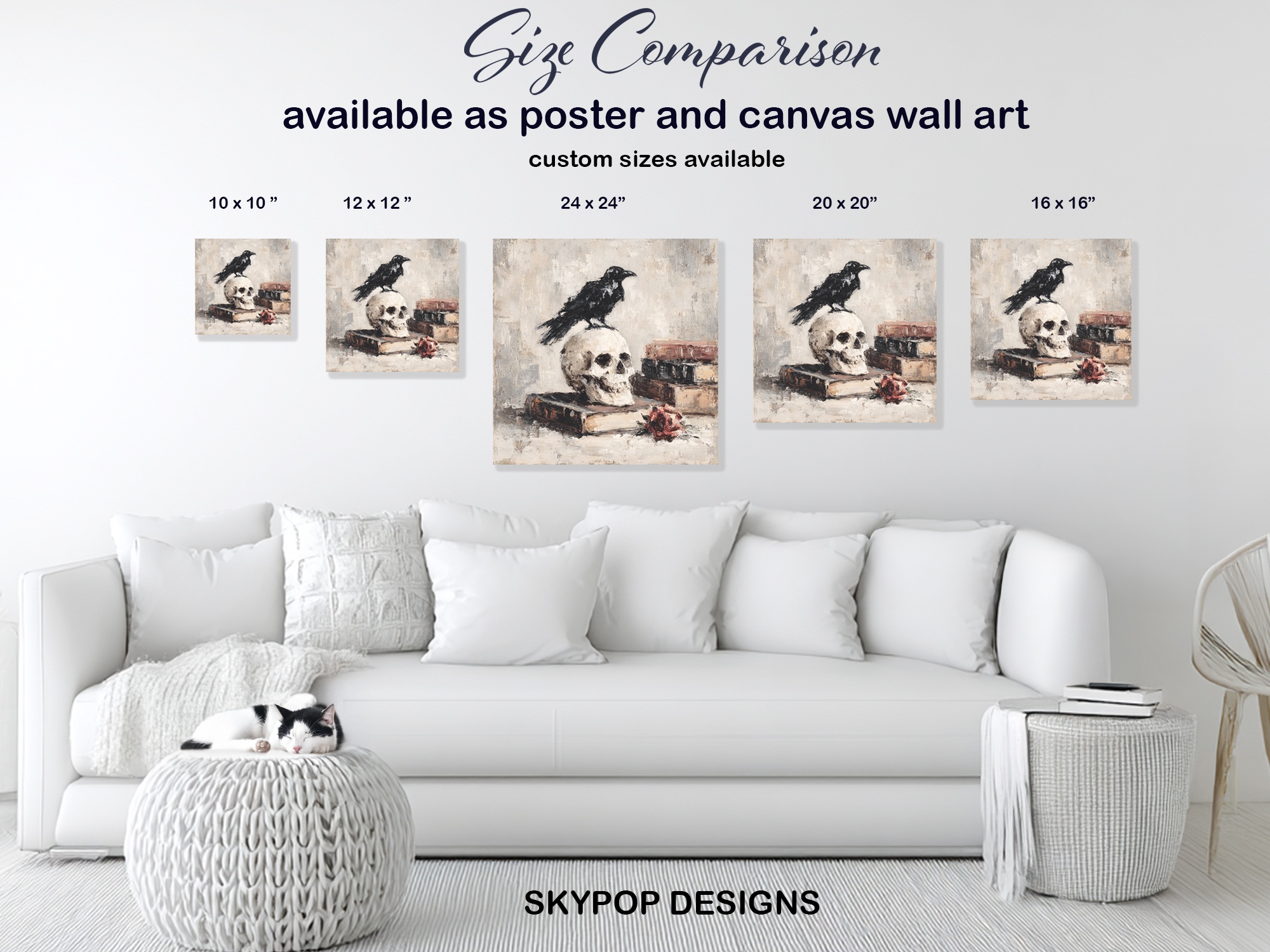 Elevate your space with this hauntingly beautiful raven and skull canvas wall art, perfect for those who appreciate dark elegance and gothic aesthetics. This striking poster captures a somber scene of a black raven perched atop a weathered skull, surrounded by aged books and a withered rose. The muted color palette of blacks, whites, and browns creates a moody atmosphere that instantly transforms any room into a sophisticated sanctuary. Ideal for gothic-inspired home offices or rustic living rooms, this canvas wall art adds depth and intrigue to your walls. The contrasting textures of the raven’s glossy feathers against the skull’s smooth surface showcase exquisite attention to detail. This versatile piece works wonderfully in traditional libraries, adding a touch of mystery and intellect to your decor. The symbolic elements of wisdom, mortality, and nature’s cycle make this artwork a powerful conversation starter. Whether displayed in a cozy reading nook or as a focal point in your bedroom, this canvas brings a sense of timeless drama to your space. The high-quality printing ensures every brushstroke and subtle shadow is captured, making it a stunning addition to any art collection. Perfect as a unique housewarming gift or to refresh your seasonal decor, this raven and skull art piece adapts beautifully to various interior styles. Transform your room with this captivating blend of vintage charm and gothic allure – a must-have for those who appreciate the darker side of art and nature.