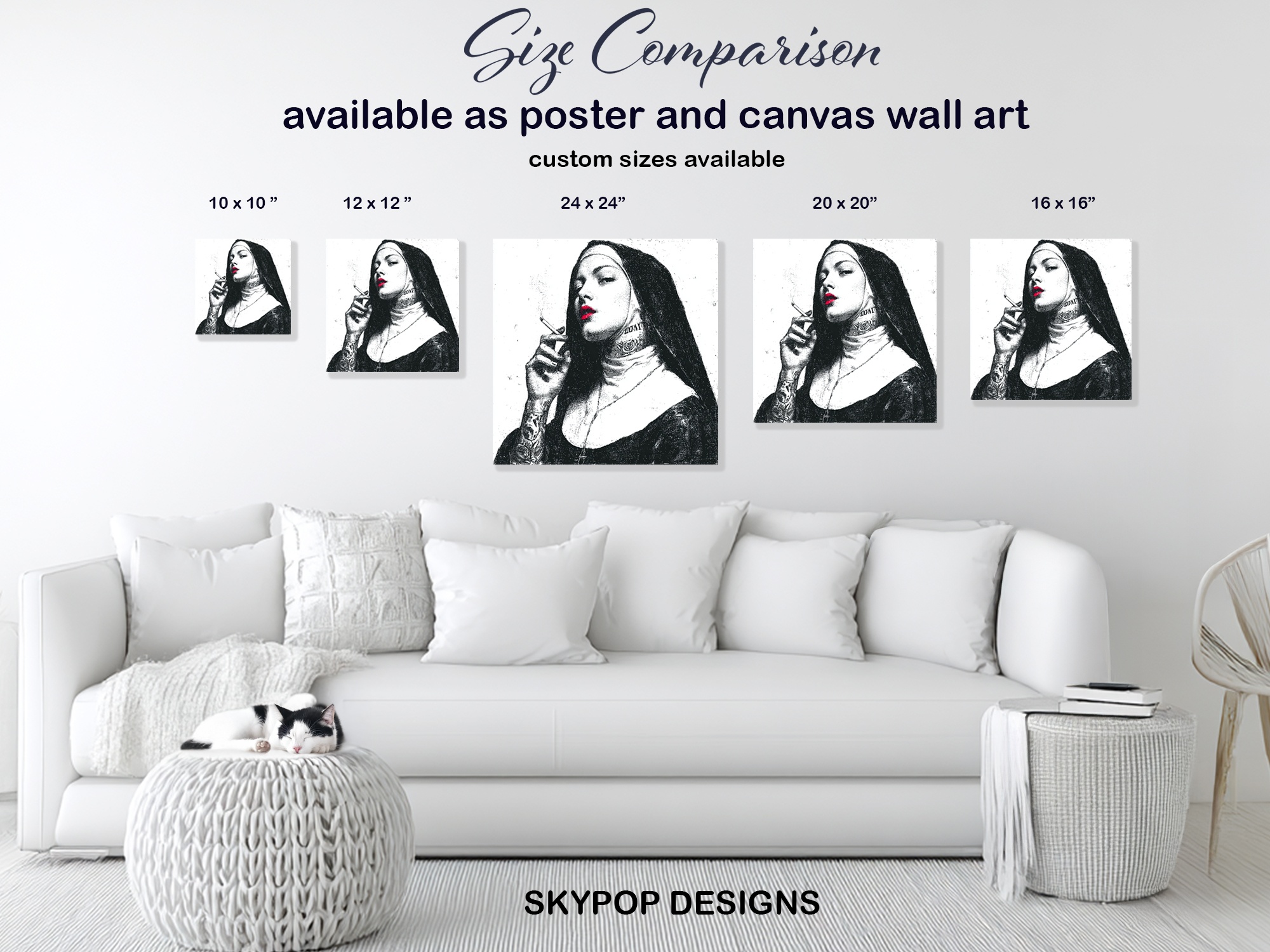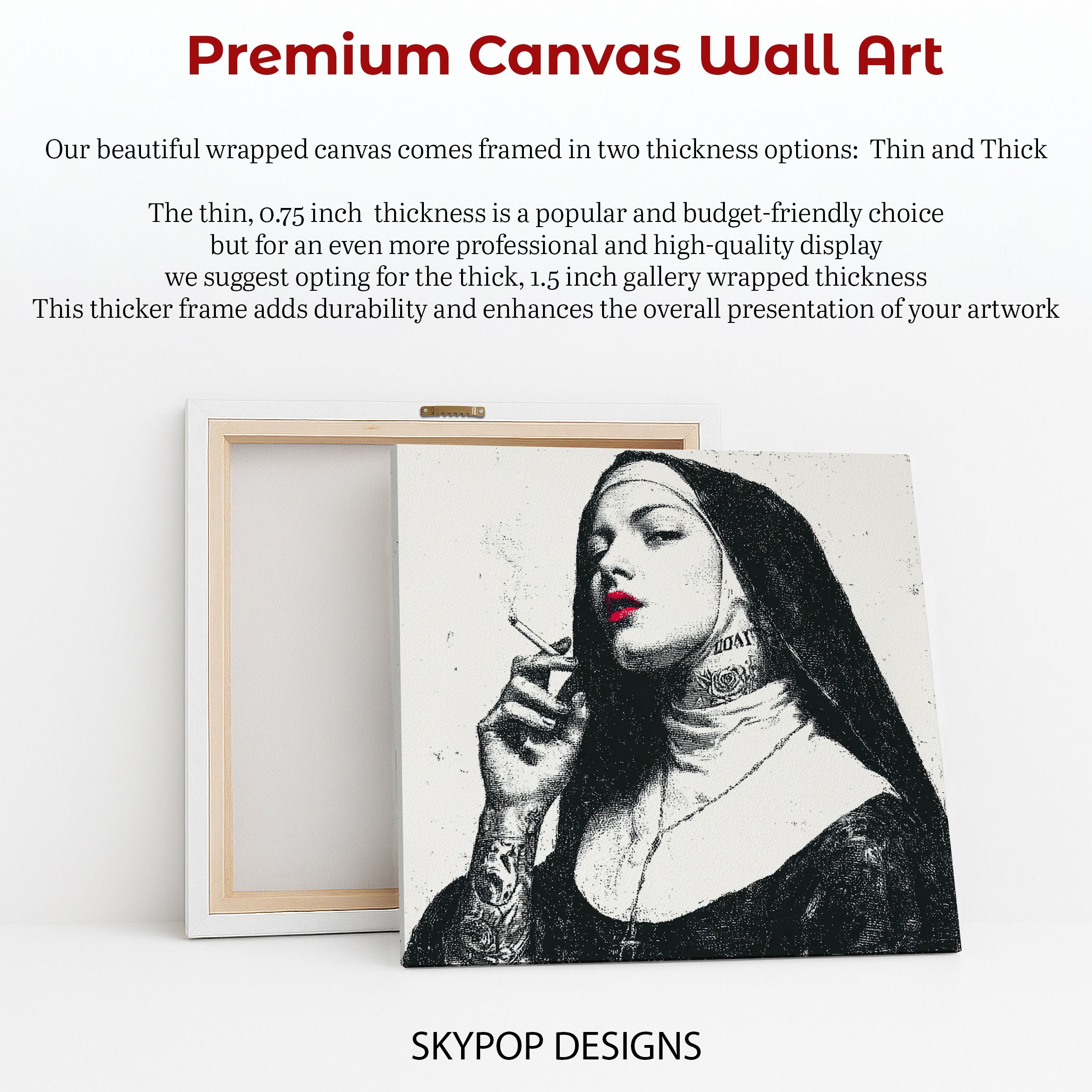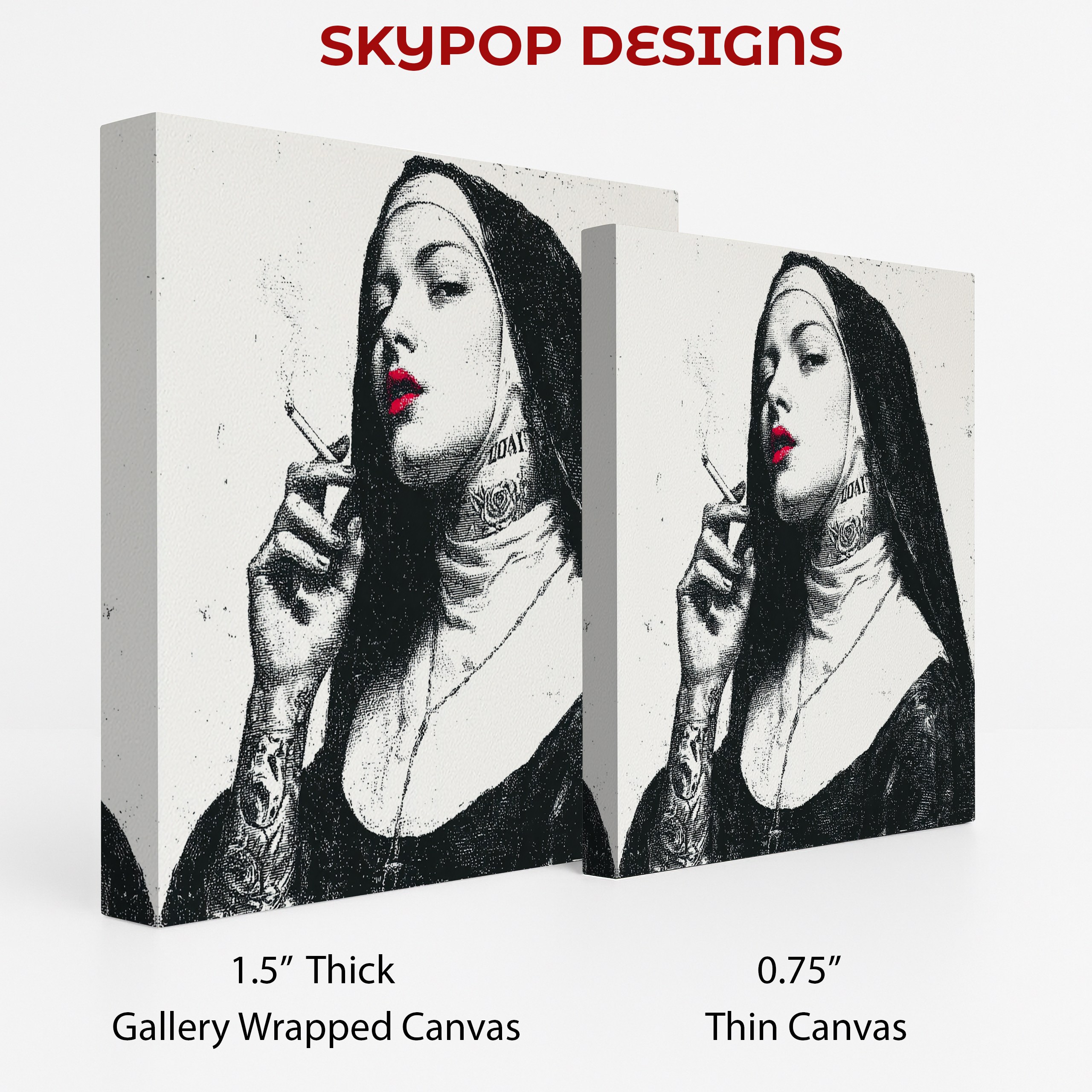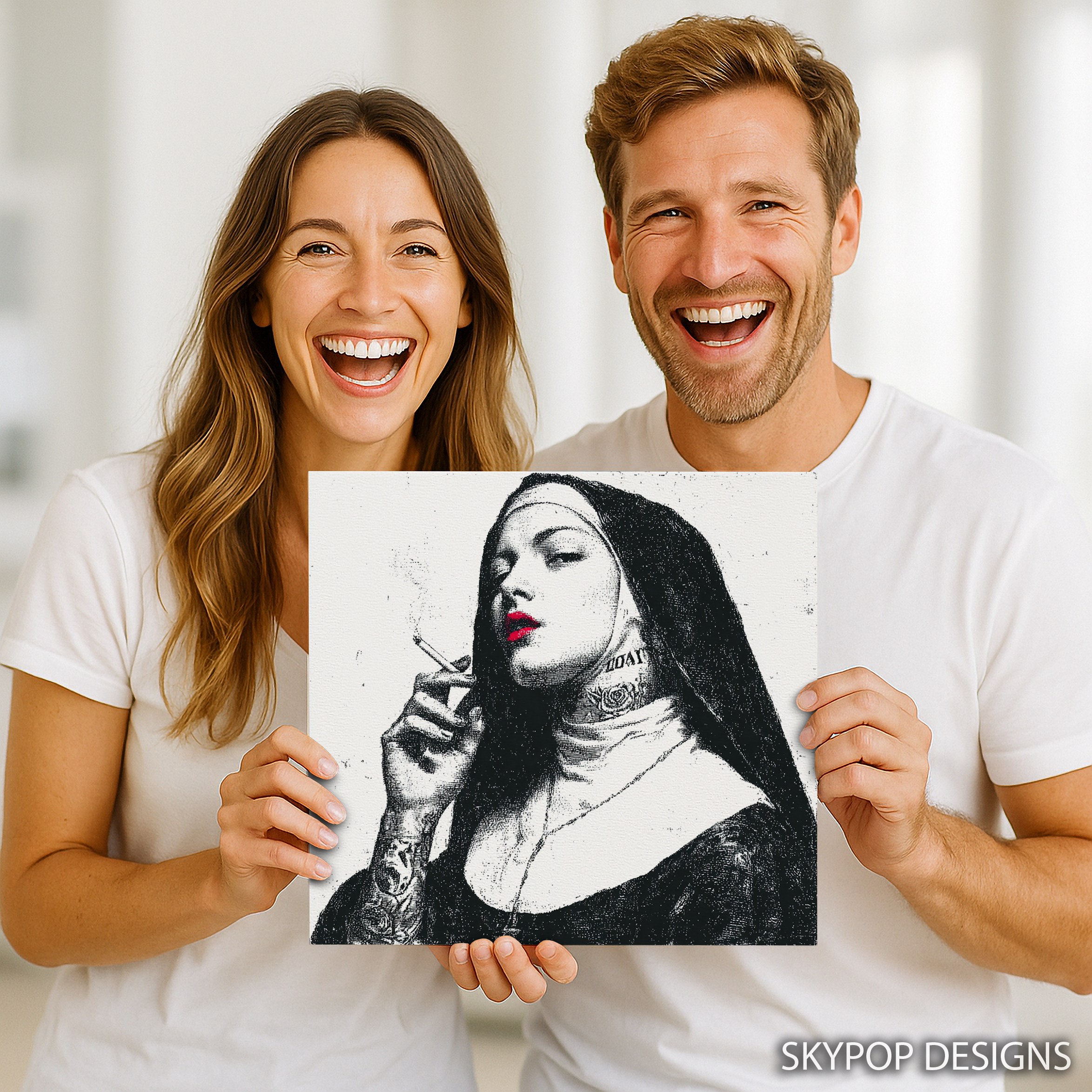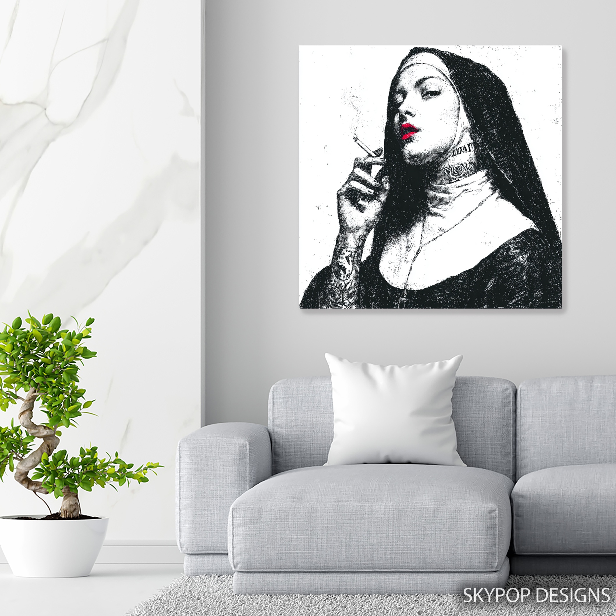 Make a bold statement with this striking canvas wall art featuring a provocative nun image. This contemporary street art-inspired poster combines classic religious imagery with modern rebellion, creating an eye-catching piece that demands attention. The high-contrast black and white design is punctuated by vibrant red lips, adding a pop of color that draws the eye. Perfect for modern living rooms or edgy bedroom decor, this canvas art challenges conventions and sparks conversation. The minimalist color palette allows this piece to complement various interior styles while making a strong visual impact. Ideal for those who appreciate urban art and unconventional aesthetics, this wall art transforms any space with its daring attitude. The juxtaposition of traditional nun attire with tattoos and a cigarette creates a thought-provoking narrative that keeps viewers engaged. Whether displayed in a sleek office or a contemporary bathroom, this artwork adds personality and edge to your decor. The fine details, from the delicate smoke wisps to the intricate tattoo designs, showcase the high-quality printing process. This versatile piece works well as a standalone focal point or as part of a curated gallery wall. Elevate your home’s atmosphere with this unique blend of religious iconography and street art style. Make a statement and redefine your space with this captivating canvas wall art today.