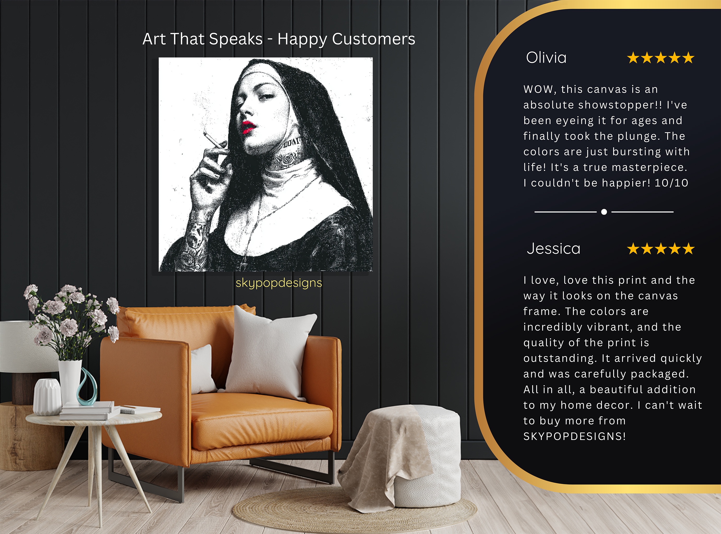 At SKYPOPDESIGNS, we specialize in high-quality canvas and poster prints designed to bring sophistication and style to your space. Please note that our designs are not created with 3D textures or as original oil, acrylic, or watercolor paintings; they are instead HD reproductions of original artwork. This approach allows us to offer these visually stunning pieces at competitive prices, ensuring you receive top-tier, maintenance-free art that’s easy to enjoy.