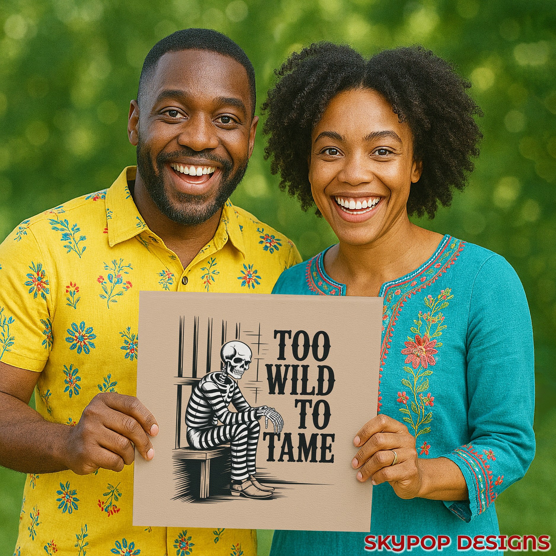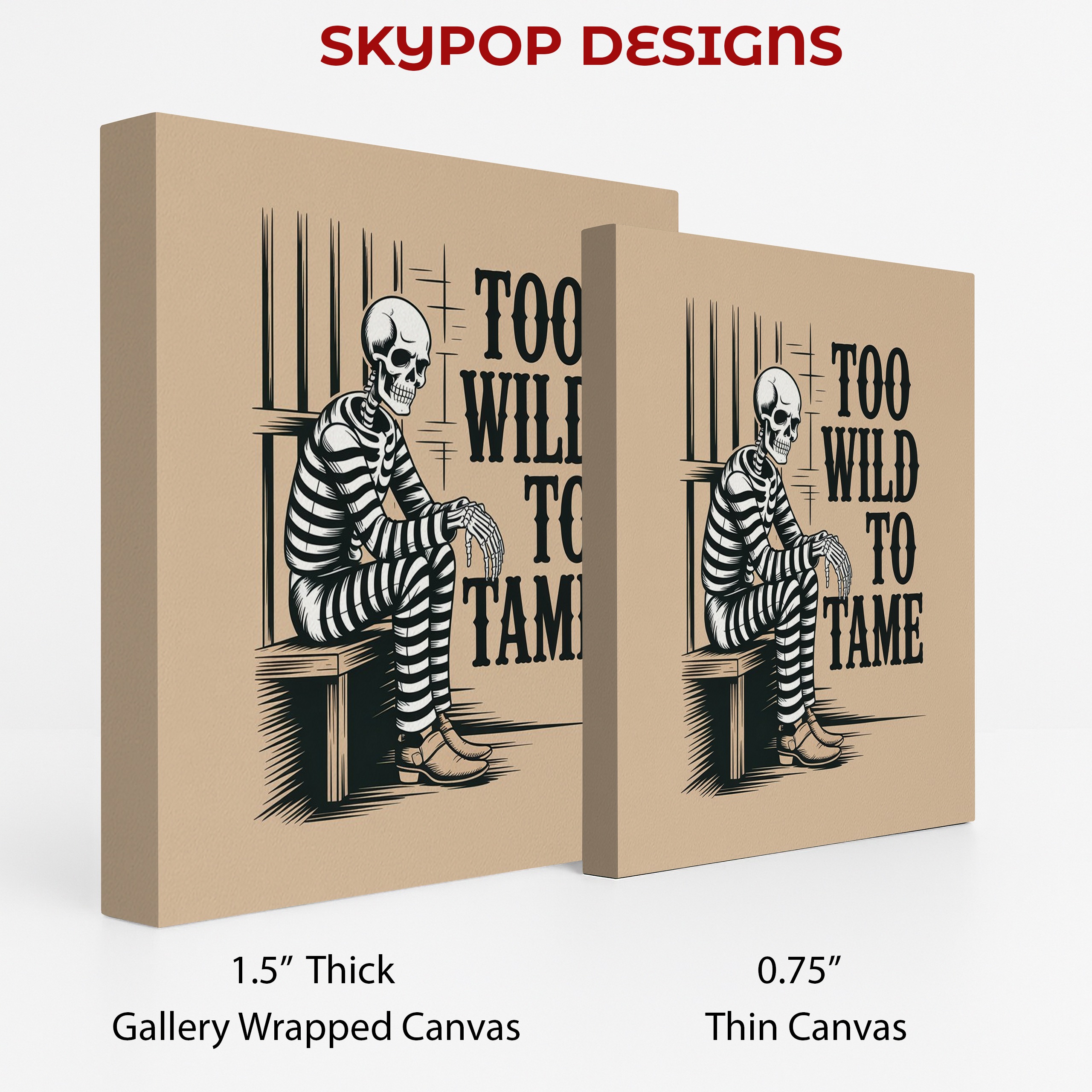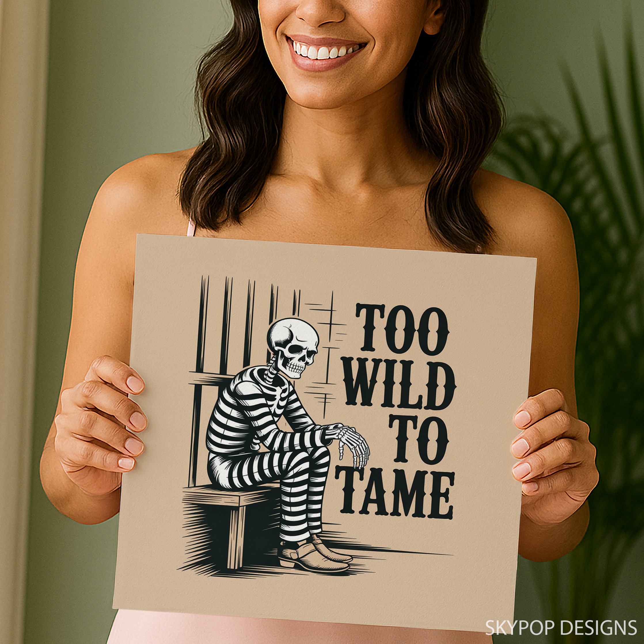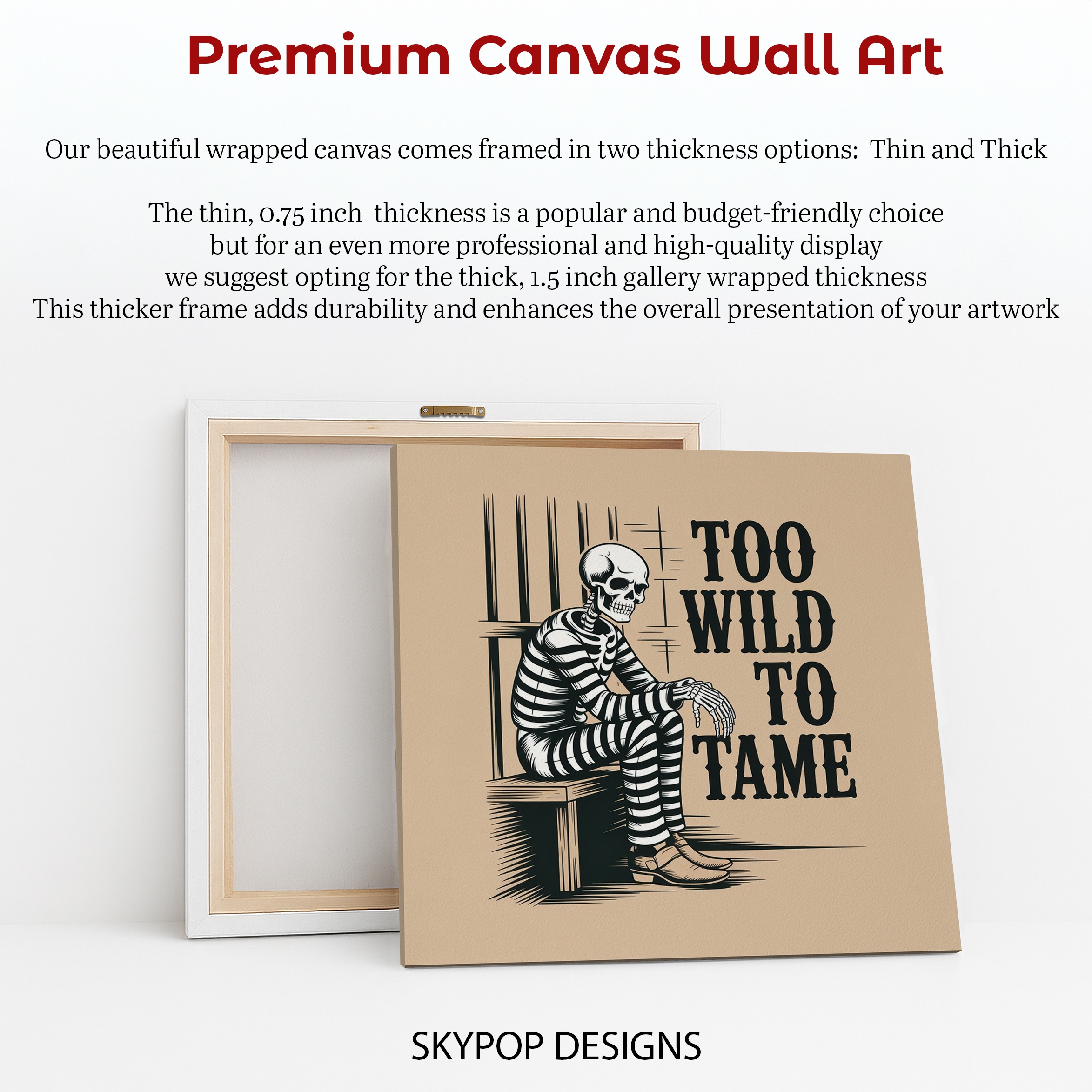 Add a bold statement to your walls with this striking skeleton canvas wall art that embodies the spirit of rebellion. This eye-catching poster features a skeletal figure dressed in a striped prisoner outfit, sitting casually with the provocative text “Too Wild to Tame.” Perfect for contemporary living rooms or edgy office spaces, this modern wall decor combines street art aesthetics with a touch of vintage charm. The stark black and white color scheme creates a powerful contrast against the beige background, making it a standout piece in any room. Ideal for those who love unique and thought-provoking art, this canvas print celebrates individuality and defiance of norms. The detailed illustration style brings the skeleton to life, from the intricate bone structure to the texture of the striped clothing. Great as a conversation starter in game rooms or as an inspiring addition to bedroom decor, this artwork adds character and attitude to your space. The high-quality printing ensures every line and shadow is captured, making it a durable and long-lasting piece. Whether you’re a fan of alternative art or looking to inject some rebellious energy into your home, this skeleton wall art is sure to make an impact. Transform your living space with this bold and expressive canvas that perfectly balances edgy design with artistic flair. Embrace your wild side and make a statement with this unique piece of wall art today.