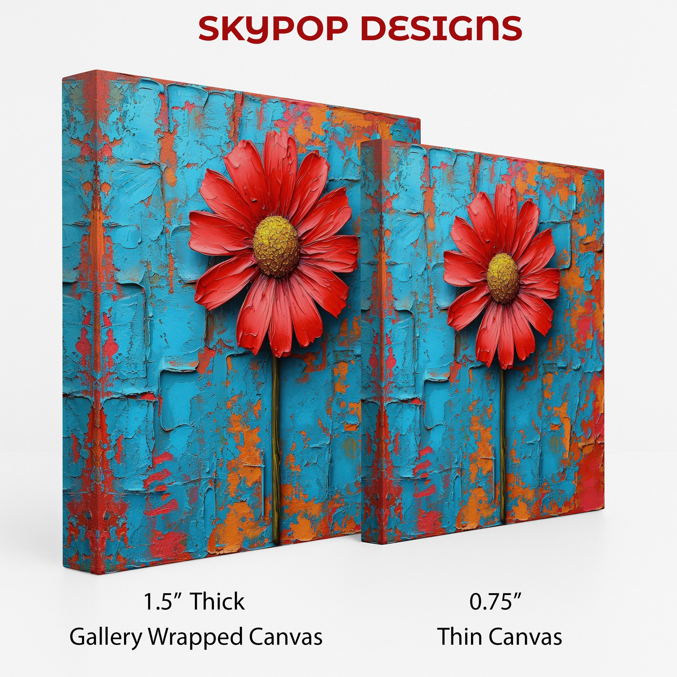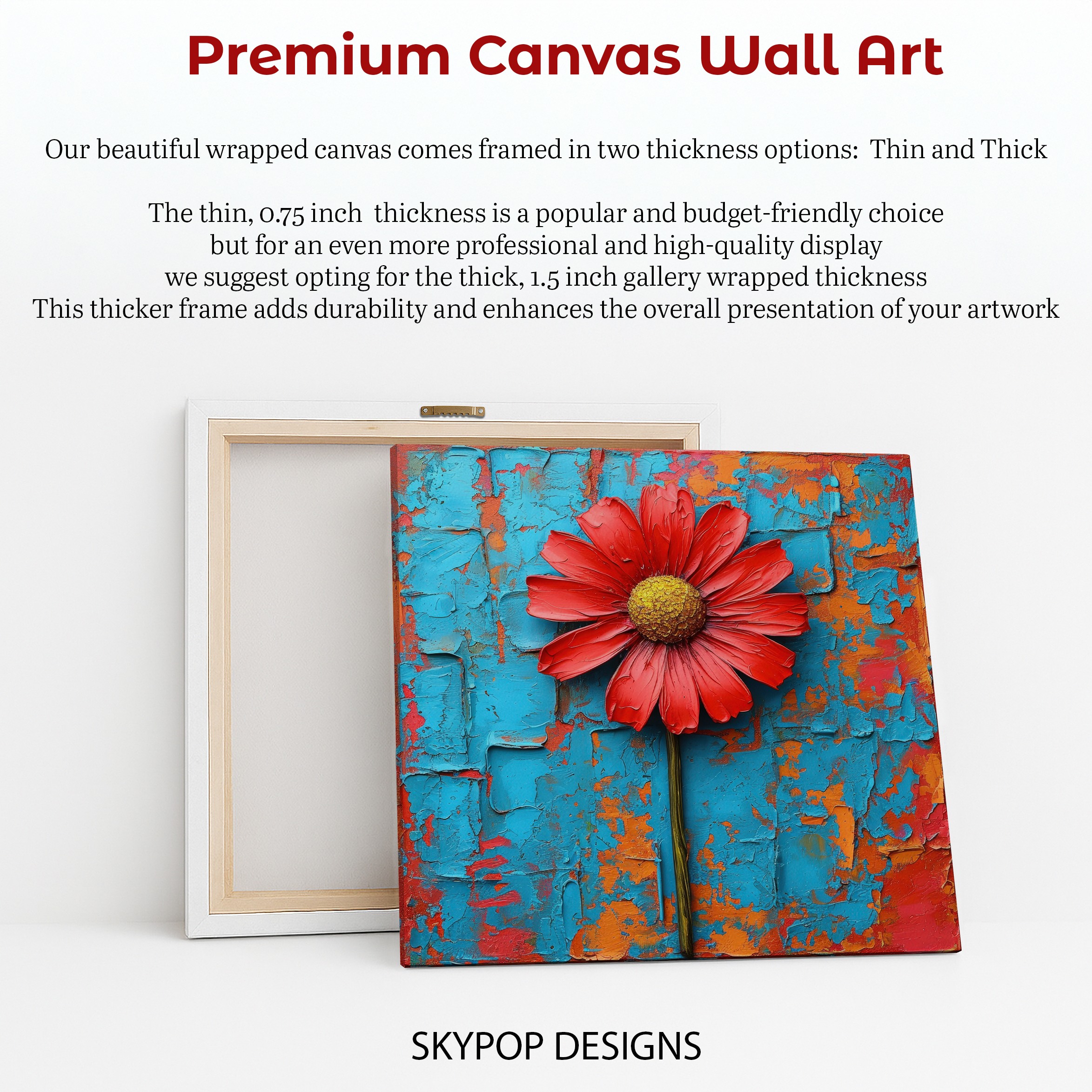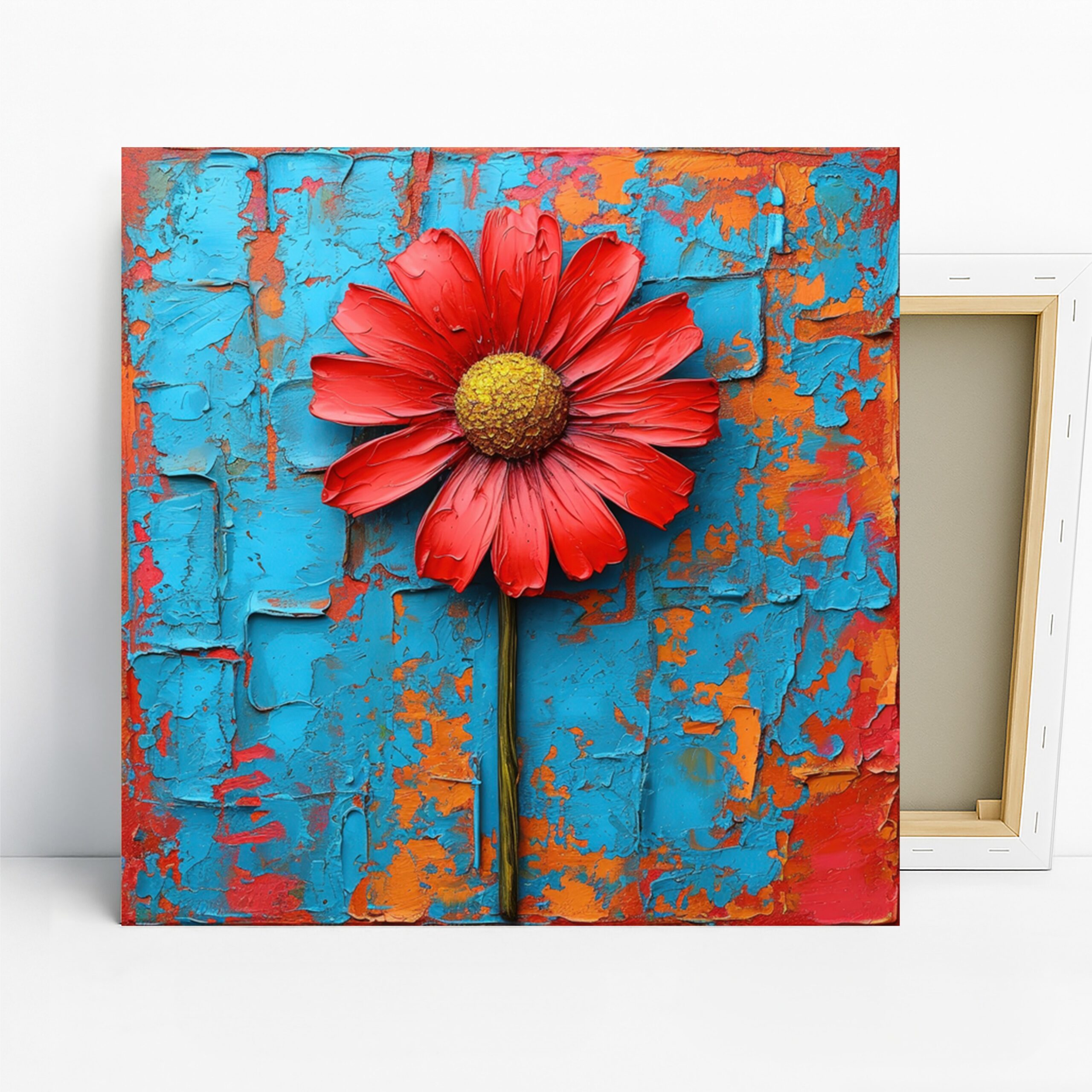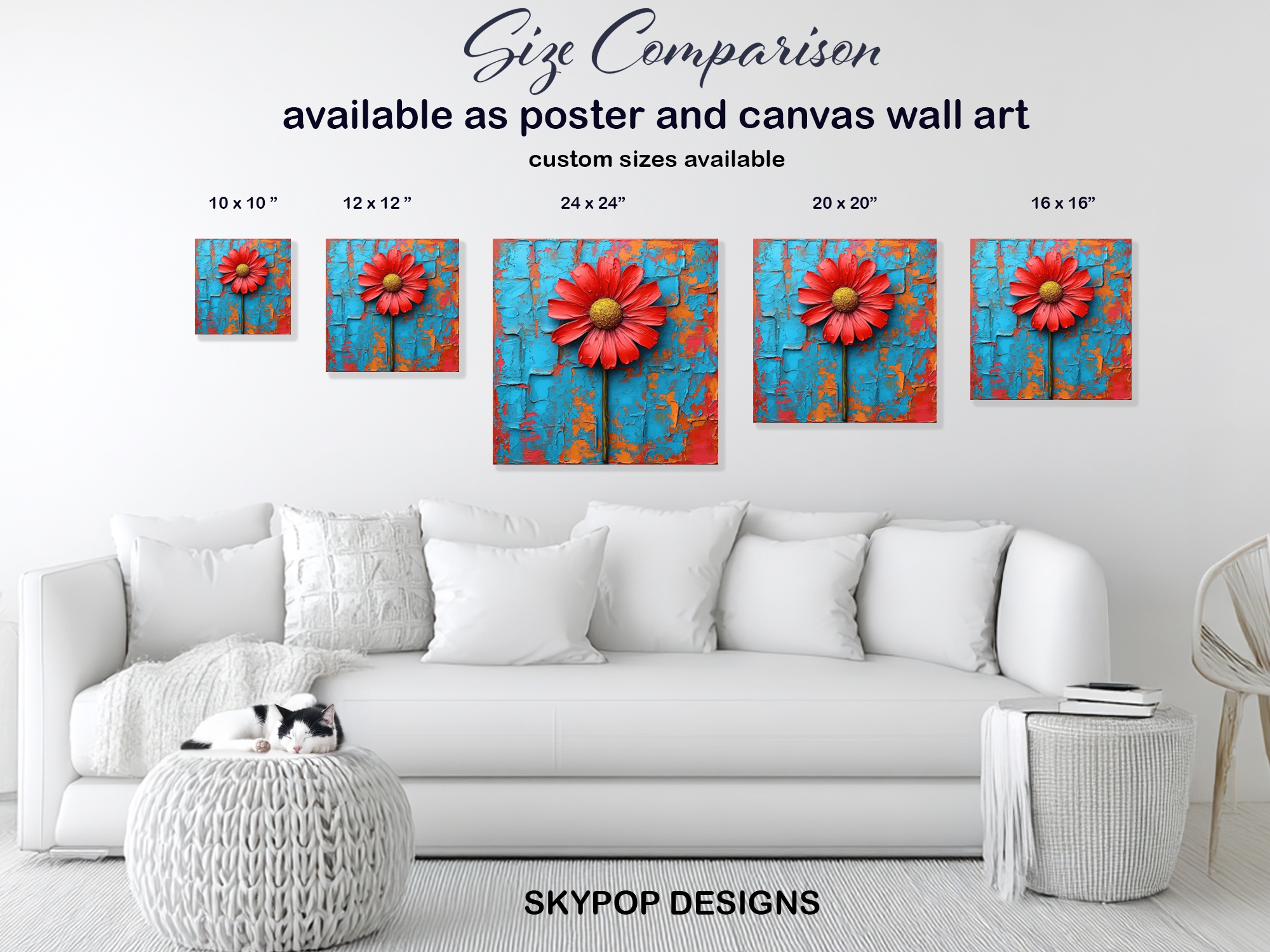 Elevate your home with striking red daisy canvas wall art that brings a vibrant pop of color and contemporary flair to any space. This captivating poster or canvas wall art features a bold red daisy set against a textured, abstract background of blues and oranges, creating a dynamic visual experience. Perfect for modern living room decor, this artwork instantly transforms your entryway or office into an inspiring environment. The rich reds and blues work harmoniously to evoke feelings of energy and tranquility, making this canvas wall art a versatile statement piece. It is ideal for bohemian aesthetics seeking a focal point or minimalist interiors wanting a touch of vibrant nature art. The textured brushstrokes add depth and a sophisticated feel, ensuring this poster and canvas wall art is admired from every angle. This stunning floral art is also a wonderful gift for housewarmings, birthdays, or holidays, bringing lasting beauty to a loved one’s home. High-quality printing captures the vivid colors and intricate details of the daisy and its abstract backdrop. Whether you’re looking to enhance your bedroom ambiance or add personality to your hallway, this artwork delivers. Experience the power of bold color and modern design with this unique daisy wall art. Add this eye-catching floral canvas art to your collection and brighten your space today.