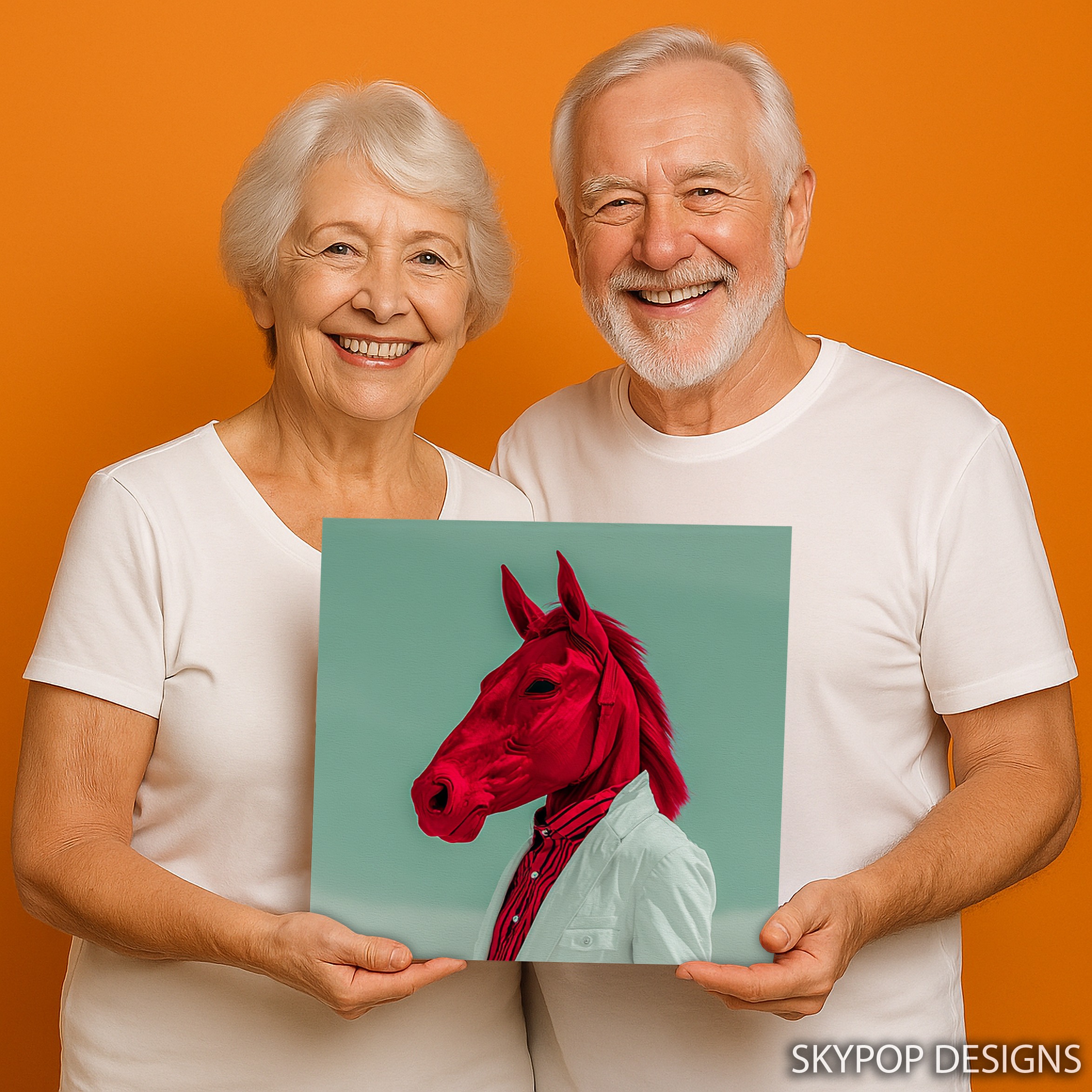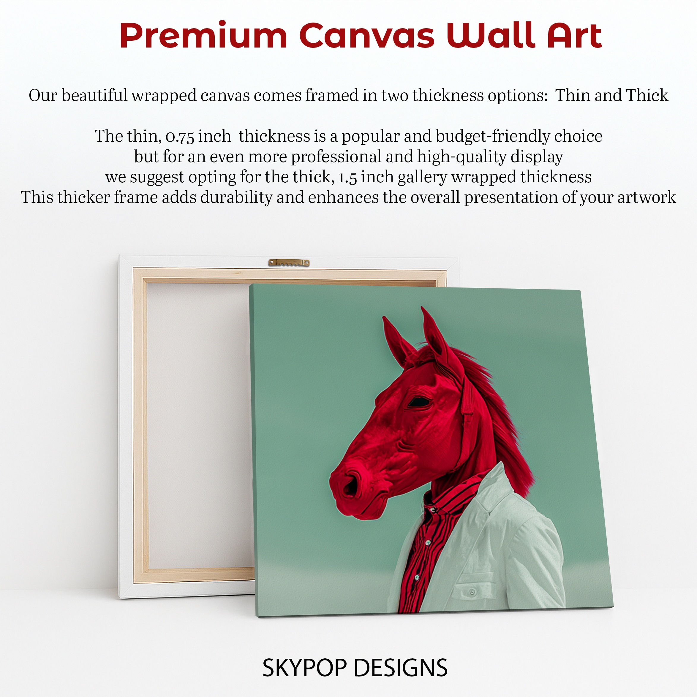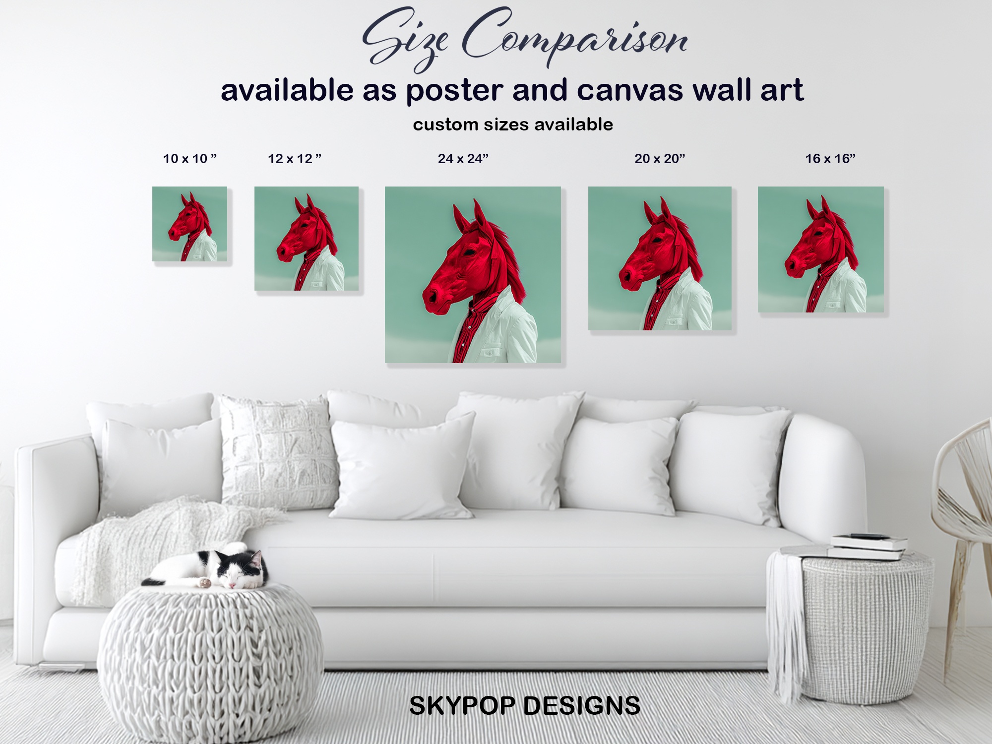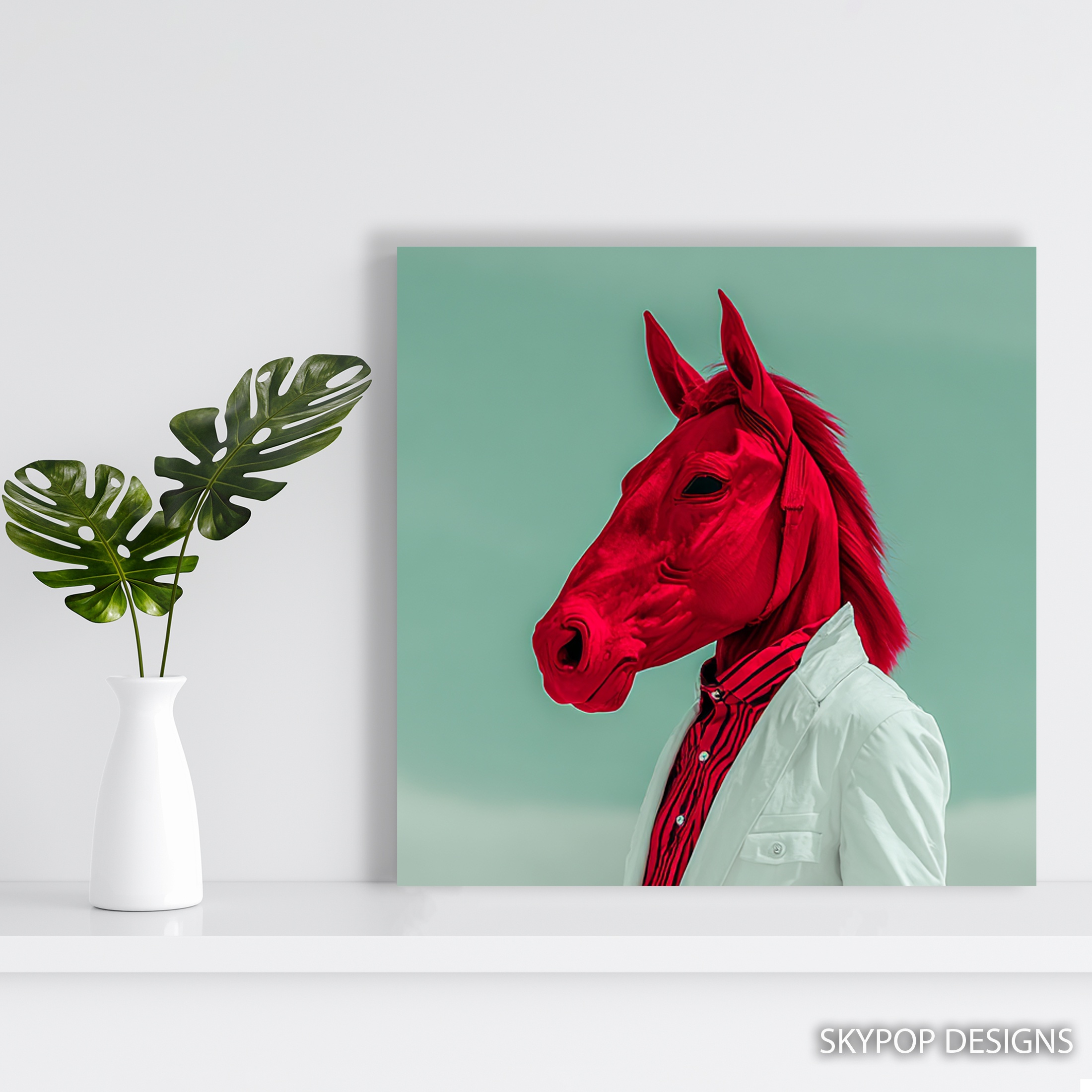 Transform your space with this striking red horse canvas wall art that blends surrealism and contemporary style. This eye-catching poster features a vibrant red horse head wearing a crisp white suit and striped shirt, creating a bold and unexpected visual statement. Perfect for modern offices or minimalist living rooms, this unique animal art adds a touch of whimsy and sophistication to any interior. The vivid red color against the calming mint green background creates a captivating contrast that draws the eye and sparks conversation. Ideal for those who appreciate avant-garde design, this canvas wall art seamlessly combines animal imagery with human fashion elements, resulting in a thought-provoking piece that challenges conventional art norms. The sharp details and high-quality printing ensure that every aspect of this surreal horse portrait stands out, from the textured mane to the sleek suit lapels. Whether displayed as a focal point in a dining room or as part of a curated gallery wall in a bedroom, this versatile artwork adapts to various decor styles while maintaining its distinctive charm. Give your space an instant style upgrade with this attention-grabbing horse wall art that’s sure to become a talking point for guests. Elevate your home or office decor today with this unique blend of animal art and contemporary fashion that pushes the boundaries of traditional wall decor.