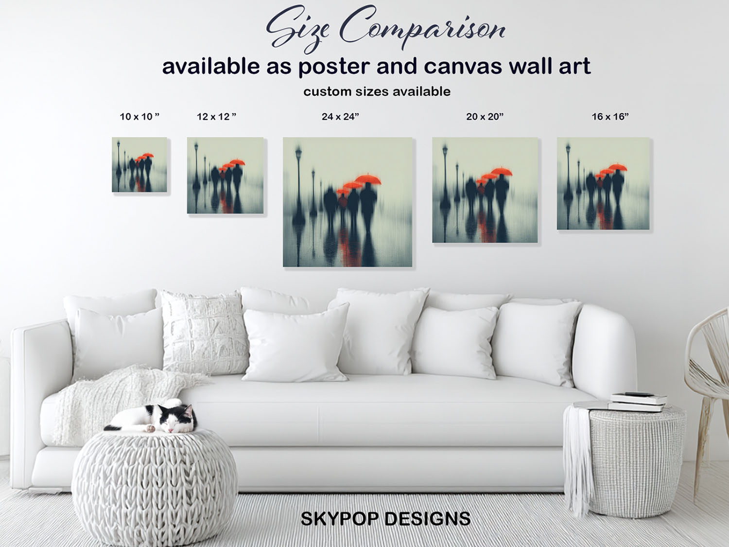 Red Umbrellas in Rain Art, Canvas or Poster, Contemporary Minimalist Coastal Decor, Living Room Entryway Hallway Office Wall Art, Black Grey Red White