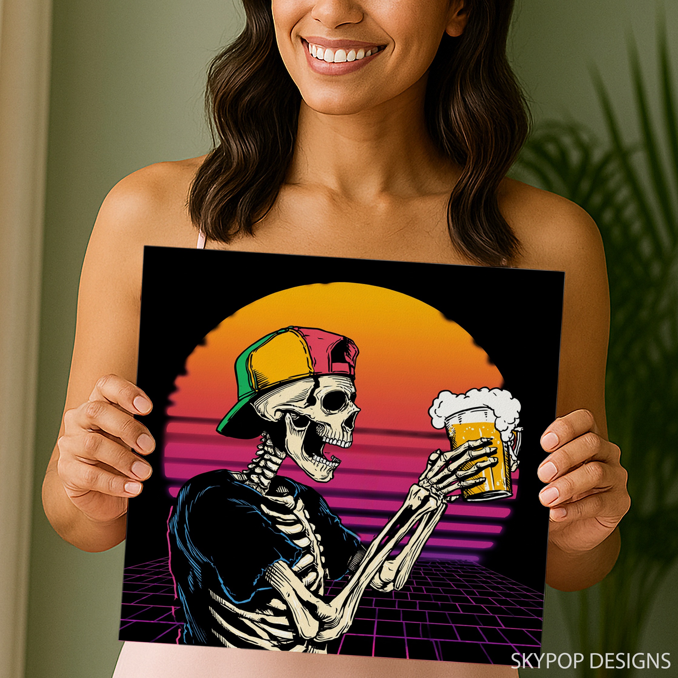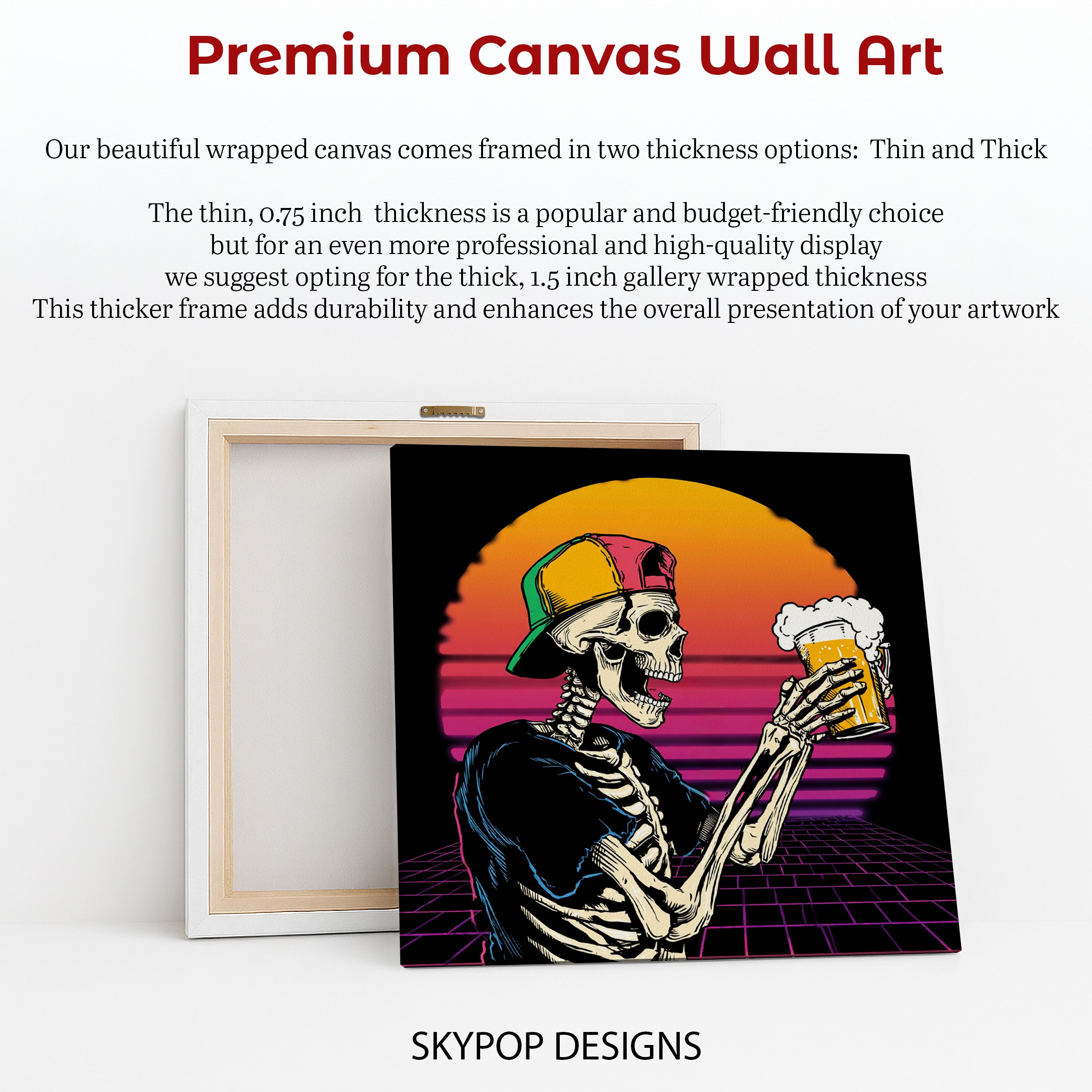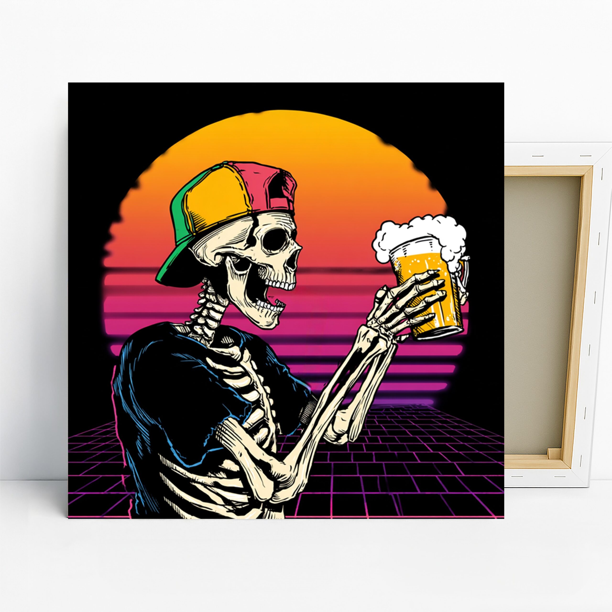 Elevate your space with this eye-catching skeleton canvas wall art that perfectly blends retro vibes with modern pop art style. This striking poster features a vibrant sunset backdrop and a skeleton in a colorful cap, gleefully enjoying a frothy beer. Transform your game room, home bar, or living room with this conversation-starting piece that celebrates life’s simple pleasures. The bold color palette of oranges, purples, and yellows creates a visually stunning contrast against the skeleton’s stark white bones, making this canvas wall art pop on any wall. Ideal for contemporary decor enthusiasts, this artwork adds a touch of edgy humor and retro cool to minimalist spaces. The sunset gradient and grid-like background evoke a nostalgic 80s aesthetic, perfect for those who love to incorporate vintage elements into their modern home. This versatile canvas art works well in various settings, from a trendy bedroom to a lively entertainment area. The high-quality printing captures every intricate detail, from the skeleton’s toothy grin to the foamy beer mug. Whether you’re looking for unique bar decor or want to add some personality to your living space, this skeleton beer art is sure to be a crowd-pleaser. Make a bold statement and inject some fun into your wall art collection with this retro-inspired skeleton poster today.