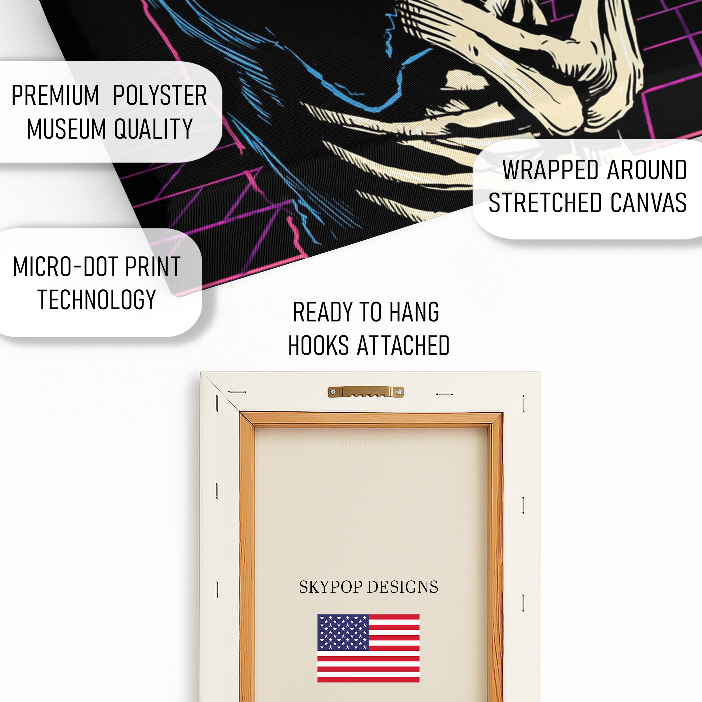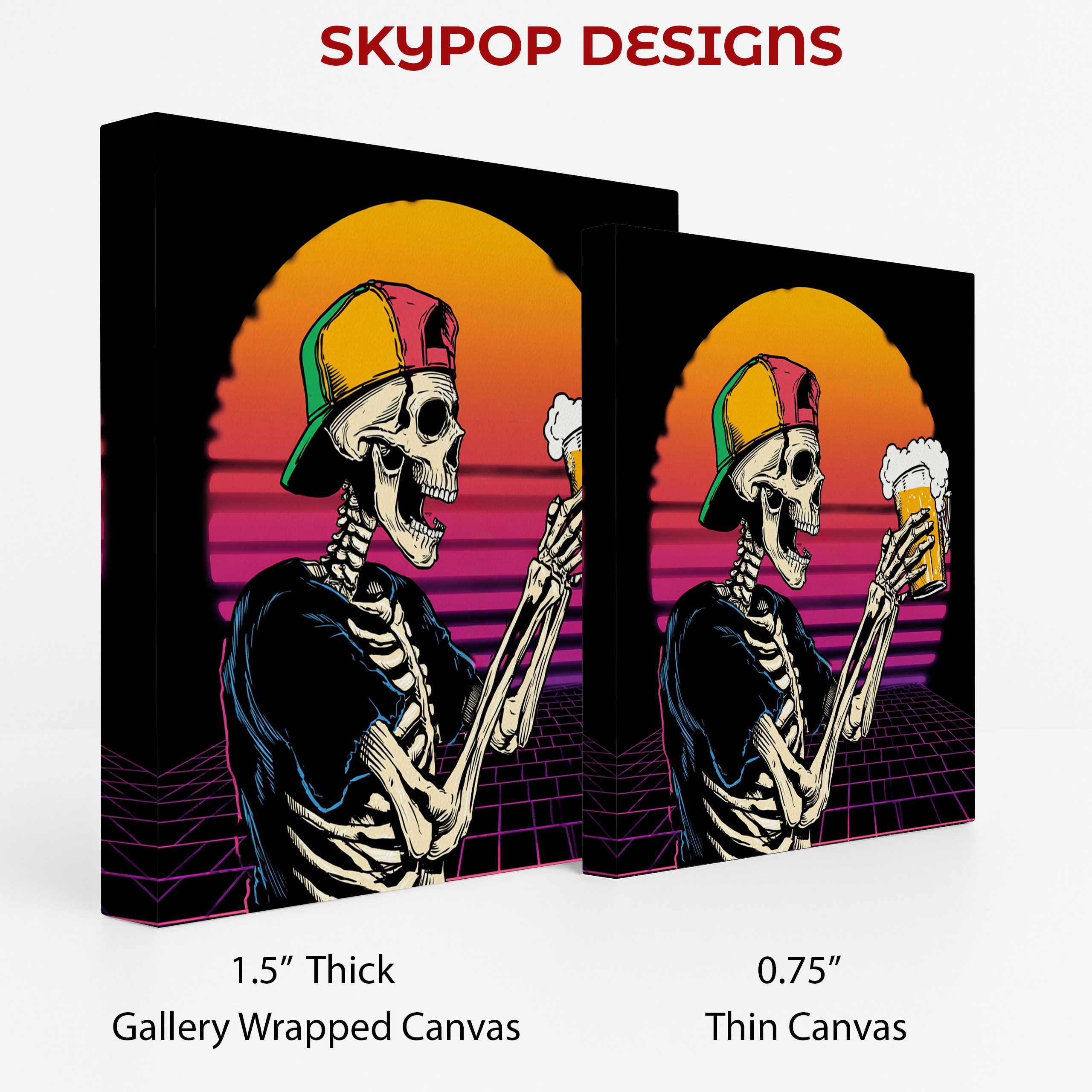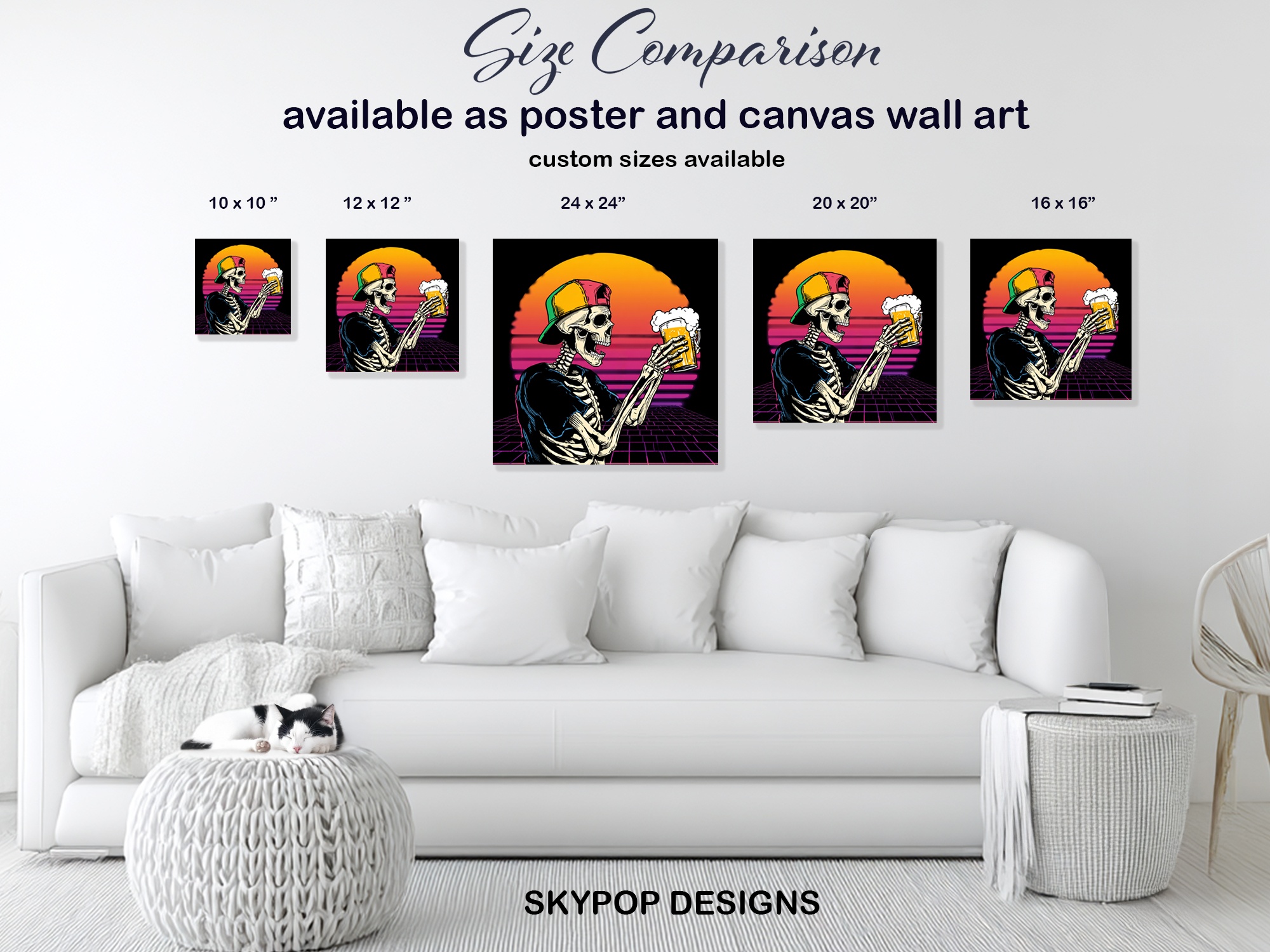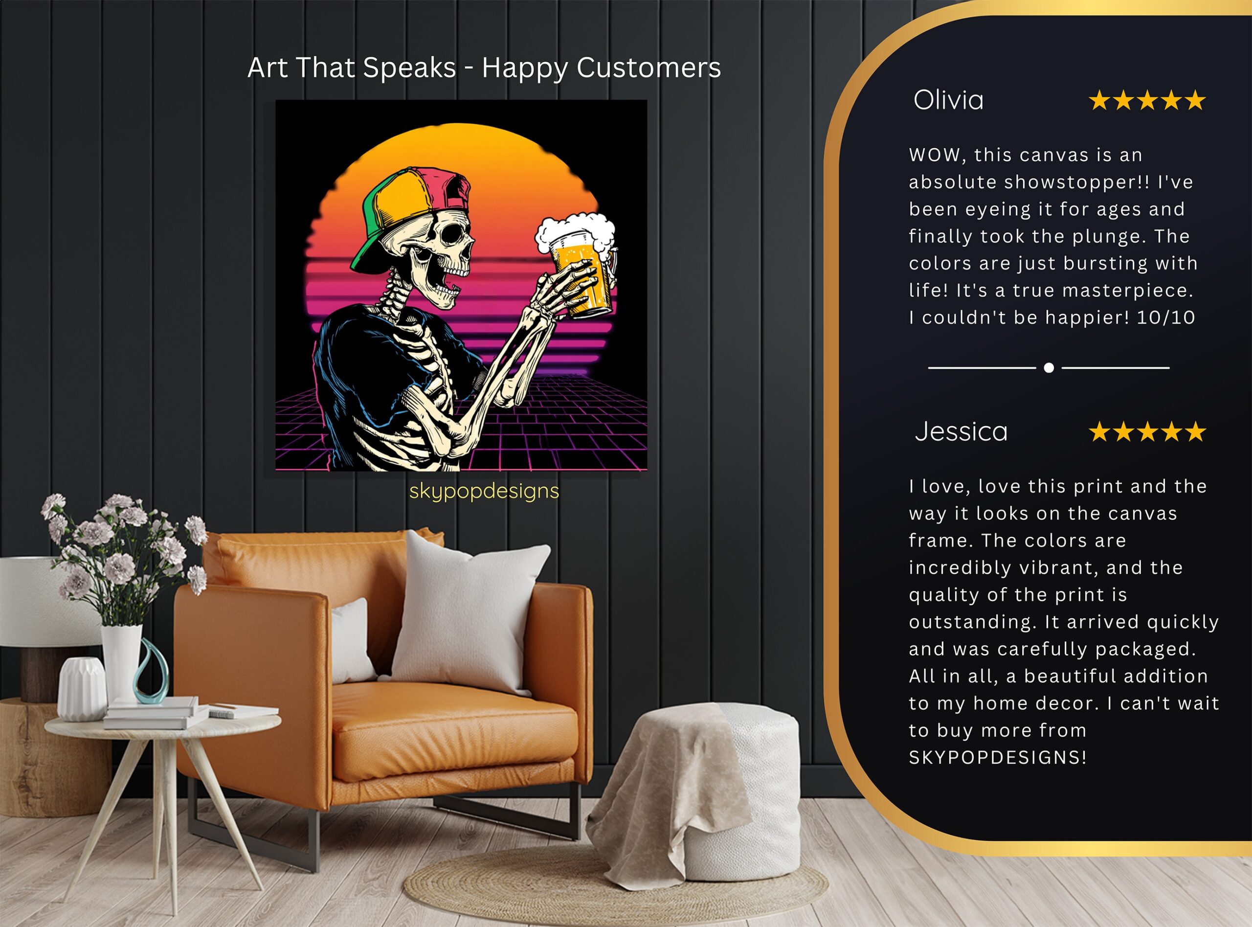 Elevate your space with this eye-catching skeleton canvas wall art that perfectly blends retro vibes with modern pop art style. This striking poster features a vibrant sunset backdrop and a skeleton in a colorful cap, gleefully enjoying a frothy beer. Transform your game room, home bar, or living room with this conversation-starting piece that celebrates life’s simple pleasures. The bold color palette of oranges, purples, and yellows creates a visually stunning contrast against the skeleton’s stark white bones, making this canvas wall art pop on any wall. Ideal for contemporary decor enthusiasts, this artwork adds a touch of edgy humor and retro cool to minimalist spaces. The sunset gradient and grid-like background evoke a nostalgic 80s aesthetic, perfect for those who love to incorporate vintage elements into their modern home. This versatile canvas art works well in various settings, from a trendy bedroom to a lively entertainment area. The high-quality printing captures every intricate detail, from the skeleton’s toothy grin to the foamy beer mug. Whether you’re looking for unique bar decor or want to add some personality to your living space, this skeleton beer art is sure to be a crowd-pleaser. Make a bold statement and inject some fun into your wall art collection with this retro-inspired skeleton poster today.