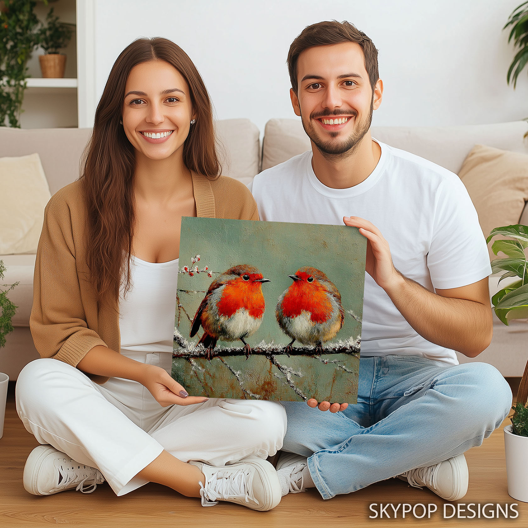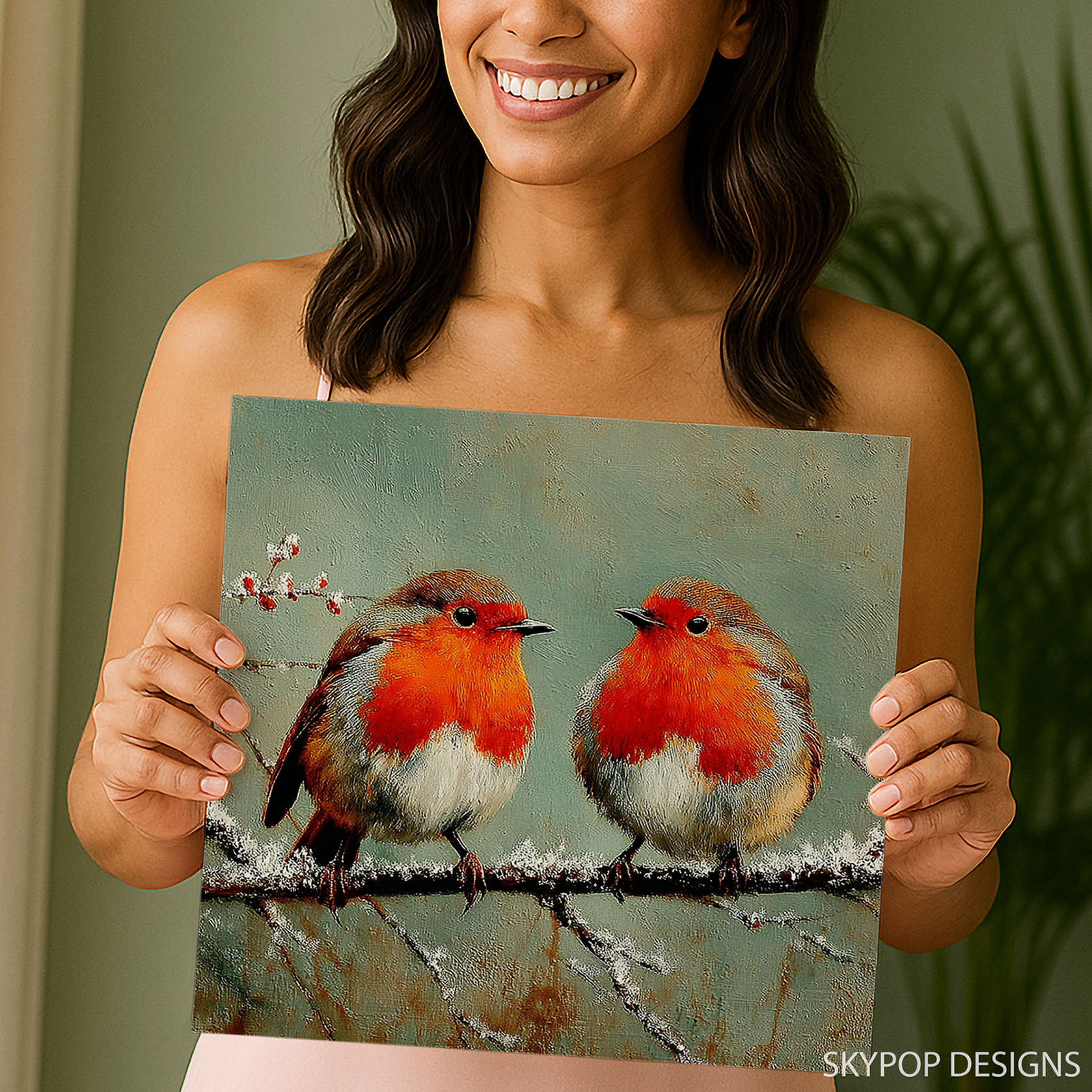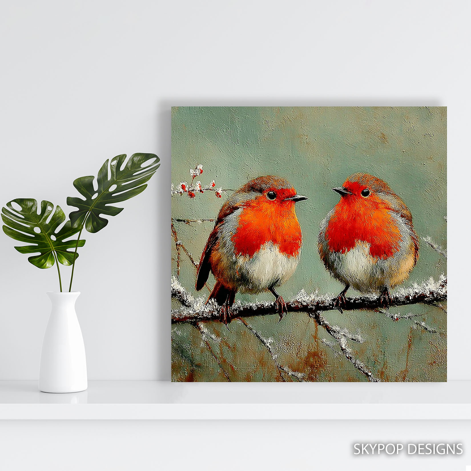 Capture the charm of nature with this delightful robin canvas wall art, an ideal addition to your home decor. This striking poster or canvas wall art showcases two cheerful robins perched on a snow-dusted branch, bringing a touch of winter wonder indoors. The rich orange of the robins’ chests pops against the muted grey and white background, creating a captivating visual that enhances any living room or bedroom. Perfect for rustic and farmhouse decor styles, this animal art piece adds warmth and personality to your walls. The detailed brushwork and textured finish of this canvas wall art create a sense of depth and realism, making the birds appear as if they are about to take flight. This art is particularly popular in traditional settings, adding a classic yet inviting feel to dining rooms or entryways. The serene atmosphere evoked by this robin artwork is perfect for creating a cozy and comforting ambiance in your home. It’s a wonderful gift idea for bird lovers, housewarmings, or holiday celebrations, offering a timeless piece of nature art for any occasion. The versatile size options for this canvas wall art ensure it fits seamlessly into your existing decor, whether you prefer a subtle accent or a bold statement piece. Elevate your space with this beautiful representation of nature’s beauty, a perfect blend of artistic skill and charming subject matter. Bring the outdoors in with this stunning robin poster or canvas wall art that celebrates the simple elegance of the natural world. Transform your home with this heartwarming artwork today.