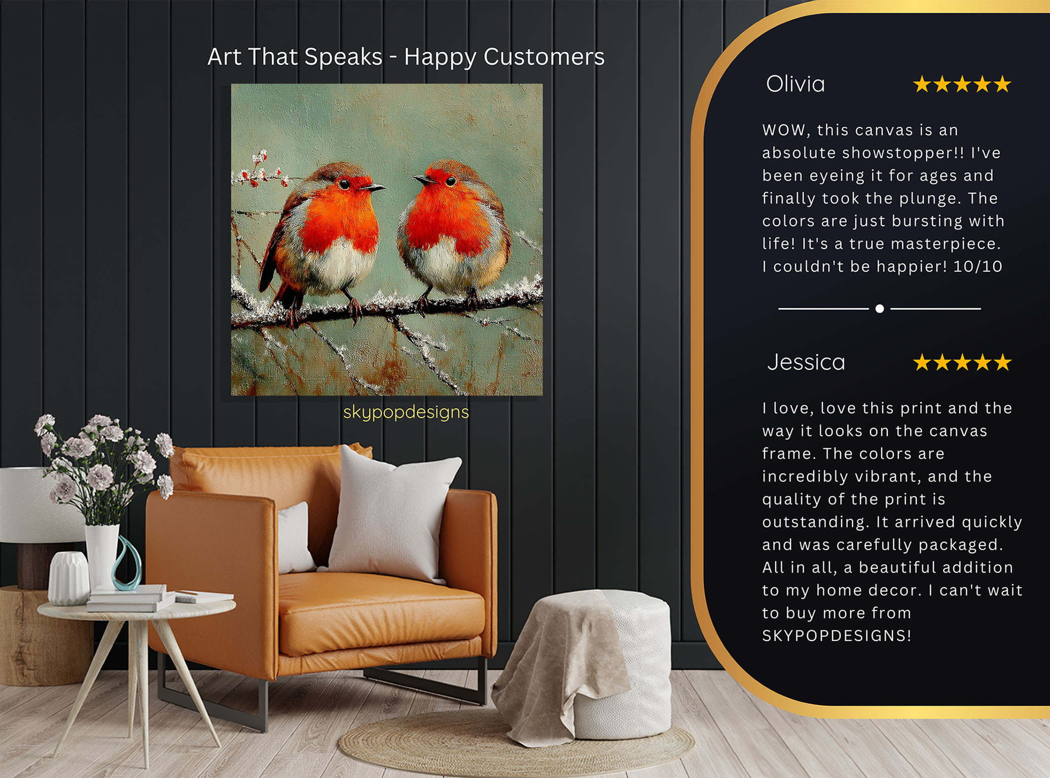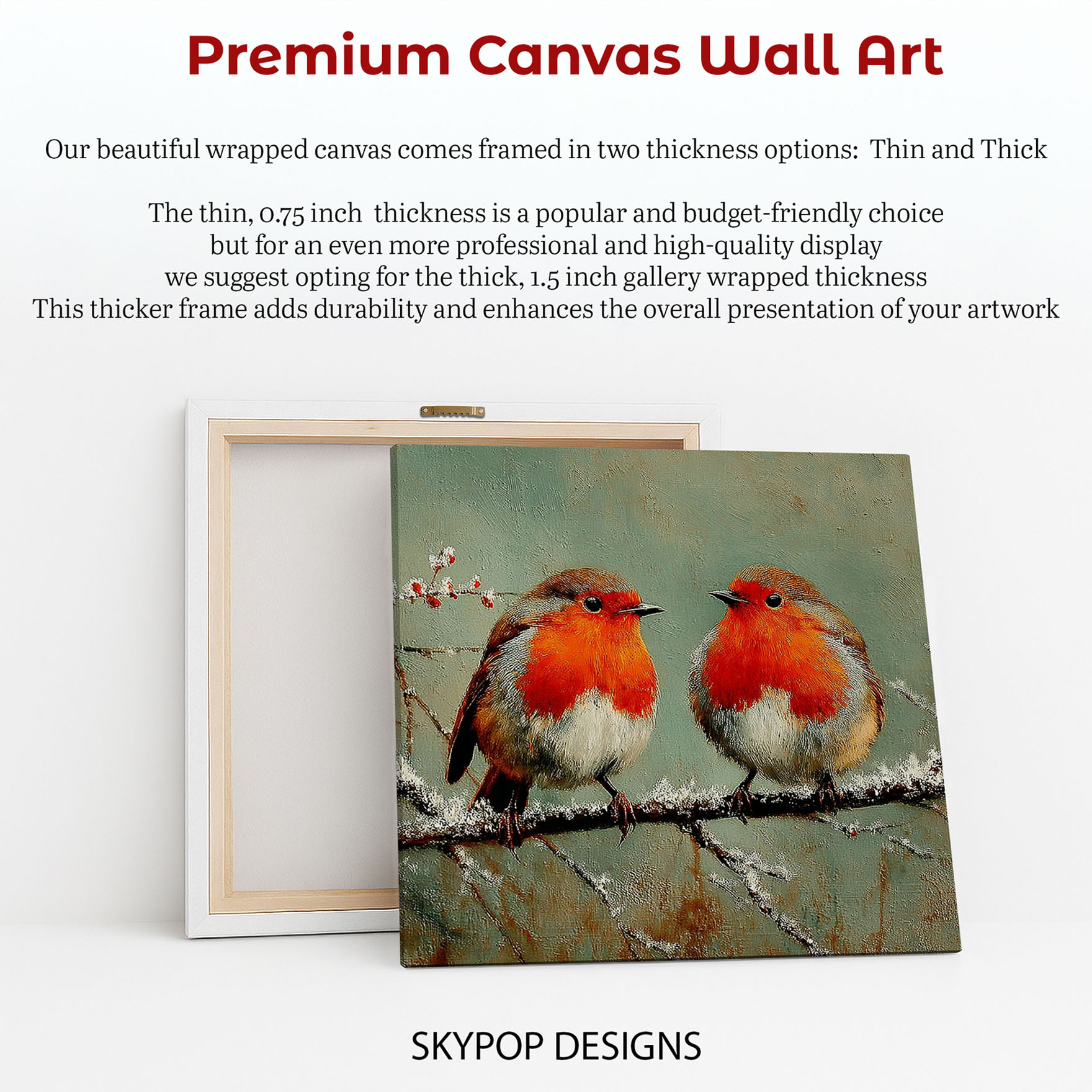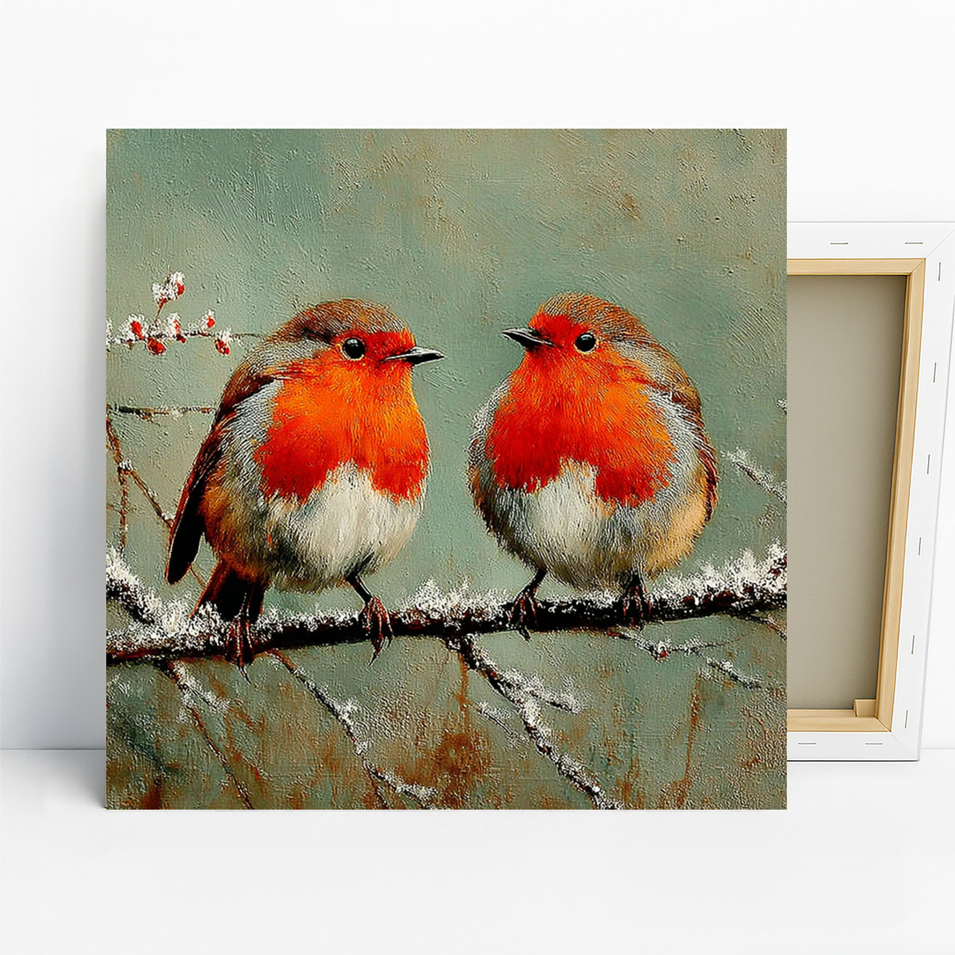 Capture the charm of nature with this delightful robin canvas wall art, an ideal addition to your home decor. This striking poster or canvas wall art showcases two cheerful robins perched on a snow-dusted branch, bringing a touch of winter wonder indoors. The rich orange of the robins’ chests pops against the muted grey and white background, creating a captivating visual that enhances any living room or bedroom. Perfect for rustic and farmhouse decor styles, this animal art piece adds warmth and personality to your walls. The detailed brushwork and textured finish of this canvas wall art create a sense of depth and realism, making the birds appear as if they are about to take flight. This art is particularly popular in traditional settings, adding a classic yet inviting feel to dining rooms or entryways. The serene atmosphere evoked by this robin artwork is perfect for creating a cozy and comforting ambiance in your home. It’s a wonderful gift idea for bird lovers, housewarmings, or holiday celebrations, offering a timeless piece of nature art for any occasion. The versatile size options for this canvas wall art ensure it fits seamlessly into your existing decor, whether you prefer a subtle accent or a bold statement piece. Elevate your space with this beautiful representation of nature’s beauty, a perfect blend of artistic skill and charming subject matter. Bring the outdoors in with this stunning robin poster or canvas wall art that celebrates the simple elegance of the natural world. Transform your home with this heartwarming artwork today.