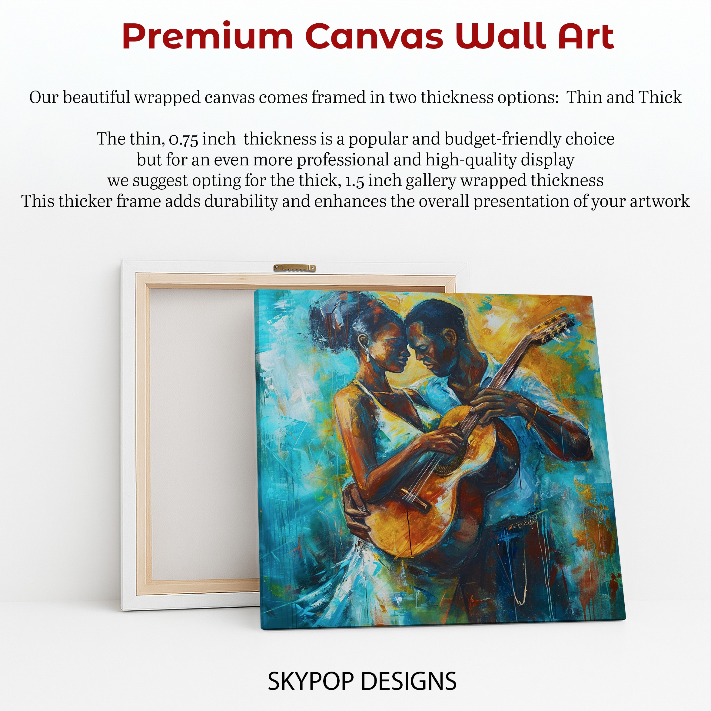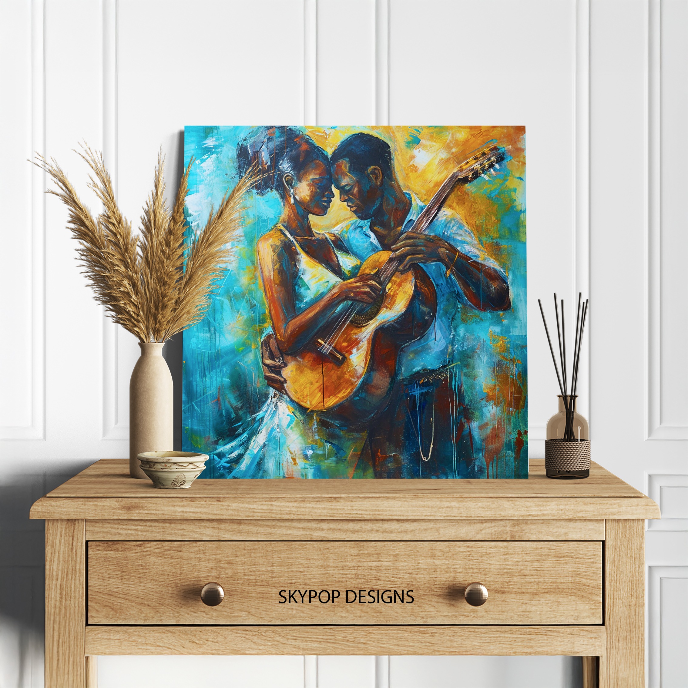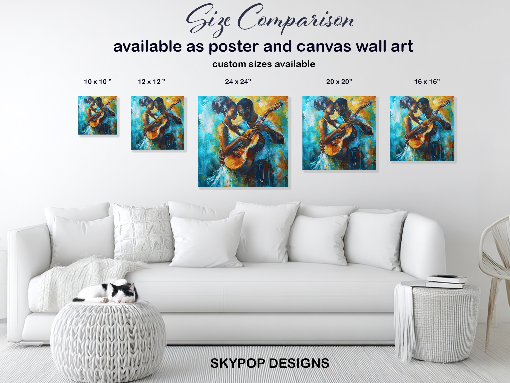 Elevate your space with this captivating canvas wall art featuring a tender moment between two musicians. This striking piece showcases a couple intimately connected as they play guitar together, perfect for adding a touch of romance and musical inspiration to any room. The vibrant turquoise and yellow background creates a lively contrast against the warm brown tones of the guitar and the figures’ skin, making this poster a focal point in contemporary living rooms or bohemian bedrooms. Ideal for music lovers and romantics alike, this canvas art celebrates the power of music to bring people together. The expressive brushstrokes and rich color palette enhance the emotional depth of the scene, making it a conversation starter in home offices or music rooms. This versatile wall art adapts beautifully to various decor styles, from modern to rustic, adding character and warmth to your space. The high-quality printing captures every nuance of the original artwork, from the delicate facial expressions to the texture of the guitar. Whether you’re looking to refresh your wall decor or searching for a meaningful housewarming gift, this poster offers both visual appeal and emotional resonance. Transform your room with this stunning blend of music and romance, and let it inspire creativity and connection in your daily life. Bring home this enchanting guitar serenade art today and experience the joy it brings to your living space.