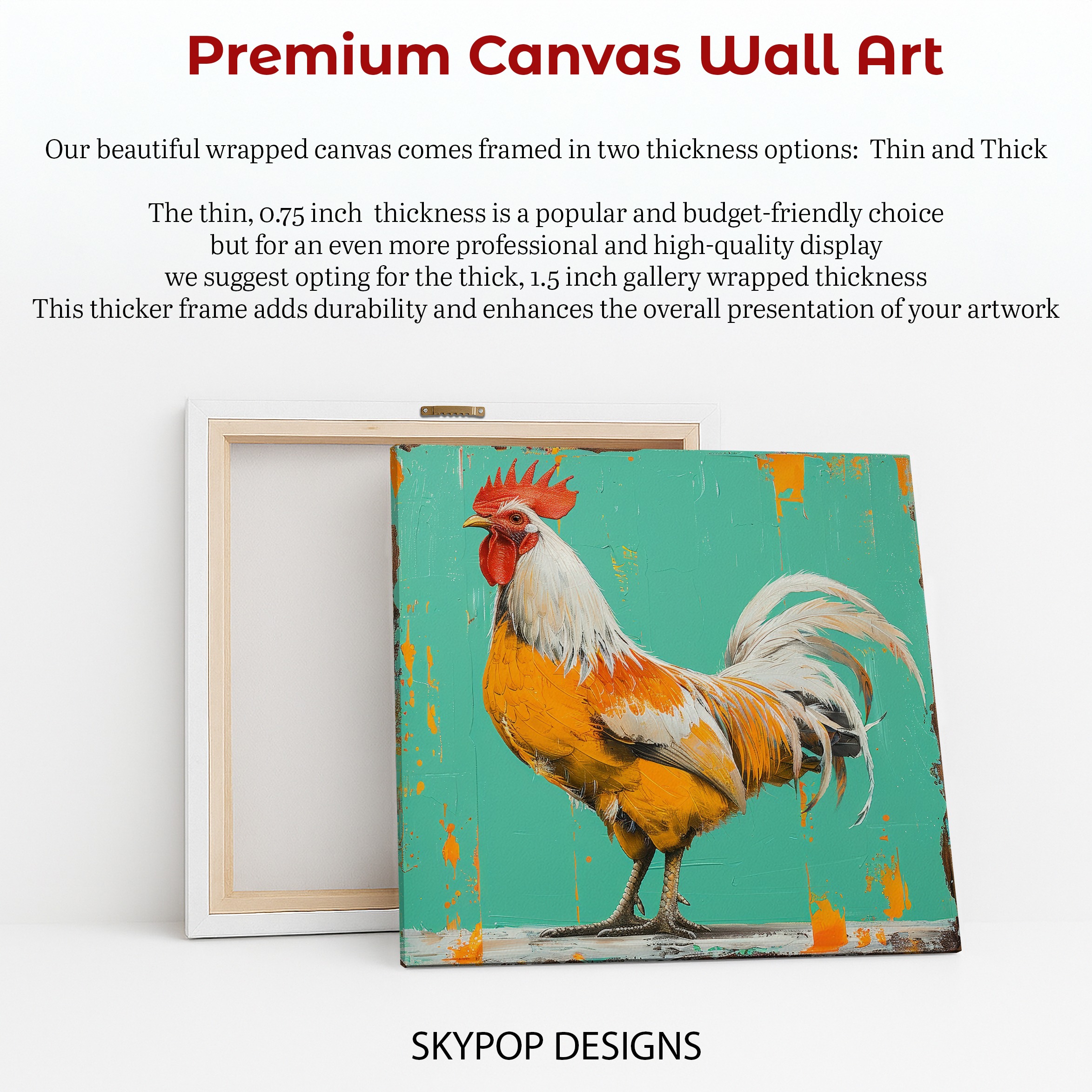 Keywords: rooster art, canvas wall art, animal art, pop art, contemporary art, modern decor, rustic decor, teal, orange, multicolor, vibrant art, farmhouse decor, kitchen decor, living room art, bedroom art, entryway decor, wall decor, home decor, canvas print, poster art, unique wall art, statement piece, colorful art, housewarming gift, gift for art lover, animal print, vibrant colors, nature inspired art, contemporary design, bold colors
