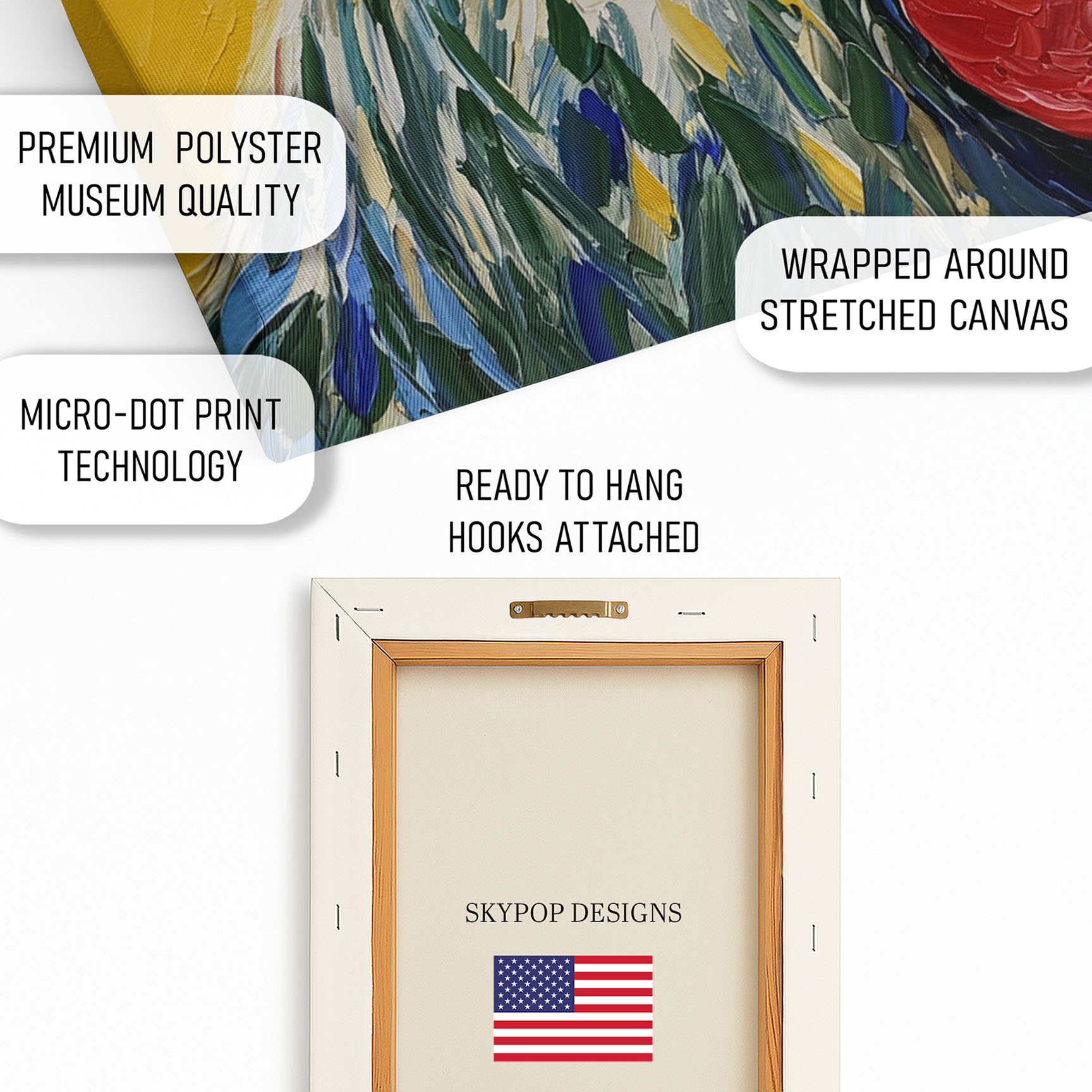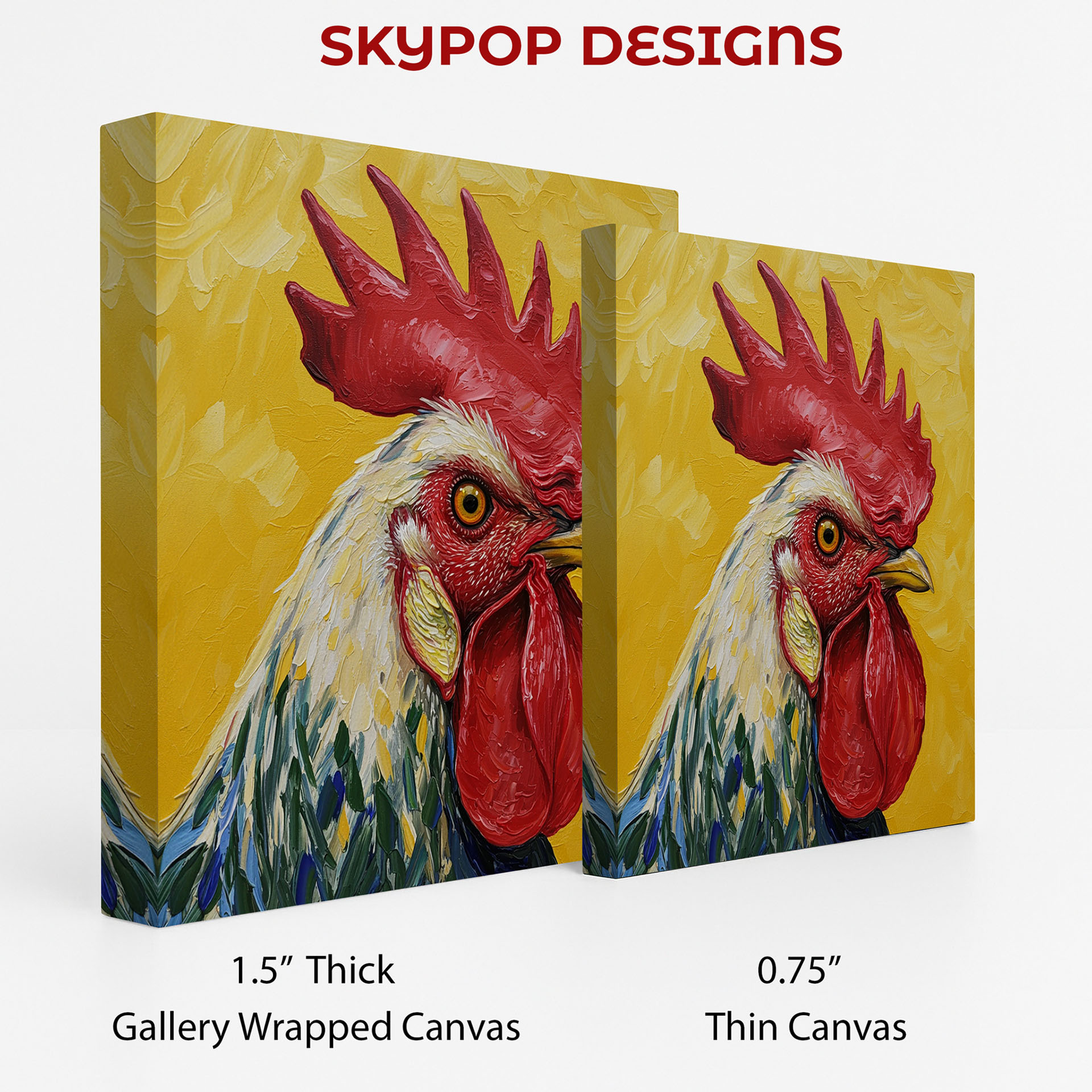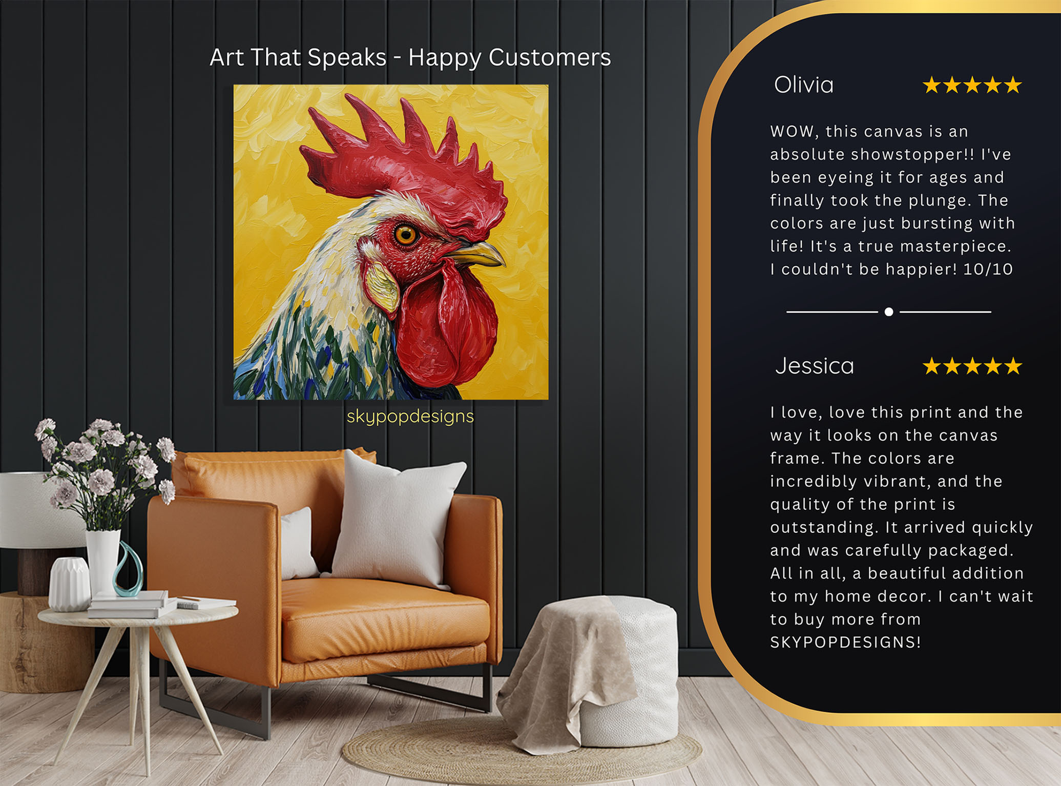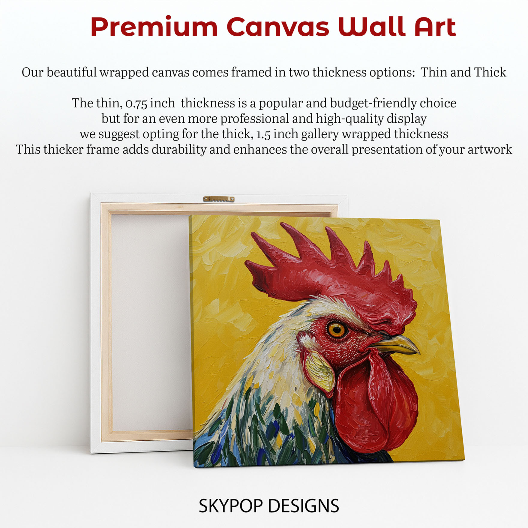 Bring a touch of rustic charm and vibrant energy to your home with this striking Rooster canvas wall art. This captivating poster or canvas wall art features a close-up of a rooster in an impressionistic style, showcasing bold textures and a brilliant yellow background that instantly energizes any space. The rich reds of the rooster’s comb and wattle, contrasted with its white and green plumage, create a dynamic visual appeal. Perfect for farmhouse kitchens, rustic dining rooms, or as a bold accent in a modern living room, this animal art piece adds personality and warmth. The thick, impasto brushstrokes lend depth and a tactile quality to this stunning canvas wall art, making it a true conversation starter. Ideal for those seeking unique wall decor or a thoughtful housewarming gift, this rooster artwork celebrates the beauty of farm animals. The vibrant color palette of yellow and red is known to inspire energy and enthusiasm, making this poster a mood-boosting addition to your home. Elevate your decor with this high-quality printed canvas art that captures the spirit of the countryside with a contemporary edge. This versatile piece also makes a fantastic gift for birthdays or holidays, bringing a sense of life and character to any room. Transform your walls today with this eye-catching rooster wall art that combines artistic flair with farmhouse charm. Experience the bold beauty of this animal art canvas print.