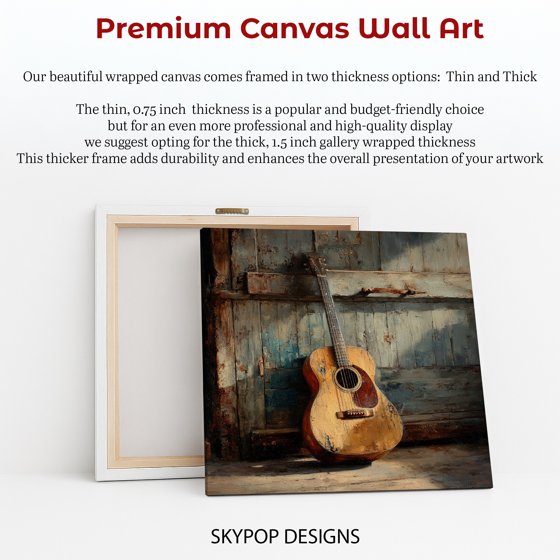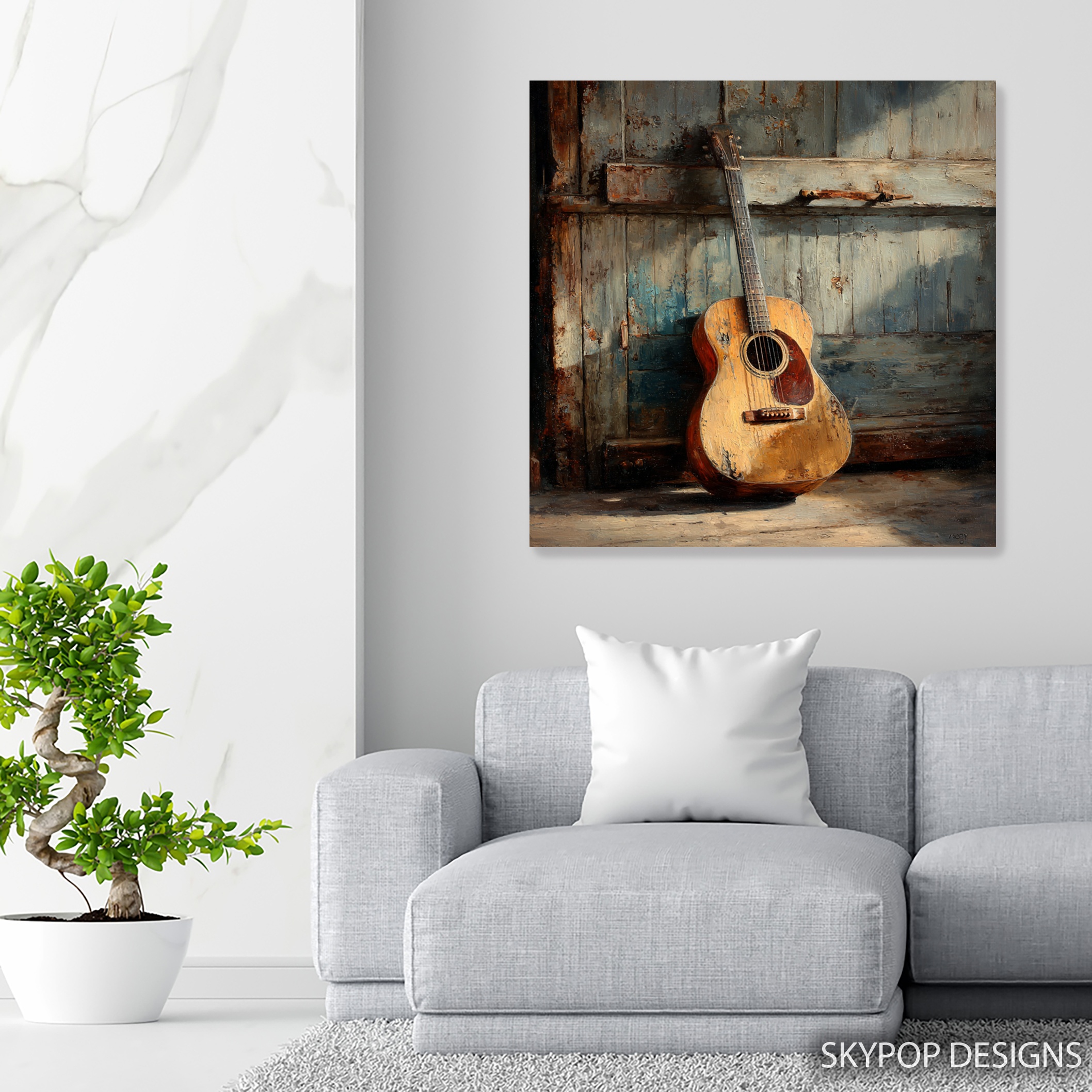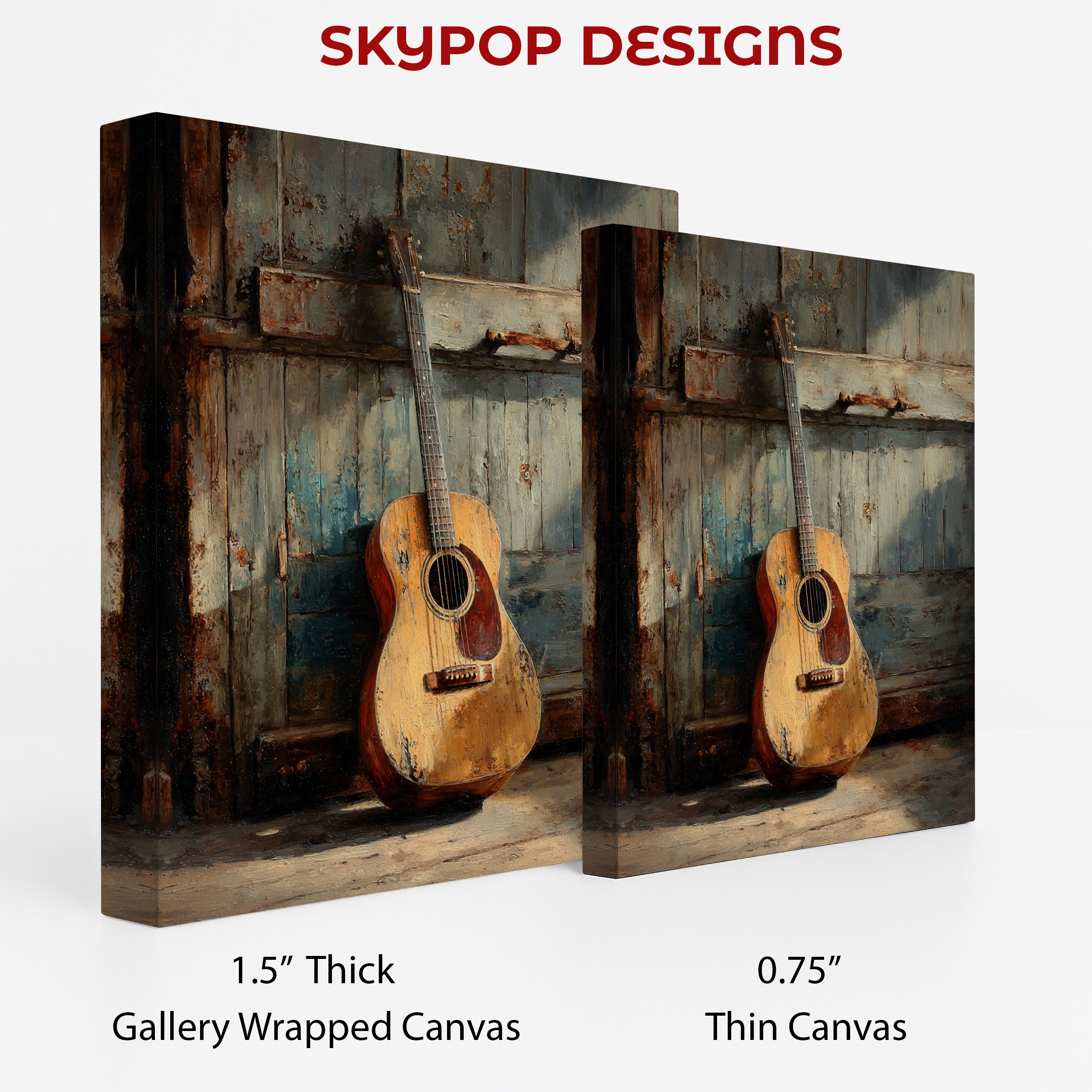 Bring a touch of musical nostalgia to your space with this captivating rustic guitar canvas wall art. This striking piece showcases a well-worn acoustic guitar leaning against a weathered wooden wall, perfectly capturing the essence of vintage charm and musical passion. The warm brown tones of the guitar contrast beautifully with the distressed blue-white backdrop, creating a visually appealing focal point for any room. Ideal for music lovers and rustic decor enthusiasts alike, this poster or canvas print adds character and depth to living rooms, home offices, or bedrooms. The textured brushstrokes and realistic details bring the guitar to life, making you almost hear the melodies it could play. Perfect for country-style interiors or as a statement piece in a shabby chic setting, this artwork celebrates the timeless appeal of acoustic instruments. The vintage aesthetic evokes a sense of nostalgia and creativity, inspiring viewers and sparking conversations. Whether you’re a musician or simply appreciate the artistry of instruments, this canvas wall art serves as a daily reminder of the power of music. Elevate your home decor with this versatile piece that seamlessly blends rustic charm with musical inspiration. Transform your space today with this unique guitar artwork that resonates with both style and substance.