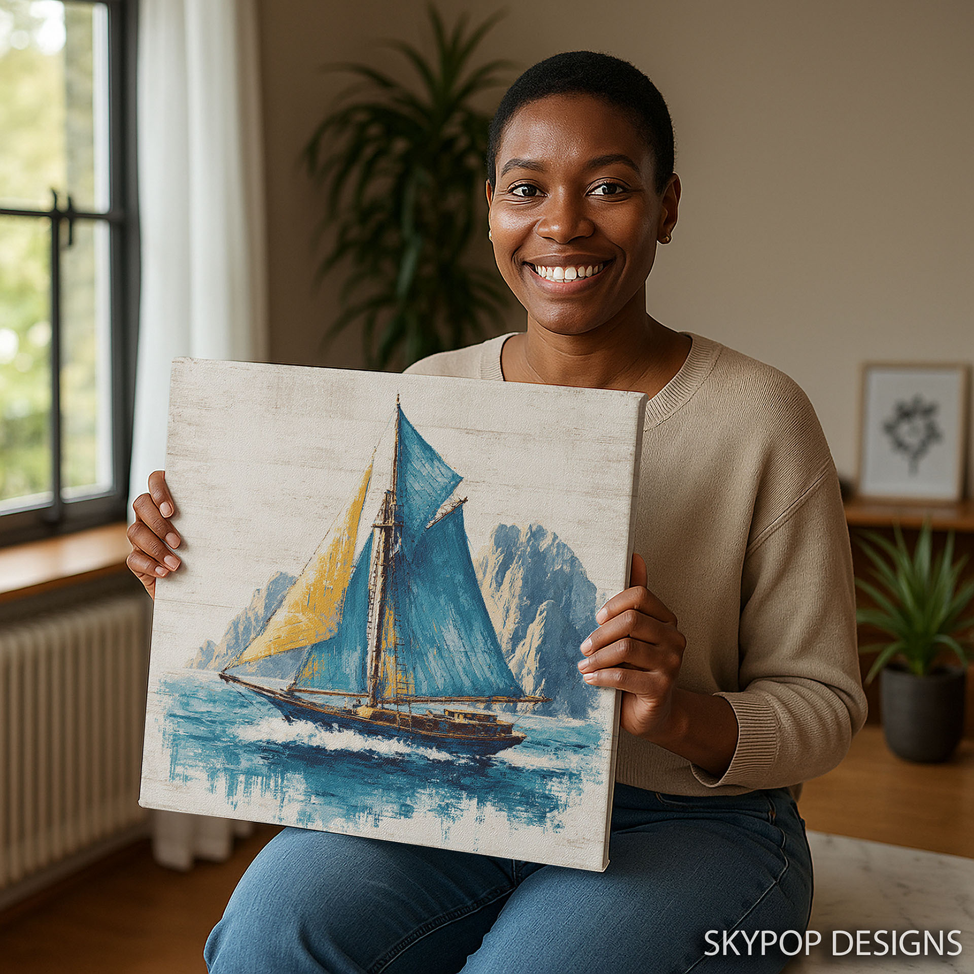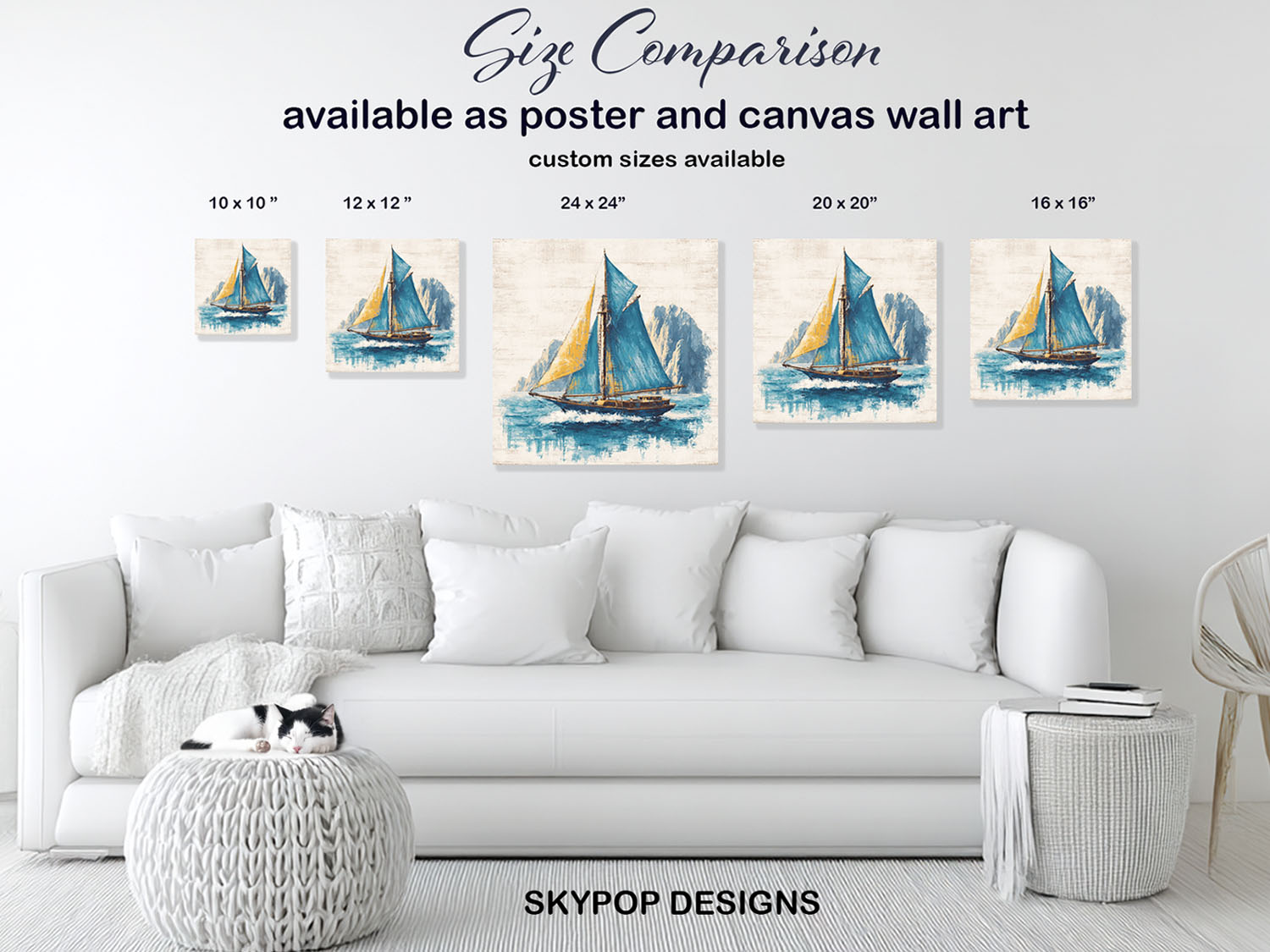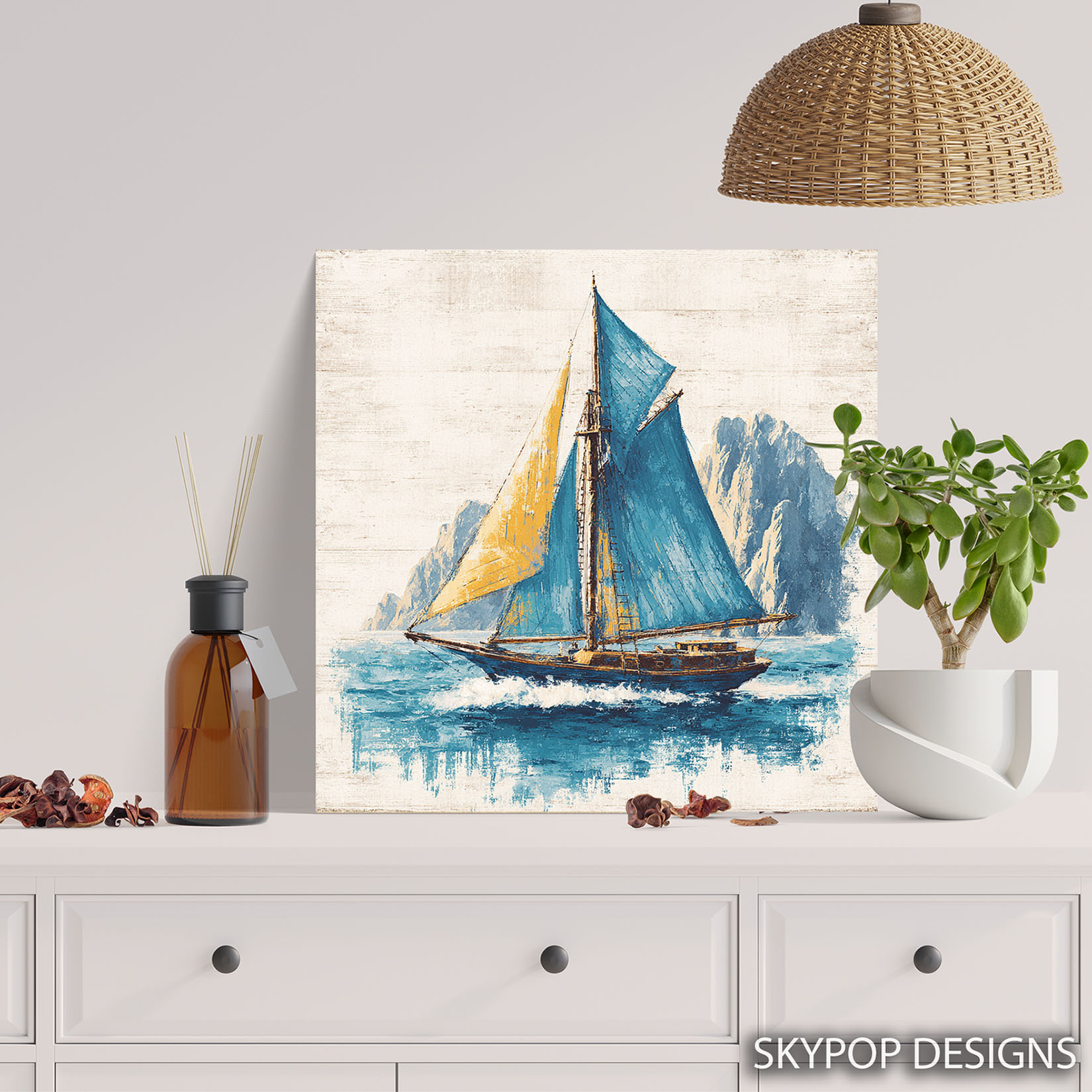 Set sail on a visual journey with this captivating sailboat canvas wall art, embodying the spirit of adventure and freedom. This stunning poster or canvas wall art showcases a majestic sailboat with vibrant blue and yellow sails, navigating through dynamic ocean waves against a backdrop of rugged cliffs. The contemporary art style, blended with classic nautical themes, makes this piece a striking addition to any home decor. Perfect for coastal-inspired living rooms or adding a breath of fresh air to a modern bedroom, this artwork transforms your space into a tranquil escape. The combination of bold blue and cheerful yellow evokes feelings of serenity and optimism, while the textured brushstrokes add depth and character. Ideal for bohemian and modern interiors, this canvas wall art creates a focal point that sparks conversation and inspires wanderlust. Its versatile appeal also makes it an excellent choice for entryways or guest rooms, welcoming visitors with a sense of calm and adventure. This high-quality print ensures the rich colors and intricate details are preserved, making it a lasting piece of wall decor. Whether you’re looking for a unique housewarming gift or a way to refresh your seasonal decor, this sailboat art is a perfect choice. Elevate your home and embrace the allure of the sea with this beautiful piece of canvas art. Transform your living space with this sailboat poster today and let your imagination drift to open waters.