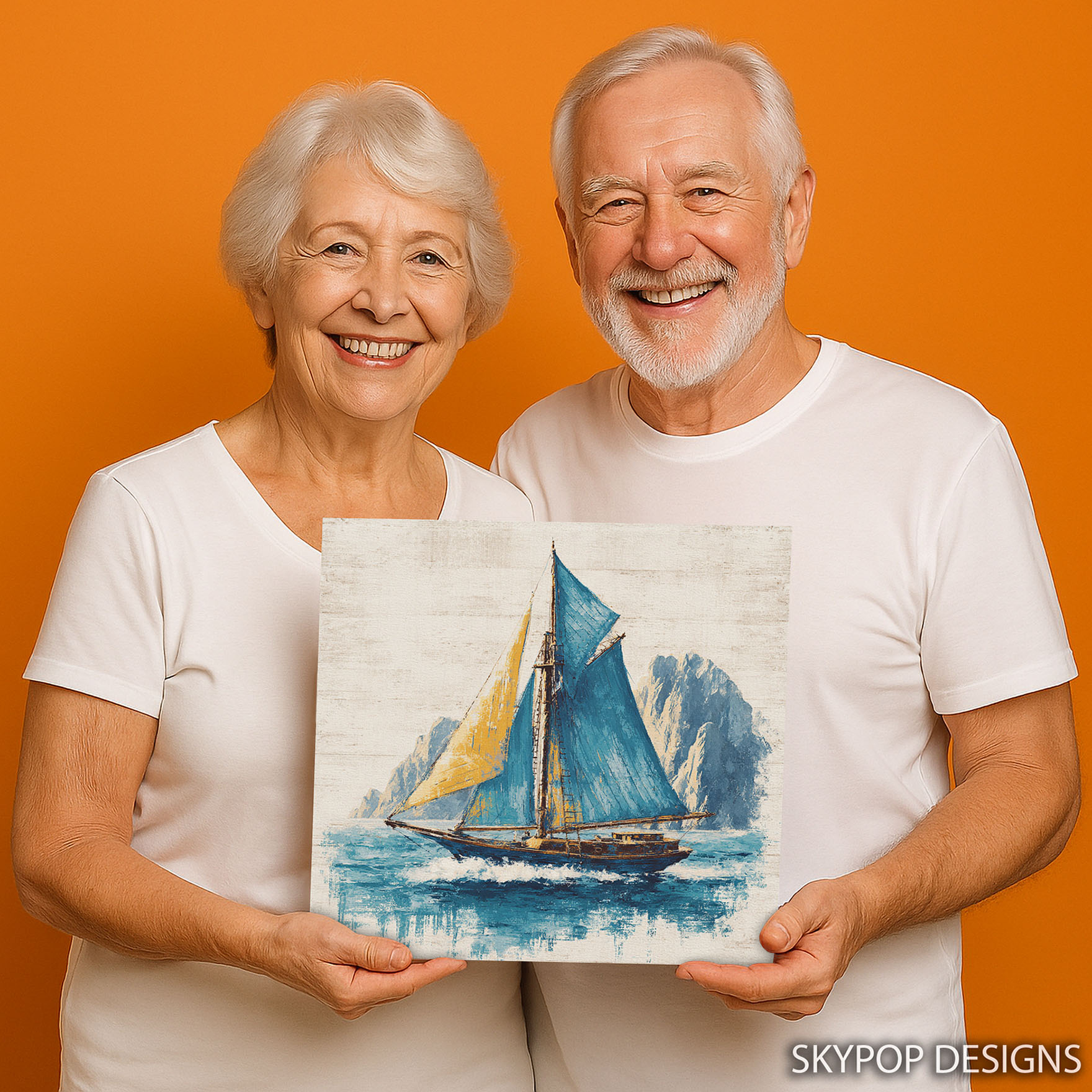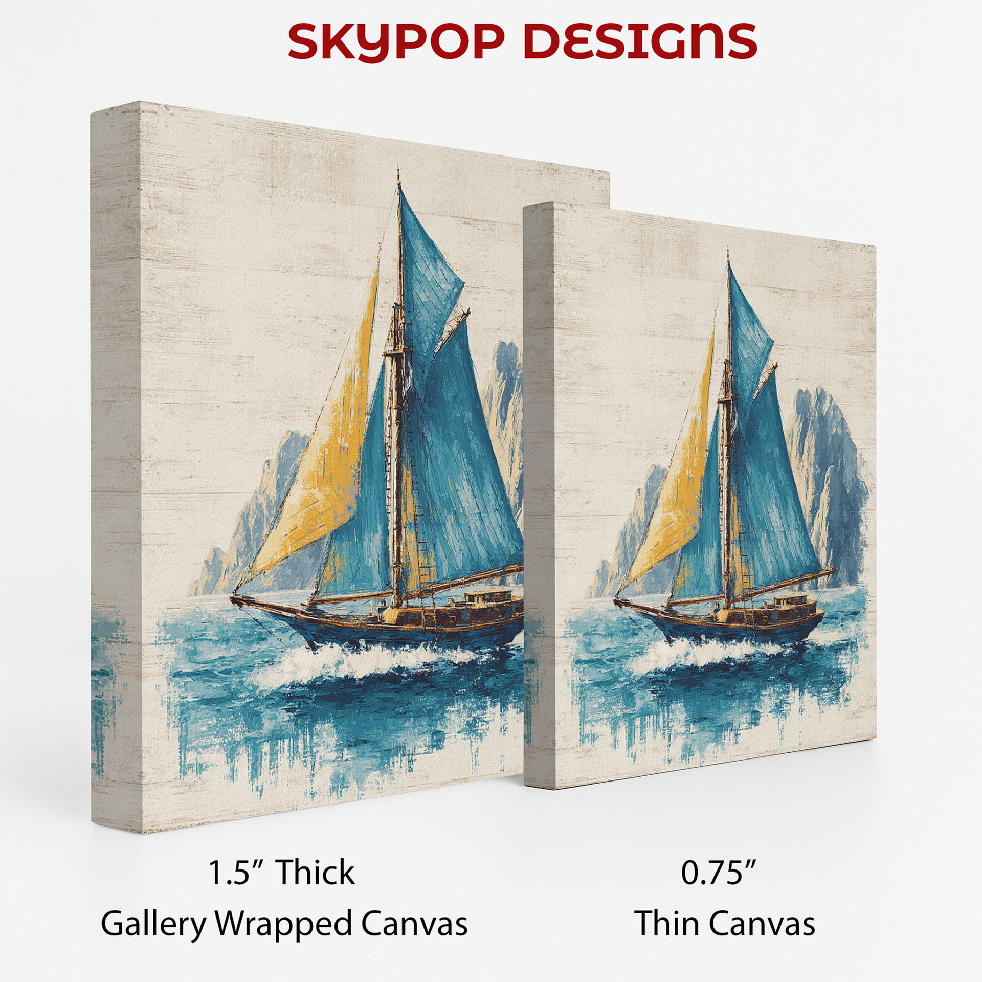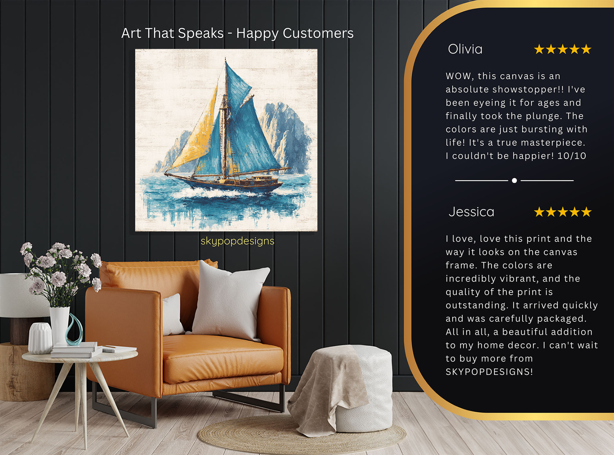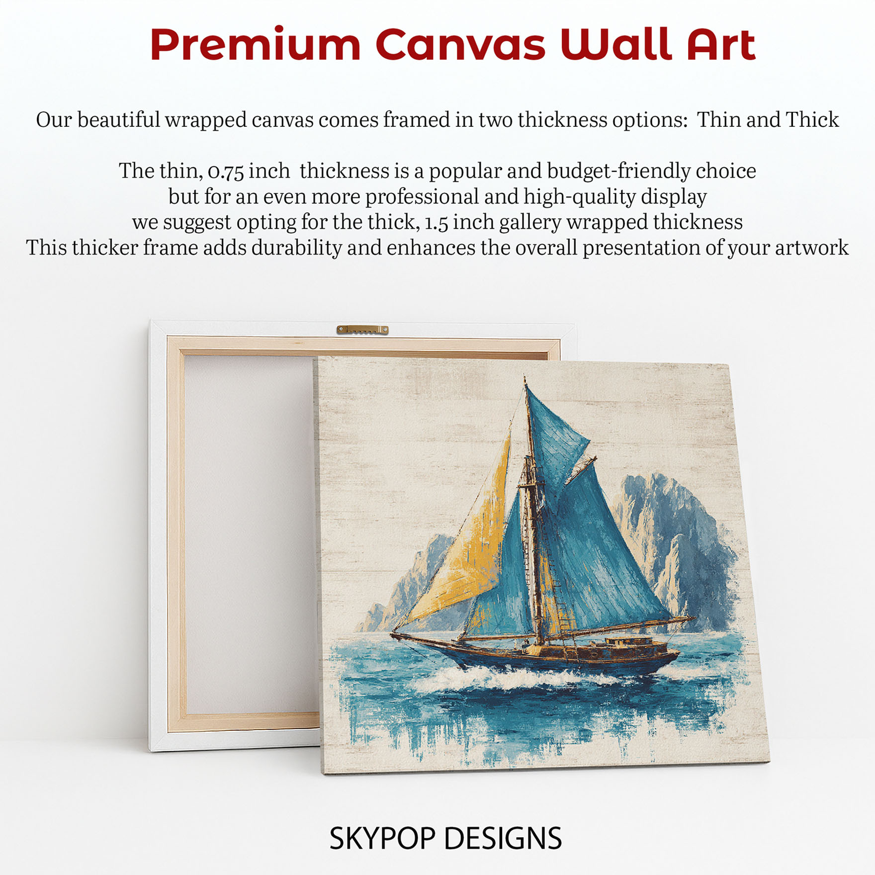 Set sail on a visual journey with this captivating sailboat canvas wall art, embodying the spirit of adventure and freedom. This stunning poster or canvas wall art showcases a majestic sailboat with vibrant blue and yellow sails, navigating through dynamic ocean waves against a backdrop of rugged cliffs. The contemporary art style, blended with classic nautical themes, makes this piece a striking addition to any home decor. Perfect for coastal-inspired living rooms or adding a breath of fresh air to a modern bedroom, this artwork transforms your space into a tranquil escape. The combination of bold blue and cheerful yellow evokes feelings of serenity and optimism, while the textured brushstrokes add depth and character. Ideal for bohemian and modern interiors, this canvas wall art creates a focal point that sparks conversation and inspires wanderlust. Its versatile appeal also makes it an excellent choice for entryways or guest rooms, welcoming visitors with a sense of calm and adventure. This high-quality print ensures the rich colors and intricate details are preserved, making it a lasting piece of wall decor. Whether you’re looking for a unique housewarming gift or a way to refresh your seasonal decor, this sailboat art is a perfect choice. Elevate your home and embrace the allure of the sea with this beautiful piece of canvas art. Transform your living space with this sailboat poster today and let your imagination drift to open waters.