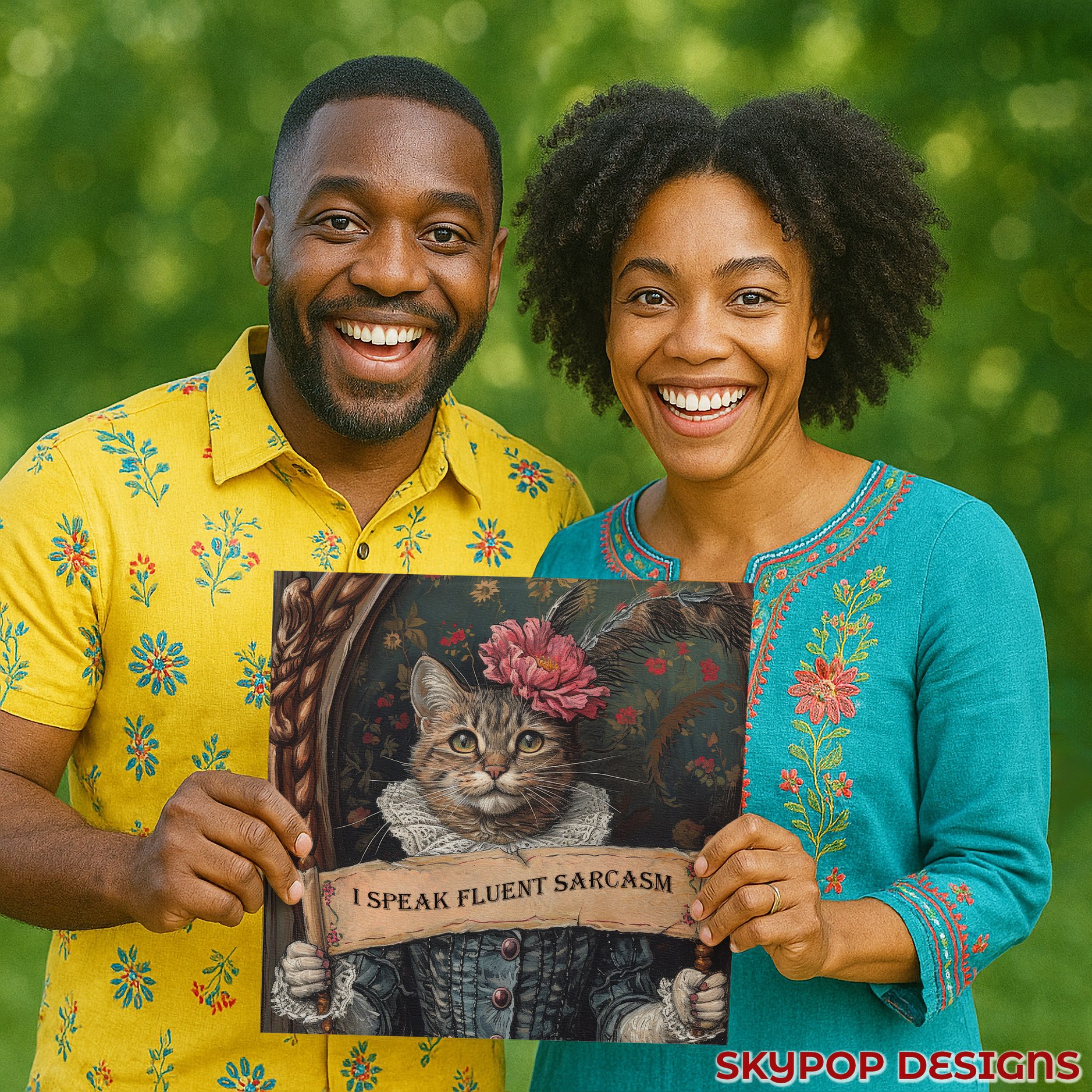 Transform your wall with this humorous and unique cat canvas wall art, featuring a witty feline proclaiming I Speak Fluent Sarcasm. This captivating piece of figurative art is perfect for adding personality and a touch of vintage charm to your living room, bedroom, or office space. The rich, multicolor palette, with dominant brown and hints of pink and green, creates a striking visual that complements bohemian or Victorian decor seamlessly. Elevate your home with this conversation-starting poster that celebrates sharp wit and sophisticated humor. Ideal for cat lovers and those who appreciate a bit of sass, this canvas wall art is a fantastic gift for birthdays or housewarmings. The detailed brushwork gives this artwork a timeless quality, making it a standout print in any collection. Enhance your space with this eye-catching piece that brings character and a playful spirit to your walls. This versatile wall art is sure to be a favorite, combining artistic flair with a relatable message. Own a print that captures the essence of your own sharp wit. Make a statement and shop this unique wall art today to instantly upgrade your home decor.