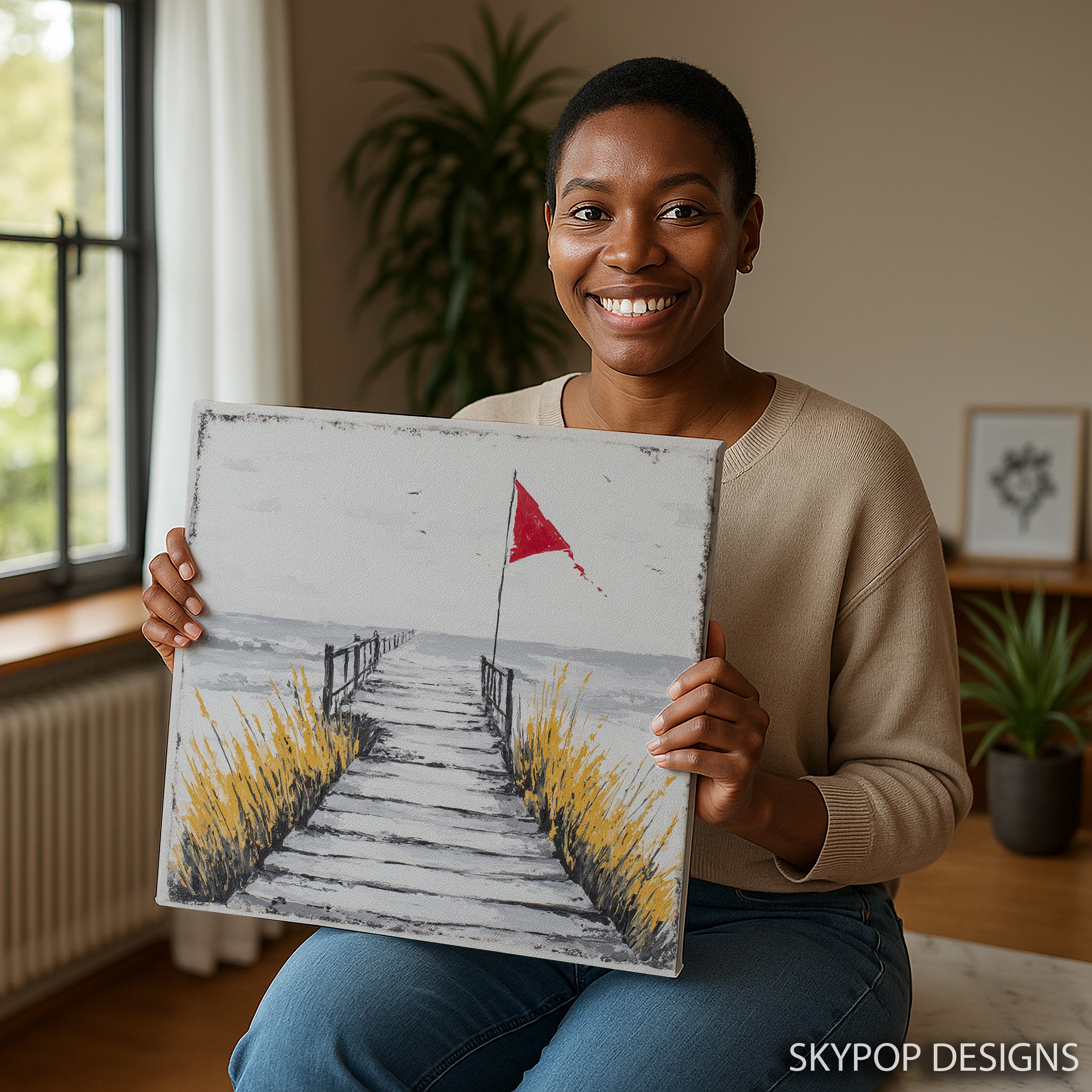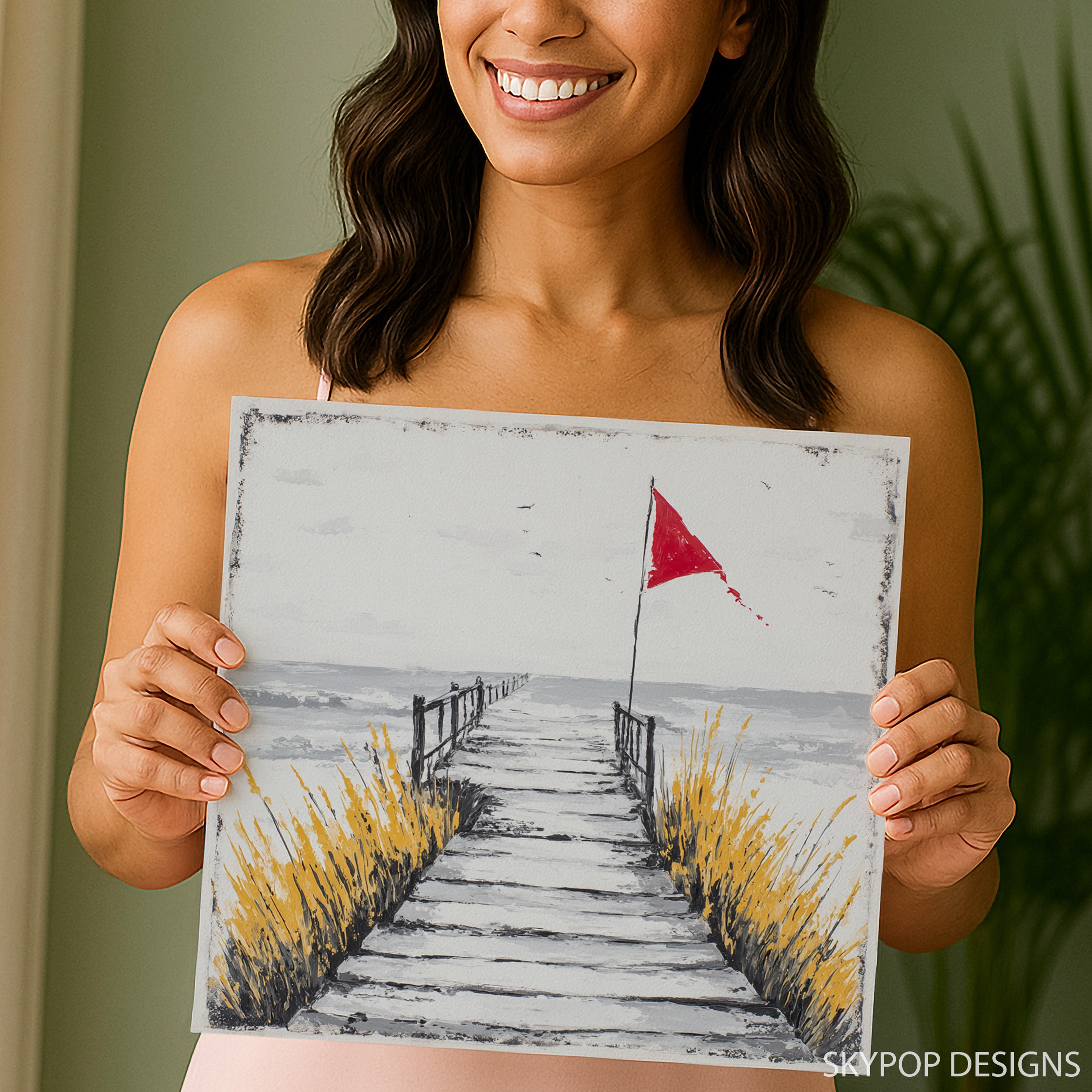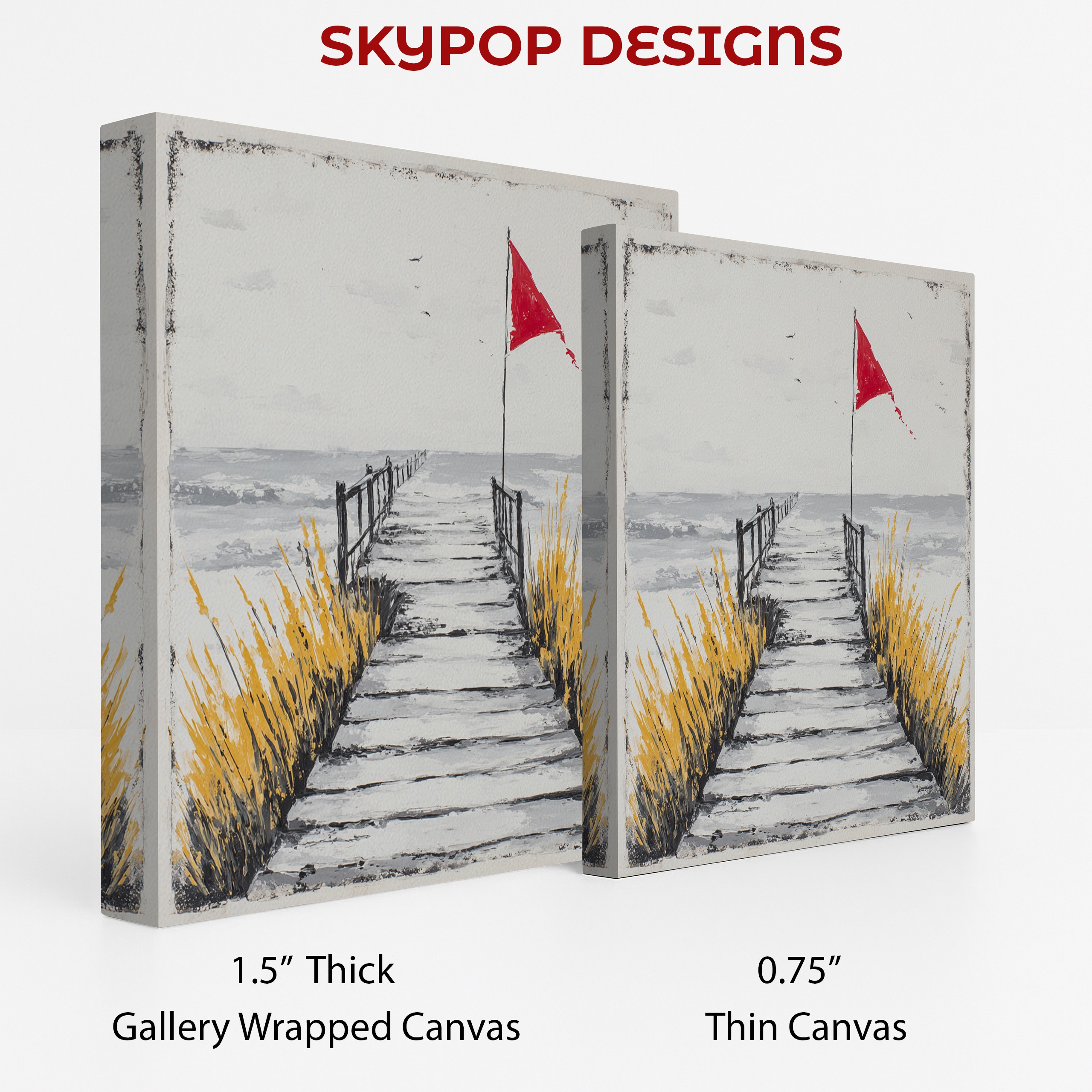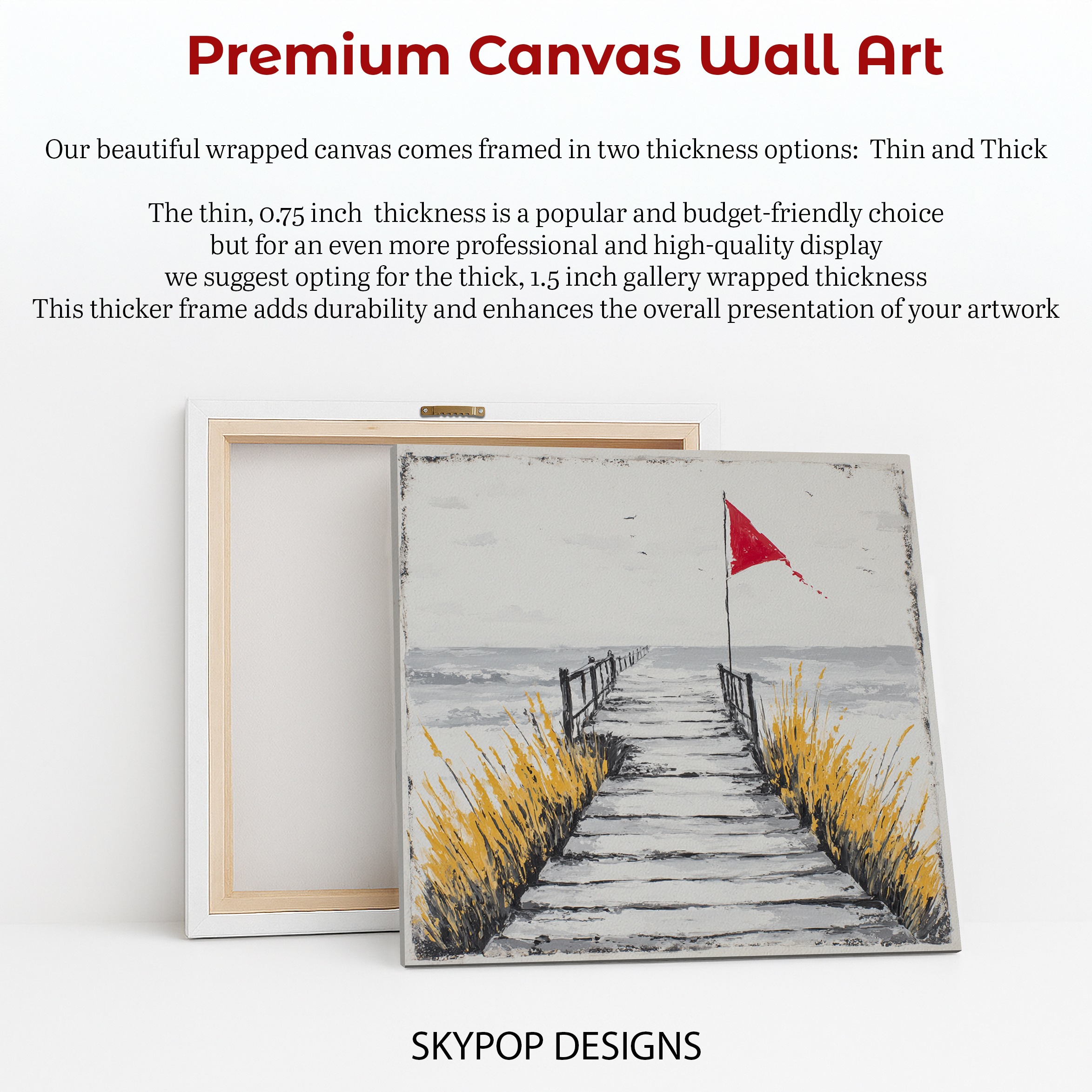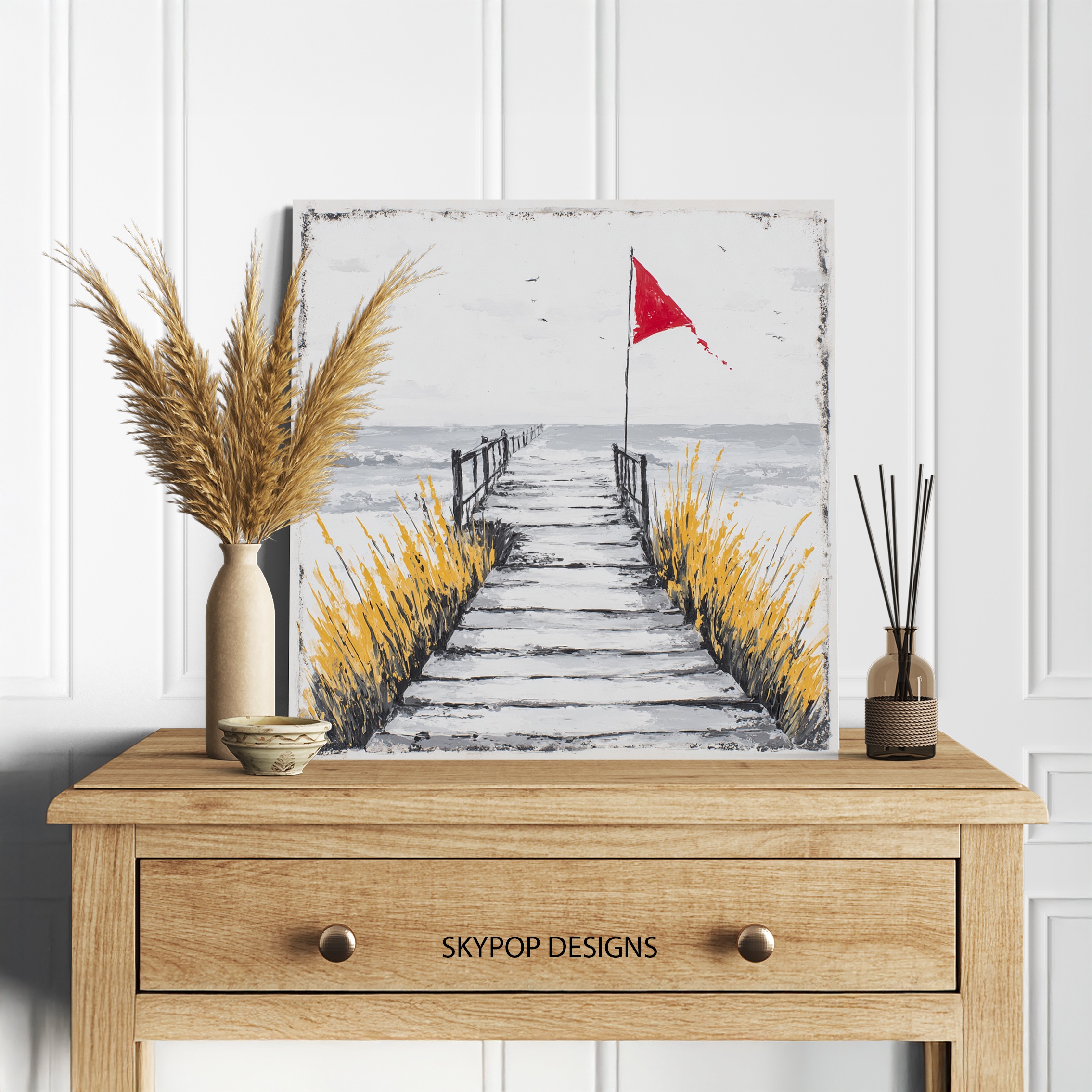Transform your space with this striking seaside boardwalk canvas wall art, perfect for bringing a touch of coastal charm to any room. The minimalist composition features a weathered wooden pier stretching out to a misty sea, crowned by a vibrant red flag that draws the eye and adds a pop of color. This modern poster or canvas print masterfully captures the essence of a peaceful beach day, making it ideal for contemporary living rooms or serene bedroom decor. The muted grey tones of the sea and sky create a calming backdrop, while splashes of golden yellow beach grass add warmth and texture to the foreground. Perfect for those who love coastal-inspired decor, this piece effortlessly enhances minimalist spaces with its clean lines and subtle details. The high-quality printing ensures every nuance of the artwork is preserved, from the grainy texture of the wooden planks to the soft blur of distant seabirds. Whether displayed in a modern bathroom, a home office, or as part of a gallery wall, this versatile canvas art adapts beautifully to various interior styles. Its soothing coastal theme promotes relaxation and evokes memories of seaside getaways, making it a thoughtful housewarming or holiday gift. The balanced composition and muted color palette with a bold red accent make this piece a standout in any room. Elevate your home’s atmosphere with this contemporary take on beach wall art that celebrates the serene beauty of the coast. Bring the calming essence of the seaside into your living space today with this captivating boardwalk canvas print.