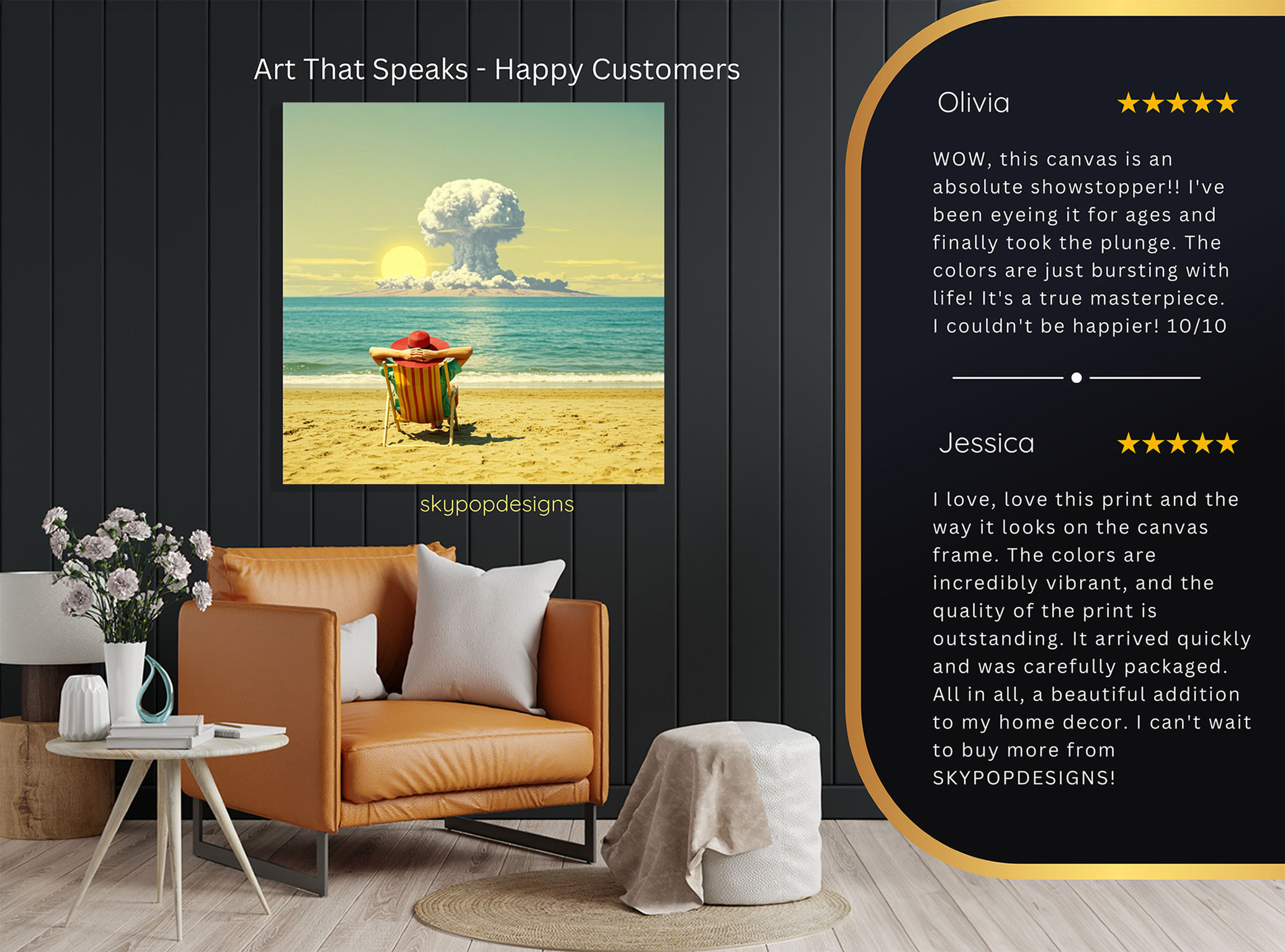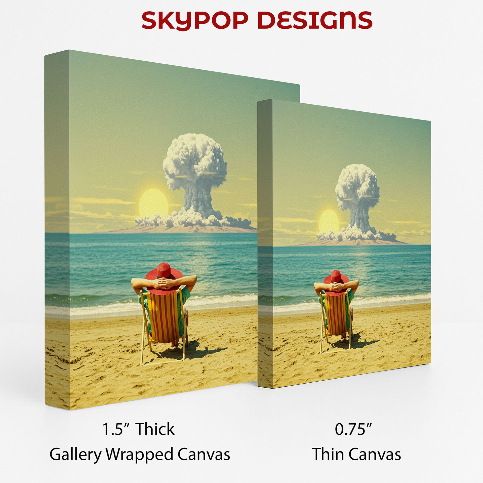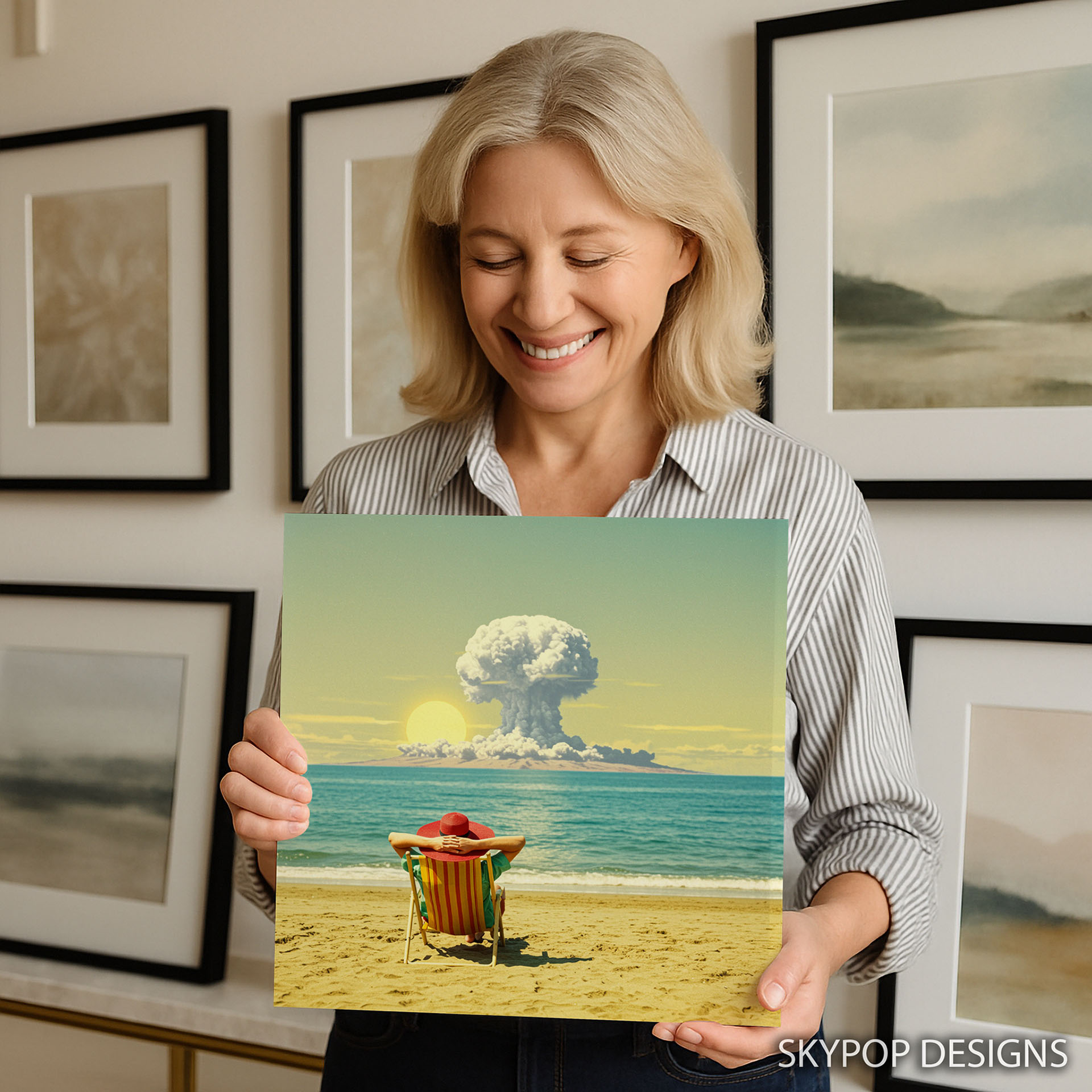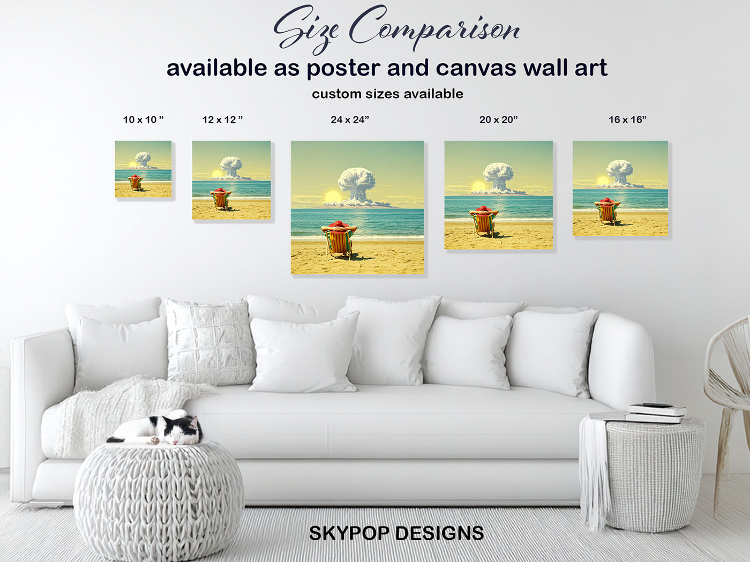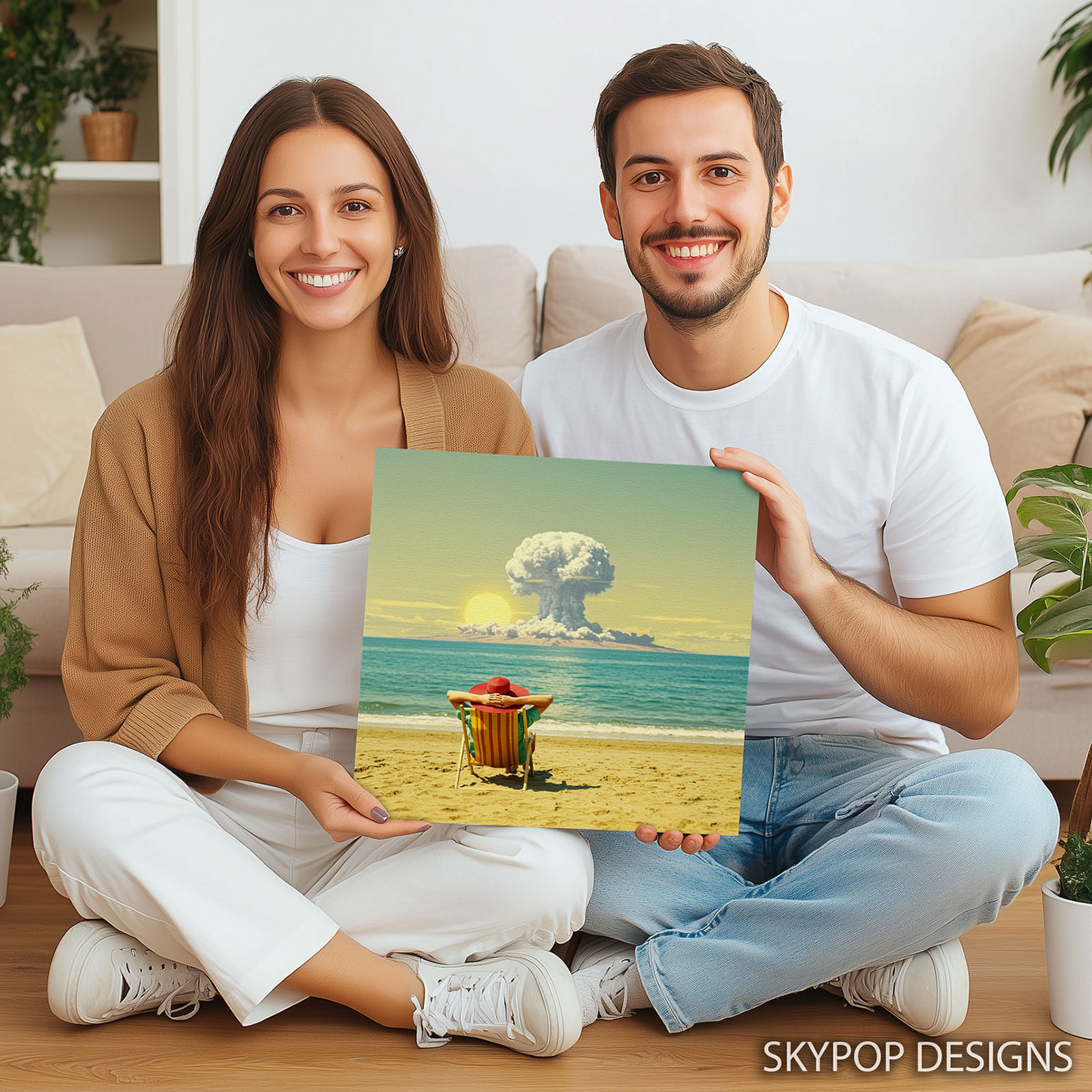 Transform your space with this striking canvas wall art that combines retro beach vibes with a surreal mushroom cloud. This captivating poster or canvas wall art is perfect for adding a unique conversation starter to your modern living room decor or an eclectic game room. The vibrant yellow sky and turquoise ocean hues create a dreamlike atmosphere, while the stark contrast of the mushroom cloud adds a thought-provoking element. Ideal for bohemian interiors or anyone who appreciates bold, contemporary art, this piece challenges expectations and sparks imagination. This eye-catching artwork, suitable for bedrooms or offices, brings a sense of dramatic irony to any setting. The high-quality print captures the surreal juxtaposition of sunny leisure and impending doom, making it a true statement piece. Whether you’re looking to inject personality into your space or find a unique gift for a birthday or holiday, this versatile canvas art delivers. Elevate your home with this thought-provoking blend of pop art and surrealism that is sure to inspire intrigue and discussion. Embrace the unexpected and make this unconventional artwork the focal point of your wall decor today.