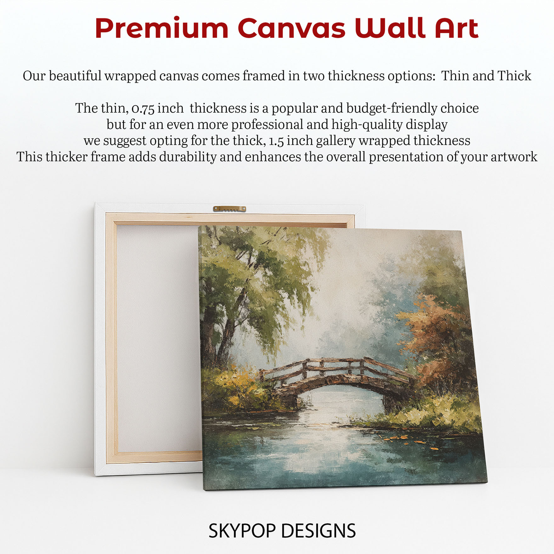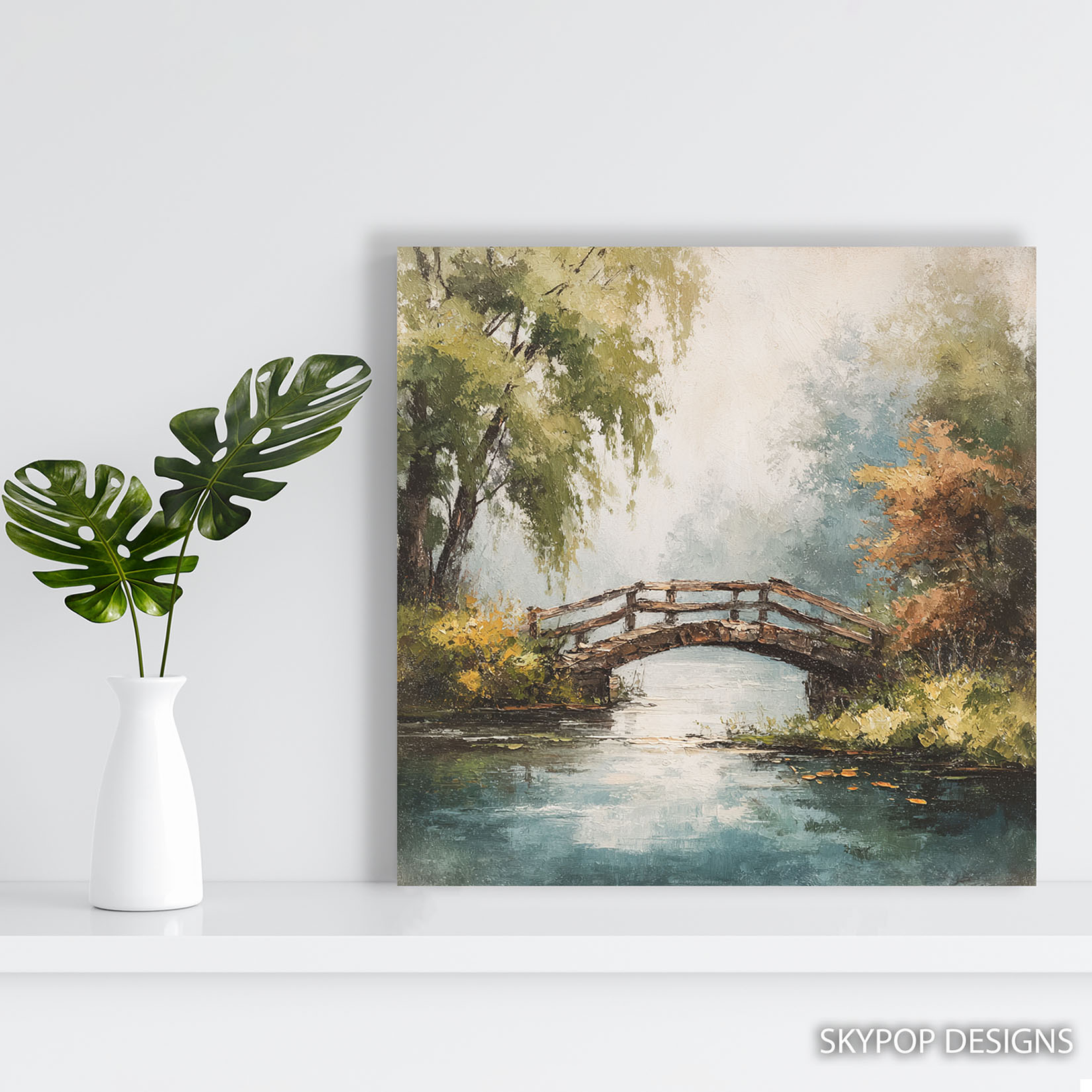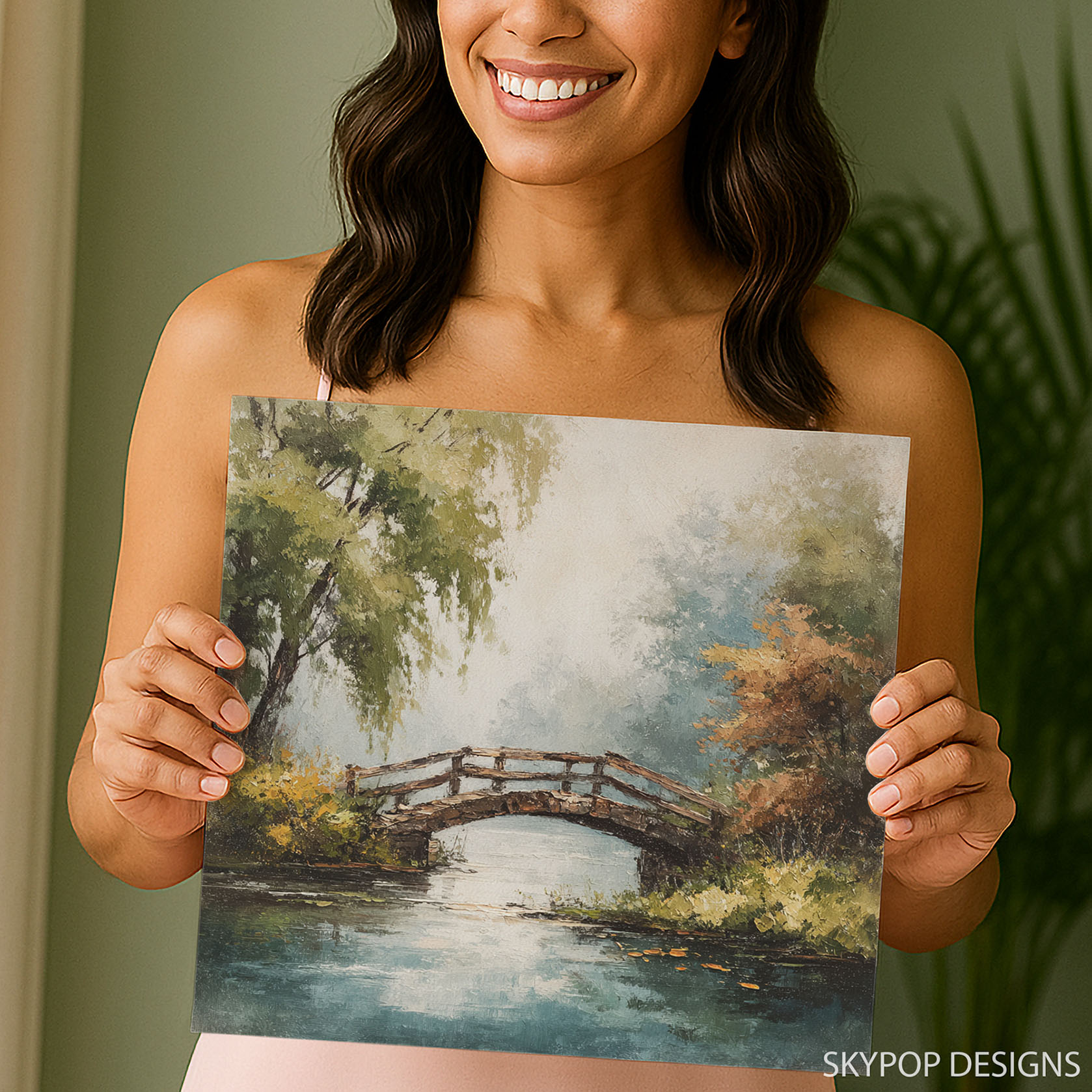 Capture the tranquility of nature with this beautiful bridge canvas wall art, perfect for bringing a sense of peace to any home. This stunning poster or canvas wall art showcases a classic Impressionist style, featuring a rustic stone bridge arching over calm blue water surrounded by lush greenery. The vibrant greens and earthy browns create a warm and inviting atmosphere, ideal for rustic decor enthusiasts or those seeking farmhouse charm. This nature art piece is perfect for transforming your living room into a serene escape or adding a touch of timeless beauty to your bedroom or dining room. The soft, textured brushstrokes evoke a sense of calm and reflection, making it a captivating focal point that inspires relaxation. Excellent for creating a welcoming entryway, this artwork brings the beauty of the outdoors inside. Whether you love traditional settings or desire a touch of country style, this canvas wall art seamlessly integrates into your existing decor. High-quality printing ensures the rich colors and subtle details of the landscape are rendered with exceptional clarity. This versatile wall art serves as a wonderful housewarming gift, birthday present, or holiday surprise for anyone who appreciates traditional landscapes and timeless nature scenes. Elevate your space with this breathtaking piece of canvas wall art that offers enduring beauty and a connection to the natural world. Make this exquisite bridge artwork a cherished addition to your collection today.