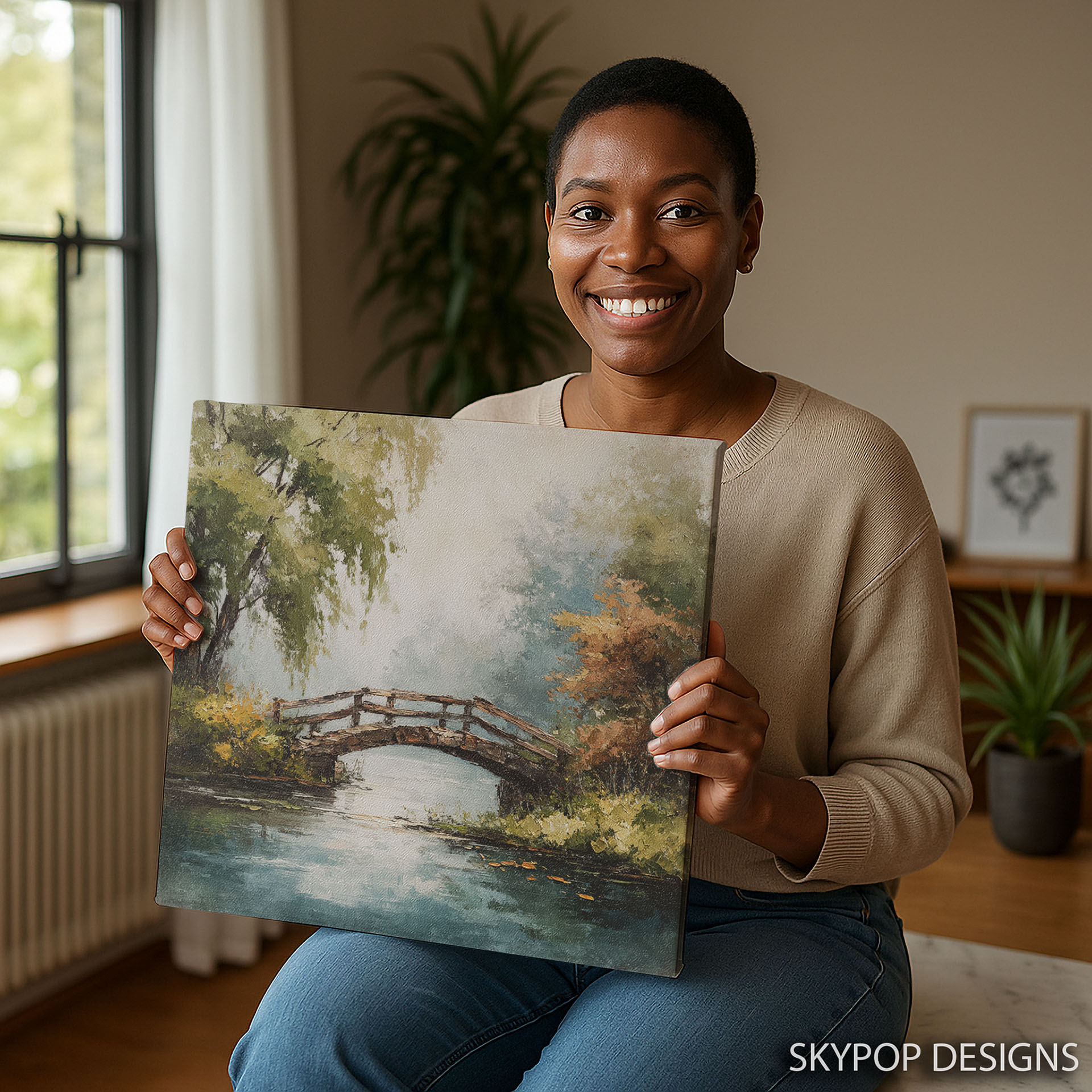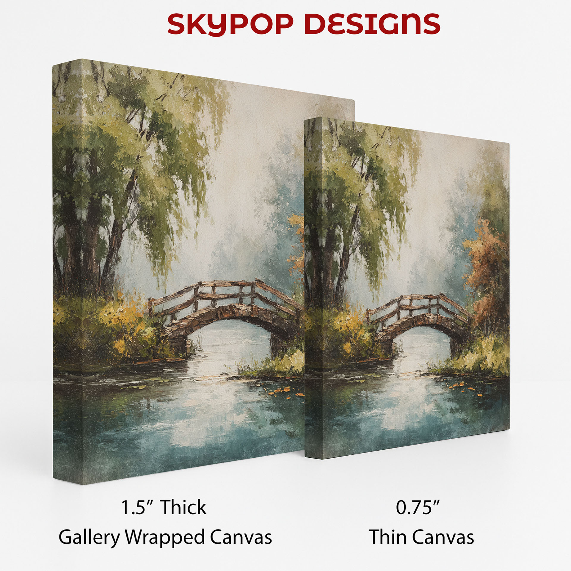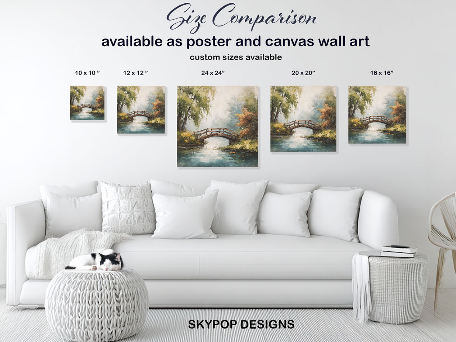 Capture the tranquility of nature with this beautiful bridge canvas wall art, perfect for bringing a sense of peace to any home. This stunning poster or canvas wall art showcases a classic Impressionist style, featuring a rustic stone bridge arching over calm blue water surrounded by lush greenery. The vibrant greens and earthy browns create a warm and inviting atmosphere, ideal for rustic decor enthusiasts or those seeking farmhouse charm. This nature art piece is perfect for transforming your living room into a serene escape or adding a touch of timeless beauty to your bedroom or dining room. The soft, textured brushstrokes evoke a sense of calm and reflection, making it a captivating focal point that inspires relaxation. Excellent for creating a welcoming entryway, this artwork brings the beauty of the outdoors inside. Whether you love traditional settings or desire a touch of country style, this canvas wall art seamlessly integrates into your existing decor. High-quality printing ensures the rich colors and subtle details of the landscape are rendered with exceptional clarity. This versatile wall art serves as a wonderful housewarming gift, birthday present, or holiday surprise for anyone who appreciates traditional landscapes and timeless nature scenes. Elevate your space with this breathtaking piece of canvas wall art that offers enduring beauty and a connection to the natural world. Make this exquisite bridge artwork a cherished addition to your collection today.