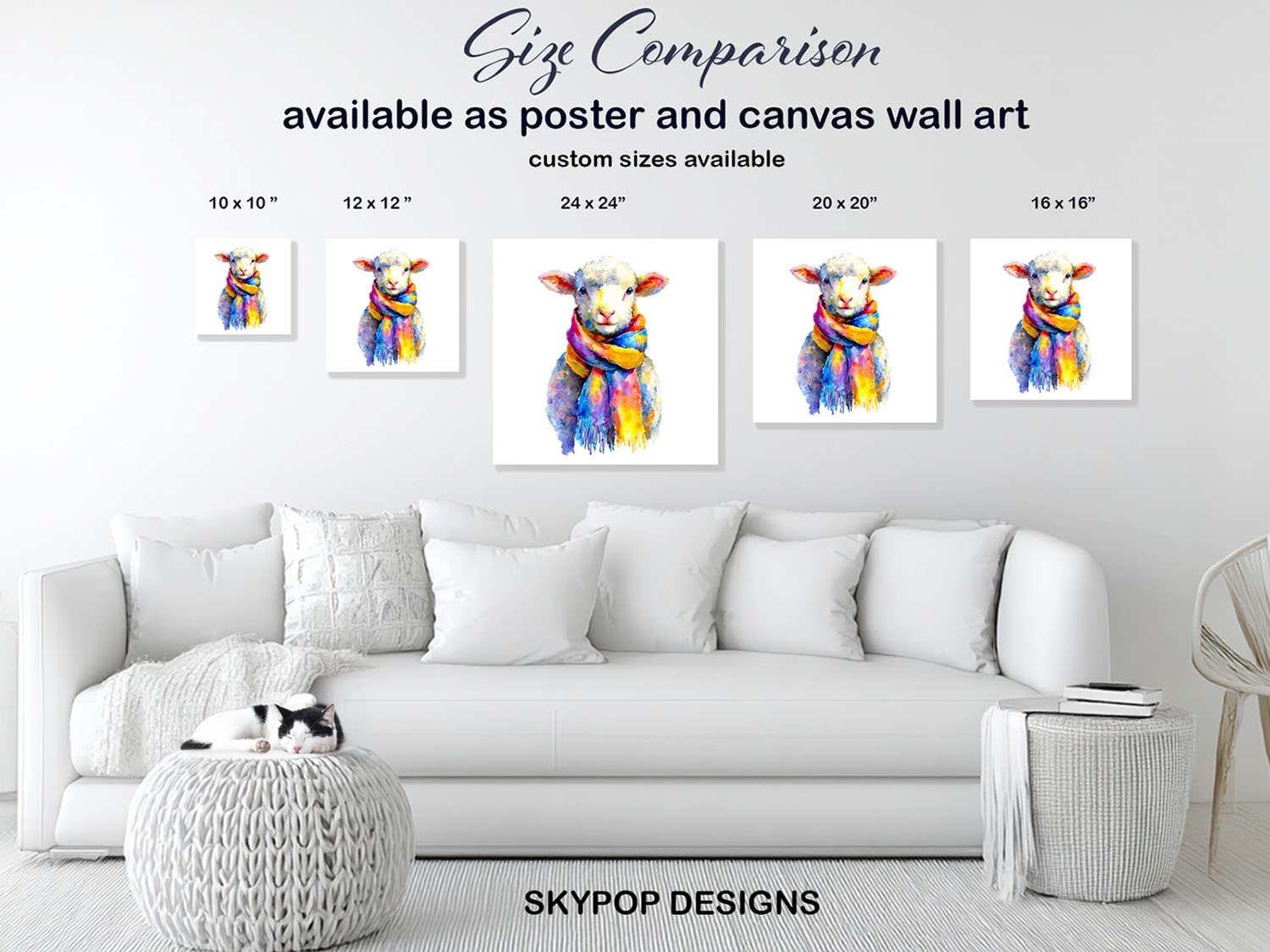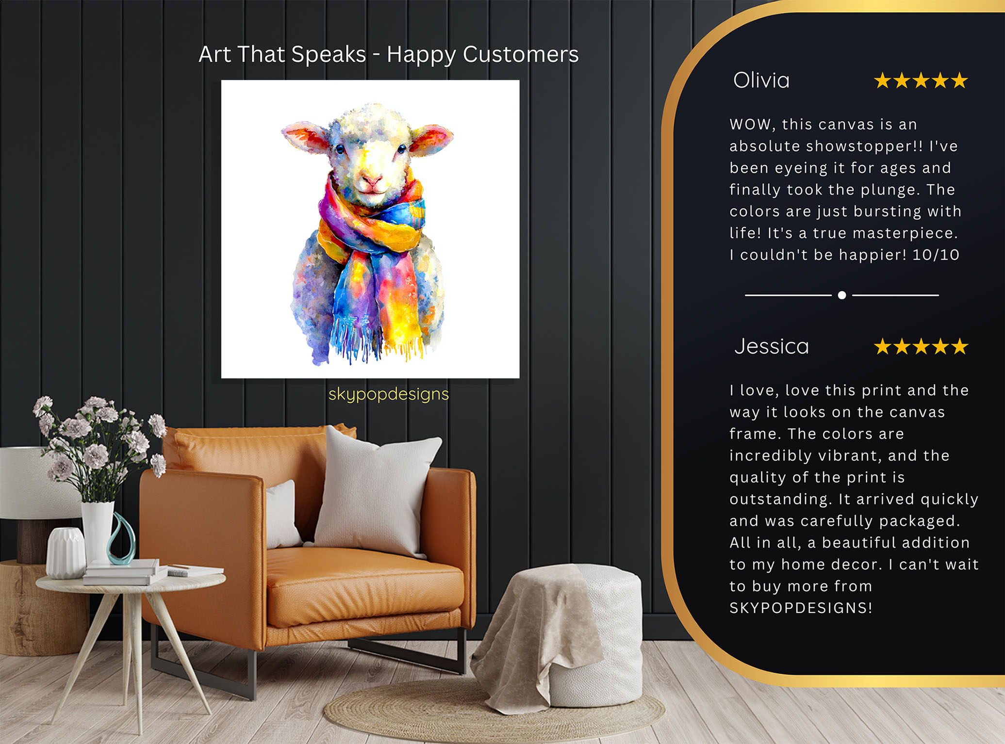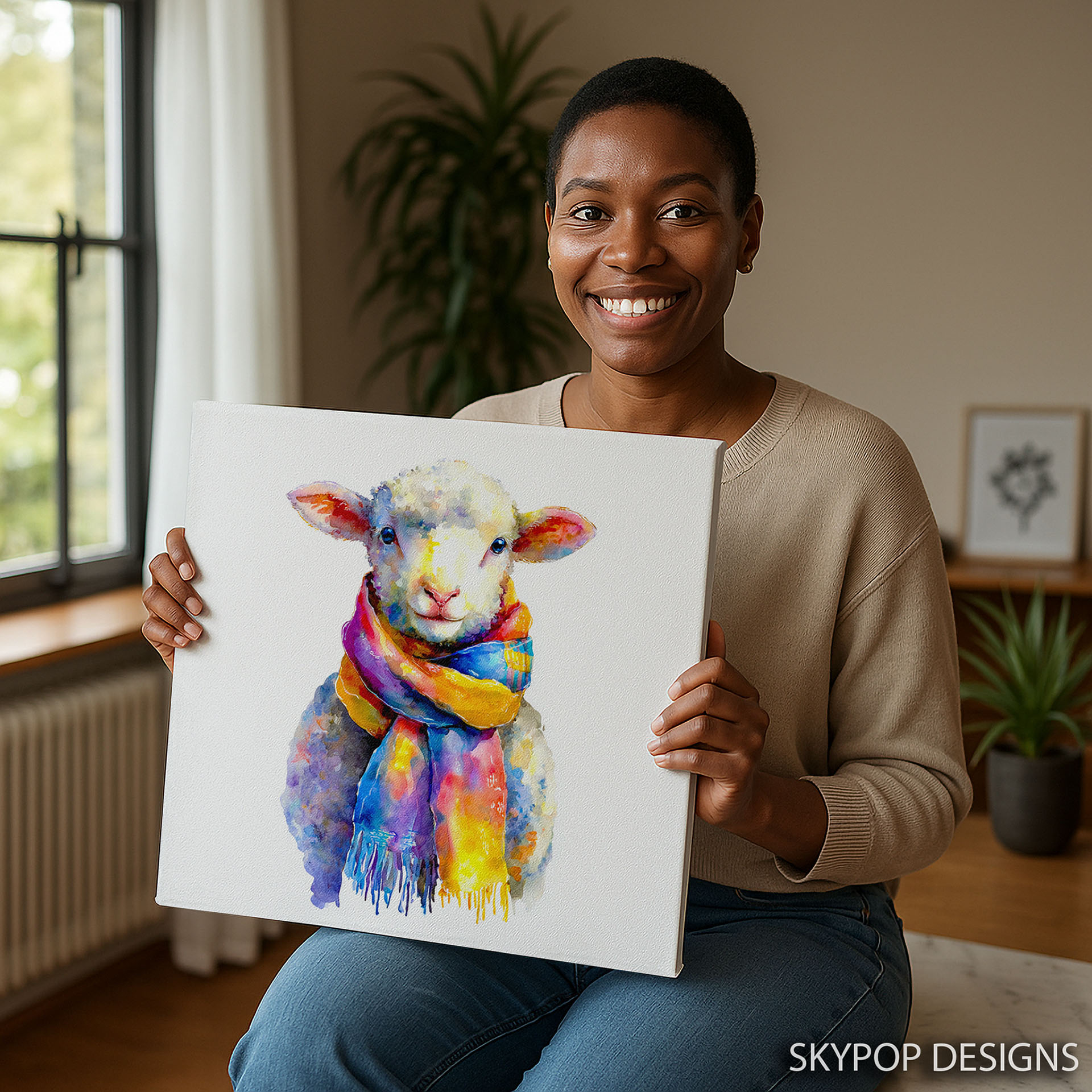 Bring joy and warmth to your home with this charming sheep canvas wall art featuring a delightful sheep sporting a vibrant rainbow scarf. This whimsical poster or canvas wall art is perfect for transforming a child’s room, adding a playful touch to a bedroom, or creating a cozy atmosphere in your living room. The vivid multicolor scarf pops against the sheep’s soft white fleece, creating a striking visual that captivates and inspires. Ideal for bohemian or Scandinavian decor, this animal art piece adds personality and a cheerful mood to any space. The watercolor style and expressive brushstrokes lend a unique artistic quality, making this canvas wall art a true statement piece. This print is ideal for nursery decor, bringing a sense of comfort and playful wonder. The blend of soft and bold colors evokes feelings of happiness and coziness, perfect for creating a welcoming environment. High-quality printing ensures that every detail of the watercolor artwork is beautifully rendered, making this poster a standout addition to your wall decor. It’s a fantastic housewarming gift or a special treat for birthdays and holidays, adding a touch of unique artistry. Elevate your home’s aesthetic with this heartwarming sheep canvas art, a perfect fusion of endearing subject matter and contemporary design trends. Add a splash of color and charm to your walls today with this lovely sheep artwork.