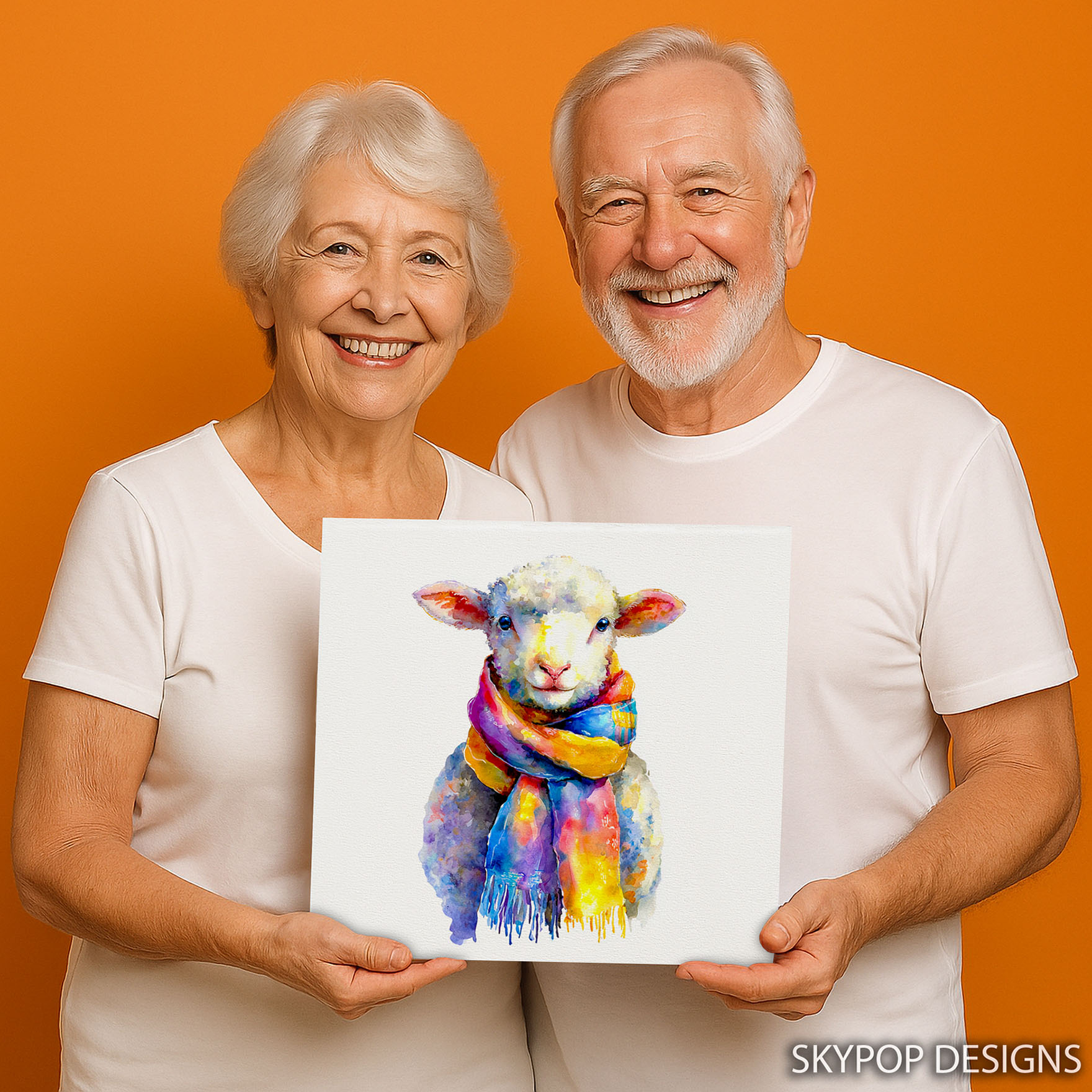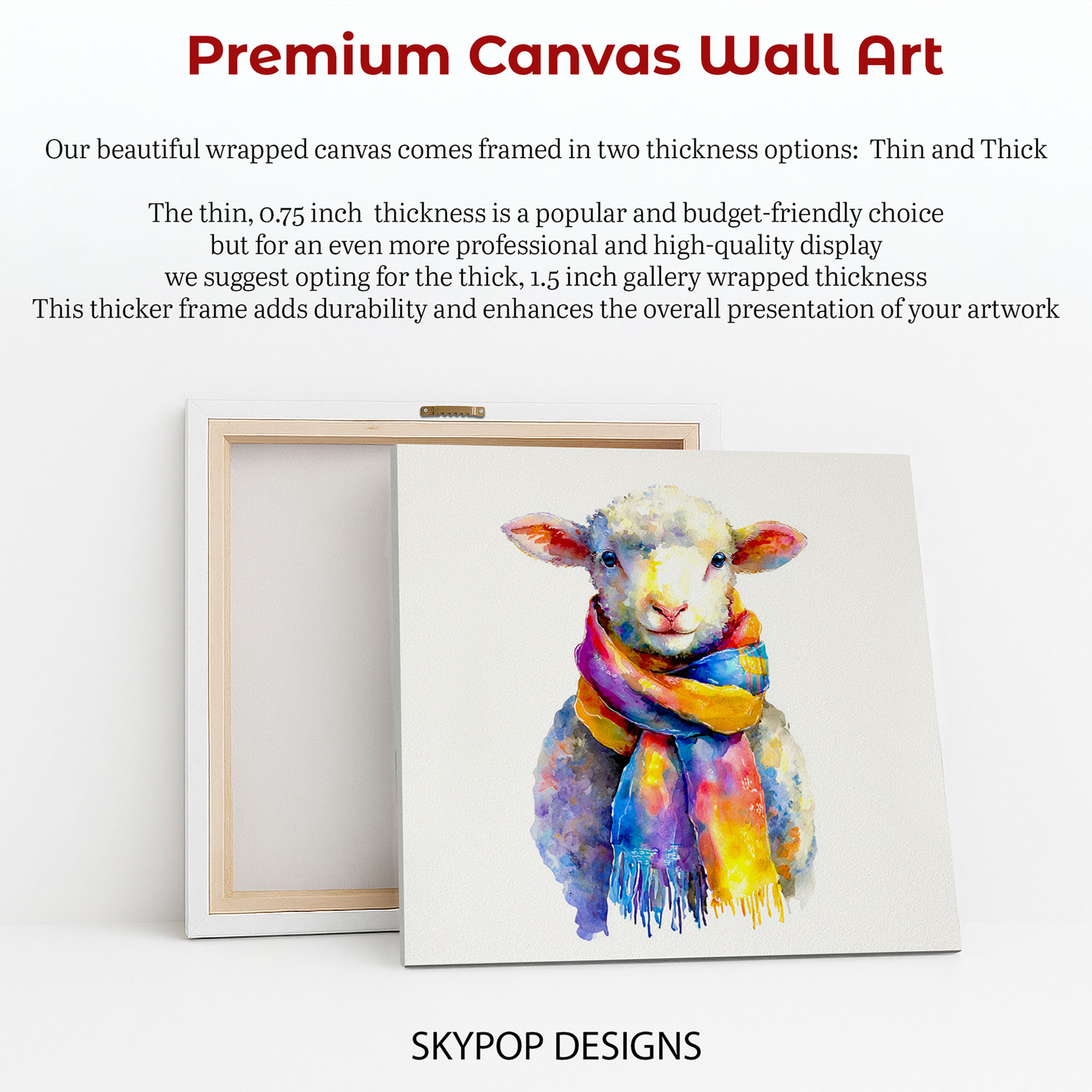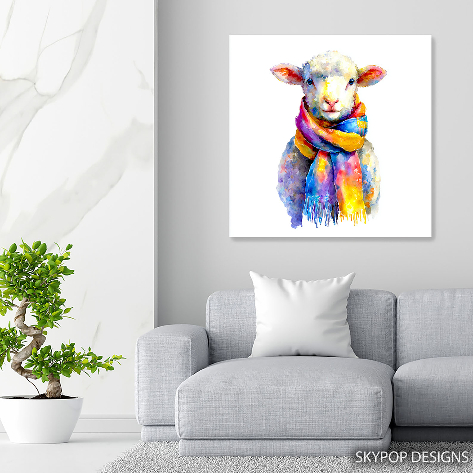 Bring joy and warmth to your home with this charming sheep canvas wall art featuring a delightful sheep sporting a vibrant rainbow scarf. This whimsical poster or canvas wall art is perfect for transforming a child’s room, adding a playful touch to a bedroom, or creating a cozy atmosphere in your living room. The vivid multicolor scarf pops against the sheep’s soft white fleece, creating a striking visual that captivates and inspires. Ideal for bohemian or Scandinavian decor, this animal art piece adds personality and a cheerful mood to any space. The watercolor style and expressive brushstrokes lend a unique artistic quality, making this canvas wall art a true statement piece. This print is ideal for nursery decor, bringing a sense of comfort and playful wonder. The blend of soft and bold colors evokes feelings of happiness and coziness, perfect for creating a welcoming environment. High-quality printing ensures that every detail of the watercolor artwork is beautifully rendered, making this poster a standout addition to your wall decor. It’s a fantastic housewarming gift or a special treat for birthdays and holidays, adding a touch of unique artistry. Elevate your home’s aesthetic with this heartwarming sheep canvas art, a perfect fusion of endearing subject matter and contemporary design trends. Add a splash of color and charm to your walls today with this lovely sheep artwork.