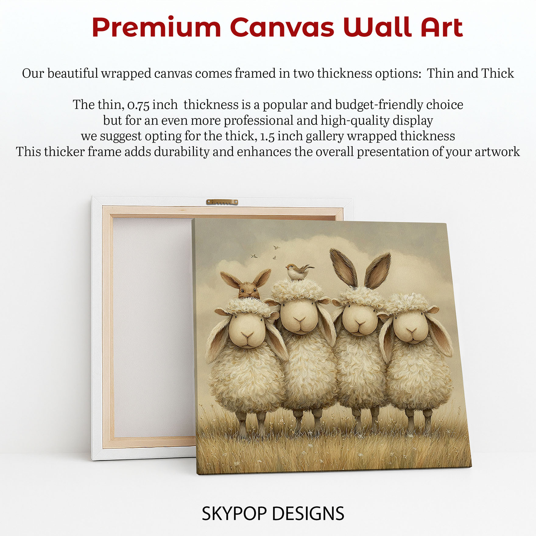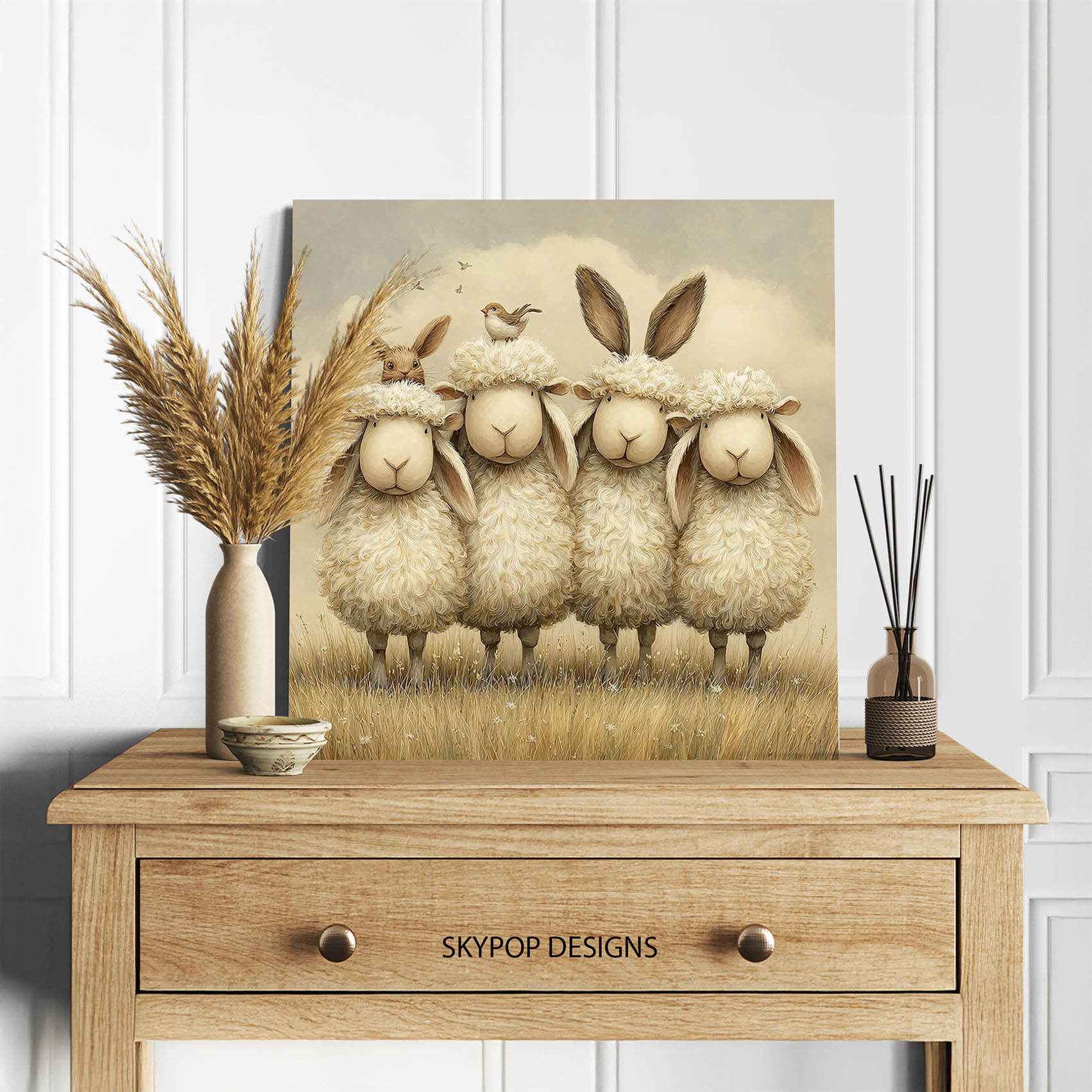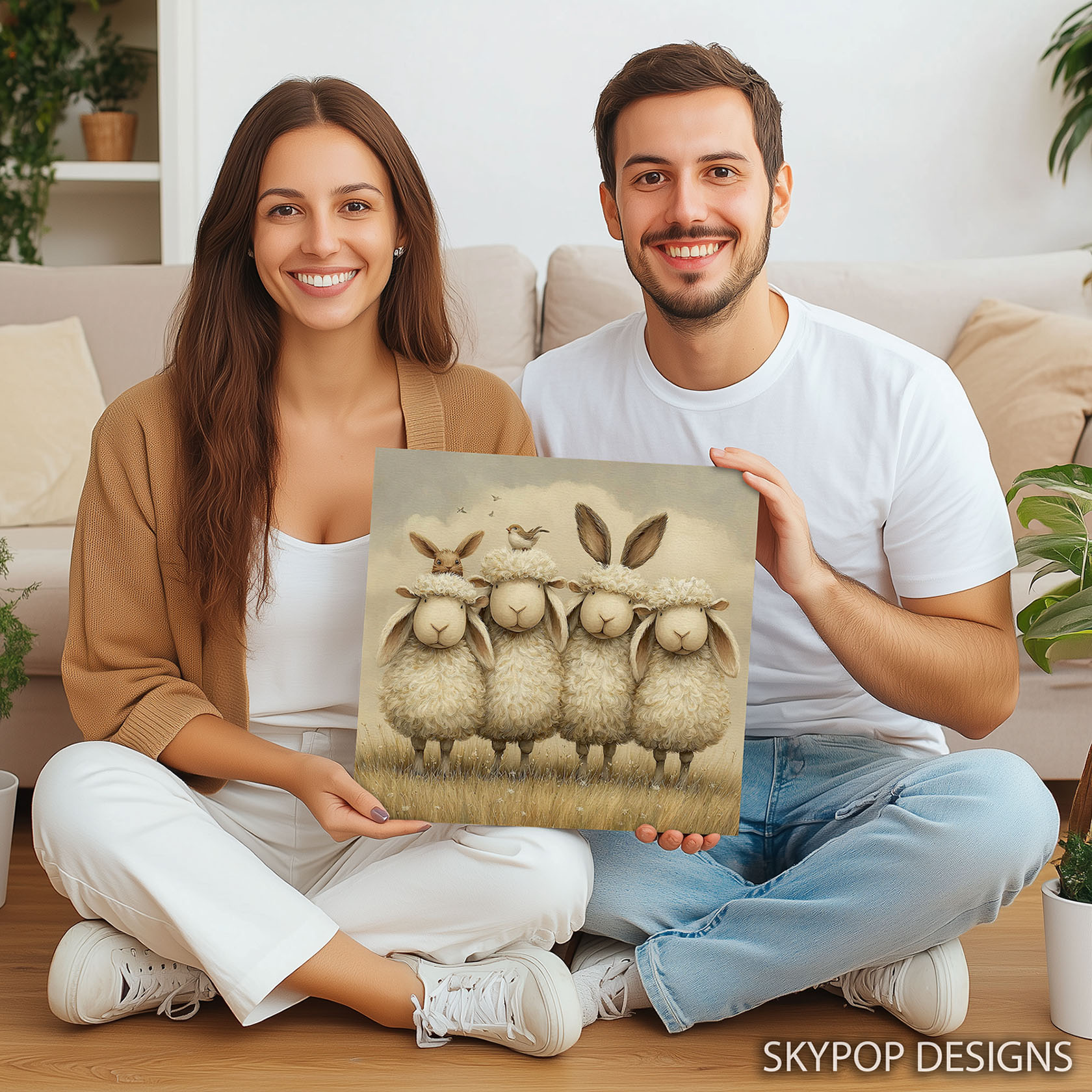 Transform your space with this charming sheep canvas wall art, featuring adorable sheep with bunny ears and a little bird perched on top. This whimsical poster or canvas wall art is perfect for creating a playful and inviting atmosphere in your living room, children’s room, or nursery. The soft, neutral color palette of beige, brown, and white evokes a sense of calm and warmth, making it ideal for bohemian or farmhouse decor styles. The endearing expressions of the sheep and the playful bunny ears add a touch of whimsy that appeals to all ages. This animal art piece is not only a delightful addition to your home but also a fantastic gift for housewarmings, birthdays, or baby showers. The high-quality printing ensures every detail of the textured wool and soft feathers is rendered beautifully on this canvas wall art. Whether you’re looking to decorate a cozy bedroom or add character to a game room, this versatile artwork brings joy and personality to any space. Elevate your wall decor with this unique and heartwarming piece that celebrates friendship and simple pleasures. Make this delightful sheep and bunny canvas art the focal point of your decor and let it inspire smiles every day. This makes a wonderful addition to any animal lover’s collection, adding a touch of countryside charm. Bring a smile to your face with this captivating and heartwarming wall art.
