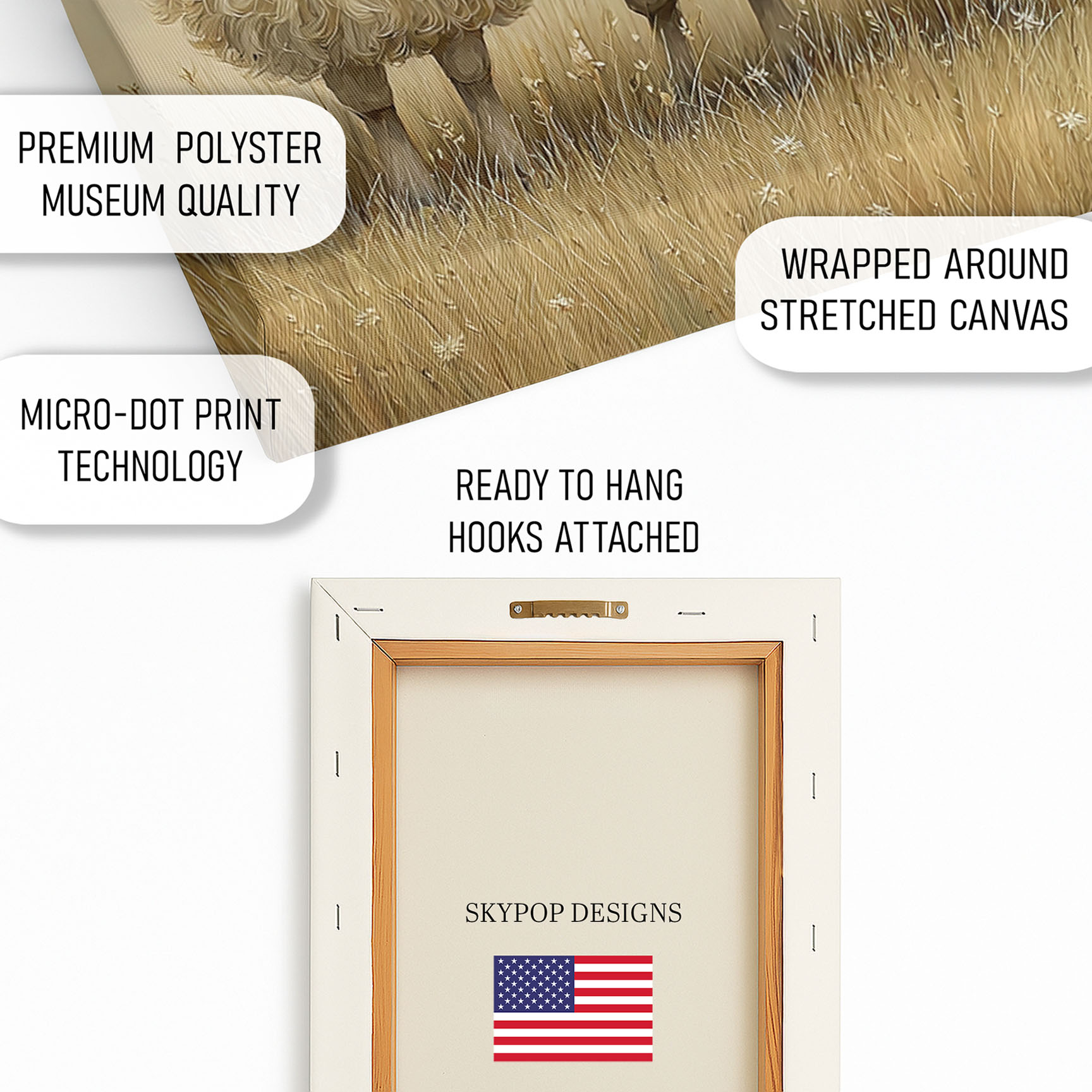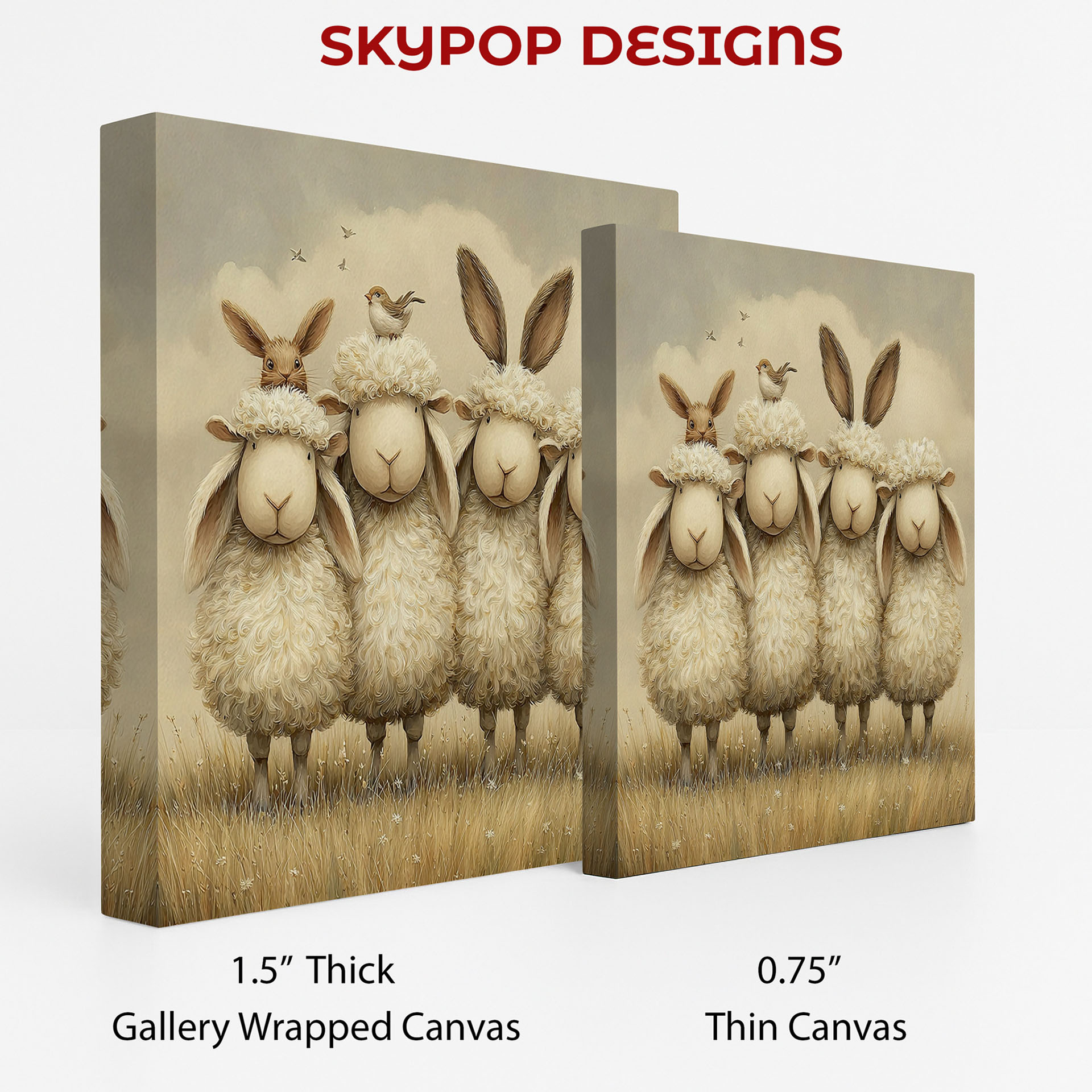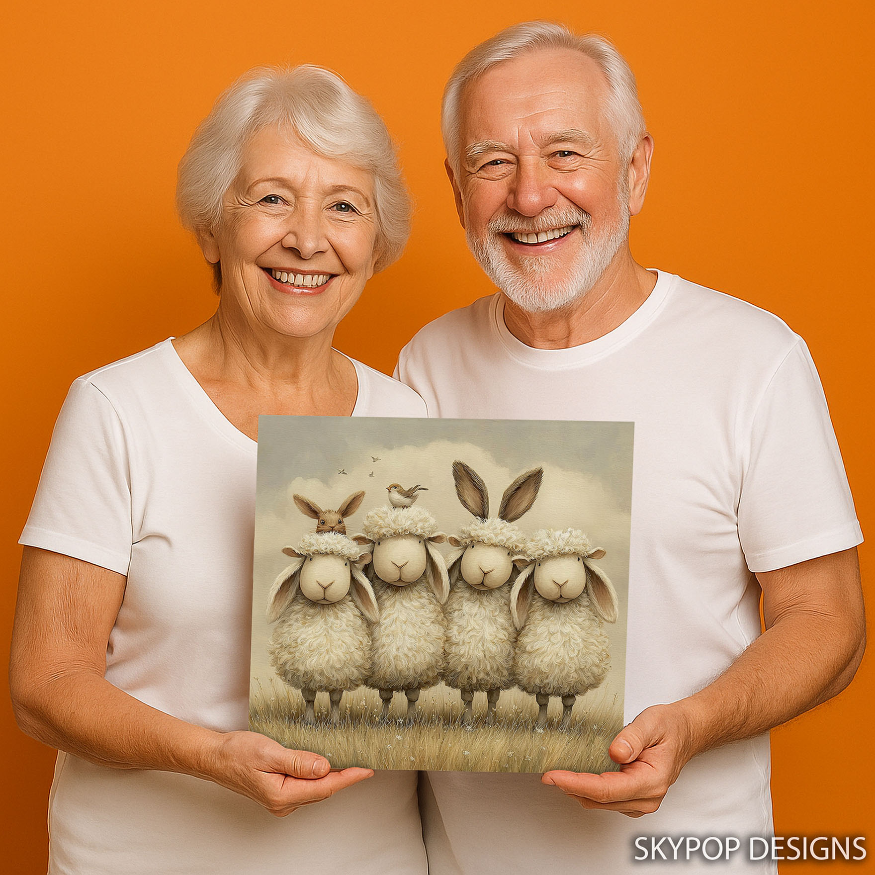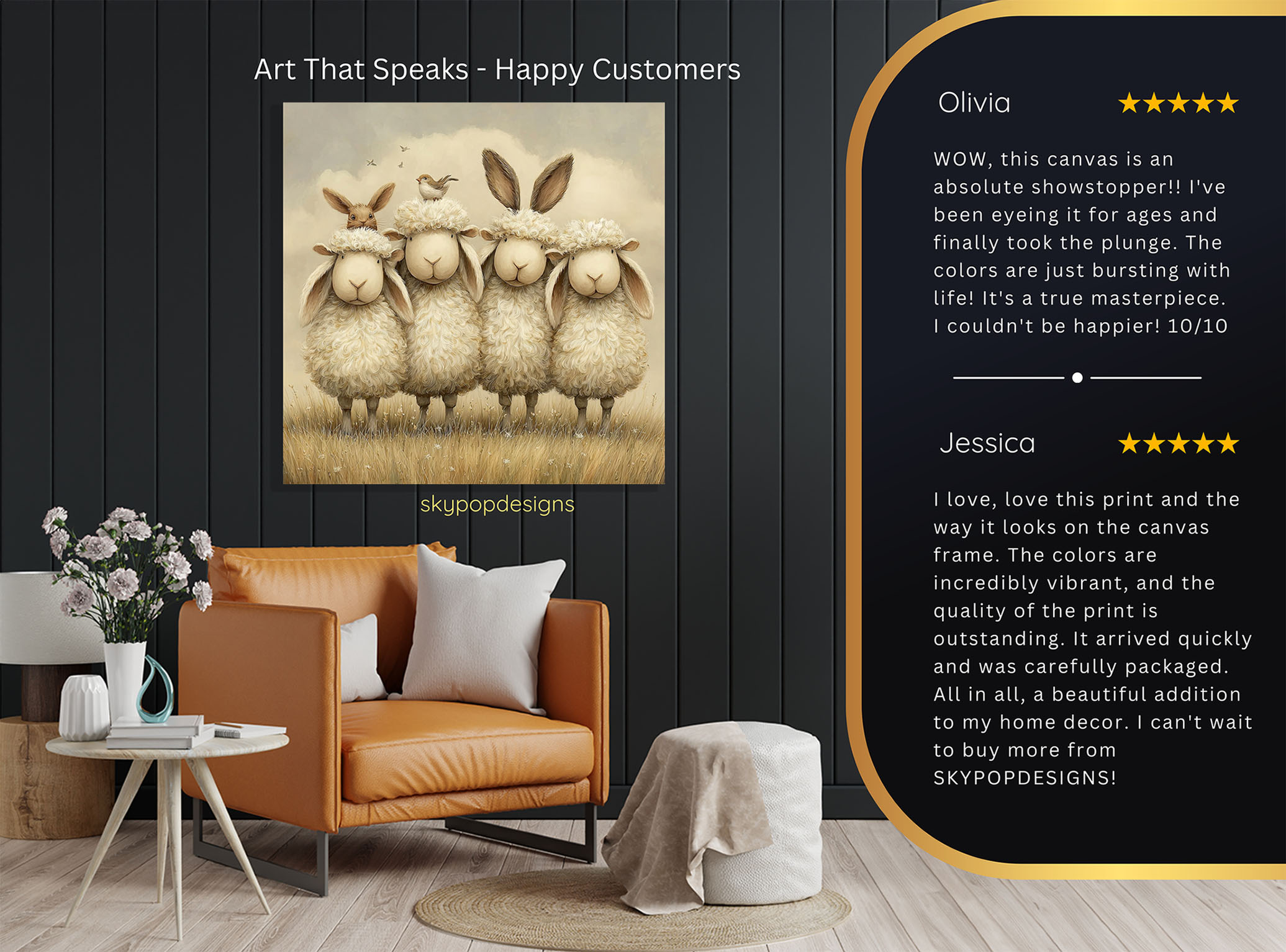 Transform your space with this charming sheep canvas wall art, featuring adorable sheep with bunny ears and a little bird perched on top. This whimsical poster or canvas wall art is perfect for creating a playful and inviting atmosphere in your living room, children’s room, or nursery. The soft, neutral color palette of beige, brown, and white evokes a sense of calm and warmth, making it ideal for bohemian or farmhouse decor styles. The endearing expressions of the sheep and the playful bunny ears add a touch of whimsy that appeals to all ages. This animal art piece is not only a delightful addition to your home but also a fantastic gift for housewarmings, birthdays, or baby showers. The high-quality printing ensures every detail of the textured wool and soft feathers is rendered beautifully on this canvas wall art. Whether you’re looking to decorate a cozy bedroom or add character to a game room, this versatile artwork brings joy and personality to any space. Elevate your wall decor with this unique and heartwarming piece that celebrates friendship and simple pleasures. Make this delightful sheep and bunny canvas art the focal point of your decor and let it inspire smiles every day. This makes a wonderful addition to any animal lover’s collection, adding a touch of countryside charm. Bring a smile to your face with this captivating and heartwarming wall art.