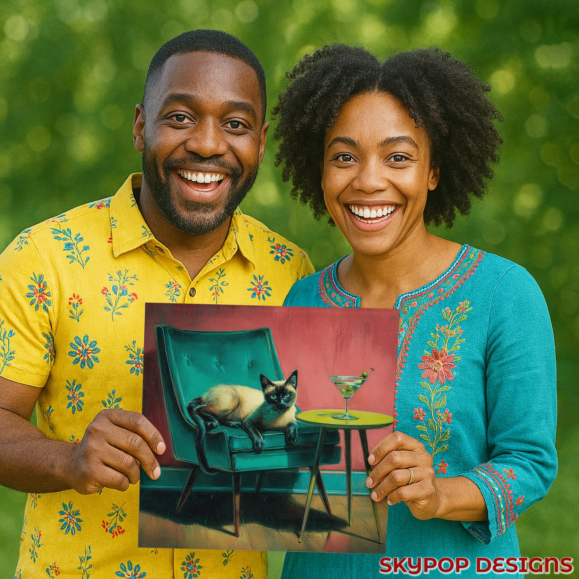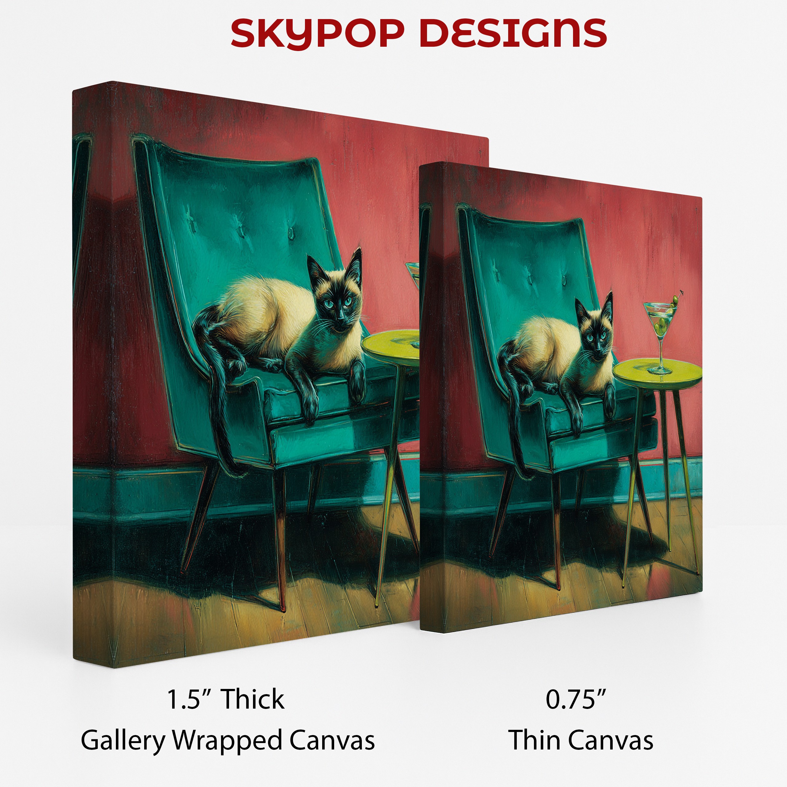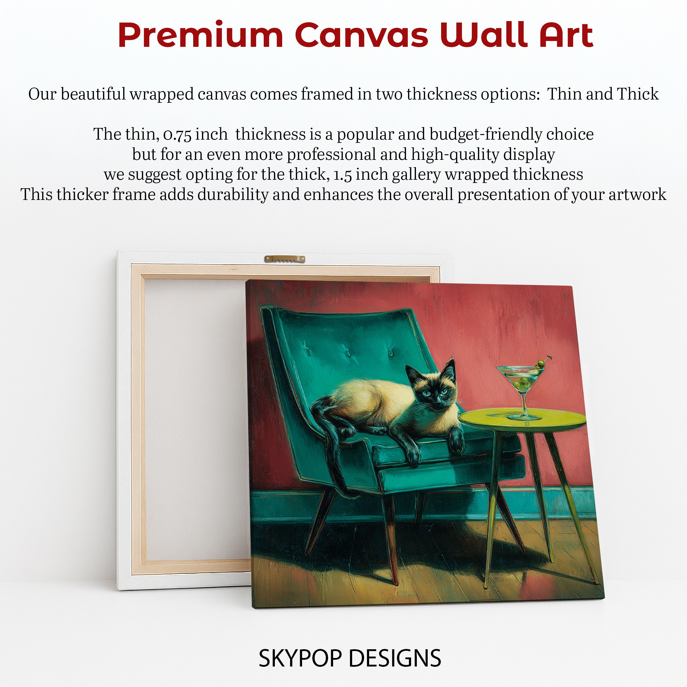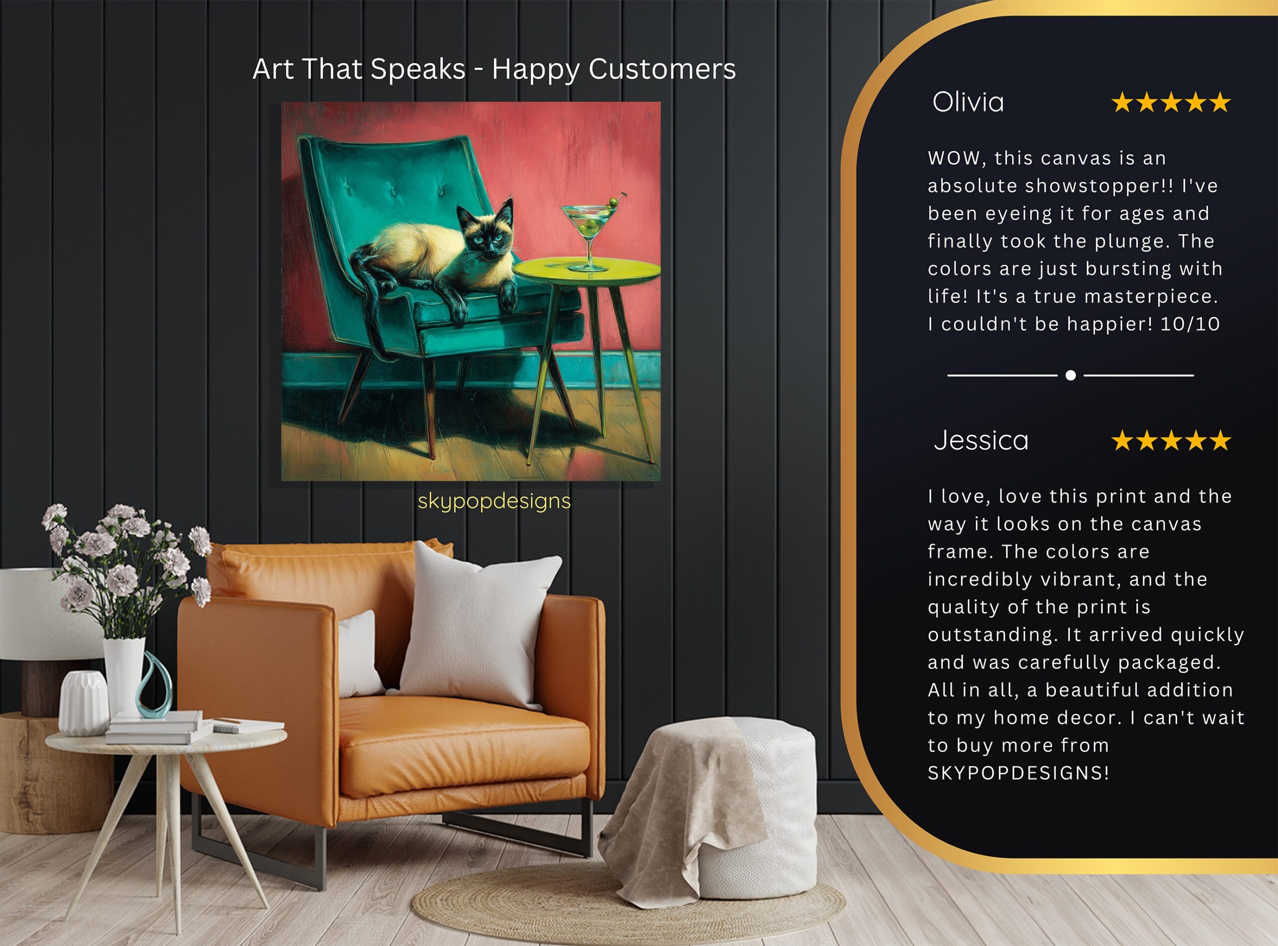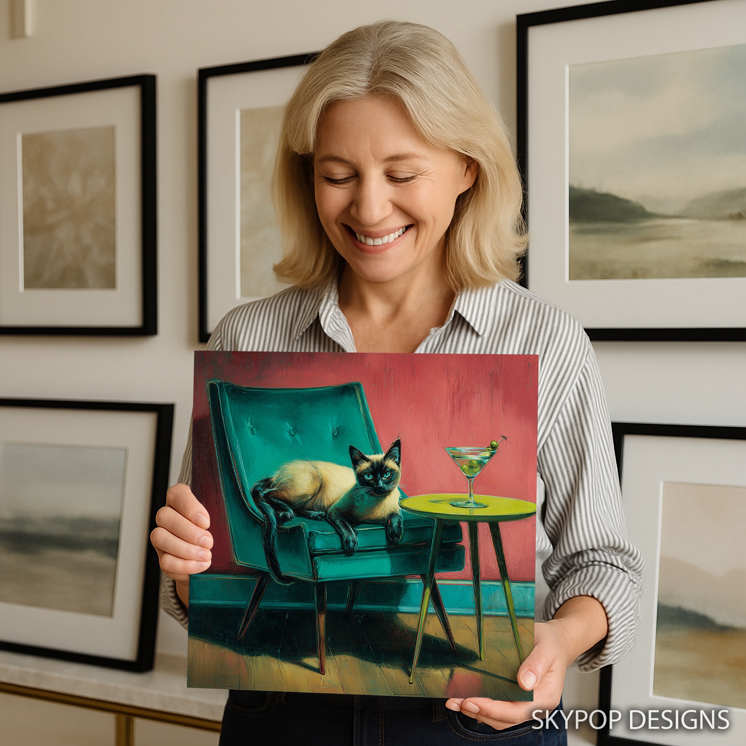 Elevate your space with this striking canvas wall art featuring a sophisticated Siamese cat lounging beside a classic martini. This eye-catching poster seamlessly blends retro charm with contemporary flair, making it the perfect statement piece for your mid-century modern living room or home bar. The vibrant teal chair pops against the warm pink background, creating a bold color palette that instantly draws the eye. Ideal for cat lovers and cocktail enthusiasts alike, this whimsical animal art celebrates the intersection of feline grace and vintage glamour. The sleek lines and stylized details capture the essence of 1950s design, while the subject matter feels fresh and playful. Transform your dining room or office with this conversation-starting canvas that adds a touch of humor and elegance to any decor scheme. The high-quality printing ensures every brushstroke and subtle shading is faithfully reproduced, from the cat’s piercing blue eyes to the glistening martini glass. Whether you’re looking for a unique housewarming gift or want to infuse your own space with retro-inspired personality, this versatile artwork delivers. The combination of cool teal and warm pink creates a mood-enhancing atmosphere, perfect for entertaining or unwinding after a long day. Bring a touch of vintage glamour and feline charm to your walls with this irresistible Siamese cat martini art – it’s the purr-fect way to showcase your style and love for the good life.