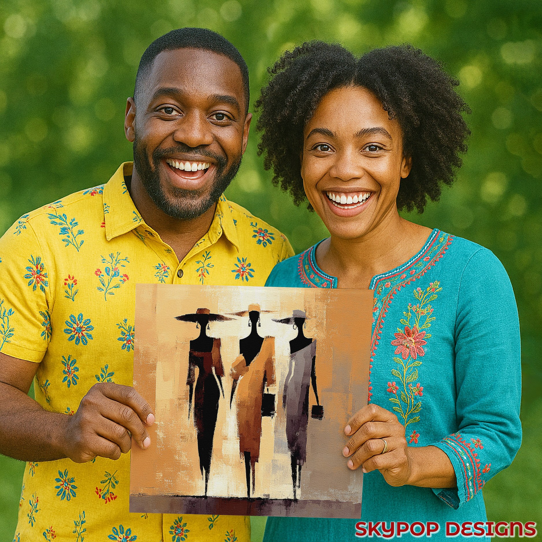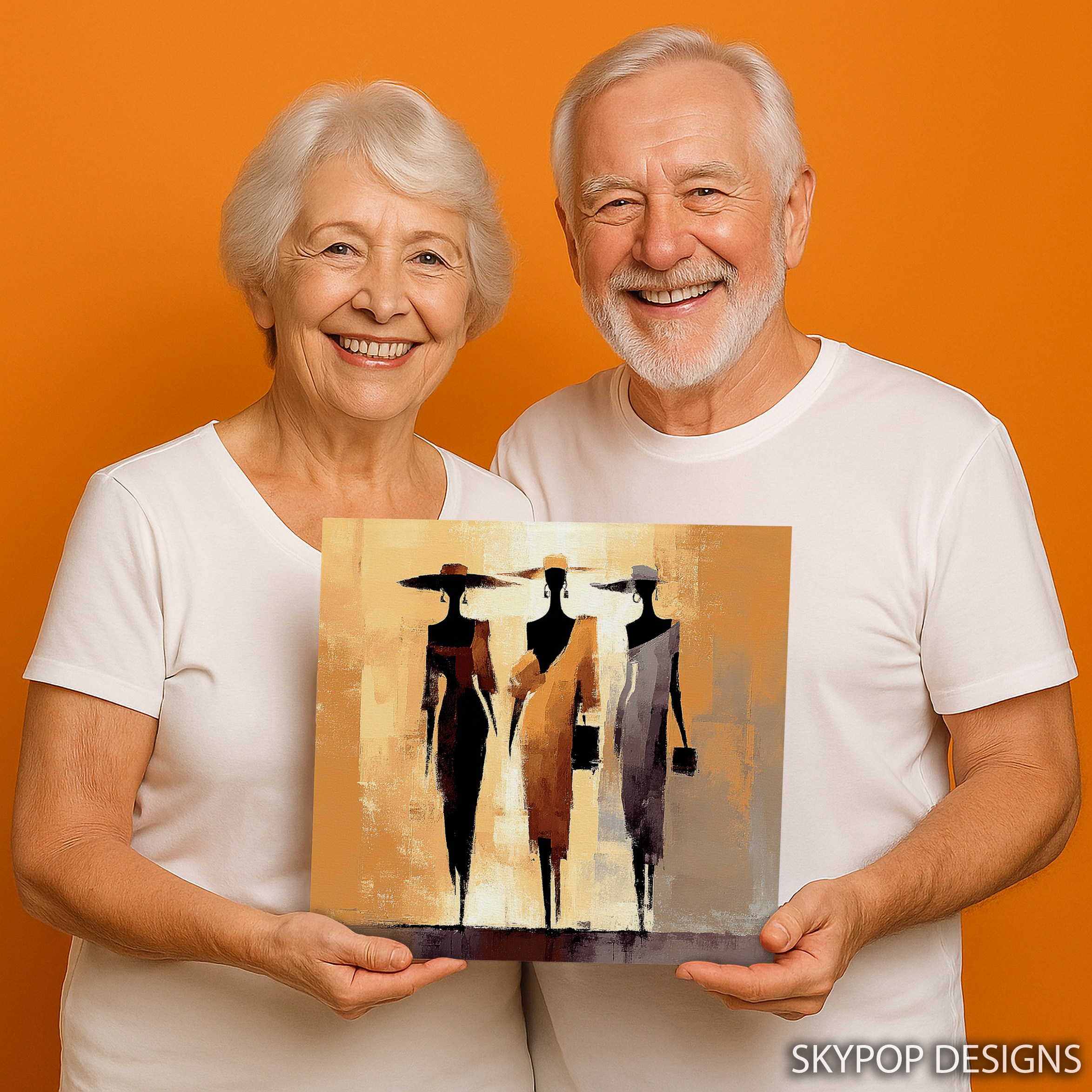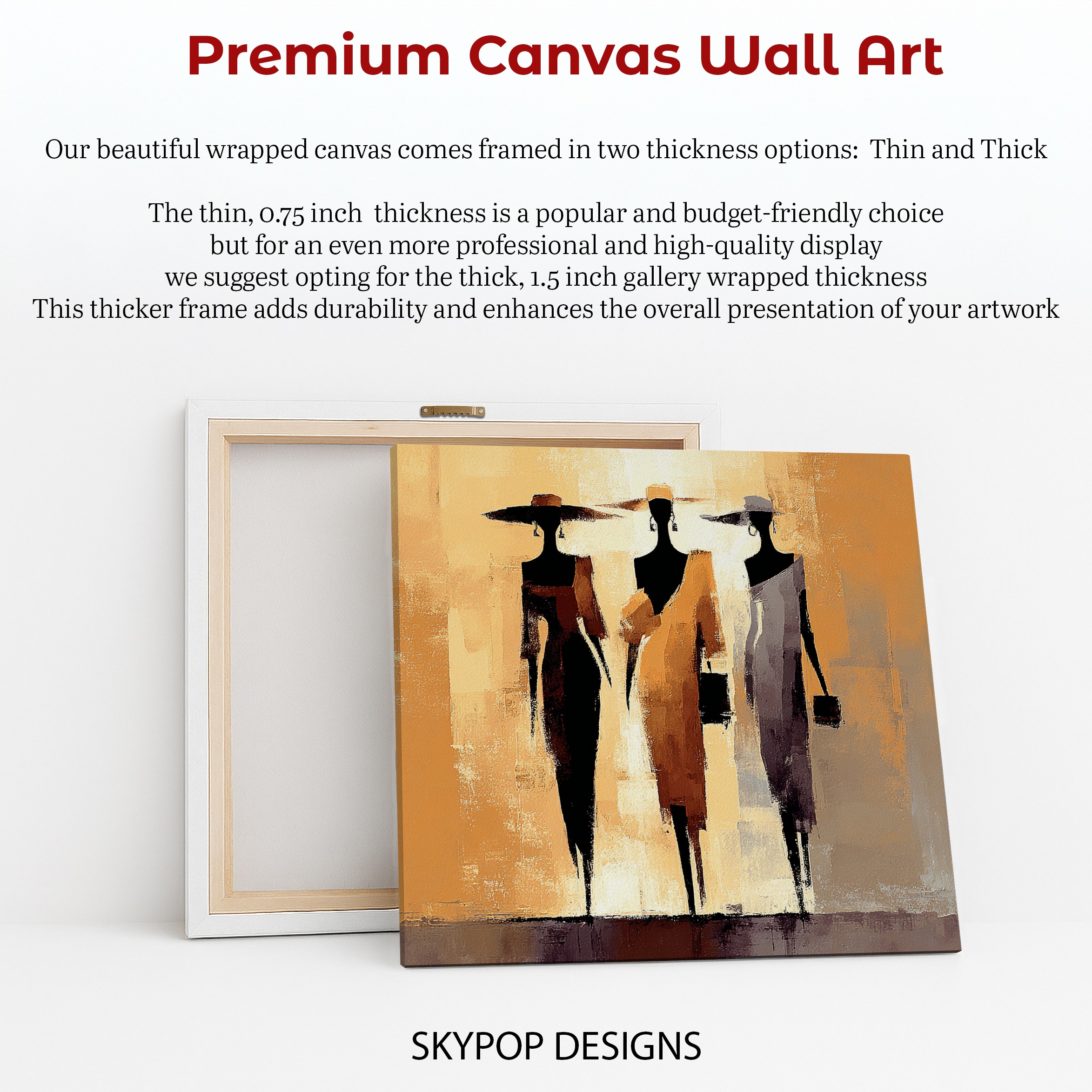 Elevate your space with this striking canvas wall art featuring three elegant silhouettes against a warm, textured background. This contemporary poster seamlessly blends figurative and abstract elements, creating a sophisticated focal point for any modern interior. The minimalist design showcases graceful figures in sleek black, adorned with wide-brimmed hats and flowing dresses that exude timeless glamour. Perfect for enhancing living rooms, bedrooms, or home offices, this canvas art adds a touch of refined style to your decor. The rich palette of black, brown, white, and gold tones creates a luxurious atmosphere, ideal for complementing both neutral and bold color schemes. This versatile wall art works beautifully in minimalist spaces, adding visual interest without overwhelming the room. The textured brushstrokes and subtle color variations give depth and movement to the composition, ensuring this piece remains captivating from every angle. Whether you’re looking to create a statement wall or add a touch of elegance to your dining area, this artwork delivers sophisticated impact. The high-quality printing captures every nuance of the original painting, from the delicate silhouettes to the warm, inviting background. Transform your home with this modern take on classic figurative art, celebrating feminine grace and style. Make a lasting impression on guests and elevate your daily surroundings with this timeless and chic wall art piece.