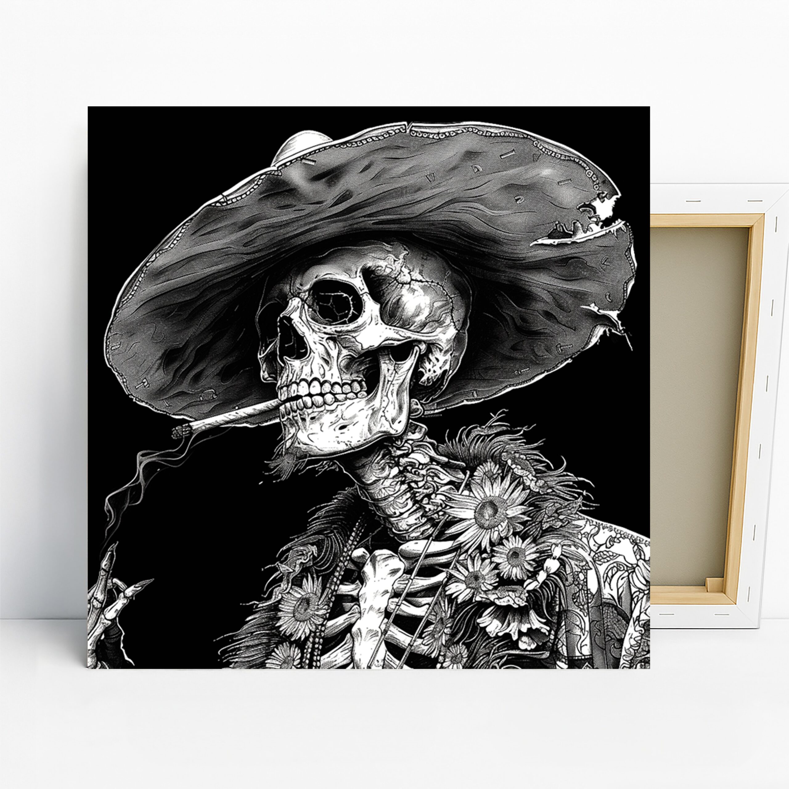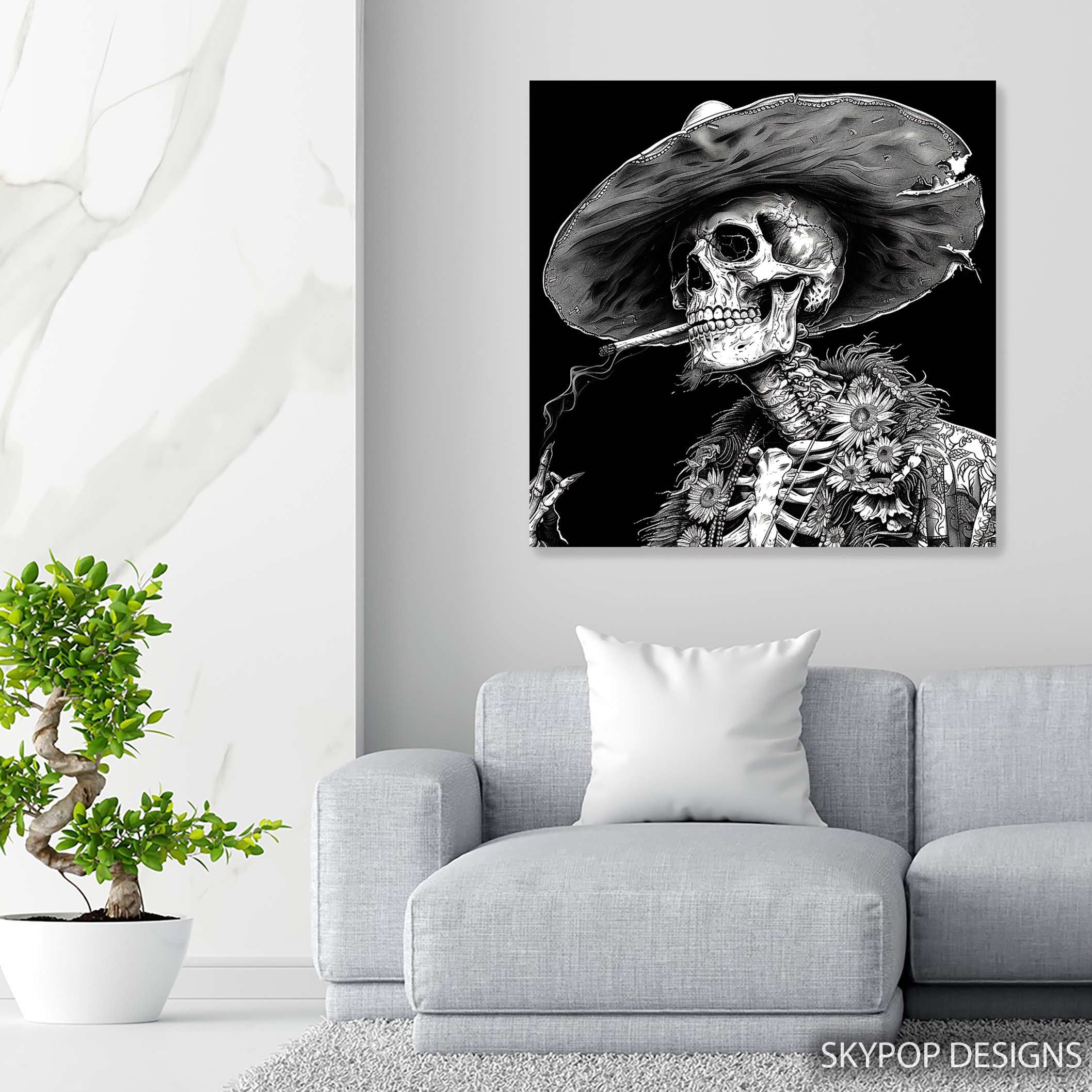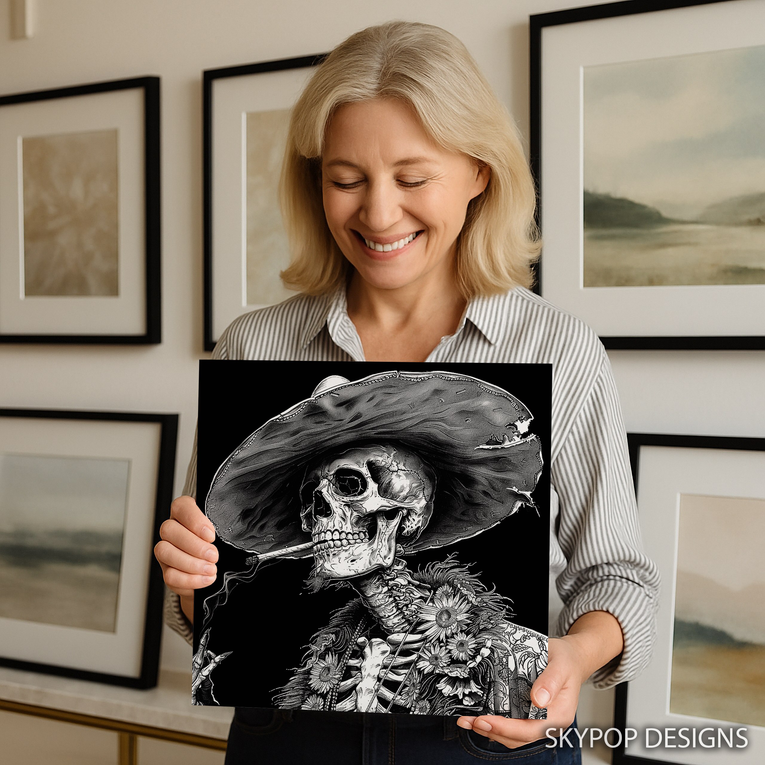 Transform your space with this striking skull canvas wall art that blends Gothic charm with rustic allure. This captivating poster features a haunting skull adorned with an ornate sombrero, surrounded by vibrant sunflowers for a unique juxtaposition of life and death. Perfect for adding a bold statement to your living room or creating an edgy atmosphere in your game room, this piece commands attention and sparks conversation. The intricate black and white details of the skull contrast beautifully with the brown sombrero and green sunflowers, creating a visually stunning composition. Ideal for those who love Gothic decor or want to add a touch of the macabre to their bohemian style, this canvas art elevates any room with its vintage-inspired design. The large sombrero adds a touch of cultural flair, while the delicate sunflower accents soften the overall look, making it versatile enough for various decor styles. Whether you’re looking to create a moody office space or add some artistic flair to your bedroom, this skull artwork delivers impact and intrigue. The high-quality printing captures every intricate detail, from the skull’s texture to the sombrero’s ornate patterns. Available in various sizes, this canvas wall art adapts to any space, making it a perfect gift for art enthusiasts or those who appreciate unique home decor. Bring a touch of the extraordinary to your walls and transform your living space with this hauntingly beautiful skull and sunflower masterpiece today.
