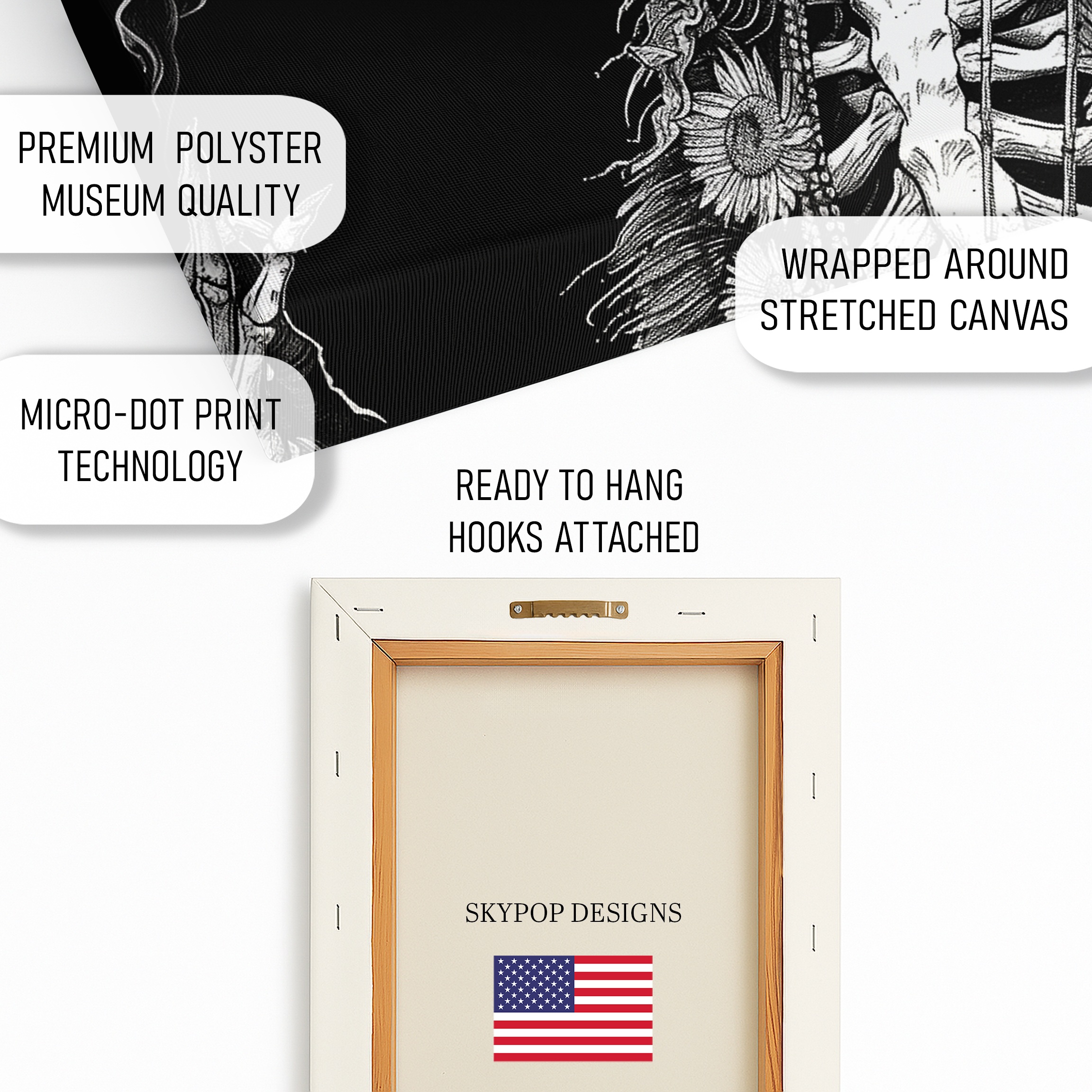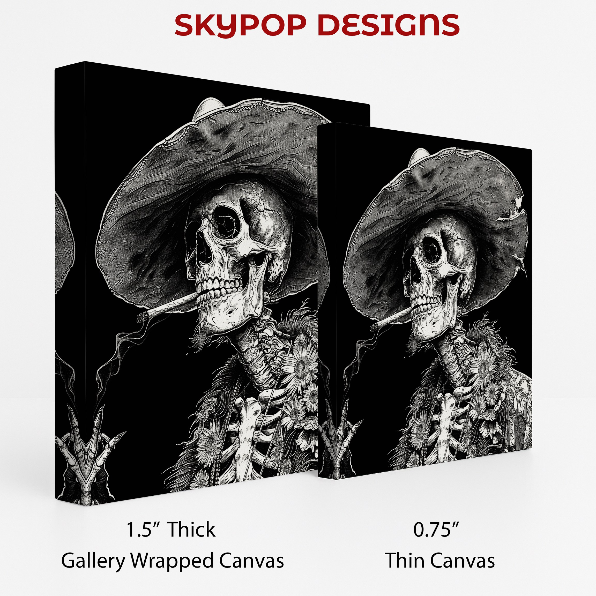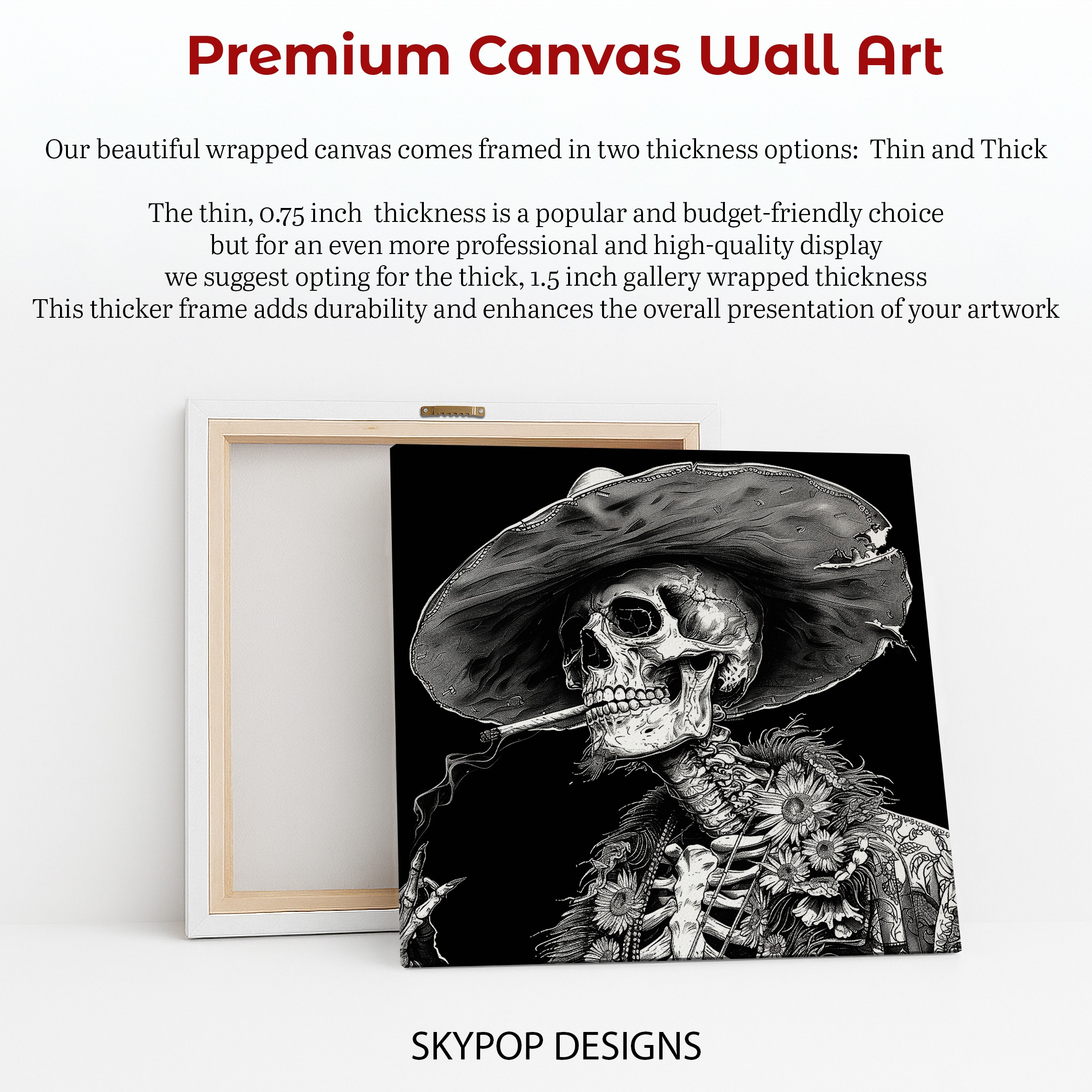Transform your space with this striking skull canvas wall art that blends Gothic charm with rustic allure. This captivating poster features a haunting skull adorned with an ornate sombrero, surrounded by vibrant sunflowers for a unique juxtaposition of life and death. Perfect for adding a bold statement to your living room or creating an edgy atmosphere in your game room, this piece commands attention and sparks conversation. The intricate black and white details of the skull contrast beautifully with the brown sombrero and green sunflowers, creating a visually stunning composition. Ideal for those who love Gothic decor or want to add a touch of the macabre to their bohemian style, this canvas art elevates any room with its vintage-inspired design. The large sombrero adds a touch of cultural flair, while the delicate sunflower accents soften the overall look, making it versatile enough for various decor styles. Whether you’re looking to create a moody office space or add some artistic flair to your bedroom, this skull artwork delivers impact and intrigue. The high-quality printing captures every intricate detail, from the skull’s texture to the sombrero’s ornate patterns. Available in various sizes, this canvas wall art adapts to any space, making it a perfect gift for art enthusiasts or those who appreciate unique home decor. Bring a touch of the extraordinary to your walls and transform your living space with this hauntingly beautiful skull and sunflower masterpiece today.