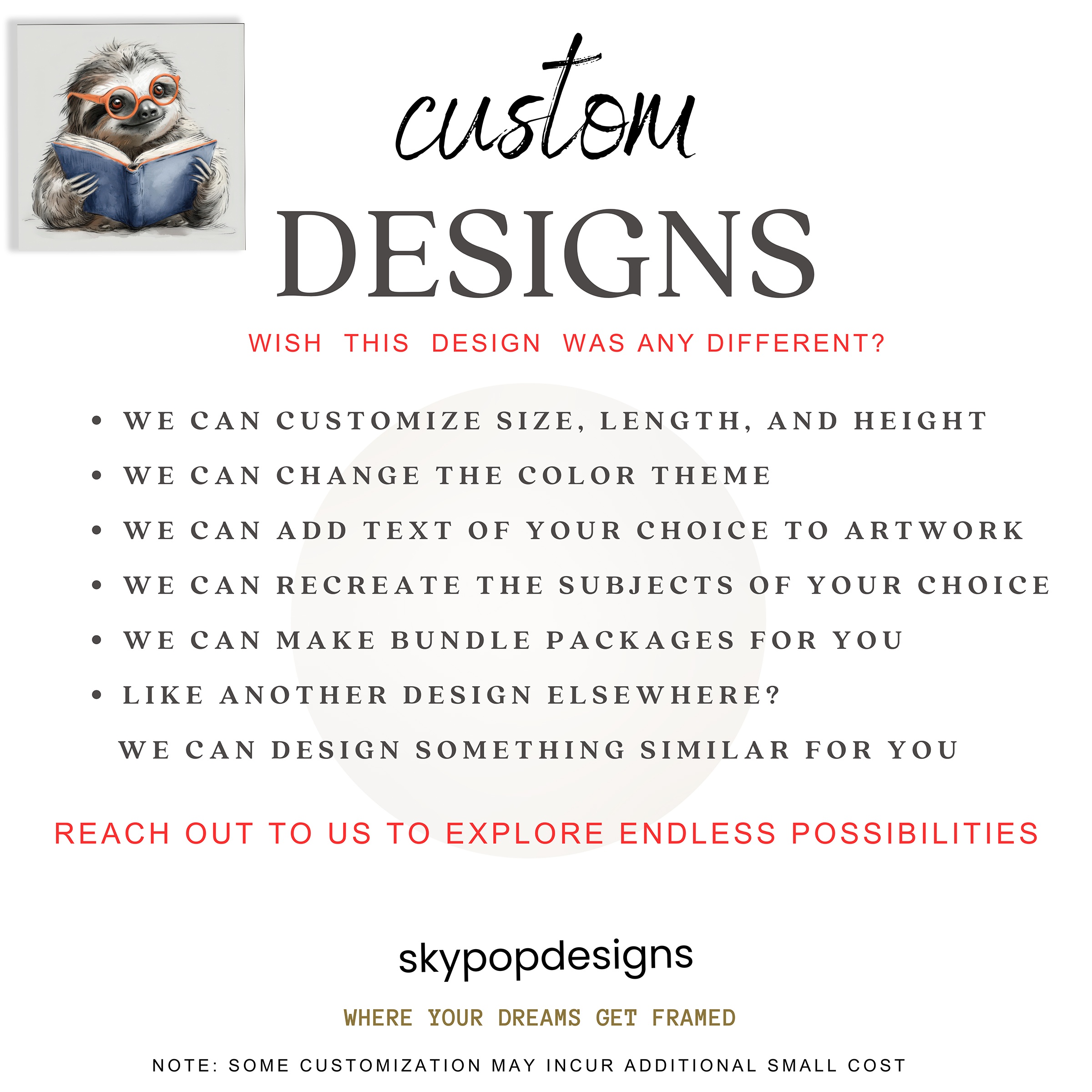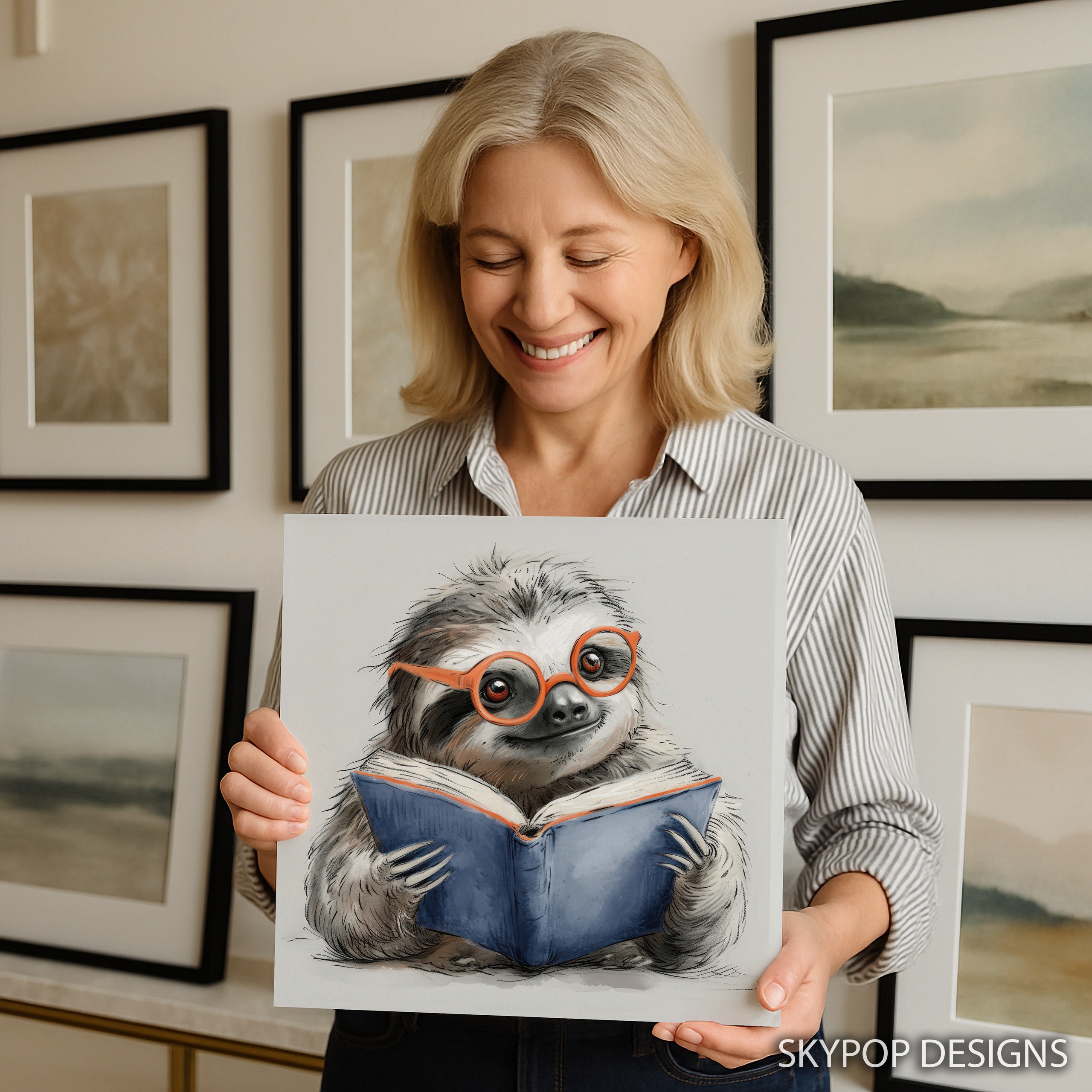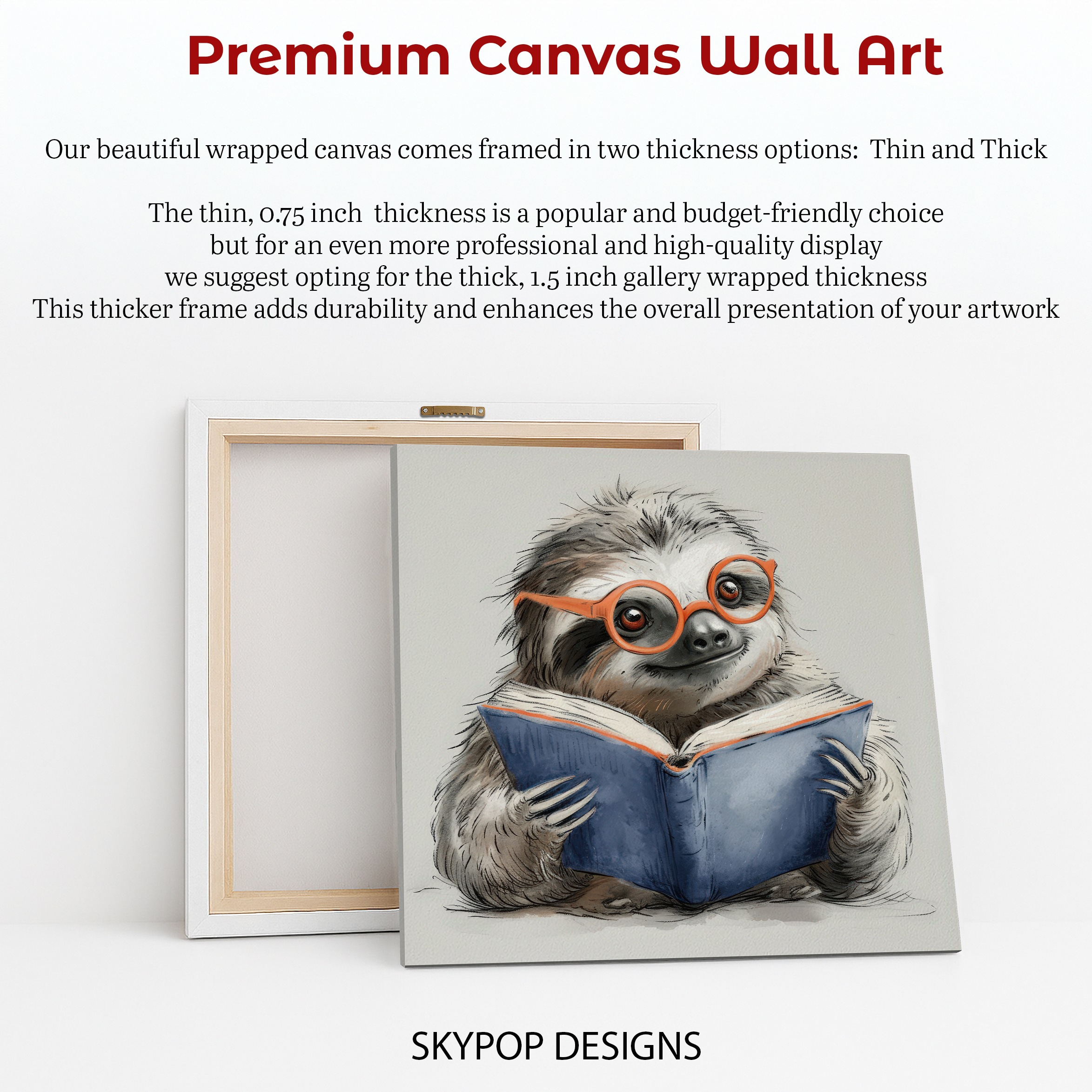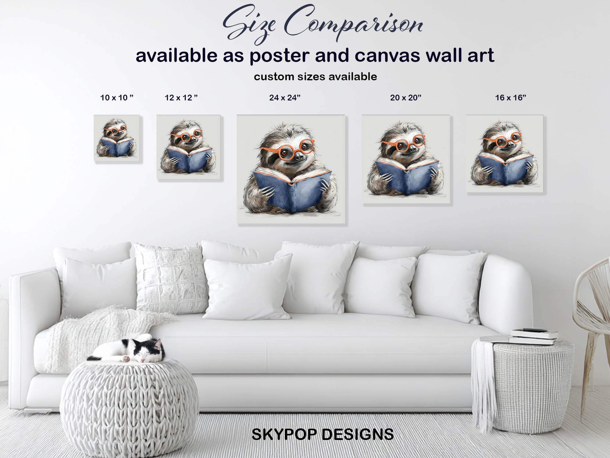 Transform your space with this charming sloth canvas wall art, showcasing a studious sloth engrossed in a book. This delightful poster or canvas wall art features a whimsical animal subject with a heartwarming scene, perfect for adding personality to any room. The striking blend of neutral tones with the pop of orange from the sloth’s glasses and book accents creates a visually engaging piece. Ideal for contemporary and bohemian decor styles alike, this canvas art elevates living rooms, bedrooms, or even offices with its unique charm. This artwork inspires a love for reading and provides a cozy, intellectual vibe, making it a fantastic gift for book lovers, students, or anyone who appreciates a touch of whimsy. The textured yet clean linework in this poster enhances the endearing character of the sloth, making it a memorable addition to your wall decor. Available in various sizes, this versatile canvas wall art easily integrates into your existing decor. Celebrate intellect and relaxation with this captivating sloth artwork, a perfect piece to enhance a modern living room or a cozy reading nook. Elevate your home decor with this unique and conversation-starting sloth poster today.