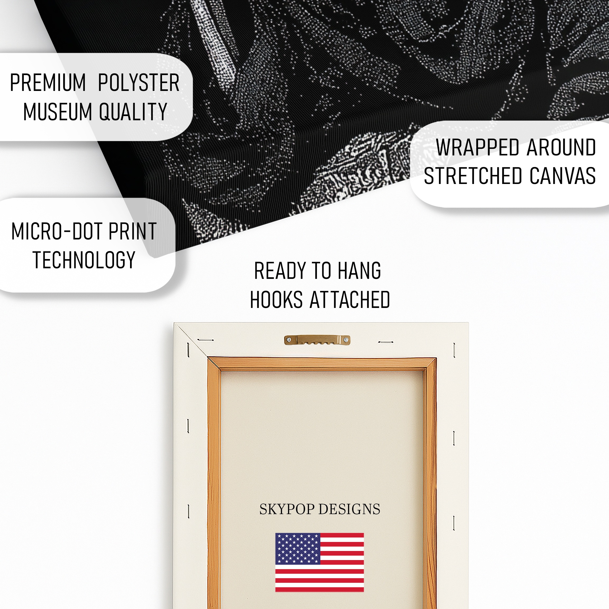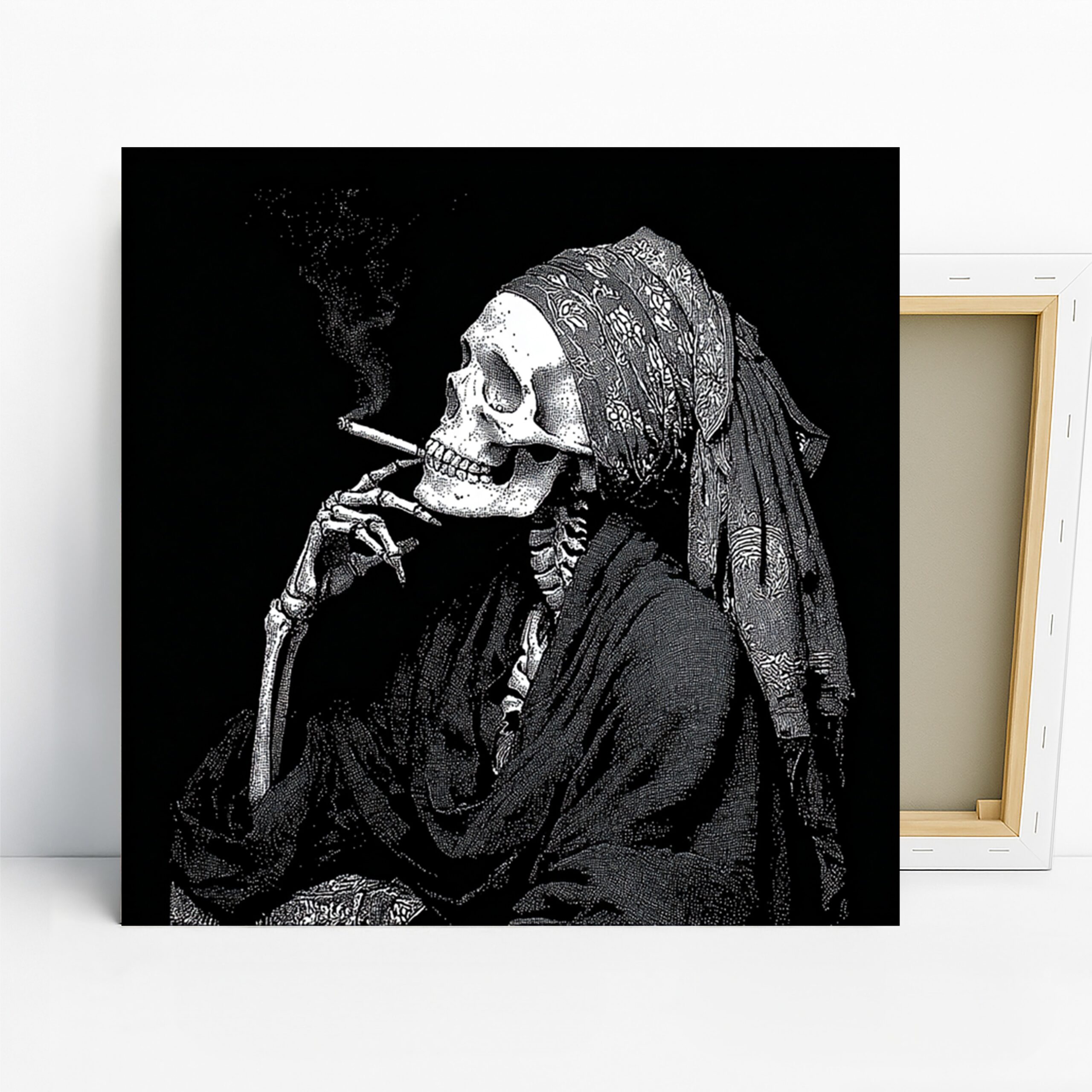 Elevate your space with this hauntingly captivating skull canvas wall art that seamlessly blends Gothic and surrealist elements. This striking poster features a meticulously detailed skull adorned with an ornate headscarf, caught in the act of smoking a cigarette. The stark black and white contrast creates a powerful visual impact, perfect for contemporary living rooms or edgy bedroom decor. Transform your walls with this bold statement piece that combines vintage-inspired illustration techniques with modern Gothic sensibilities. The intricate line work and subtle shading bring depth and dimension to the skull, while wisps of smoke add an ethereal quality to the composition. This canvas art is ideal for those who appreciate dark aesthetics and unconventional wall decor. The unique blend of macabre imagery and stylish accessories makes it a conversation starter in any room. Whether displayed in a moody office or as part of a curated gallery wall, this skull artwork adds instant character and attitude to your space. The high-quality printing ensures every detail is crisp and clear, from the delicate patterns on the headscarf to the skeletal structure of the hand. Perfect for Halloween enthusiasts or year-round Gothic decor lovers, this versatile piece adapts to various interior styles while maintaining its edgy appeal. Enhance your home’s atmosphere with this thought-provoking blend of life, death, and style. Make a bold statement and transform your walls today with this unforgettable skull art that celebrates the beauty in the unconventional.