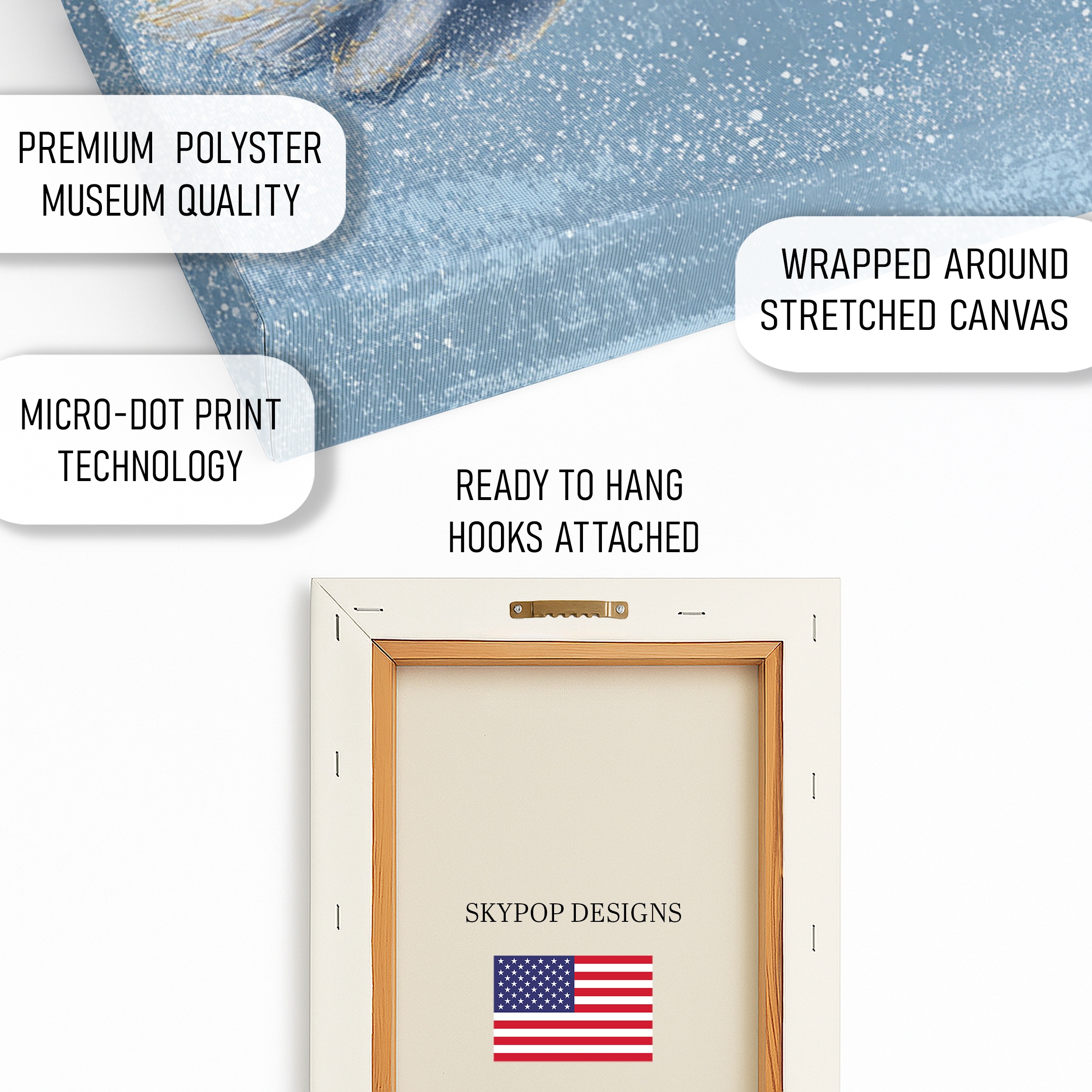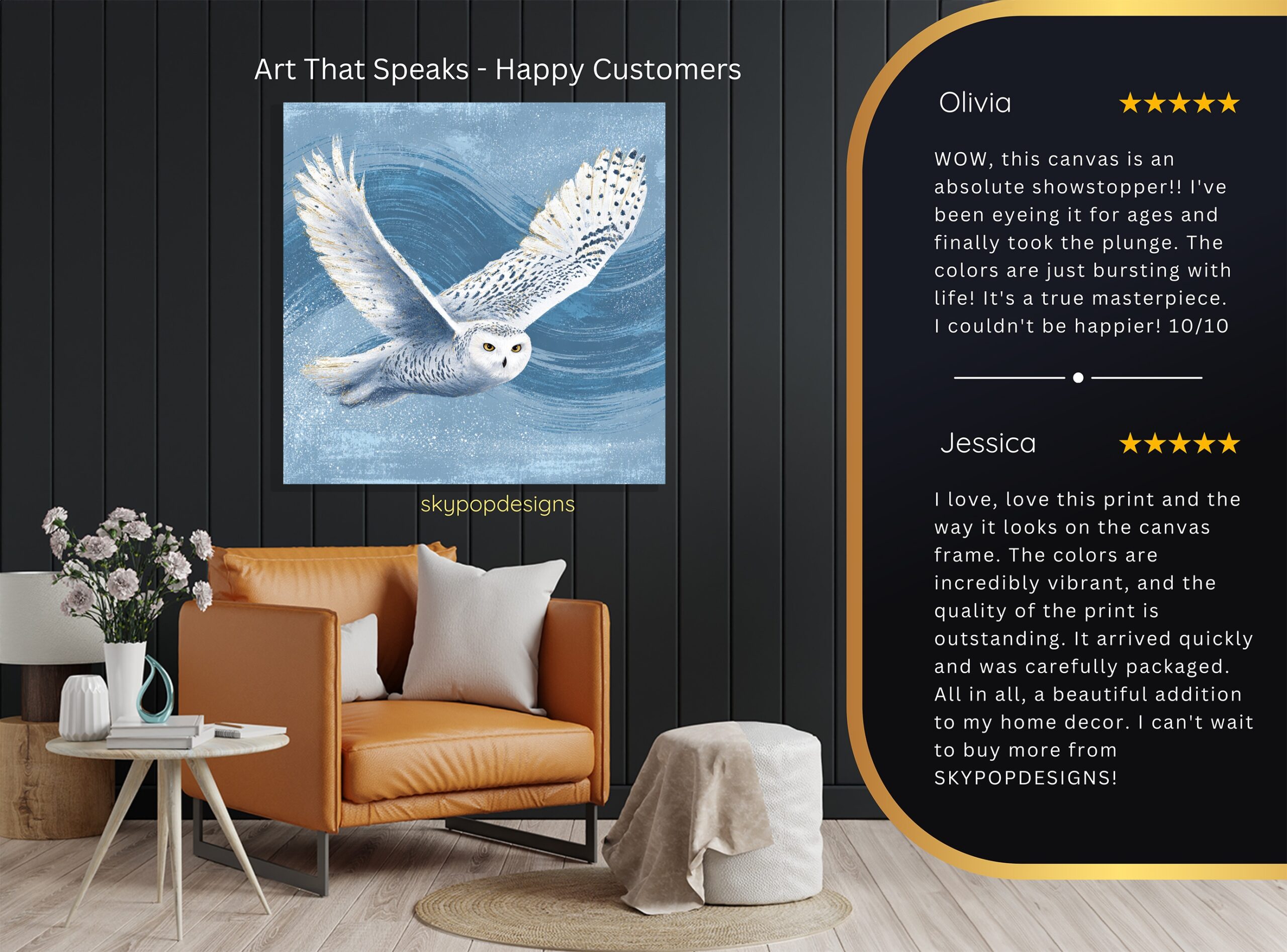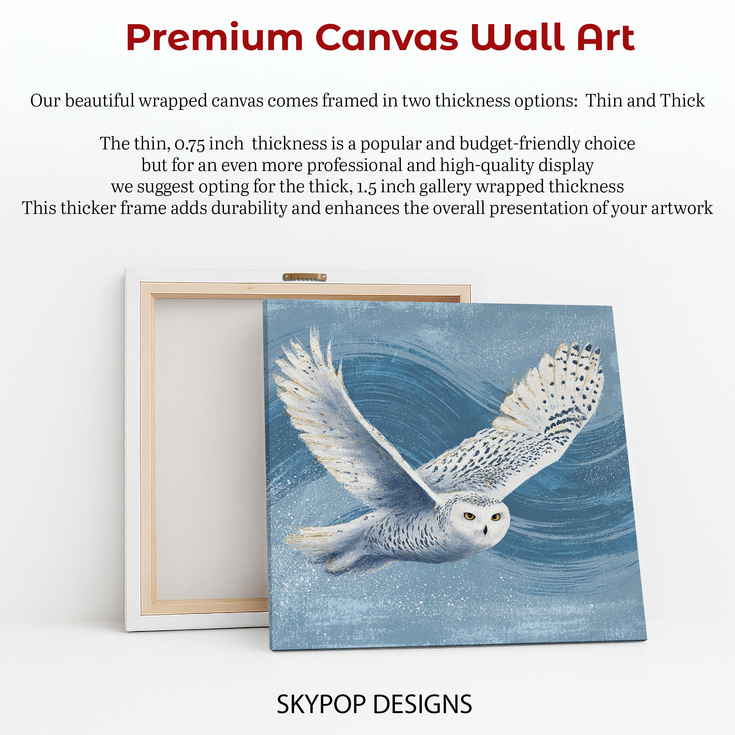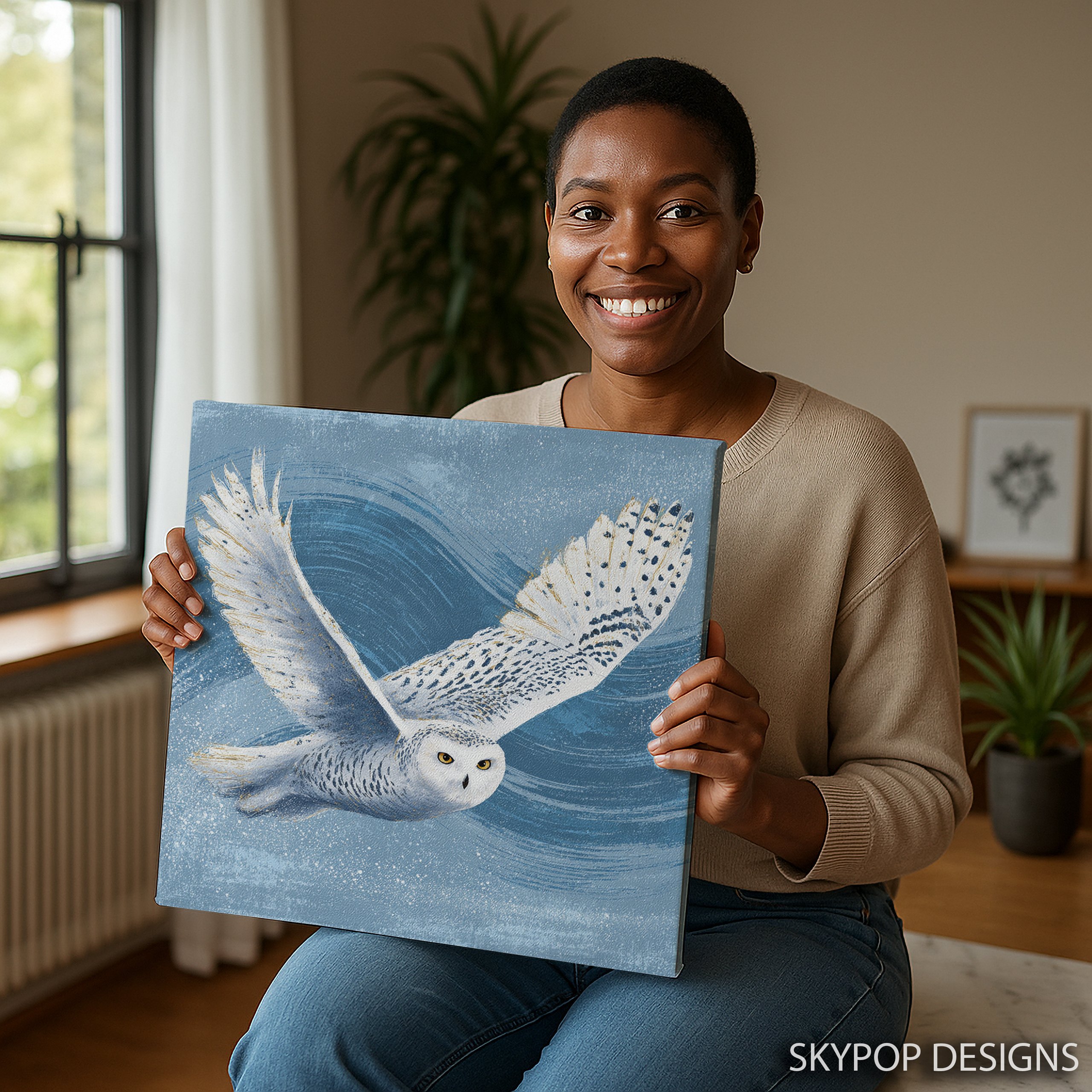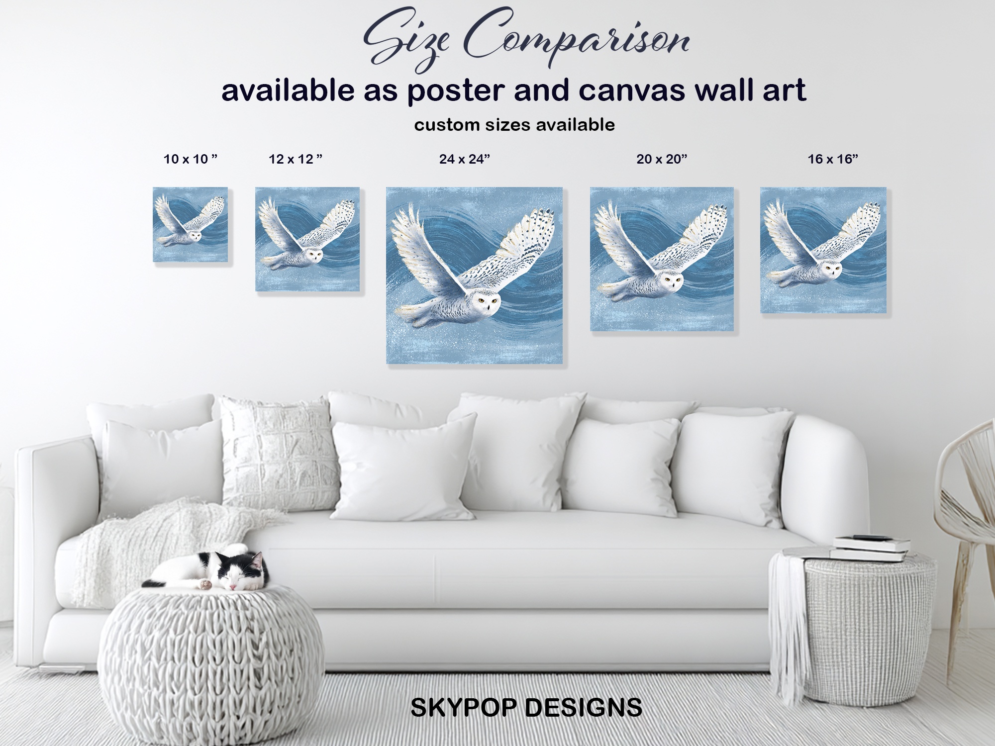 Elevate your space with this striking snow owl canvas wall art, capturing the majestic bird in mid-flight against a serene winter backdrop. This stunning poster showcases the owl’s impressive wingspan and intricate feather details, making it a captivating focal point for any room. Perfect for nature enthusiasts and bird lovers, this contemporary canvas art brings the beauty of wildlife indoors. The cool blue background evokes a sense of calm, while touches of gold add a touch of elegance, making it ideal for modern living room wall decor or a sophisticated bedroom accent. The owl’s piercing yellow eyes and graceful pose create a powerful presence, symbolizing wisdom and freedom. This versatile piece complements Scandinavian-inspired interiors and adds a touch of the wild to minimalist spaces. High-quality printing ensures every brushstroke and feather is captured in vivid detail, whether you choose it as a poster or canvas wall art. Gift this enchanting owl artwork to a bird enthusiast or use it to transform your own space with its serene yet powerful energy. The large white owl against the blue background creates a striking contrast, perfect for making a statement in home offices or children’s rooms. Bring the beauty of nature and the mystery of nocturnal creatures into your home with this captivating snow owl wall art. Add this eye-catching piece to your decor collection today and let it inspire a sense of wonder in your living space.