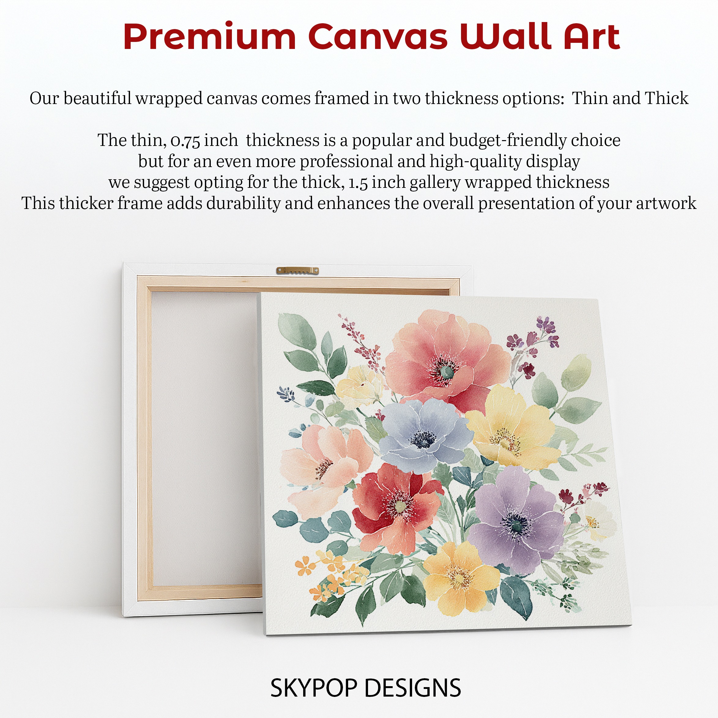Brighten your home with this stunning spring bouquet canvas wall art, showcasing a vibrant array of watercolor flowers in soft, dreamy hues. This eye-catching floral poster instantly transforms any space, bringing the freshness of a spring garden indoors. Perfect for shabby chic interiors or contemporary farmhouse decor, this versatile piece adds a touch of elegance to living rooms, bedrooms, and dining areas. The delicate brushstrokes and translucent layers of pink, purple, yellow, and green create a soothing yet uplifting atmosphere, ideal for creating a peaceful retreat in your home. This high-quality canvas art captures the intricate details of each petal and leaf, from the bold coral poppies to the gentle lavender blooms. Whether you’re looking to refresh your seasonal decor or searching for the perfect housewarming gift, this floral artwork offers timeless appeal. The large central flowers make a striking statement, while smaller blossoms and green foliage provide depth and balance. Elevate your wall decor with this charming botanical print that celebrates nature’s beauty and adds a pop of color to neutral spaces. Transform your room into a serene garden oasis with this captivating floral canvas art today.