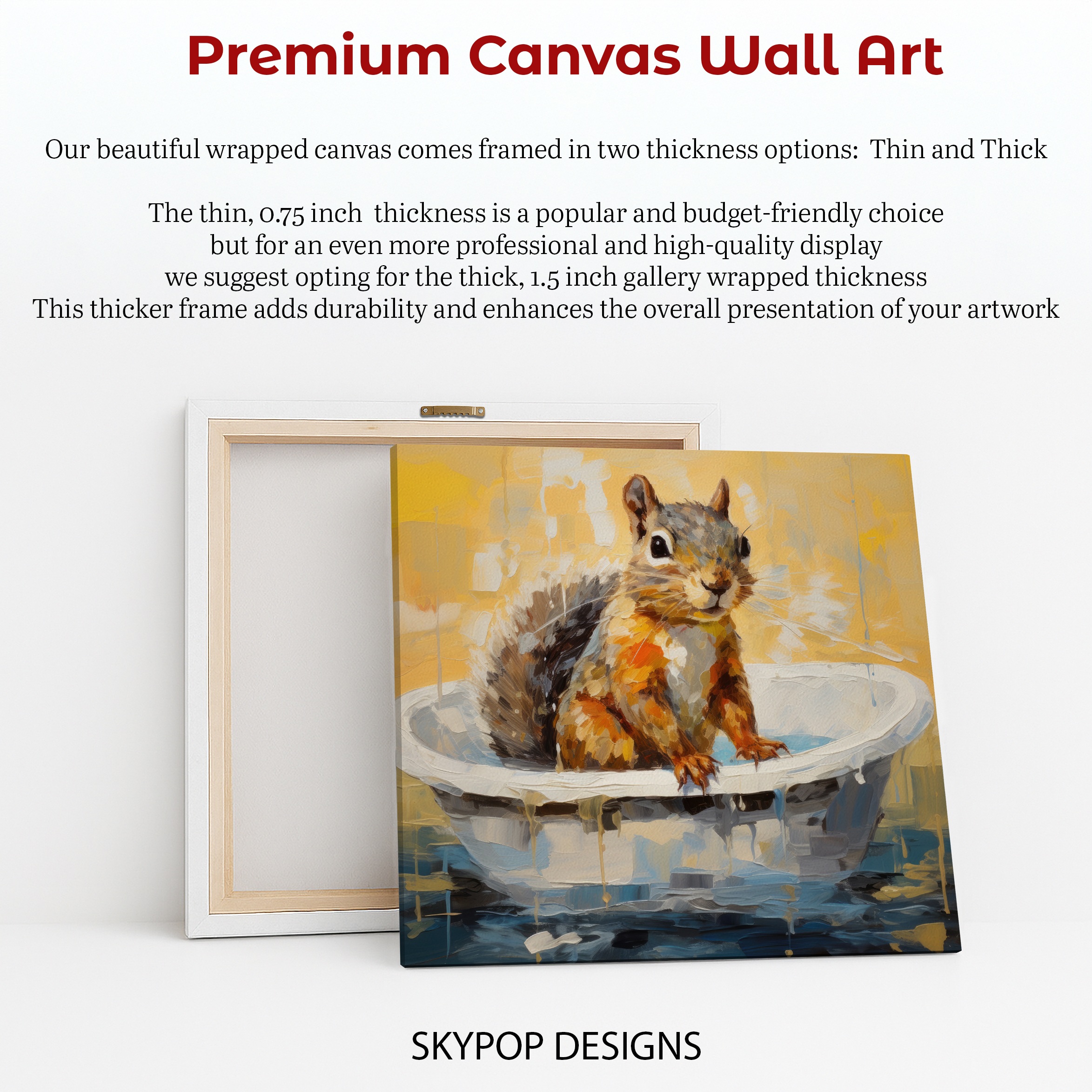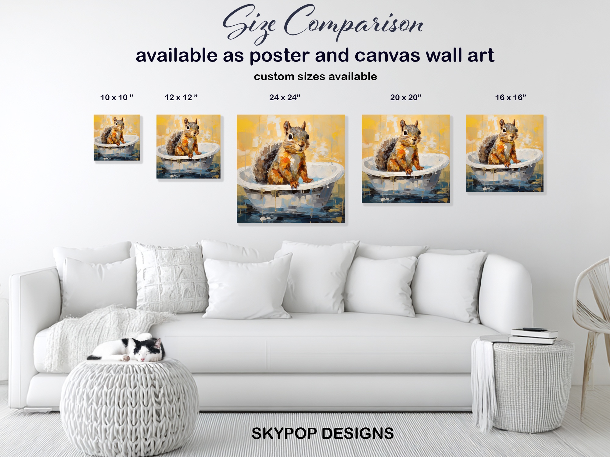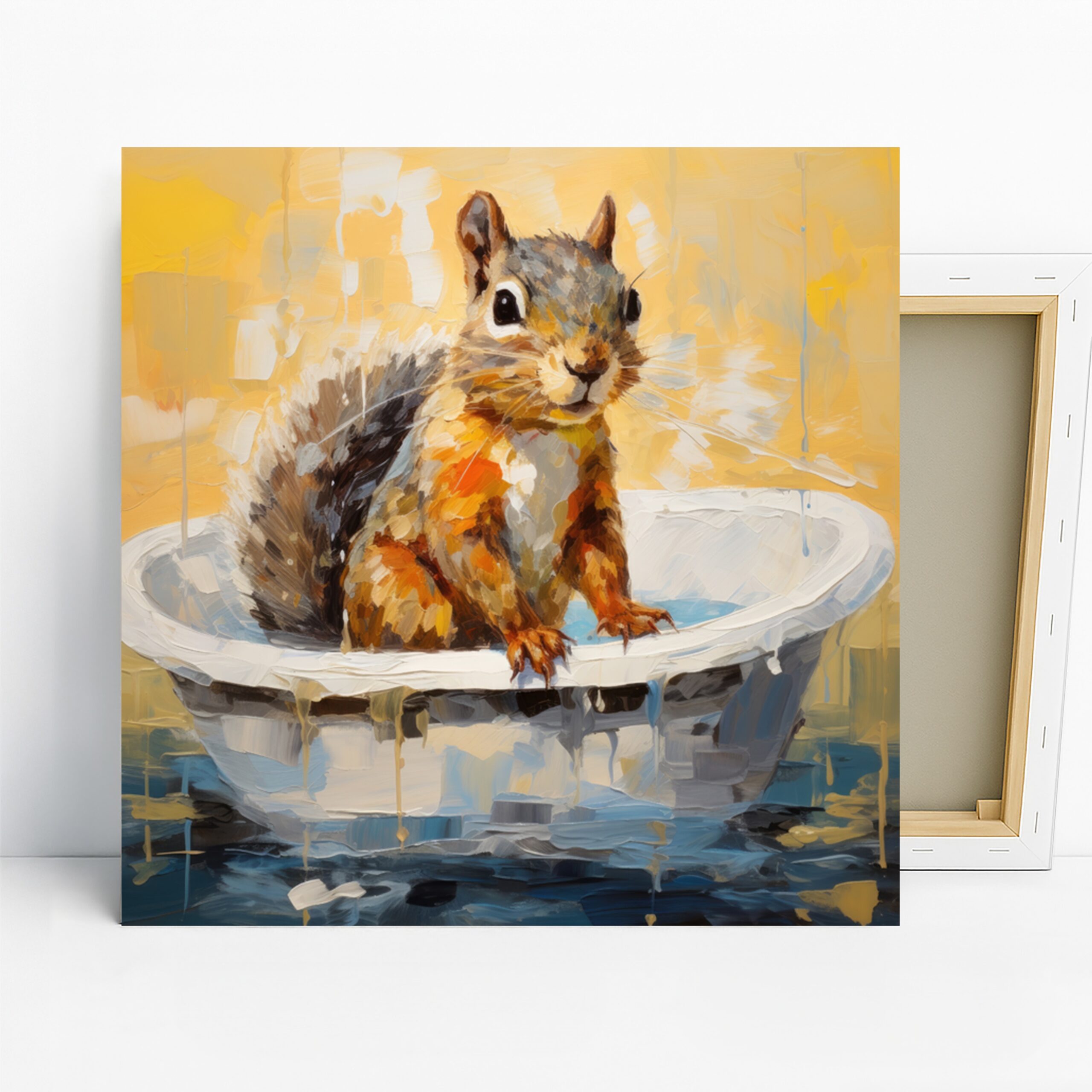 Keywords: Squirrel art, animal wall art, whimsical wall art, nature art, canvas print, wall decor, home decor, living room art, bathroom art, nursery decor, kids room art, bohemian decor, modern decor, contemporary art, multicolor art, yellow decor, blue art, brown art, squirrel painting, animal painting, bath time art, cute animal art, unique wall art, inspirational art, joyful decor, housewarming gift, seasonal decor, art poster, textured art, nature inspired art