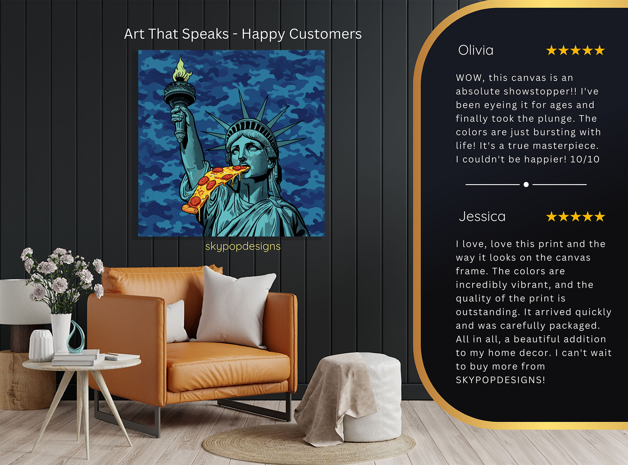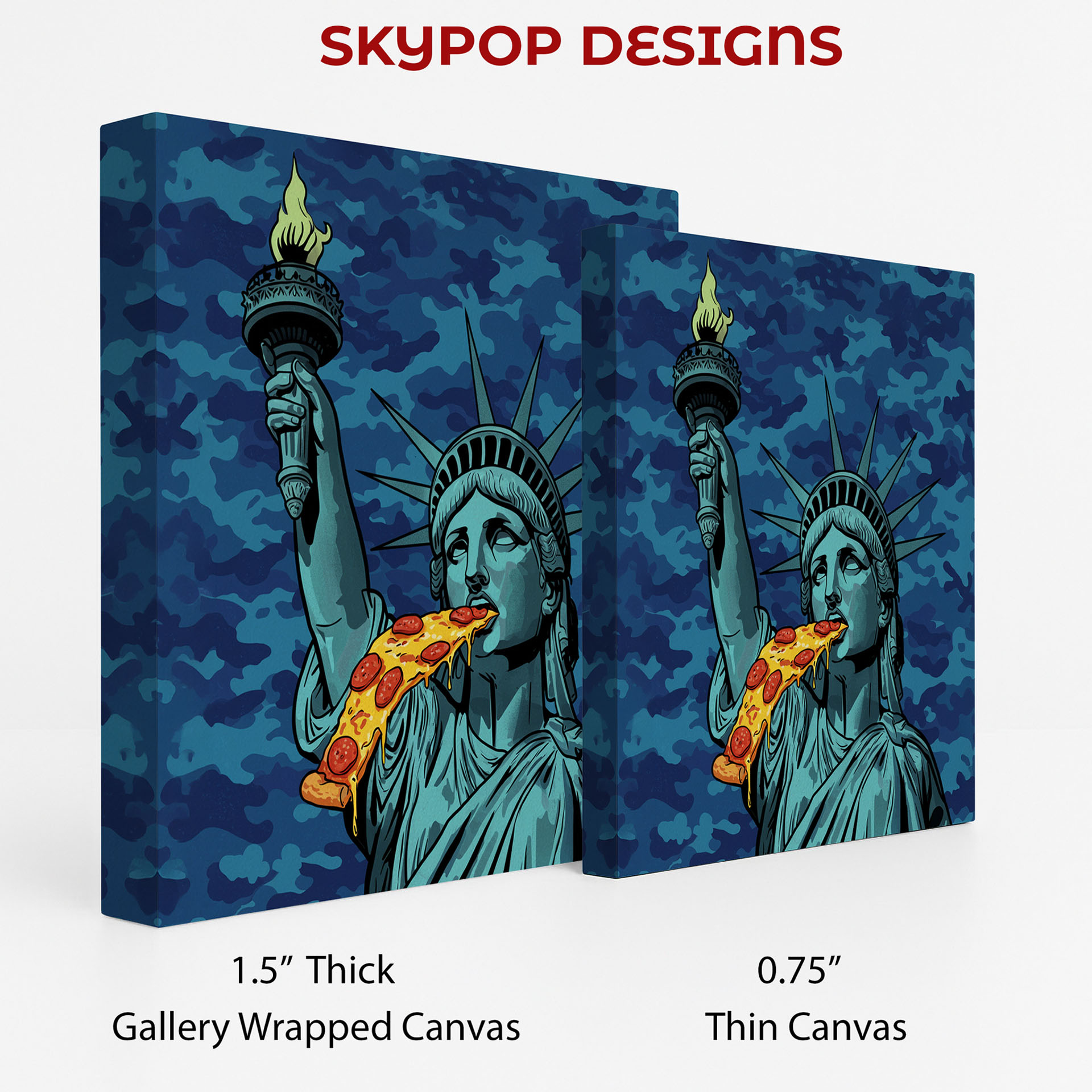 Ignite your space with this eye-catching Statue of Liberty canvas wall art, a bold fusion of iconic imagery and pop culture that will transform your room. This unique poster or canvas wall art showcases the Statue of Liberty enjoying a delicious slice of pizza, a statement piece that celebrates modern American culture. The vibrant blues and yellows create a striking contrast, making this artwork a captivating focal point for any contemporary living room or a fun addition to a game room. Its street art style and pop art influences bring an energetic and artistic vibe, perfect for elevating modern decor or adding personality to a bohemian aesthetic. This piece is an ideal conversation starter and a unique decor item for any bar or office space. High-quality canvas printing ensures every detail, from the melted cheese to the camouflaged background, is reproduced with stunning clarity. Whether you’re a fan of iconic symbols or enjoy bold, statement-making artwork, this canvas wall art is a perfect fit. It makes a fantastic gift for birthdays, holidays, or as a housewarming present for someone who appreciates distinctive wall decor. The dynamic composition and vibrant colors inspire creativity and add a lively mood to your home. Elevate your walls with this unforgettable piece of art that blends classic motifs with a modern twist. Make a statement with this Statue of Liberty Pizza Feast canvas wall art and bring a slice of unforgettable art into your life today.