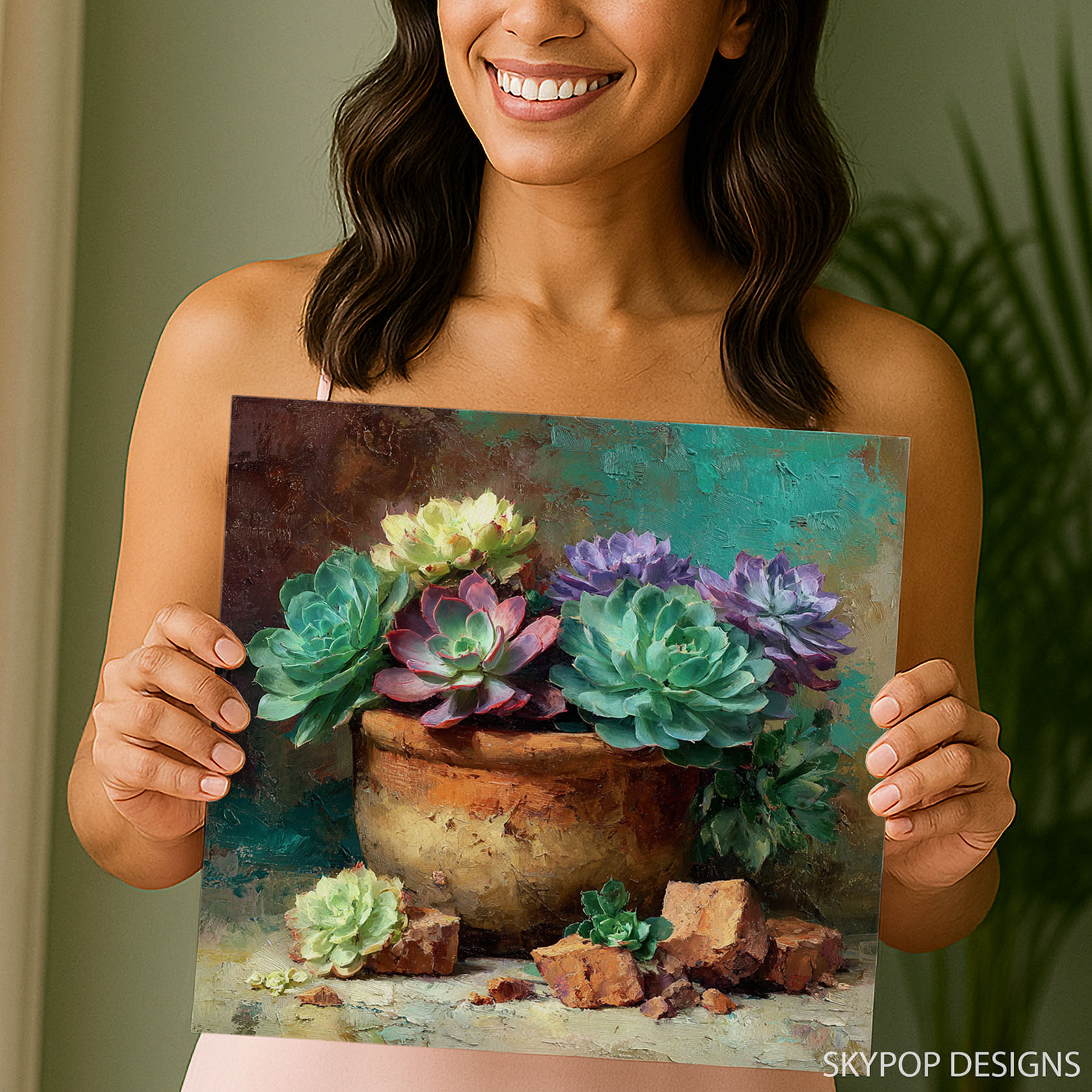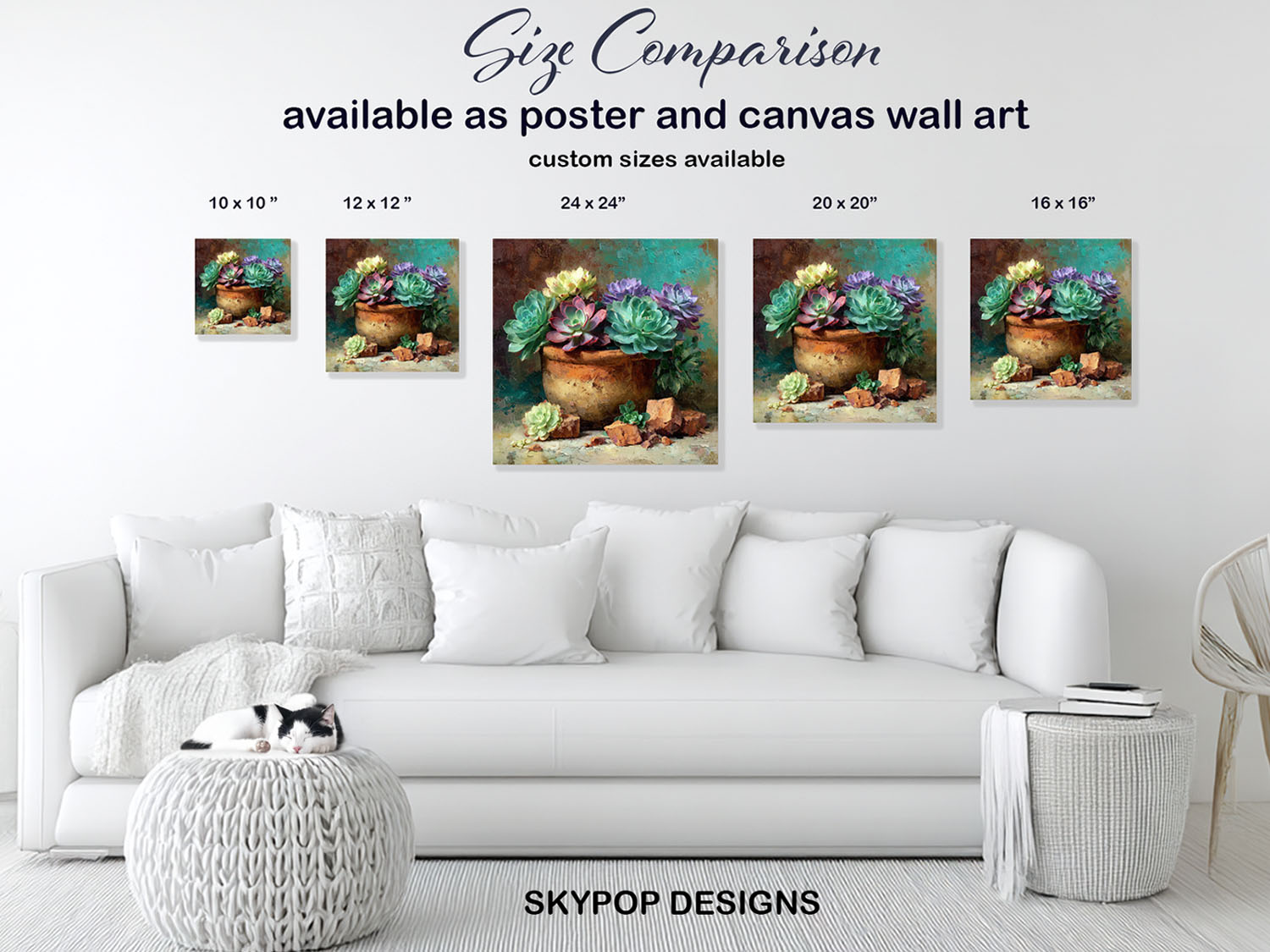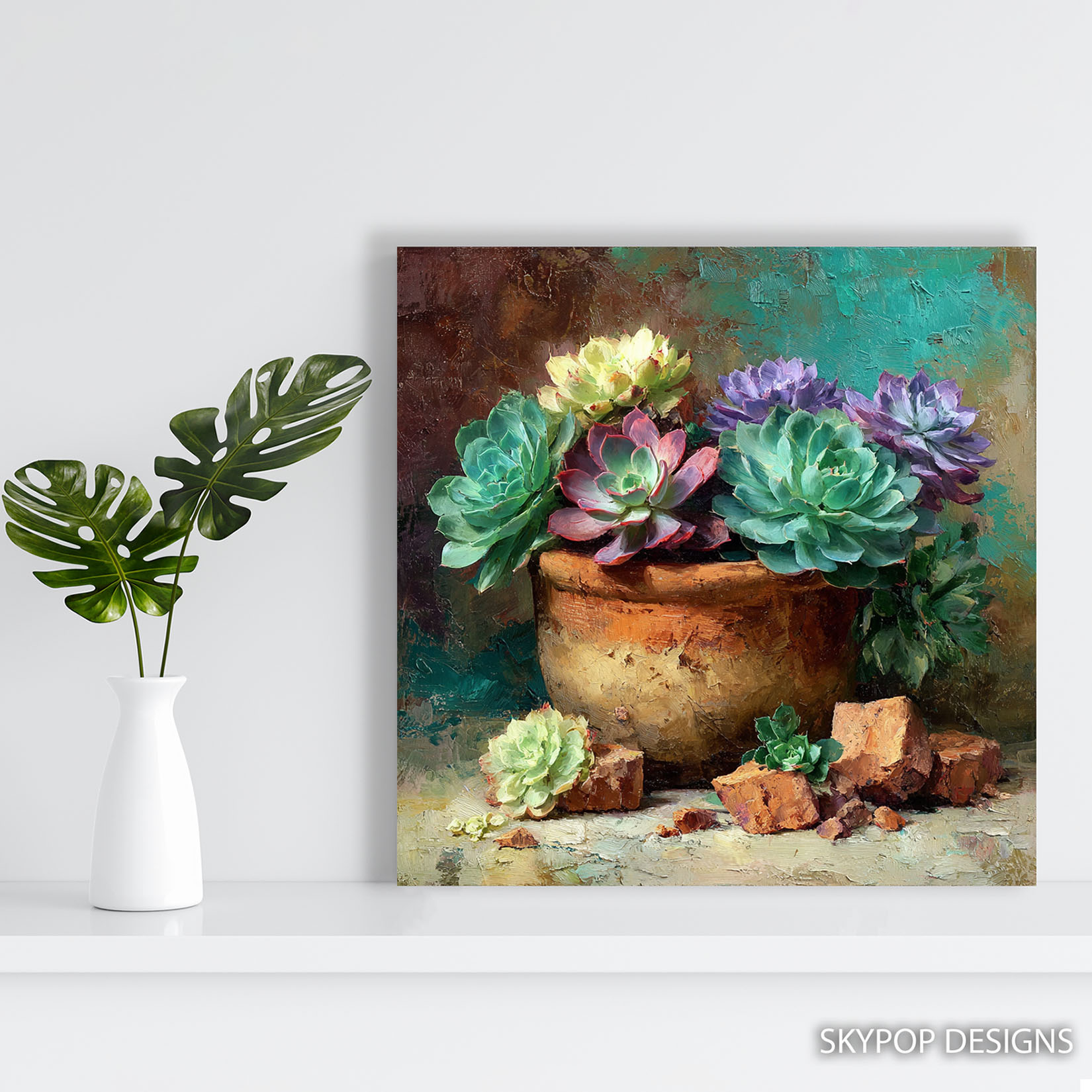 Elevate your living space with this captivating succulent canvas wall art, a stunning still life arrangement that brings the vibrant beauty of nature indoors. This poster or canvas wall art showcases a collection of lush succulents in a rustic terracotta pot, perfectly complemented by earthy brick accents. The rich greens, purples, and subtle yellows create a harmonious color palette that enhances any room, from a modern kitchen to a sun-drenched sunroom or a cozy living room. Ideal for bohemian decor, this striking artwork also fits seamlessly into Tuscan-inspired interiors, adding a touch of natural elegance. The detailed brushwork on this canvas wall art captures the unique textures of the succulents and the aged pot, creating a visually engaging piece. This nature art is perfect for transforming your space with calming, natural tones, making it an ideal backdrop for contemporary wall decor. Whether you’re looking to refresh your home office, add character to your dining room, or create a tranquil retreat in your bedroom, this versatile artwork provides significant visual impact. High-quality printing ensures the vibrant colors and intricate details are preserved, making this poster a lasting addition to your home. It makes a thoughtful housewarming gift or a delightful present for anyone who appreciates botanical art and a touch of rustic charm. Transform your home with this exquisite succulent garden canvas art today, celebrating the enduring beauty of nature. This poster offers a refreshing and inspiring visual experience daily.