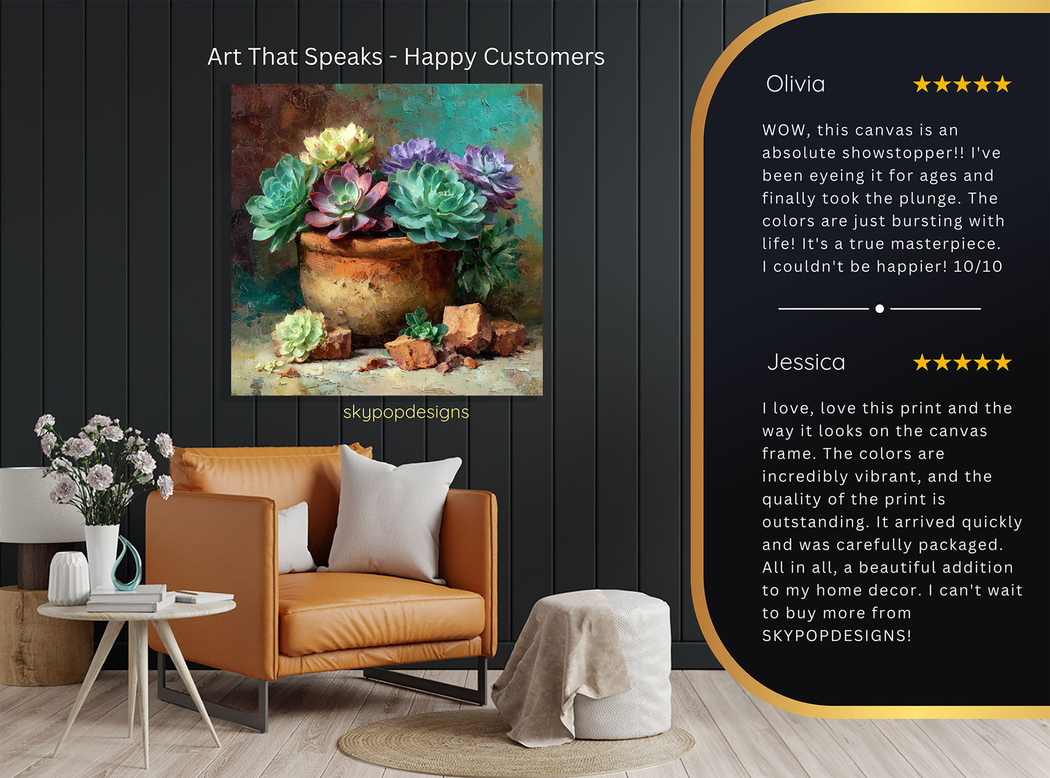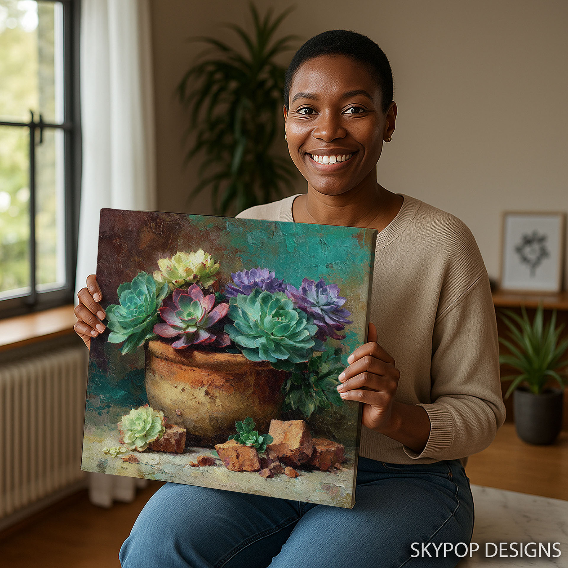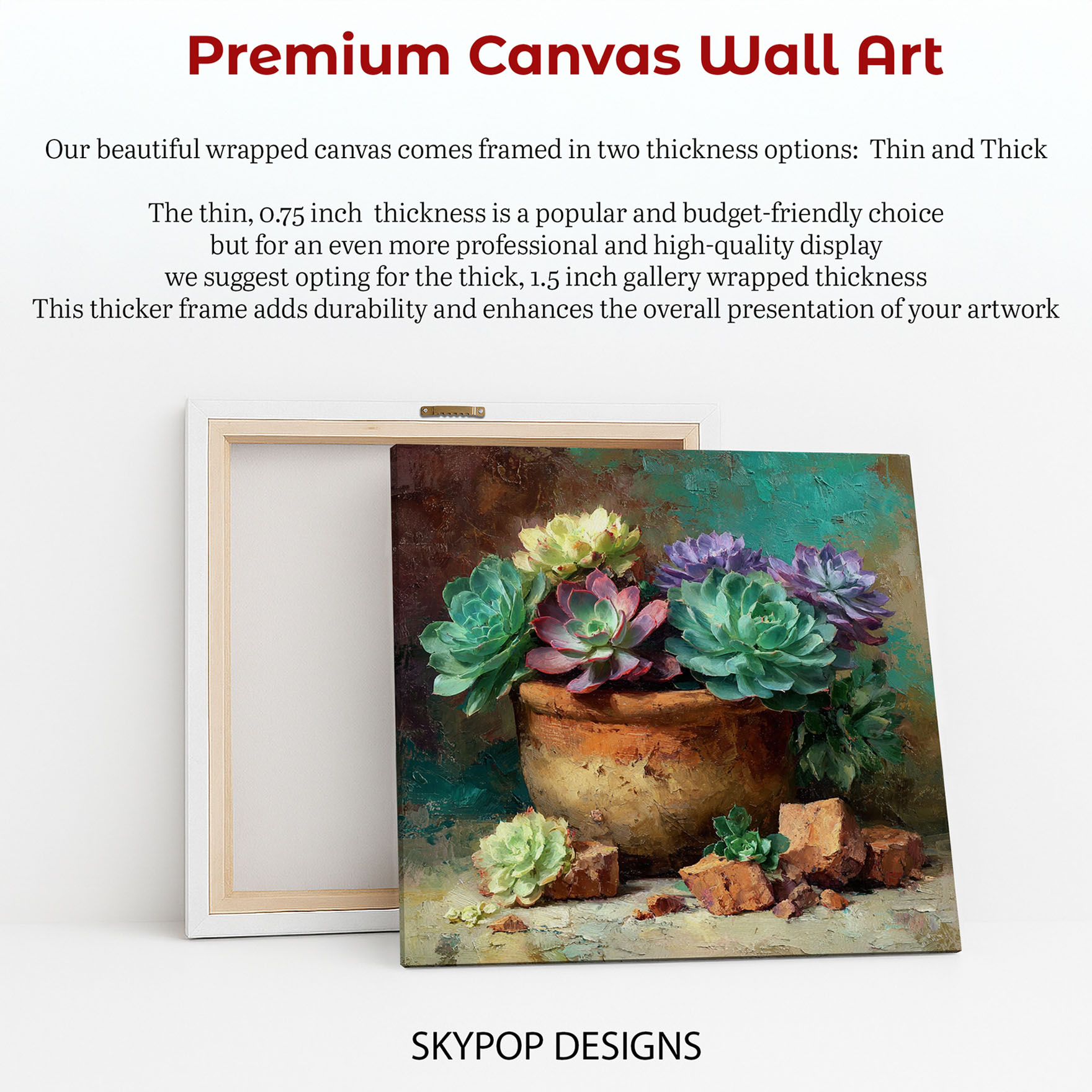 Elevate your living space with this captivating succulent canvas wall art, a stunning still life arrangement that brings the vibrant beauty of nature indoors. This poster or canvas wall art showcases a collection of lush succulents in a rustic terracotta pot, perfectly complemented by earthy brick accents. The rich greens, purples, and subtle yellows create a harmonious color palette that enhances any room, from a modern kitchen to a sun-drenched sunroom or a cozy living room. Ideal for bohemian decor, this striking artwork also fits seamlessly into Tuscan-inspired interiors, adding a touch of natural elegance. The detailed brushwork on this canvas wall art captures the unique textures of the succulents and the aged pot, creating a visually engaging piece. This nature art is perfect for transforming your space with calming, natural tones, making it an ideal backdrop for contemporary wall decor. Whether you’re looking to refresh your home office, add character to your dining room, or create a tranquil retreat in your bedroom, this versatile artwork provides significant visual impact. High-quality printing ensures the vibrant colors and intricate details are preserved, making this poster a lasting addition to your home. It makes a thoughtful housewarming gift or a delightful present for anyone who appreciates botanical art and a touch of rustic charm. Transform your home with this exquisite succulent garden canvas art today, celebrating the enduring beauty of nature. This poster offers a refreshing and inspiring visual experience daily.