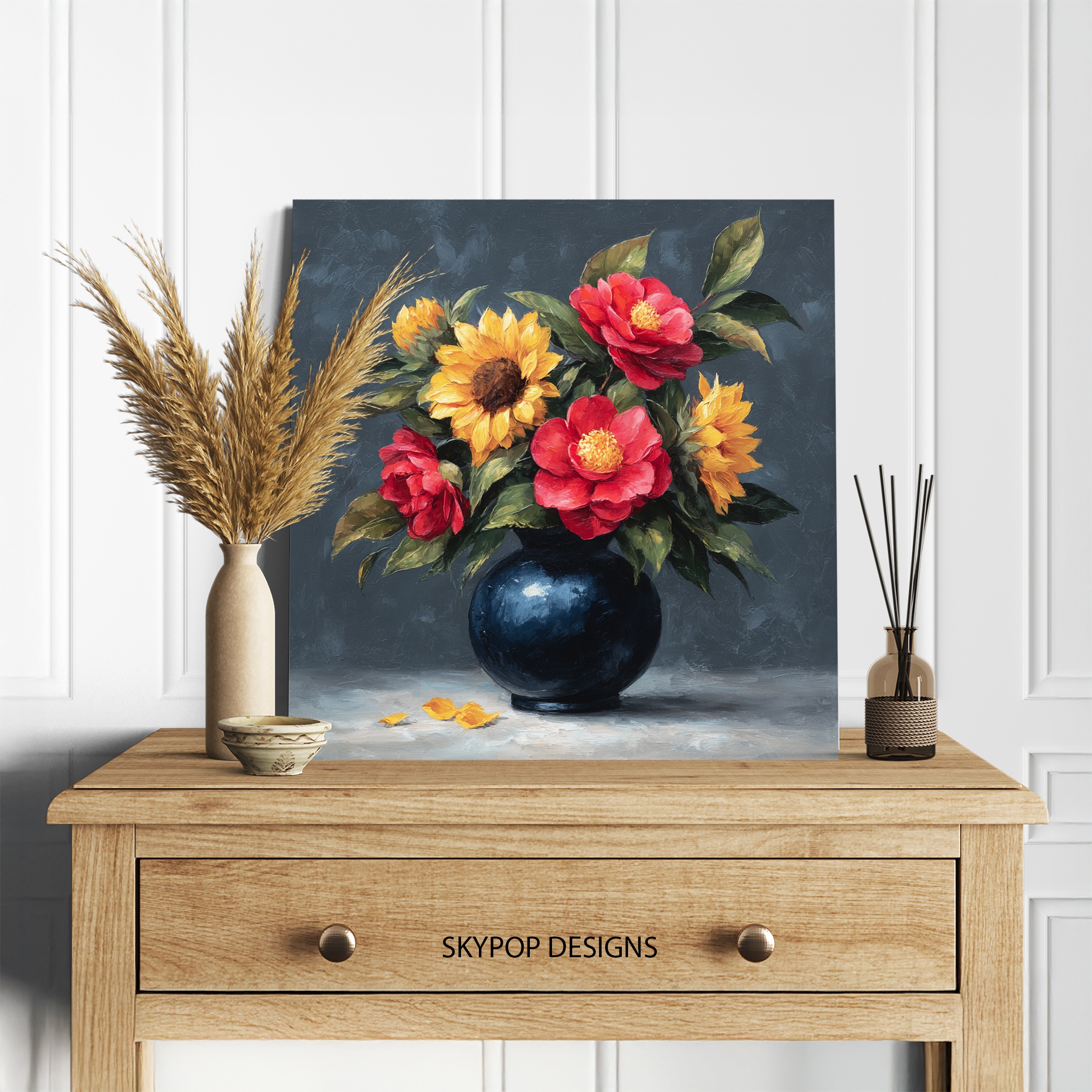 Bring the timeless beauty of a classic floral arrangement into your home with this stunning sunflower and rose canvas wall art. This vibrant still life poster captures the essence of a sun-kissed summer day, featuring golden sunflowers and lush red roses in a deep blue vase. Perfect for adding a touch of warmth to any room, this eye-catching piece works beautifully in traditional living rooms, country-style kitchens, or rustic dining areas. The rich color palette of sunny yellows, passionate reds, and soothing greens creates a focal point that instantly brightens your space. Ideal for nature lovers and flower enthusiasts, this canvas art brings the outdoors in, creating a welcoming atmosphere year-round. The detailed brushwork highlights every petal and leaf, making this high-quality print a conversation starter. Whether you’re looking to refresh your bedroom decor or searching for the perfect housewarming gift, this versatile floral artwork fits seamlessly into various interior styles. The contrasting colors evoke feelings of joy and energy, perfect for enhancing your mood on dreary days. Available in multiple sizes, this canvas wall art adapts to any wall space, from cozy nooks to grand entryways. Transform your home with this classic floral arrangement that celebrates nature’s beauty and adds a timeless elegance to your decor. Elevate your space today with this charming sunflower and rose wall art that’s sure to become a cherished part of your home.