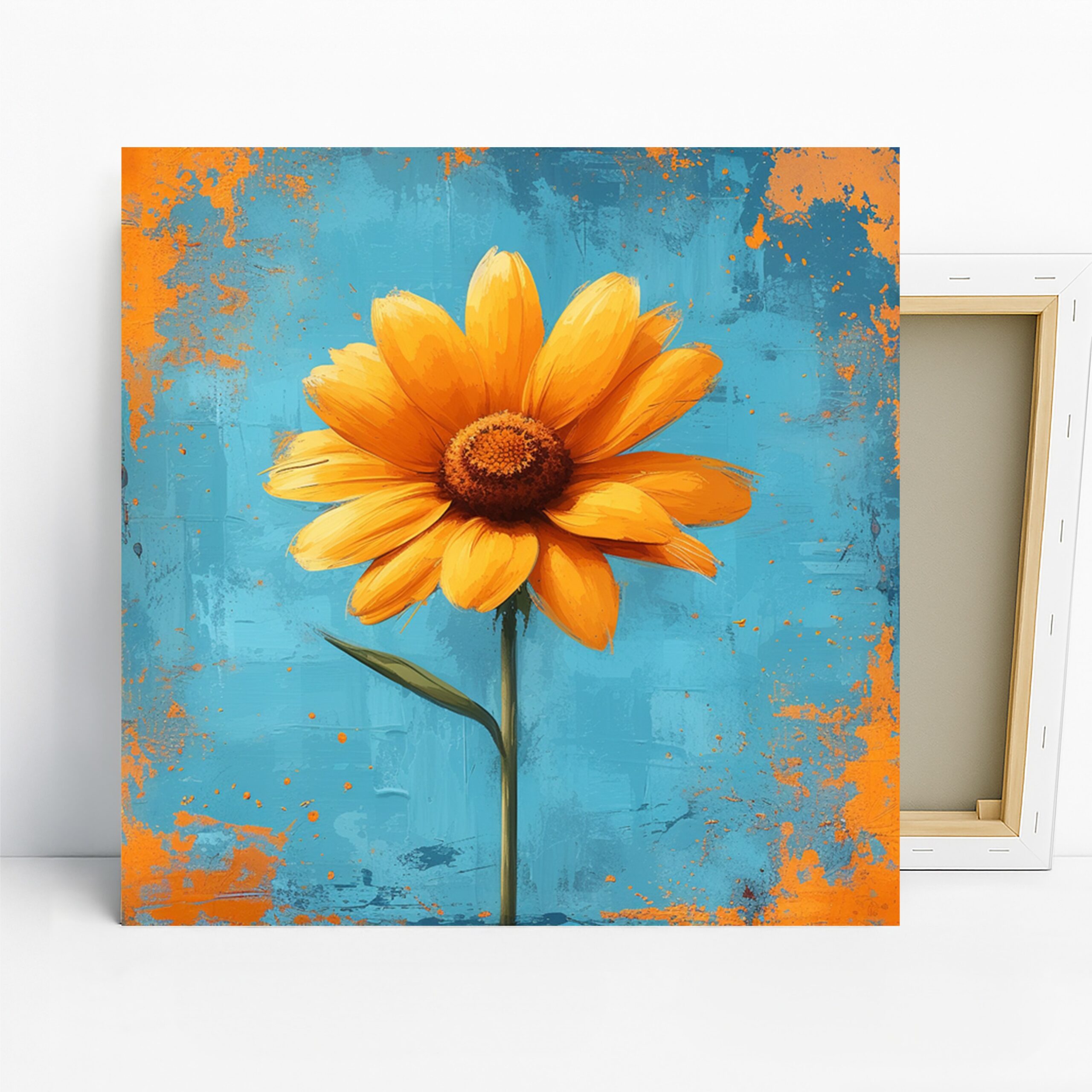 Transform your home with this stunning Sunflower canvas wall art, a vibrant explosion of color and texture that brings the outdoors in. This captivating poster or canvas wall art is perfect for adding a cheerful focal point to modern living room wall decor or creating a refreshing ambiance in a sunroom. The striking contrast between the bright orange sunflower and the cool teal background evokes feelings of joy and optimism, making it ideal for contemporary and coastal decor styles. This floral artwork pops with its bold color palette, perfectly complementing bohemian interiors seeking a vibrant touch. The textured brushstrokes and distressed orange elements add a unique, artistic flair to this sunflower poster, ensuring it stands out. High-quality printing captures the delicate details of the sunflower petals and the rich, layered background, making this canvas wall art a true statement piece. Whether you’re looking to enhance your bedroom, entryway, or any space that needs a dose of sunshine, this sunflower art breathes life into your decor. It makes a thoughtful housewarming gift, birthday present, or holiday surprise for anyone who loves vibrant nature-inspired art. Elevate your walls with this striking floral canvas art that celebrates the beauty and energy of sunflowers. Add a touch of modern artistry and bold color to your living space today with this beautiful Sunflower Splash Art.