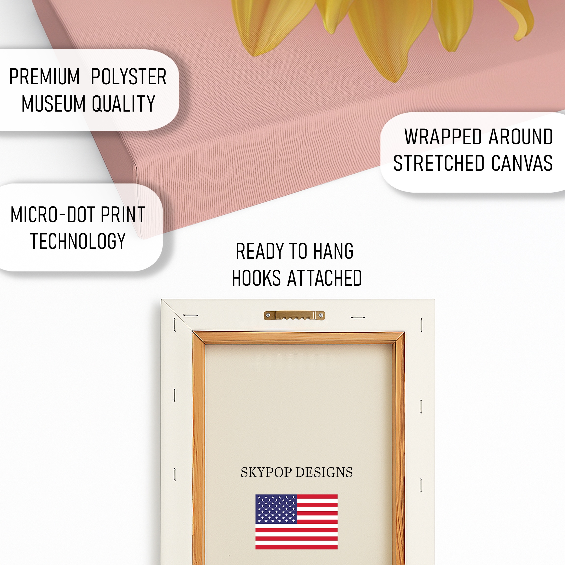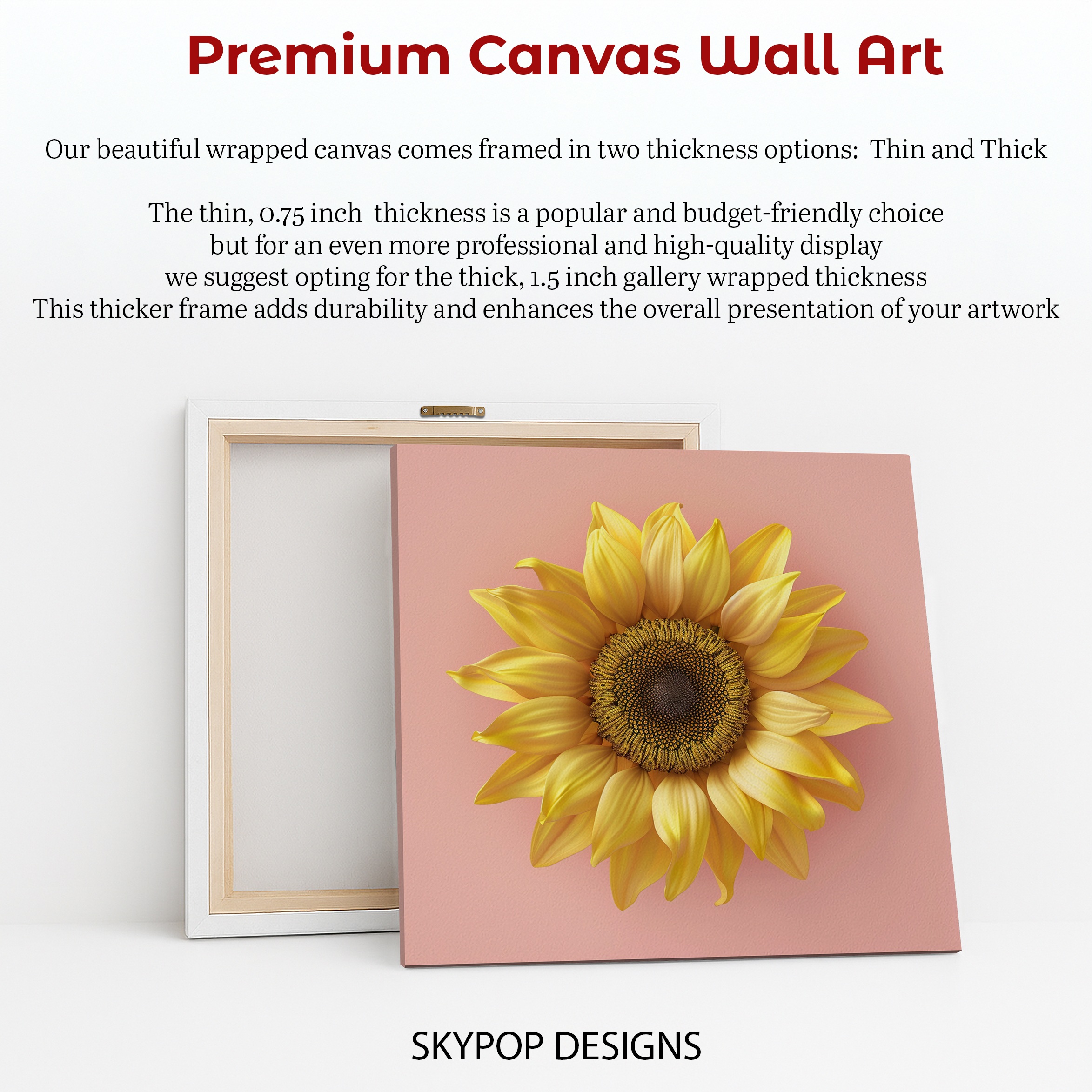 Transform your living space with this stunning Sunflower canvas wall art, a perfect piece to elevate your home decor. This striking poster or canvas wall art features a close-up of a vibrant sunflower against a soft pink background, bringing warmth and cheer to any room. The bold yellow petals and rich brown center create a captivating focal point, ideal for modern living room wall decor and minimalist bedroom art. This piece celebrates the beauty of nature with its contemporary floral art style, making it a versatile addition to bohemian or modern interiors. The bright yellow hues are known to inspire happiness and positivity, enhancing the mood of your home. Perfect for a sunroom or entryway, this canvas wall art adds a touch of natural elegance and a welcoming feel. High-quality printing ensures the intricate details of the sunflower are beautifully rendered on this durable canvas print. This unframed artwork is ideal for those looking to add personalized touches to their home or seeking a unique gift for housewarmings or birthdays. The simple yet impactful design works well with various color schemes, offering a fresh aesthetic. Elevate your wall art collection with this beautiful sunflower poster, a statement piece that brings the outdoors in. Discover the joy and beauty of this vibrant canvas art that will inspire you every day. Add this cheerful sunflower artwork to your collection and brighten your walls today.