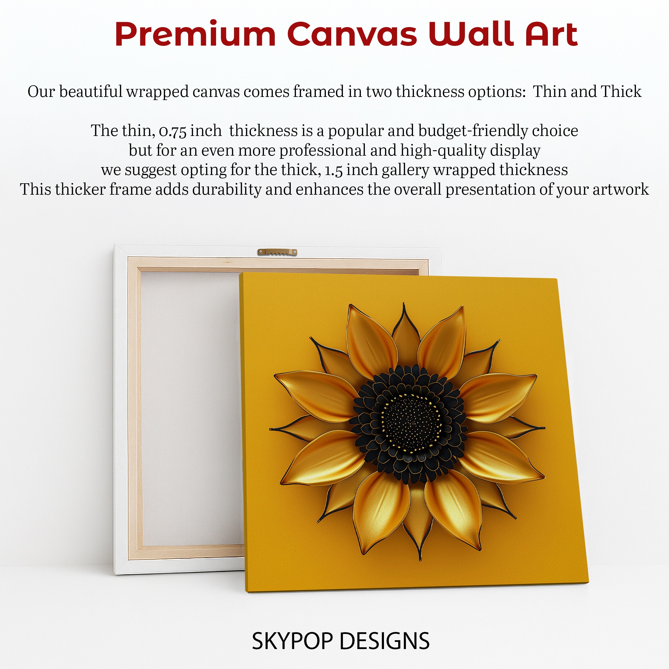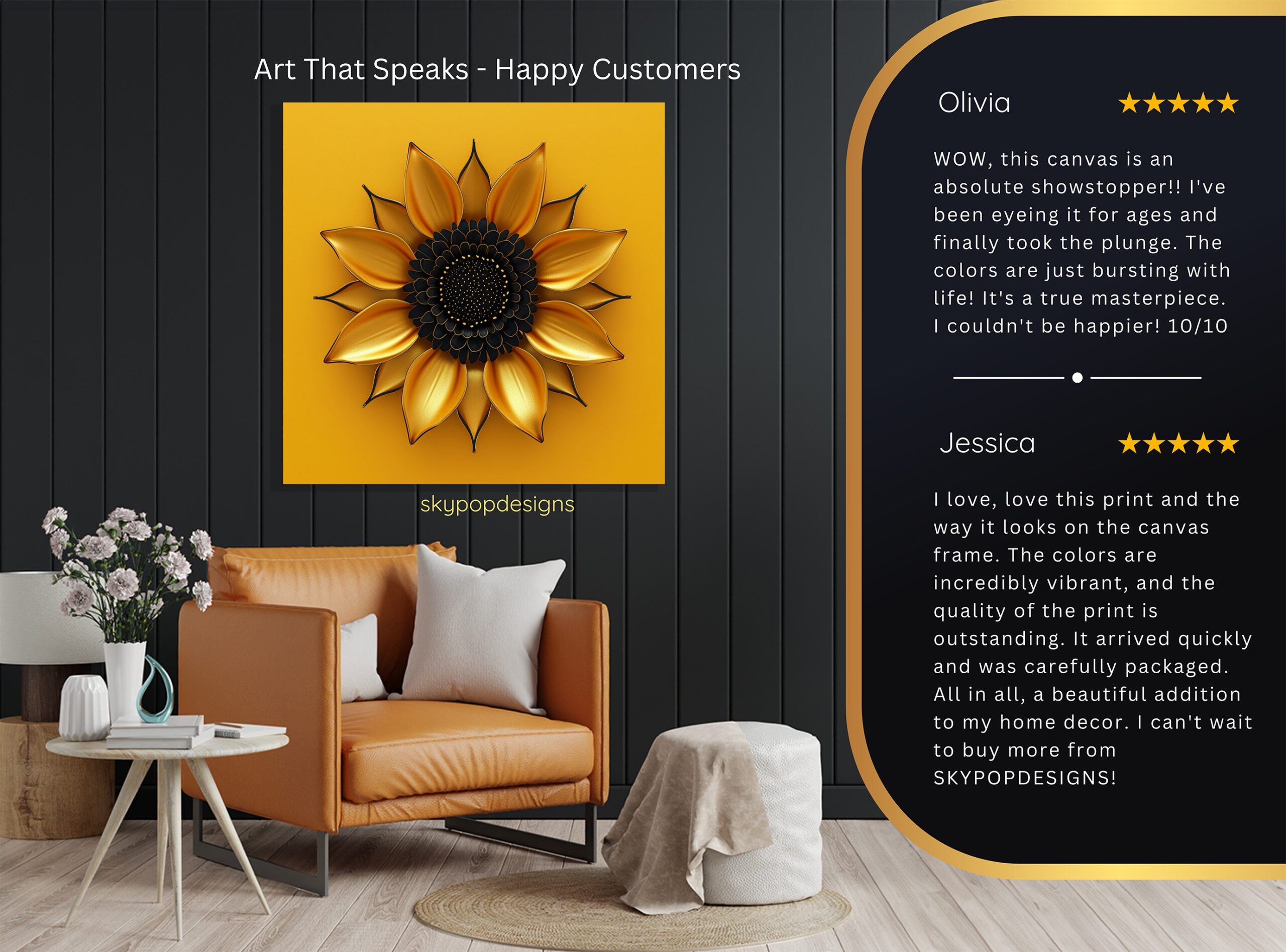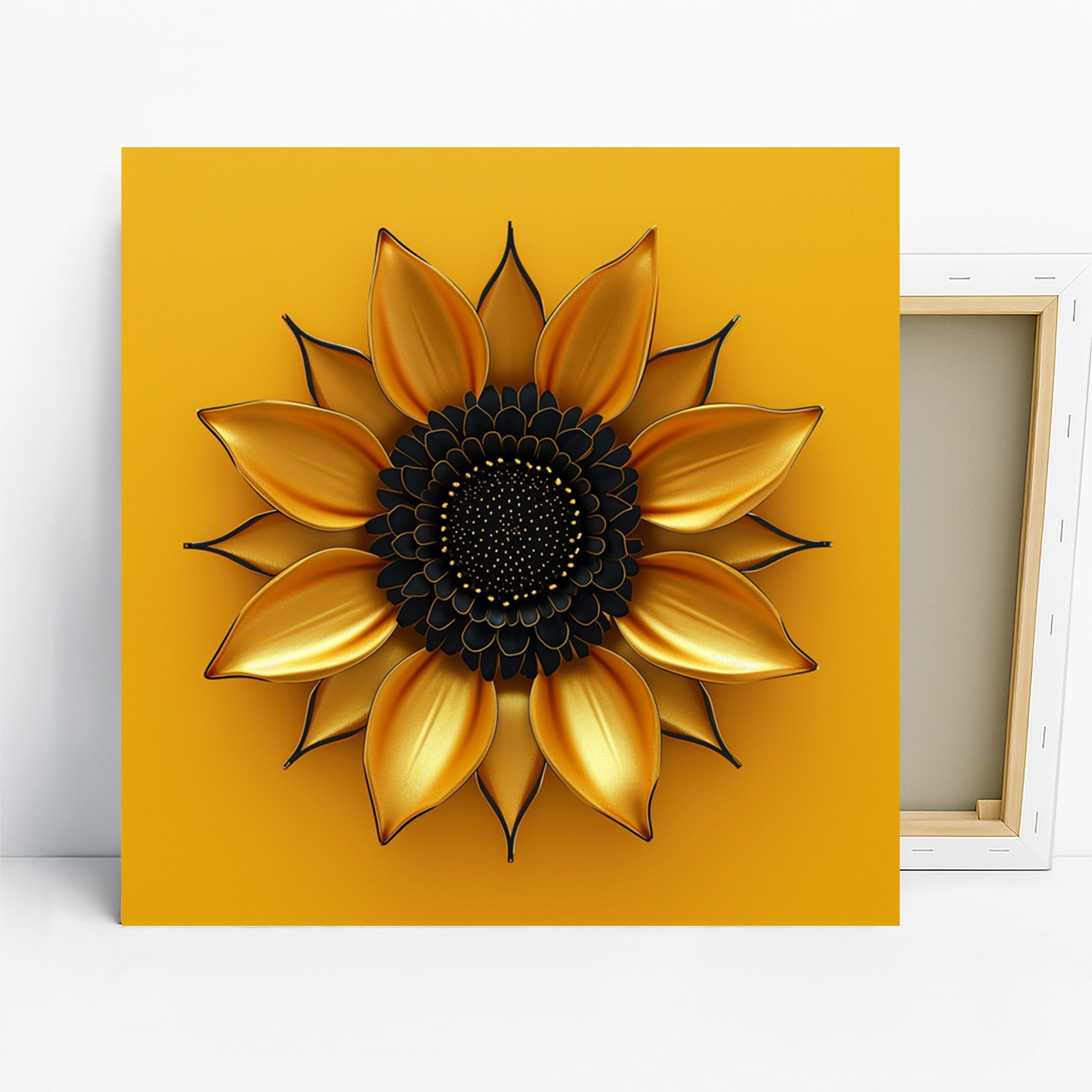 Elevate your space with this stunning sunflower canvas wall art that radiates warmth and luxury. This striking poster or canvas wall art features a vibrant sunflower design with rich gold and deep black accents, creating a sophisticated focal point. Perfect for adding modern decor to your living room or a touch of glam to your bedroom, this piece transforms any interior. The high-contrast color palette of yellow, gold, and black evokes feelings of optimism and elegance, effortlessly enhancing your surroundings. Ideal for minimalist spaces or as a unique entryway statement, this artwork brings a sense of opulence and natural beauty to your home. The intricately detailed petals and dark center on this canvas wall art showcase a contemporary floral art style that complements current design trends. High-quality printing ensures that the metallic sheen of the gold and the matte finish of the black are captured vividly. This sunflower poster is perfect for creating a captivating office space or adding a chic touch to a modern hallway. It makes an exceptional gift for housewarmings, birthdays, or any occasion celebrating warmth and light. Experience the visual richness of this floral canvas art, designed to inspire and uplift daily. Add a golden touch to your wall art collection and make your home decor shine. Transform your rooms with this luxurious and timeless sunflower artwork today.