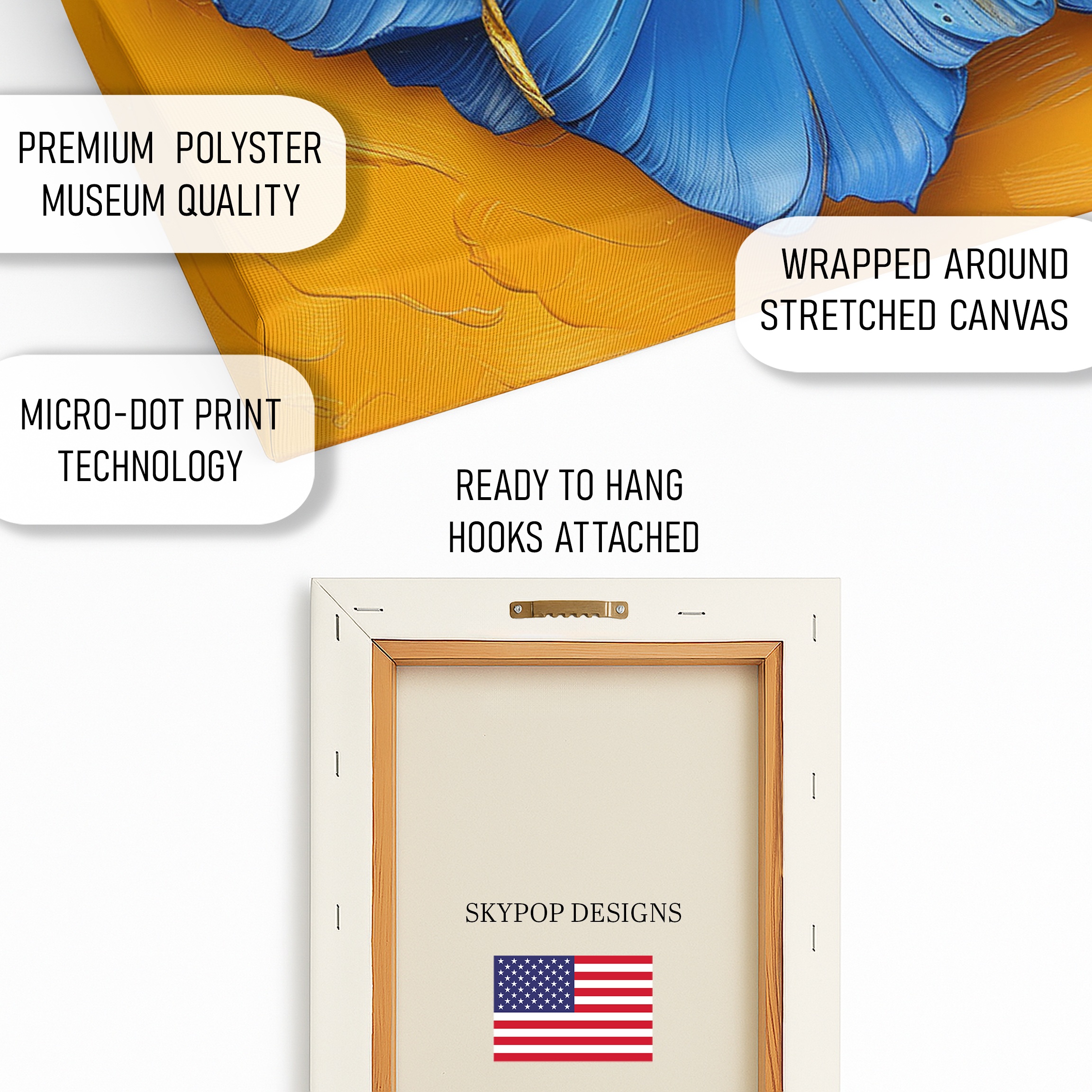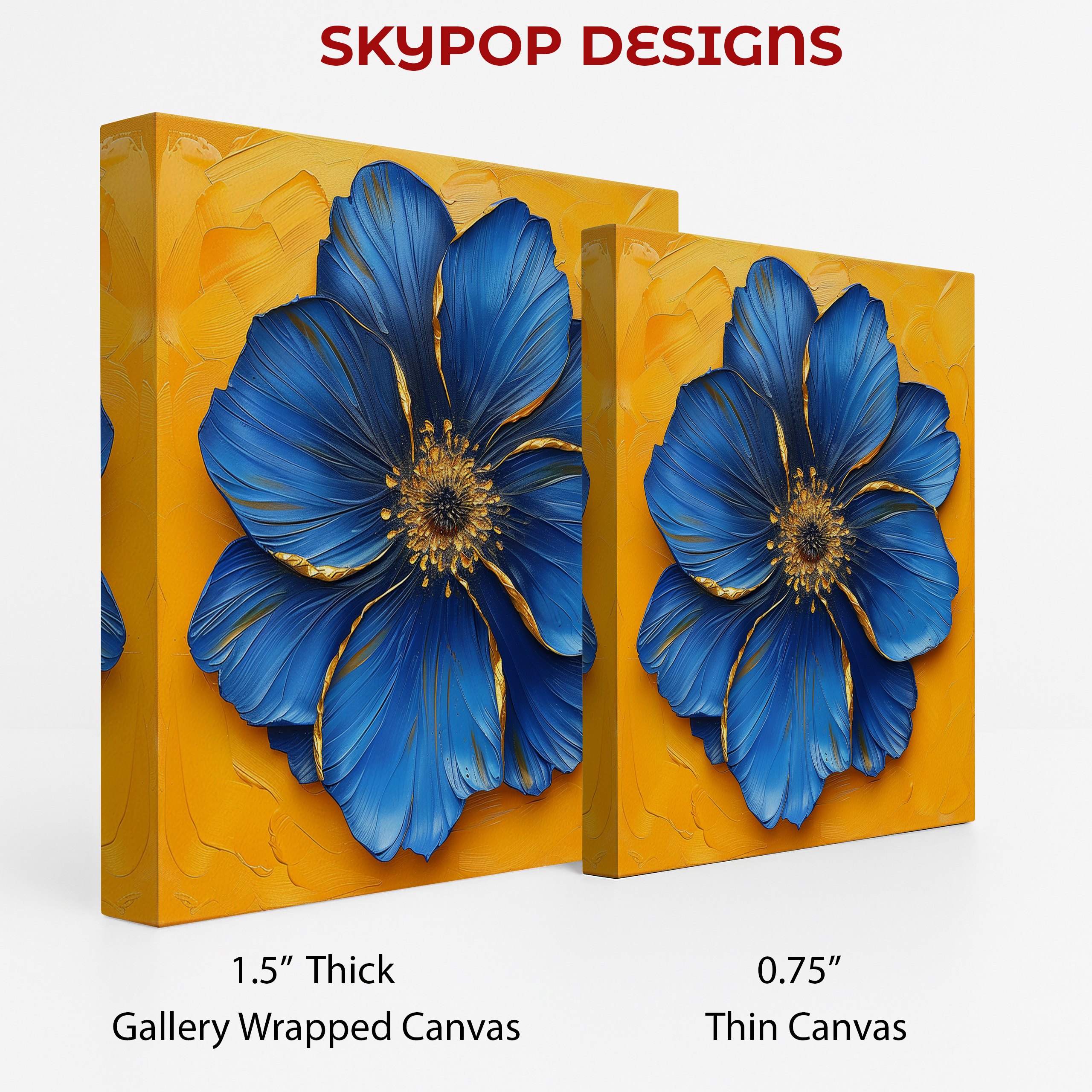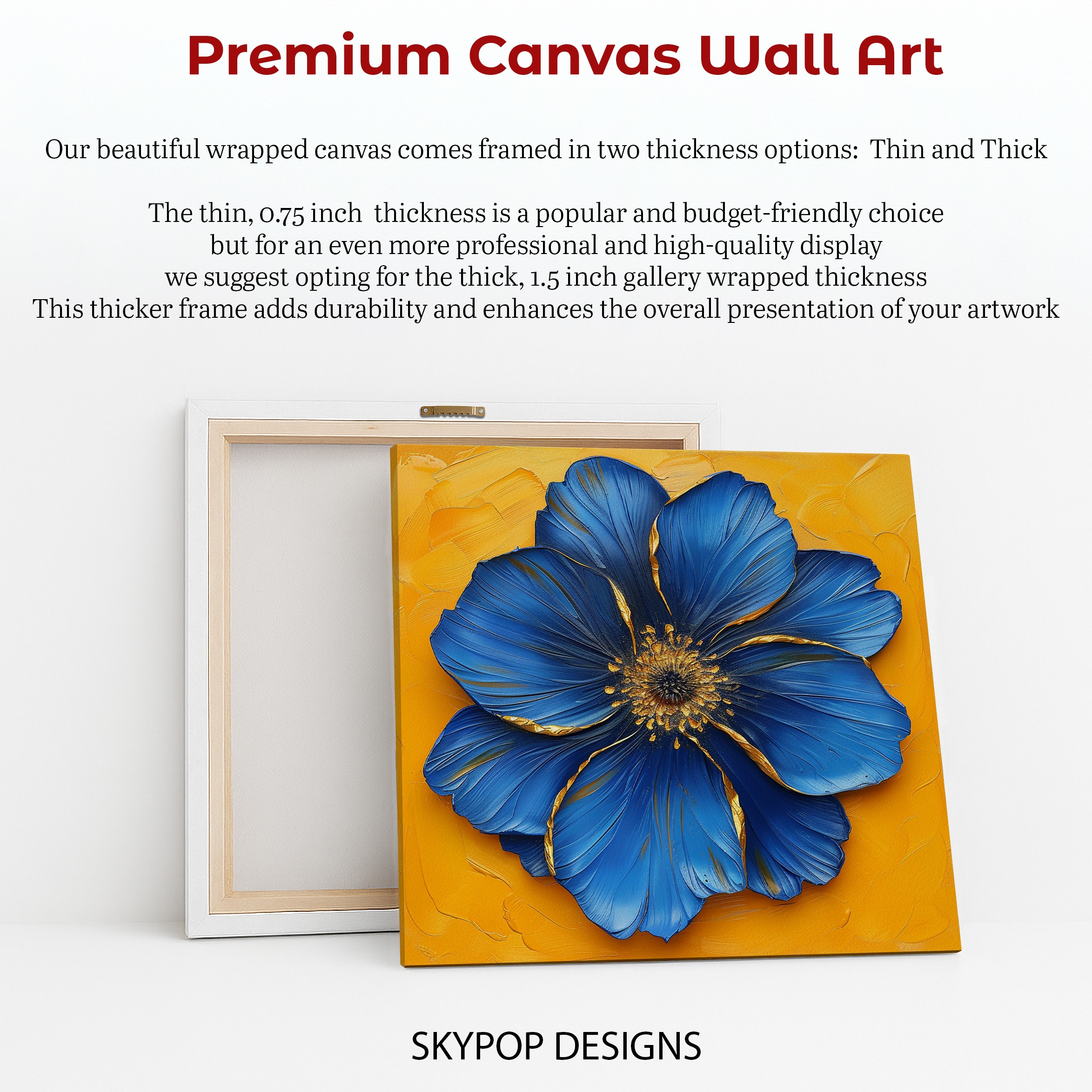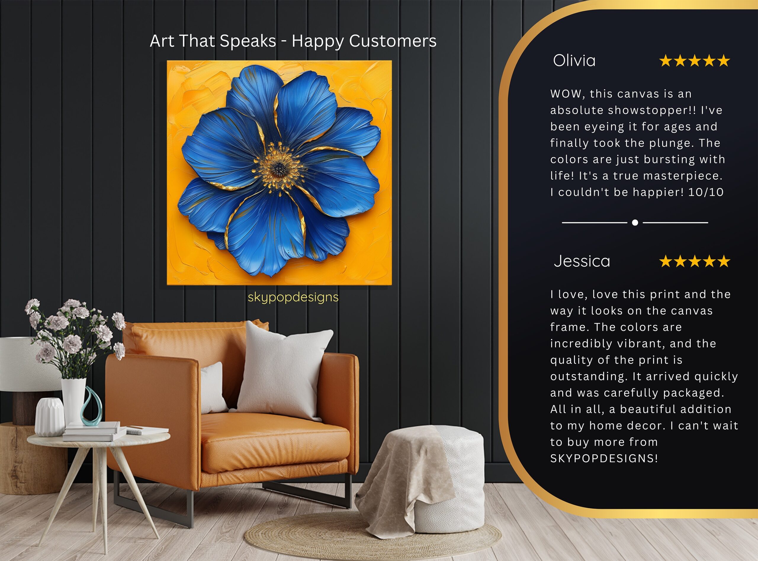 Elevate your space with this striking blue and gold flower canvas wall art, a captivating piece that brings modern glamour and floral elegance into your home. This poster or canvas wall art is perfect for transforming your living room into a chic retreat or adding a sophisticated focal point to your bedroom decor. The vibrant blue petals, accented with lustrous gold detailing, POP against the warm yellow textured background, creating a luxurious and eye-catching display. Ideal for minimalist and modern decor styles, this abstract floral artwork introduces a bold splash of color and texture that enhances any contemporary interior. The striking contrast between the deep blue and radiant gold evokes feelings of confidence and luxury, making this canvas wall art a statement piece. High-quality printing ensures the rich textures and metallic sheen are beautifully captured, bringing depth and dimension to your walls. This floral poster is also perfect for entryway decorating or as a stunning piece of wall art for your office. It makes an exceptional housewarming, birthday, or holiday gift for anyone who appreciates vibrant, modern art. The bold color combination is sure to inspire and uplift, creating an ambiance of refined beauty. Discover the perfect fusion of nature-inspired art and contemporary design with this stunning floral canvas. Make this bold blue and gold artwork the centerpiece of your wall decor collection today and transform your home.