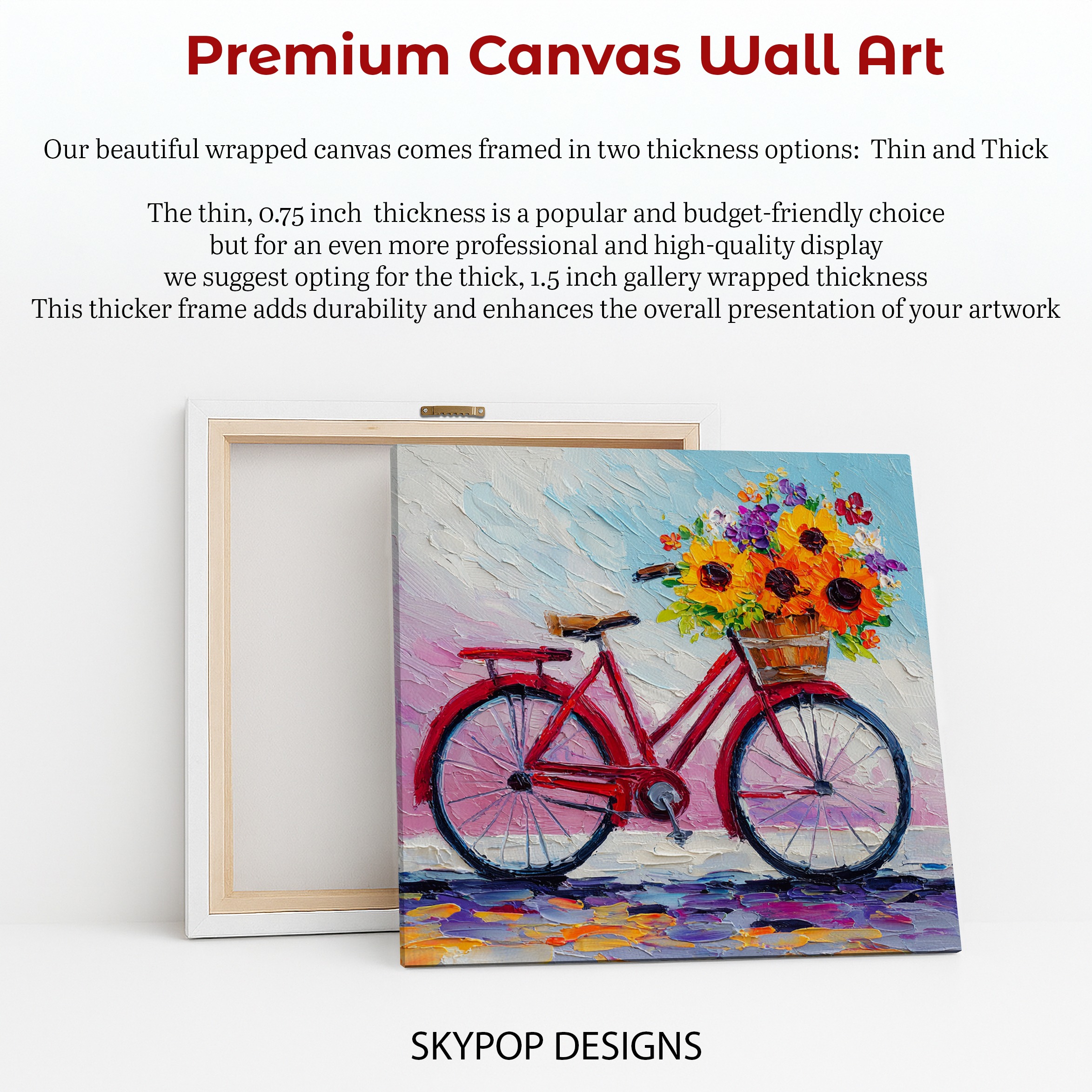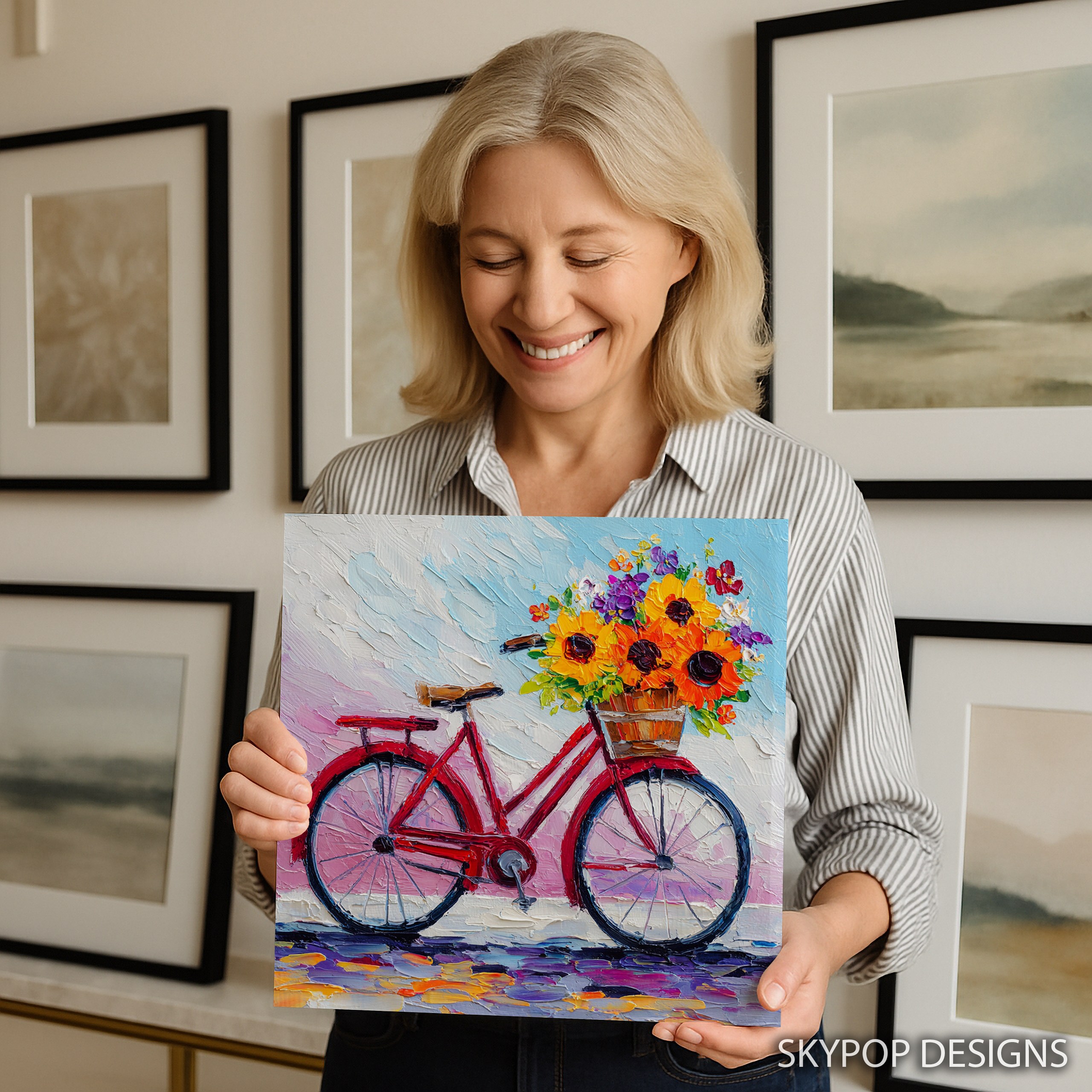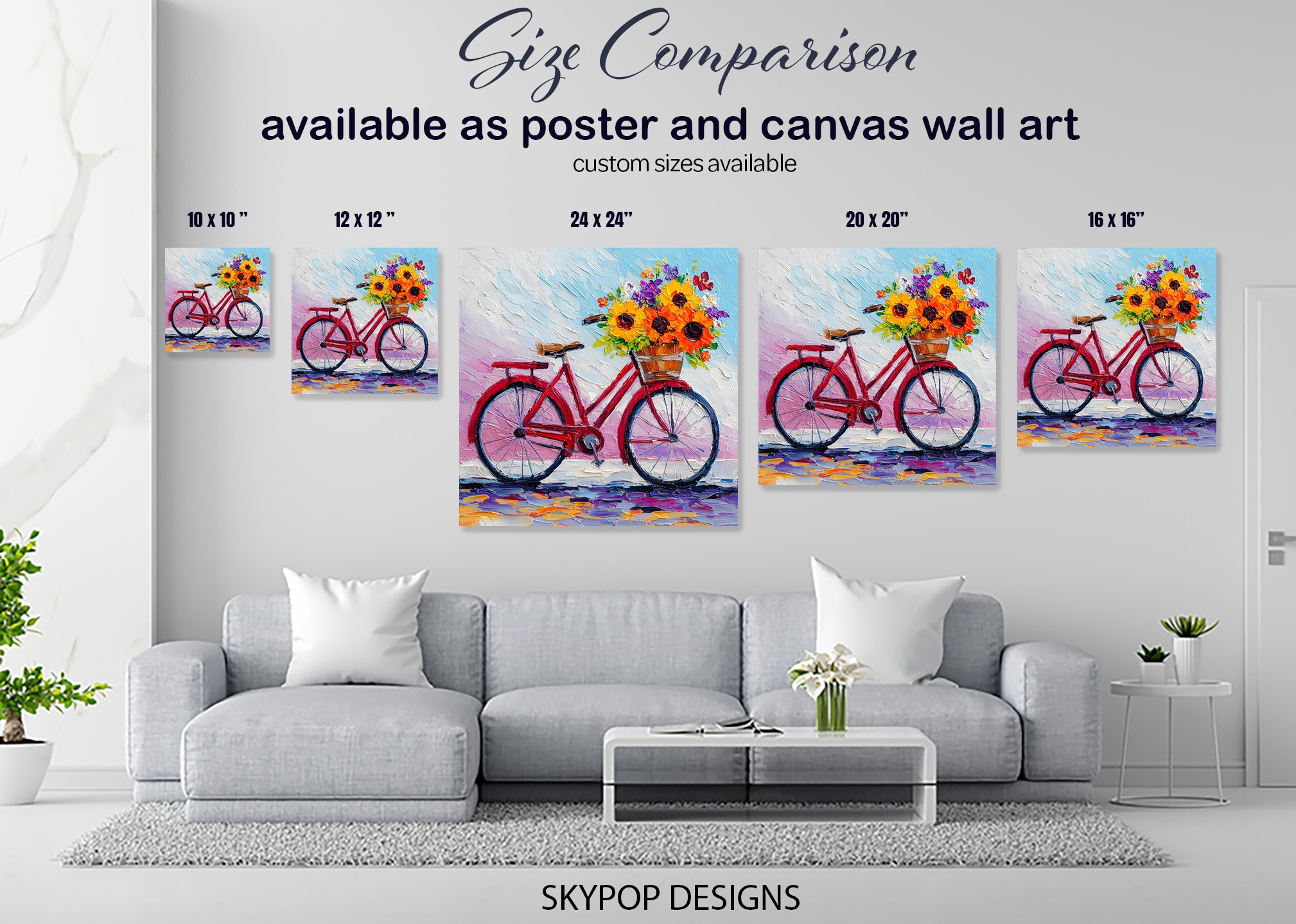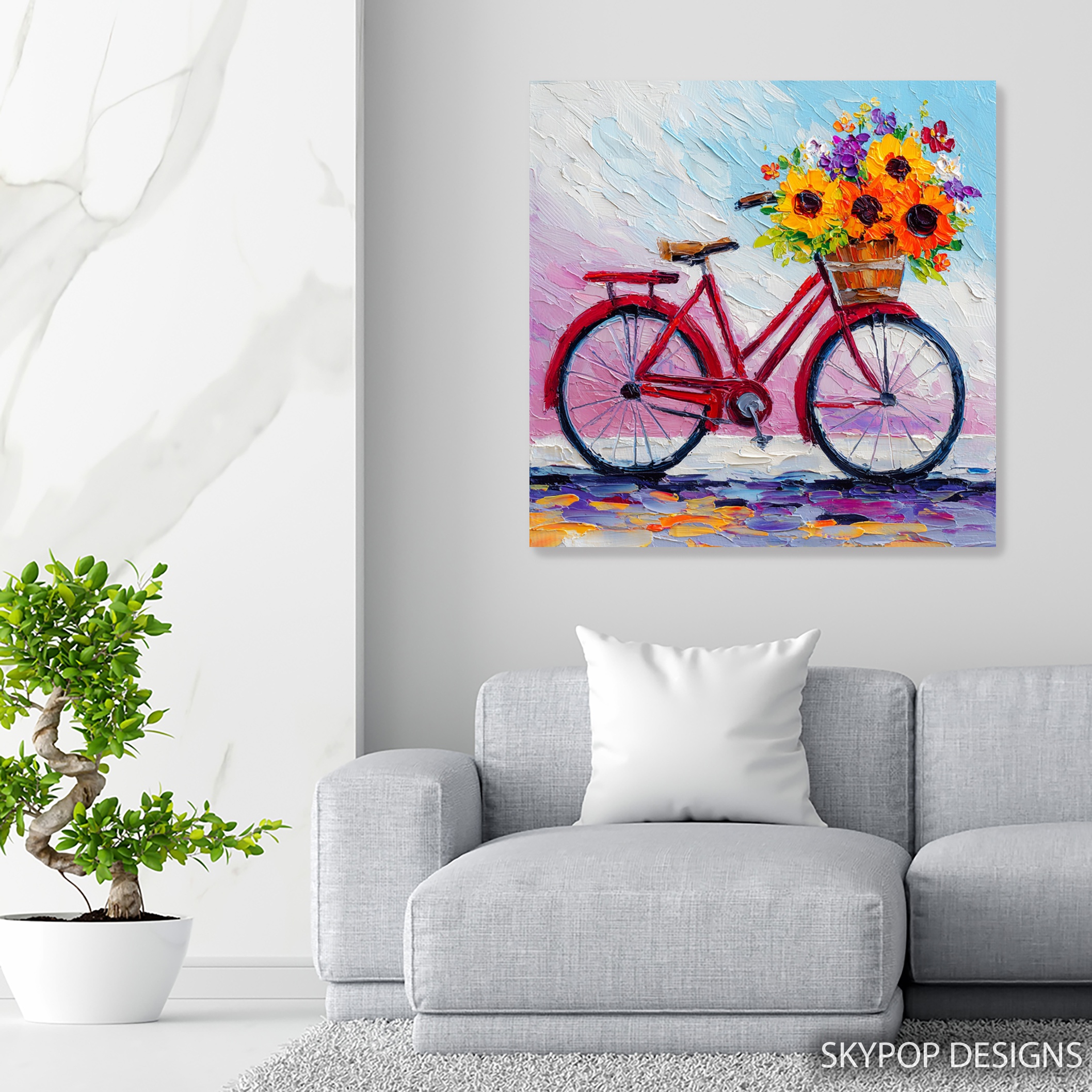 Brighten your space with this vibrant sunflower bicycle canvas wall art that instantly transports you to a cheerful countryside scene. This eye-catching poster or canvas print features a bold red bicycle adorned with a basket overflowing with radiant sunflowers and colorful wildflowers. The textured brushstrokes and vivid palette create a stunning focal point, perfect for adding a pop of color to farmhouse-style living rooms or rustic bedrooms. The combination of the classic bicycle and lush florals evokes a sense of carefree summer days, making it an ideal piece for sunrooms or entryways seeking a touch of whimsy. The impressionistic style captures the play of light and shadow, giving depth and movement to the scene. This versatile artwork complements shabby chic decor, infusing spaces with warmth and charm. The striking red bicycle against a soft pastel background creates a delightful contrast that draws the eye and lifts the mood. Whether you’re looking to refresh your seasonal decor or searching for the perfect housewarming gift, this canvas wall art offers a timeless appeal that celebrates the simple joys of life. The high-quality printing ensures every detail, from the delicate flower petals to the bicycle’s rustic texture, is beautifully preserved. Transform your home with this enchanting blend of floral beauty and nostalgic charm – add this delightful bicycle art to your wall today and let its joyful energy brighten your everyday moments.